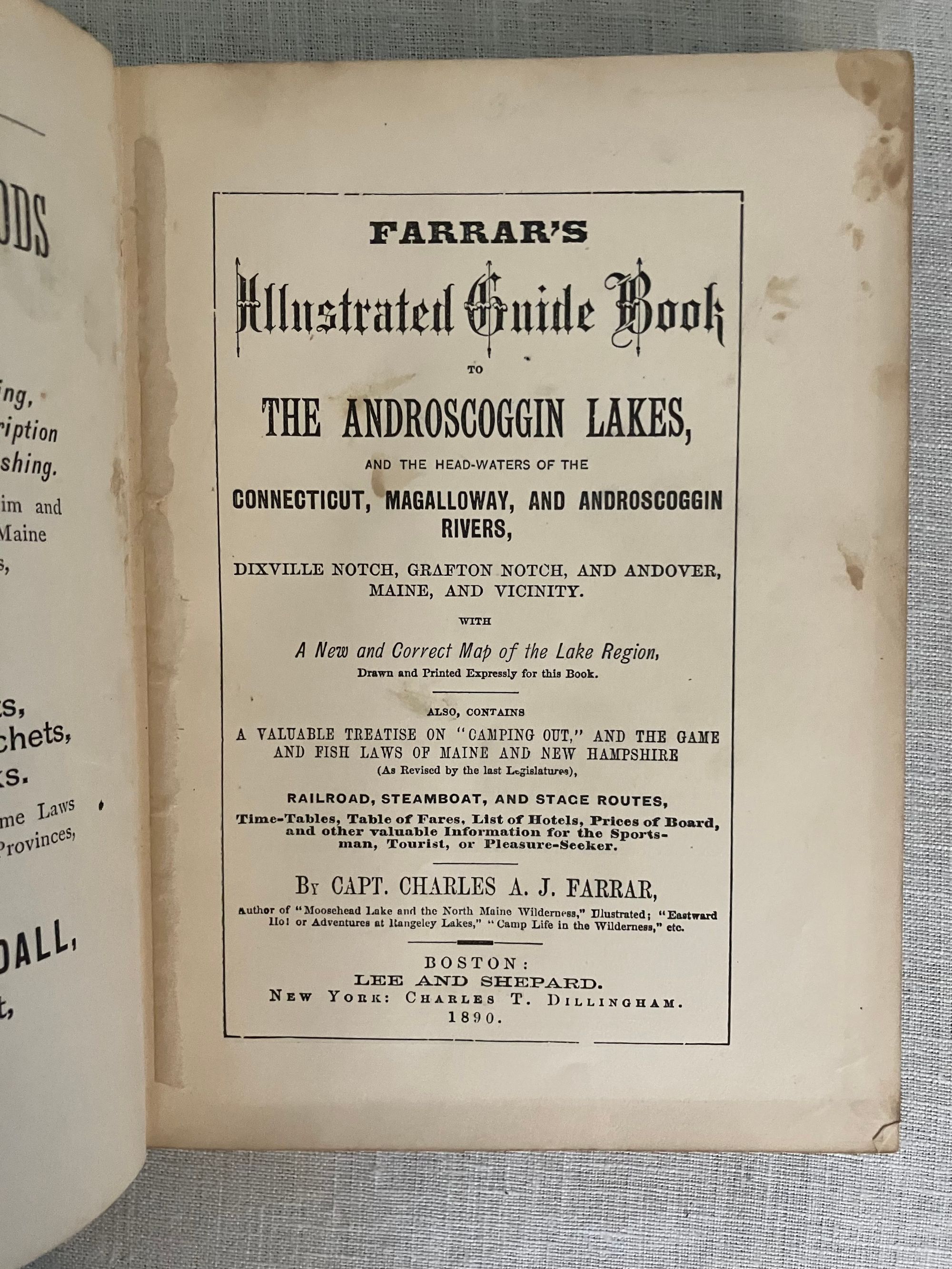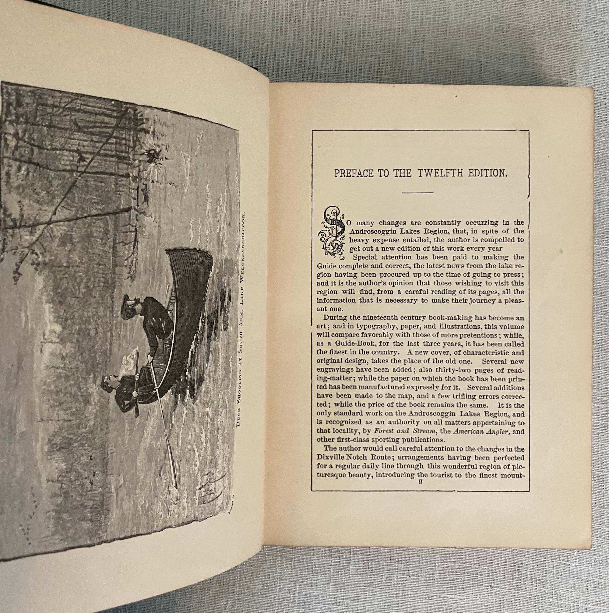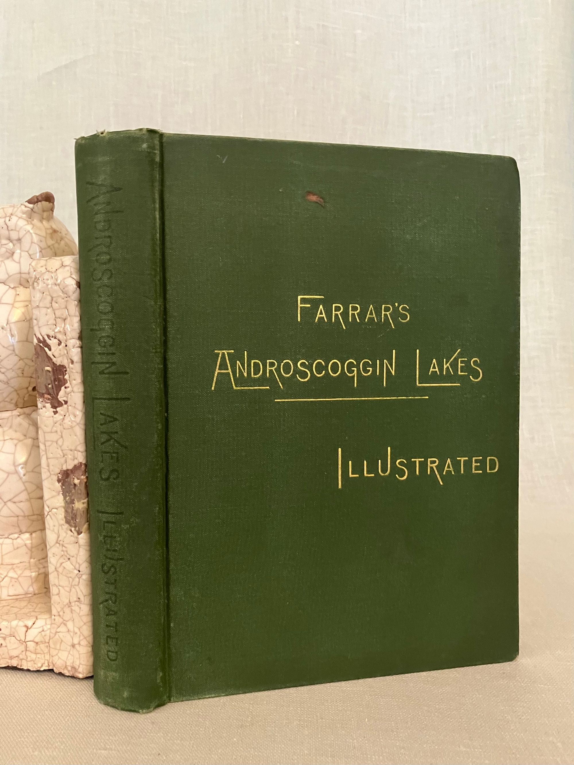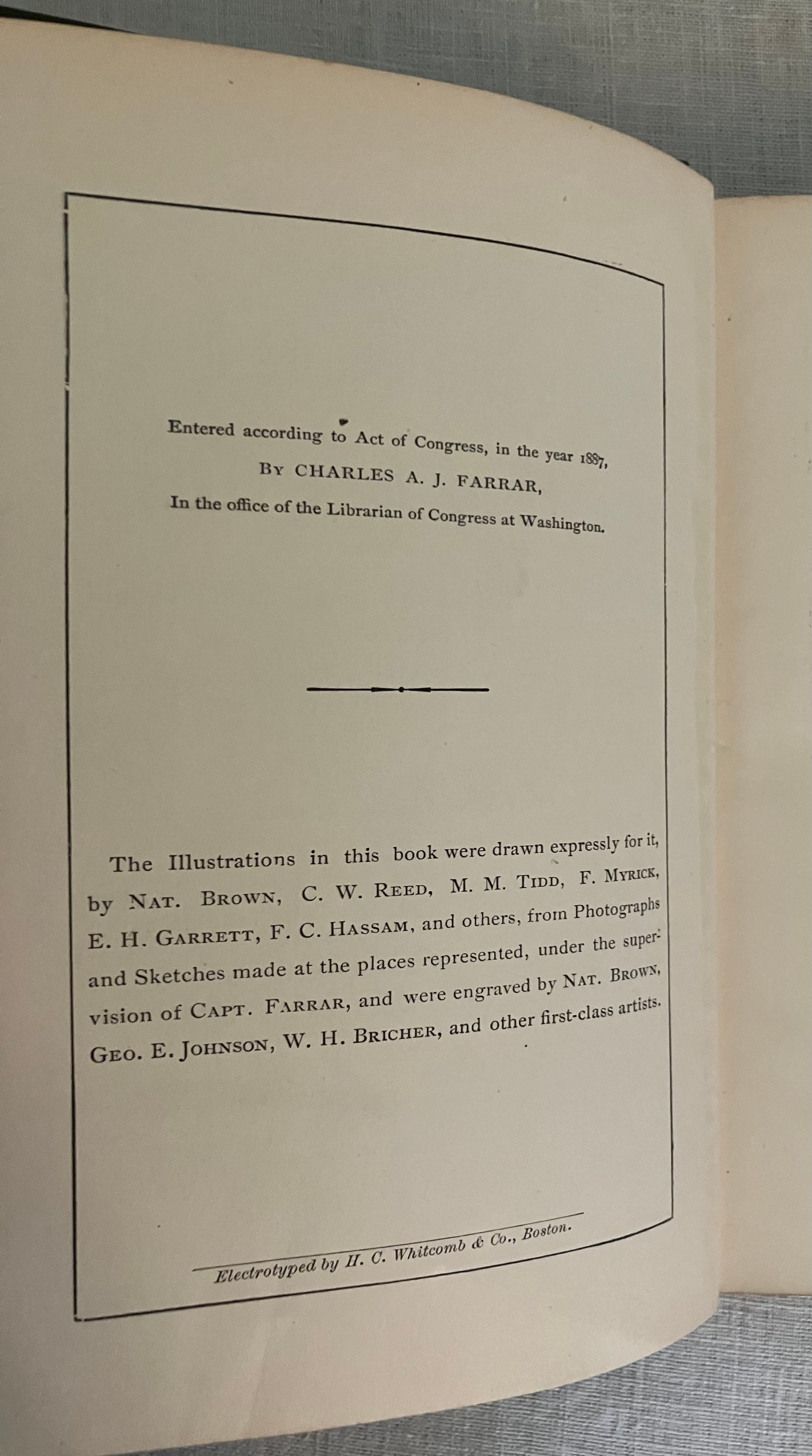 Reprint of the 1887 edition (12th edition). Hard cover 12 mo in green publisher's cloth with title blocked in gold to front board and in black to spine, with tan floral end papers, 73 engraved illustrations by various artists, including Nat. Brown, C.W. Reed, M.M. Tidd, F. Myrick, E.H. Garrett, F.C. Hassam, and W.H. Bricher. CONDITION: Lacking foldout Map, otherwise Very Good Minus. Light soiling and rubbing and to boards. Text block edges a bit dusty. A few pages within are soiled, (showing use as a guidebook would.)** Full of vintage advertising, as well as numerous engraved prints, many illustrating the author's methods of transport available for the early tourist. Articles recommend travel routes from Boston, some of the perils of camping, favorable fishing spots and the like.**Captain Charles Alden John Farrar (1842-1893), publisher of this guide, trained as a printer in Boston as a teen, later becoming a newspaper editor. His precocious business talents led him to launch a number of successful business ventures in the western Maine Rangeley Lakes Region beginning in the 1870's. This encompassed a rail link, stage coach and steamboat travel, a number of hotels and incidentals such as this guide book. The State of Maine granted Farrar, and his investors and business associates, a monopoly on travel to, and business in, this area. An interesting case study in nineteenth century vertical integration. Relatively Scarce. Ref:W. Krohn, Bethel Maine "Courier", (2012.)