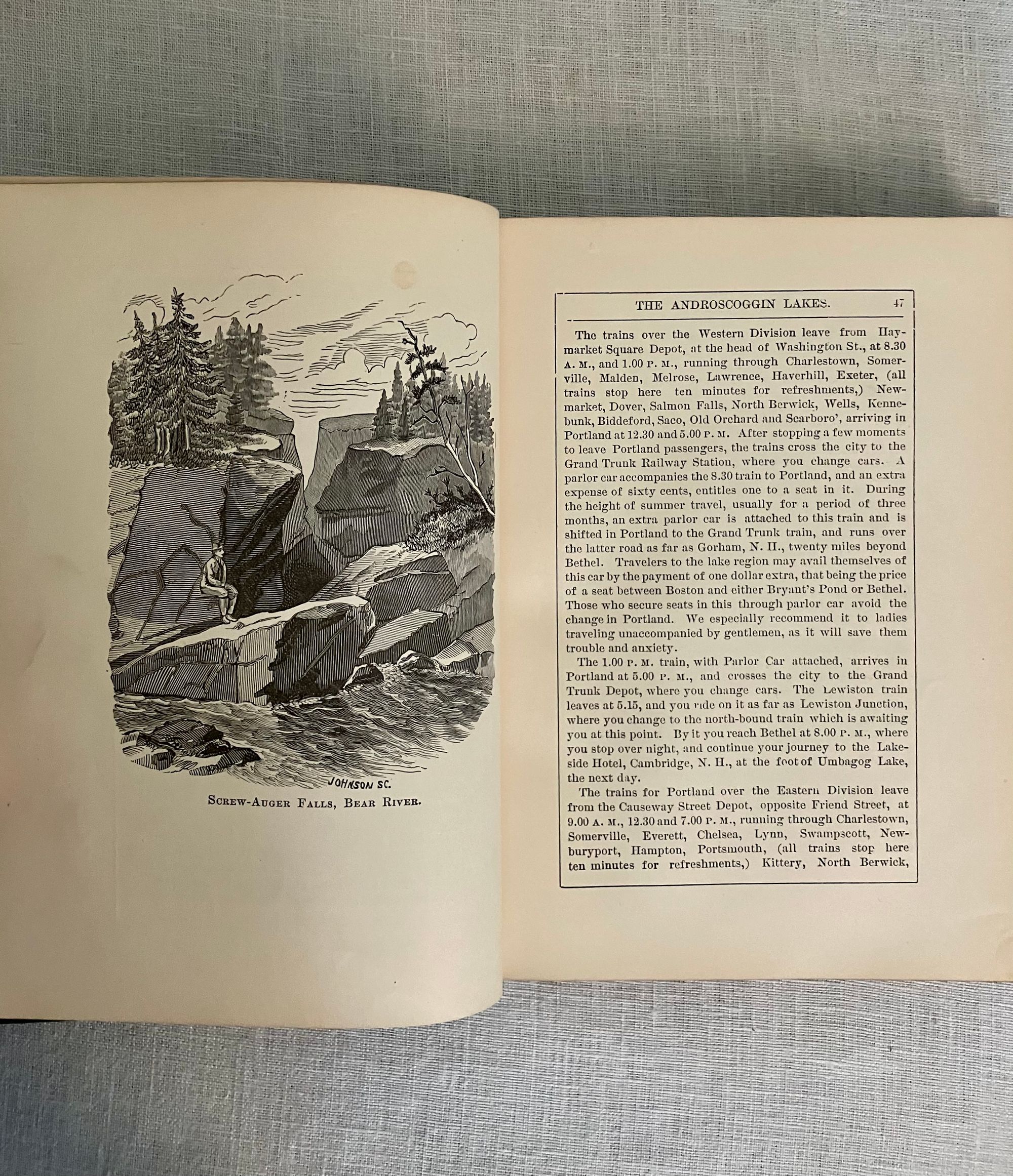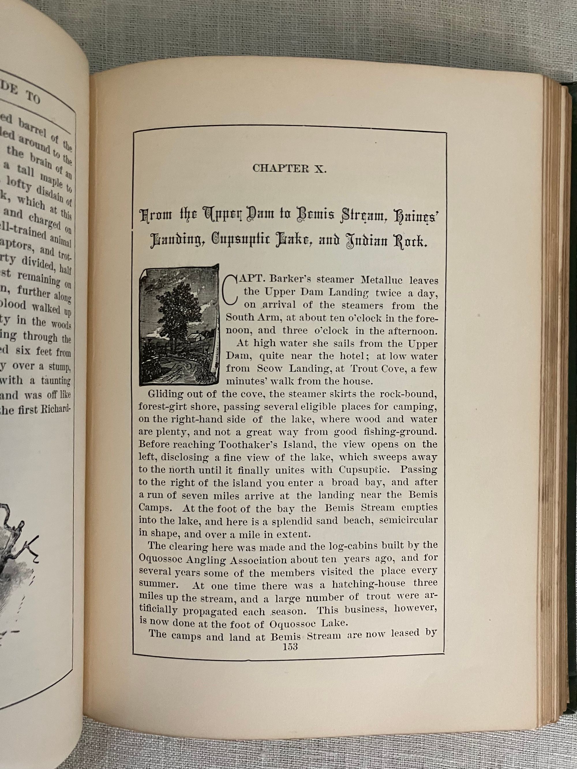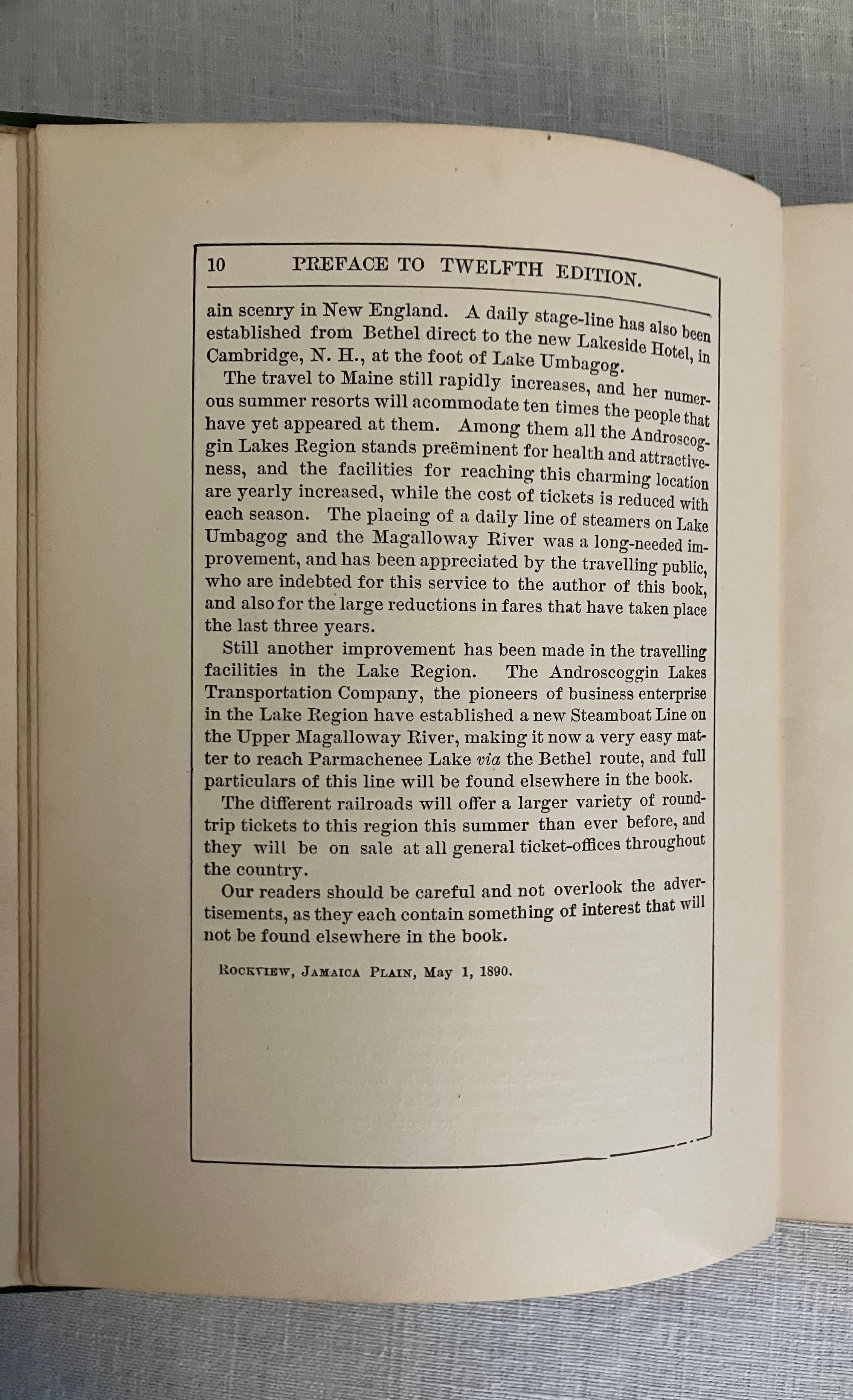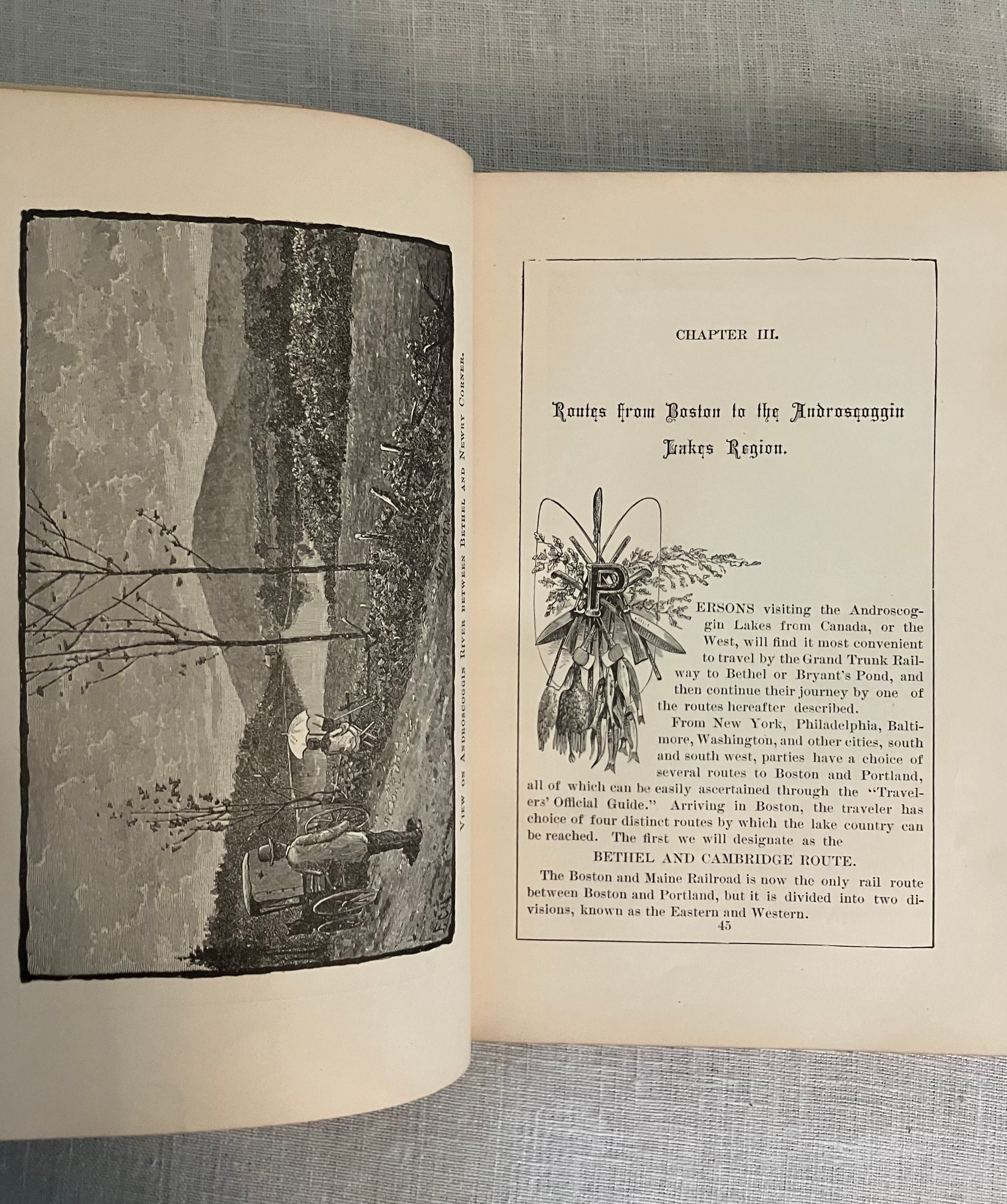 Reprint of the 1887 edition (12th edition). Hard cover 12 mo in green publisher's cloth with title blocked in gold to front board and in black to spine, with tan floral end papers, 73 engraved illustrations by various artists, including Nat. Brown, C.W. Reed, M.M. Tidd, F. Myrick, E.H. Garrett, F.C. Hassam, and W.H. Bricher. CONDITION: Lacking foldout Map, otherwise Very Good Minus. Light soiling and rubbing and to boards. Text block edges a bit dusty. A few pages within are soiled, (showing use as a guidebook would.)** Full of vintage advertising, as well as numerous engraved prints, many illustrating the author's methods of transport available for the early tourist. Articles recommend travel routes from Boston, some of the perils of camping, favorable fishing spots and the like.**Captain Charles Alden John Farrar (1842-1893), publisher of this guide, trained as a printer in Boston as a teen, later becoming a newspaper editor. His precocious business talents led him to launch a number of successful business ventures in the western Maine Rangeley Lakes Region beginning in the 1870's. This encompassed a rail link, stage coach and steamboat travel, a number of hotels and incidentals such as this guide book. The State of Maine granted Farrar, and his investors and business associates, a monopoly on travel to, and business in, this area. An interesting case study in nineteenth century vertical integration. Relatively Scarce. Ref:W. Krohn, Bethel Maine "Courier", (2012.)