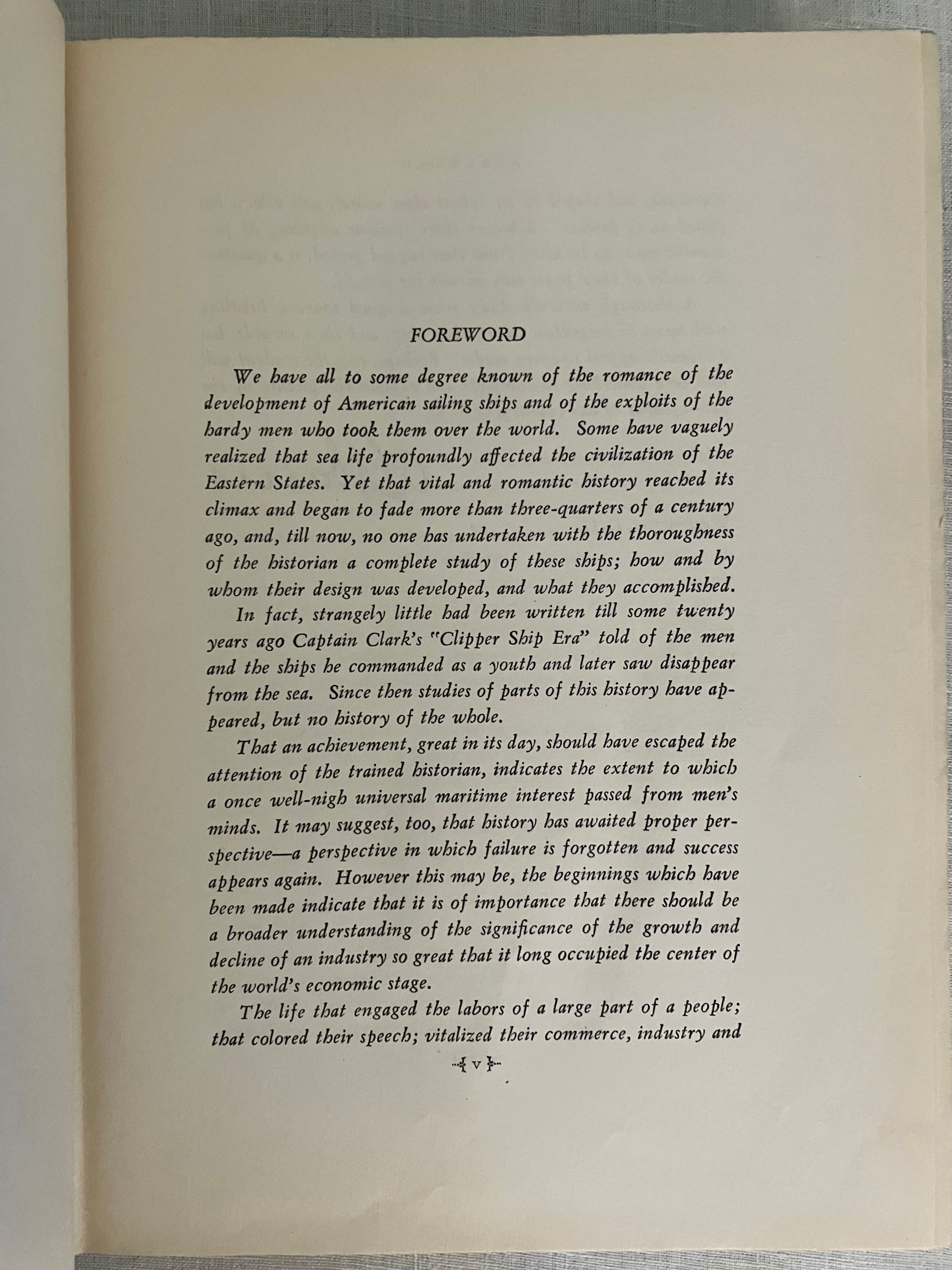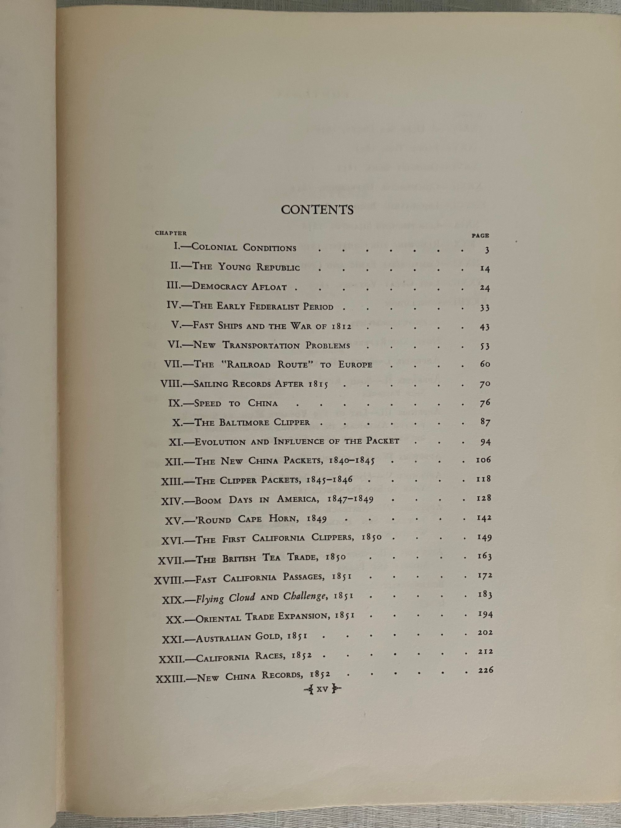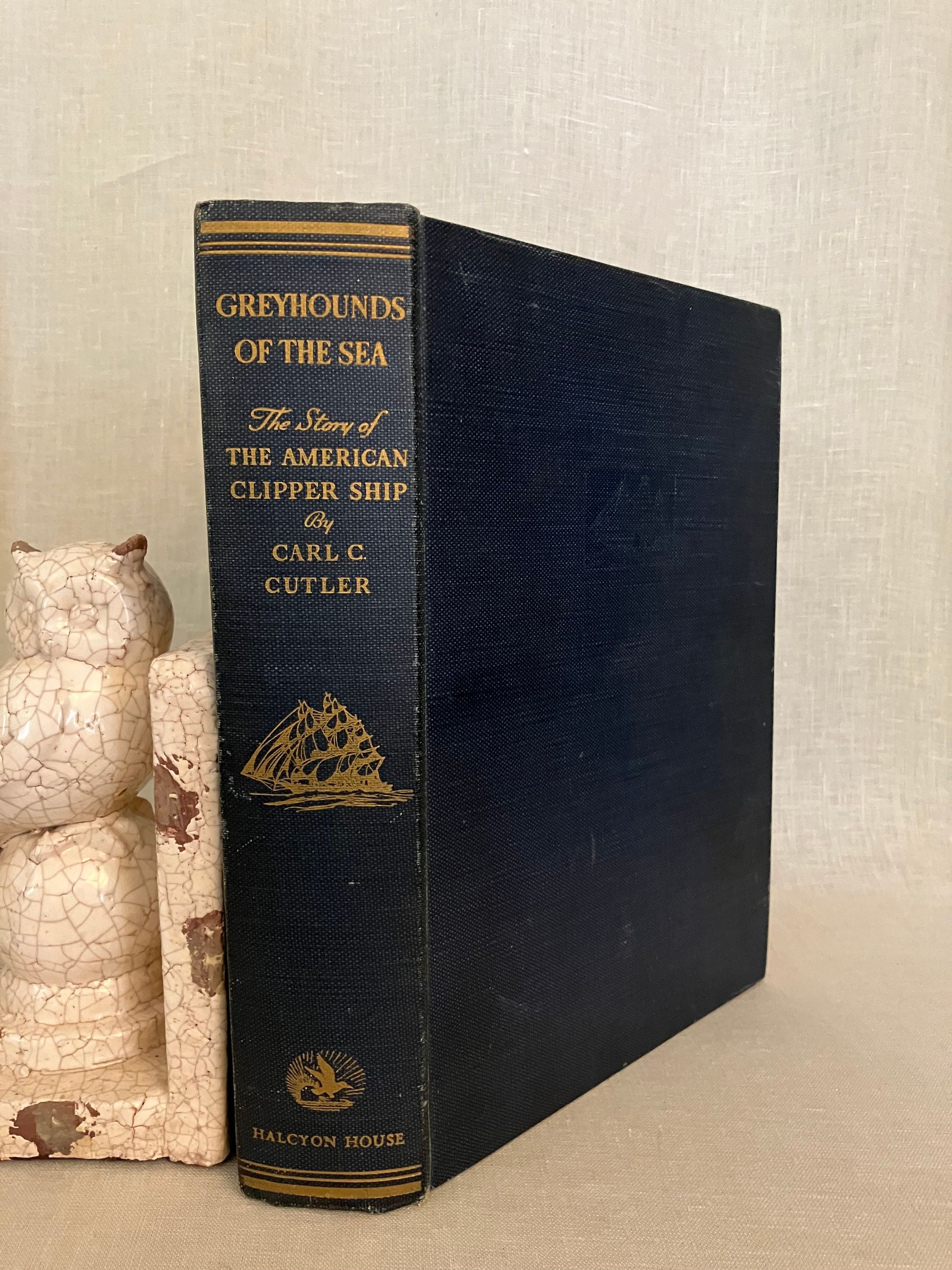 First edition Thus. (A reprint from the 1930 G.P. Putnam & Son's edition.) Hard cover, large 8vo, in blue cloth, with a blind stamped image of clipper ship to front board, the spine blocked with titles and clipper ship image in gold, map-printed endpapers, xxvii, 592pp. with many illustrations taken from marine paintings (some in color)**CONDITION: Very Good Plus. Lacking d/j, with a few marks to covers, light edge wear and slight toning to prelims. However, hinges are in order, and the pages remain clean, bright and with no signs of foxing. **This classic history of the American clipper ship belongs on the shelf of any mariner (or landlubber) of the ship-building communities along the American east coast, or those historians and economists interested in the conduct of trade under sail in the first century of the United States. The ports at Salem, Portsmouth, Newburyport, Boston, New York, Philadelphia, and San Francisco are touched upon, as well as foreign ports served by the ships launched from them. The China- to- England trade is listed in an appendix detailing 139 voyages between 1850-60, for instance. Individual vessels and their tonnages are listed and indexed. The Author, Carl C. Cutler (1878-1966) was a both a lawyer and a passionate researcher of maritime history, who helped establish the American Marine Historical Association, and was involved at Connecticut's Mystic Seaport Museum. Heavy book, may require extra postage if going abroad. OCLC 728685.