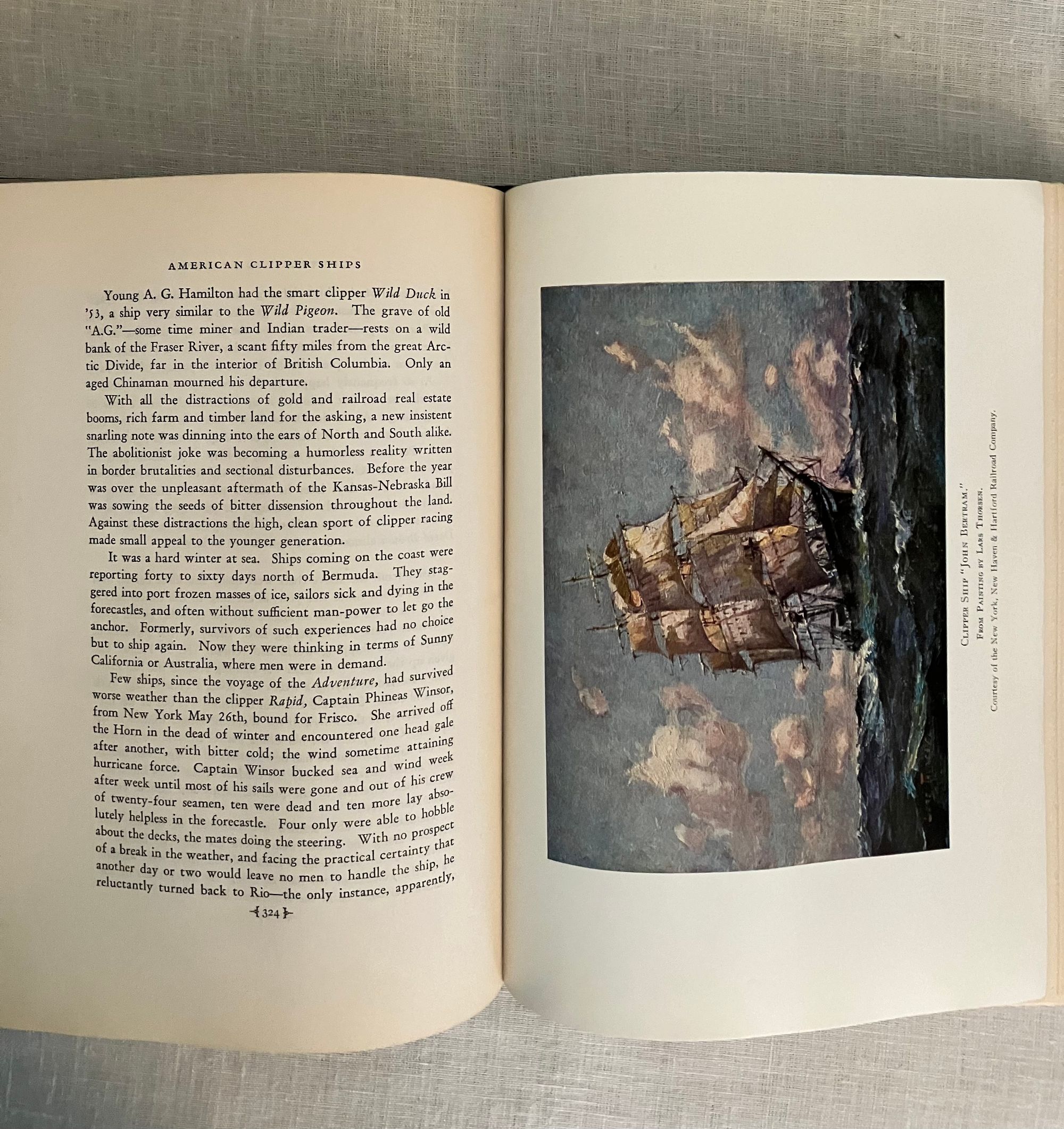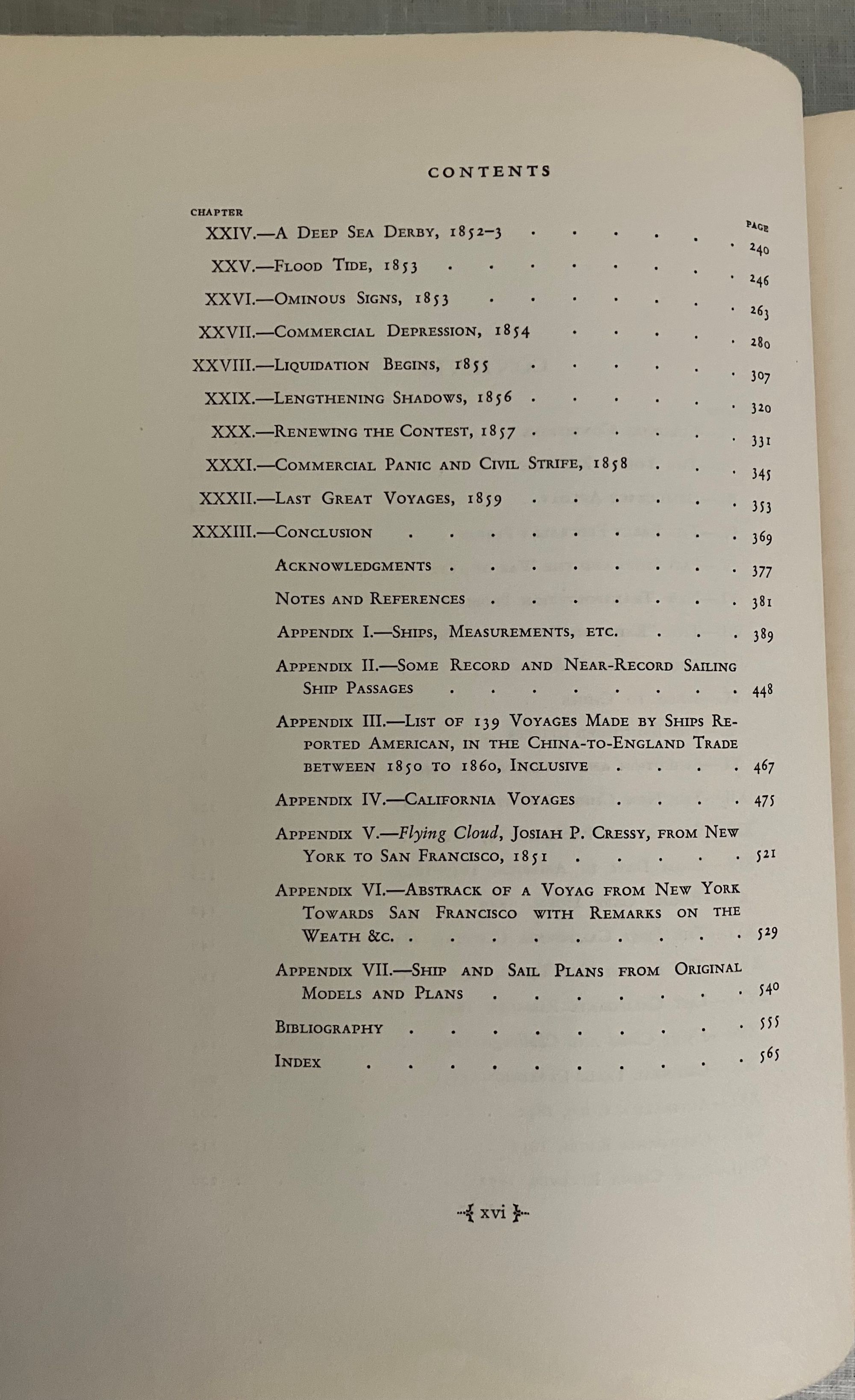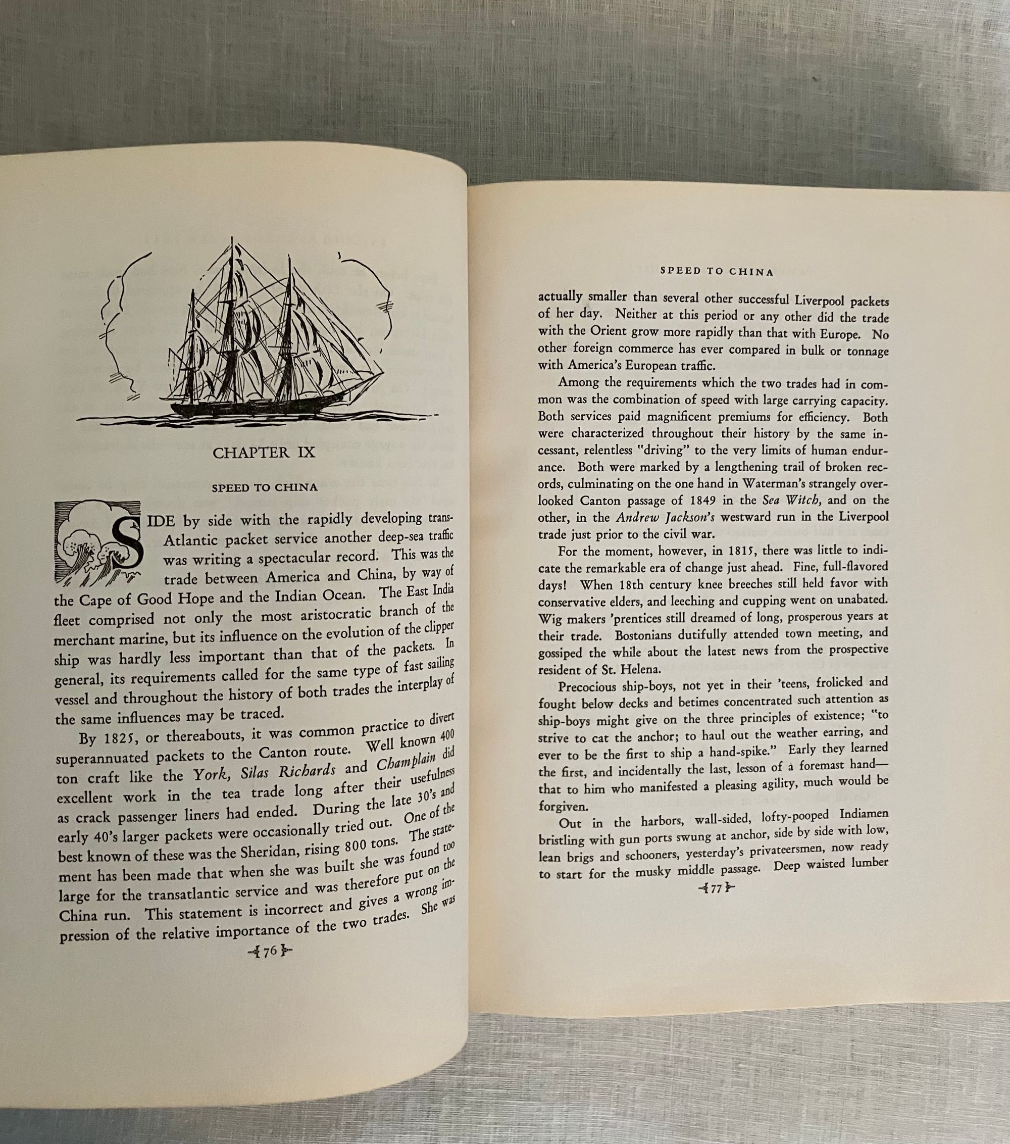First edition Thus. (A reprint from the 1930 G.P. Putnam & Son's edition.) Hard cover, large 8vo, in blue cloth, with a blind stamped image of clipper ship to front board, the spine blocked with titles and clipper ship image in gold, map-printed endpapers, xxvii, 592pp. with many illustrations taken from marine paintings (some in color)**CONDITION: Very Good Plus. Lacking d/j, with a few marks to covers, light edge wear and slight toning to prelims. However, hinges are in order, and the pages remain clean, bright and with no signs of foxing. **This classic history of the American clipper ship belongs on the shelf of any mariner (or landlubber) of the ship-building communities along the American east coast, or those historians and economists interested in the conduct of trade under sail in the first century of the United States. The ports at Salem, Portsmouth, Newburyport, Boston, New York, Philadelphia, and San Francisco are touched upon, as well as foreign ports served by the ships launched from them. The China- to- England trade is listed in an appendix detailing 139 voyages between 1850-60, for instance. Individual vessels and their tonnages are listed and indexed. The Author, Carl C. Cutler (1878-1966) was a both a lawyer and a passionate researcher of maritime history, who helped establish the American Marine Historical Association, and was involved at Connecticut's Mystic Seaport Museum. Heavy book, may require extra postage if going abroad. OCLC 728685.