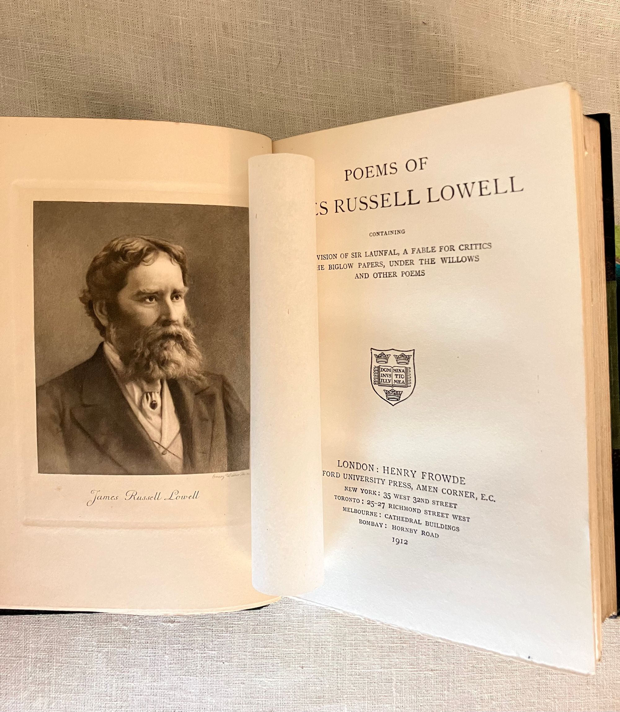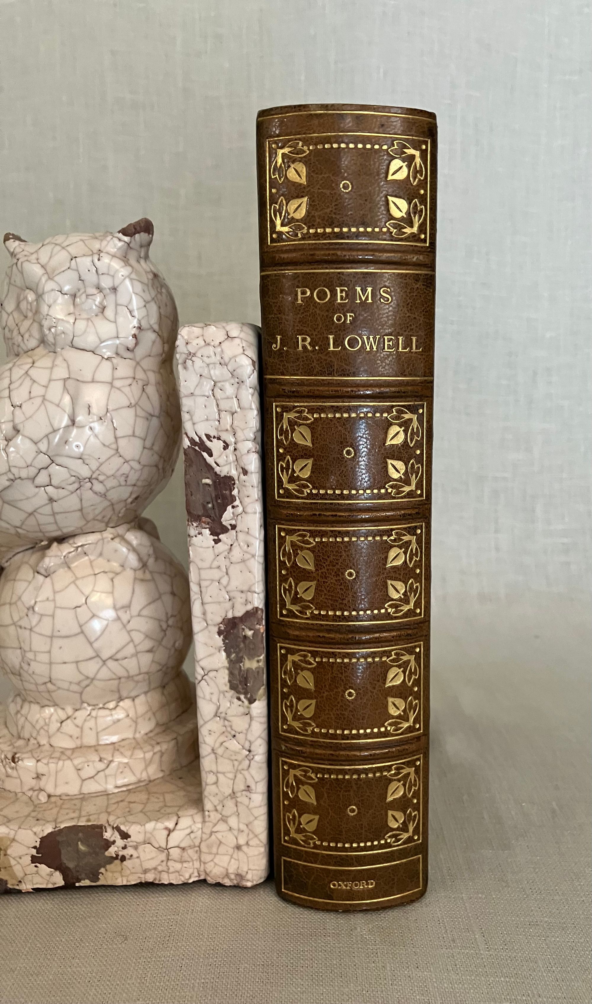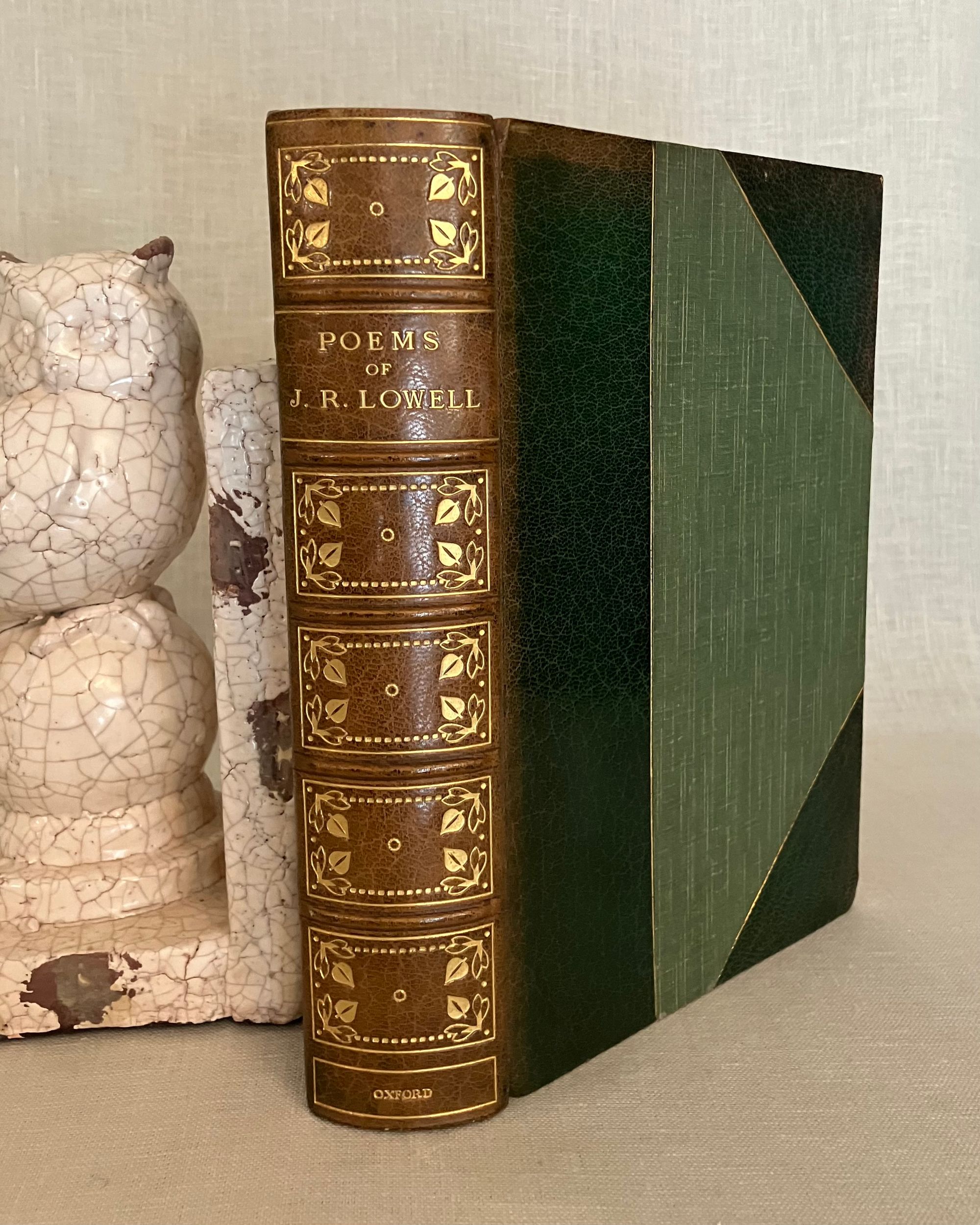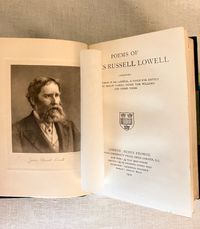 Hard cover, 8vo, finely bound (no signature) in three-quarter green morocco over green cloth gilt, the spine with five raised bands, with compartments tooled with a central roundel, leaf motifs to corners, joined by lines of small circles. Top edge gilt, new marbled end papers and prelims, a modern bookplate to prelims, laid in tissue guard to the frontispiece author photogravure portrait, text in two columns. Contents iii-vi, Poems 1-614, Appendix 615-619pp. Green silk ribbon bookmark intact.**CONDITION: Near Fine. Sunning and oxidation to the spine has faded it to brown, also seen partially at top of boards, both front and rear. Lightly worn corners (two bumped,) polish offset to endpapers from the turn-ins. Very light foxing to new prelims. Hinges and joints in order. Pages are otherwise clean, bright and the binding firm. **American Fireside Poet James Russell Lowell (1819-1891) was descended from first settlers of this bookseller's hometown, Newbury (Newburyport,) Massachusetts, his parents being of Scots decent. Lowell, a friend of Ralph Waldo Emerson, has been recognized as an important abolitionist voice in the mid-nineteenth century, both as a journalist, and poet. Born in Cambridge, Mass., Lowell was educated at Harvard College, graduating with a notably ropey academic record, however voted Class Poet. He would later become Professor of Languages at that same institution. Later life led him to editorship of The Atlantic Monthly and ambassadorship to both Spain and Great Britain. **Provenance: Ex-libris Alexander Stone, (1907-1998) Scottish lawyer, bibliophile, and benefactor to Glasgow University (with his bookplate.) Ex- Libris Christopher Foyle, of Beeleigh Abbey, late book collector and former CEO of Foyles Bookstore in Great Britain. Founded at the Charing Cross Road location in London in 1903, Foyles grew into a large chain in the twentieth century, selling to Waterstones in 2018. [BAL 13248 refers to a later reprint of this edition.] (2.13lbs)