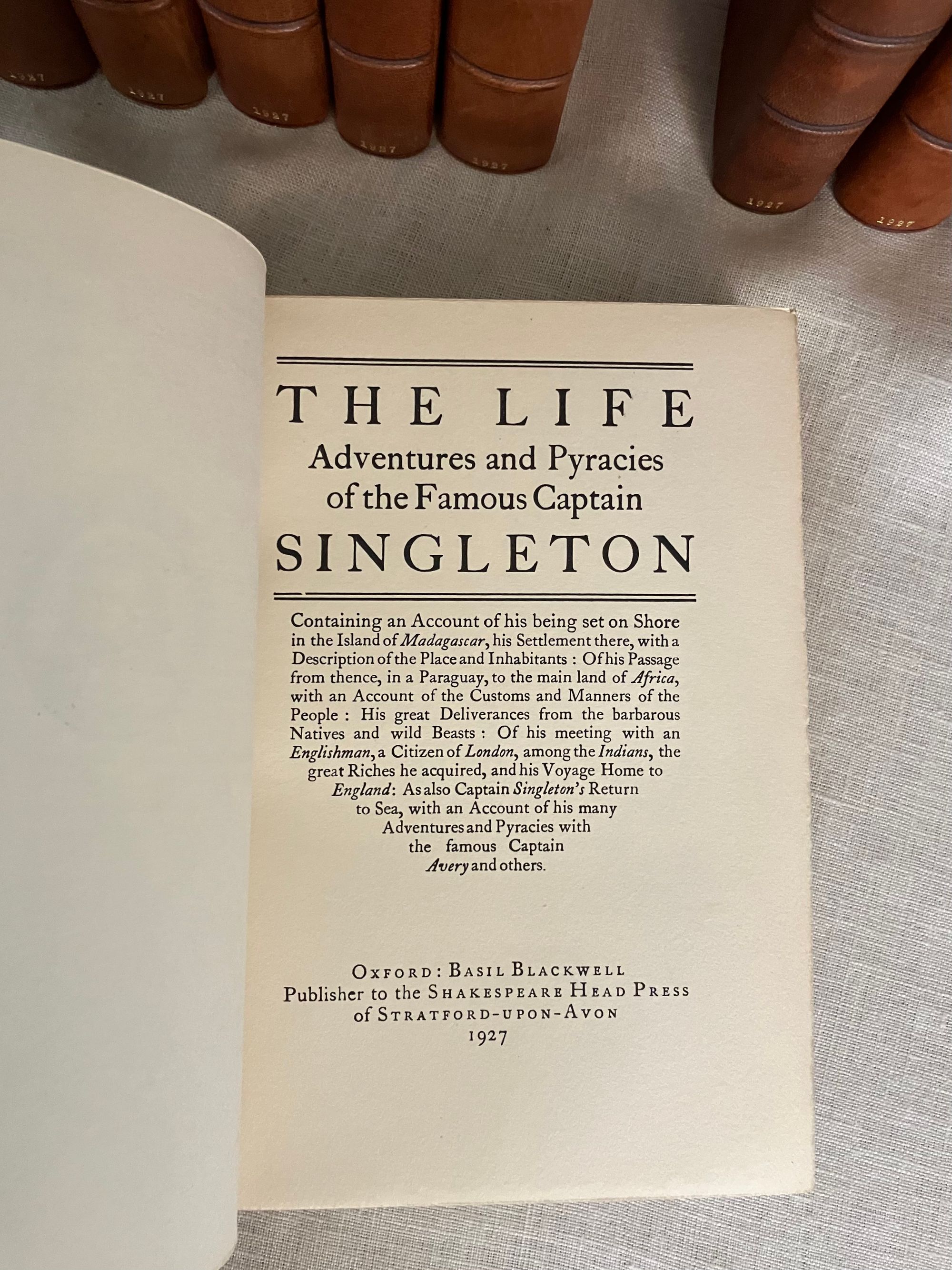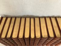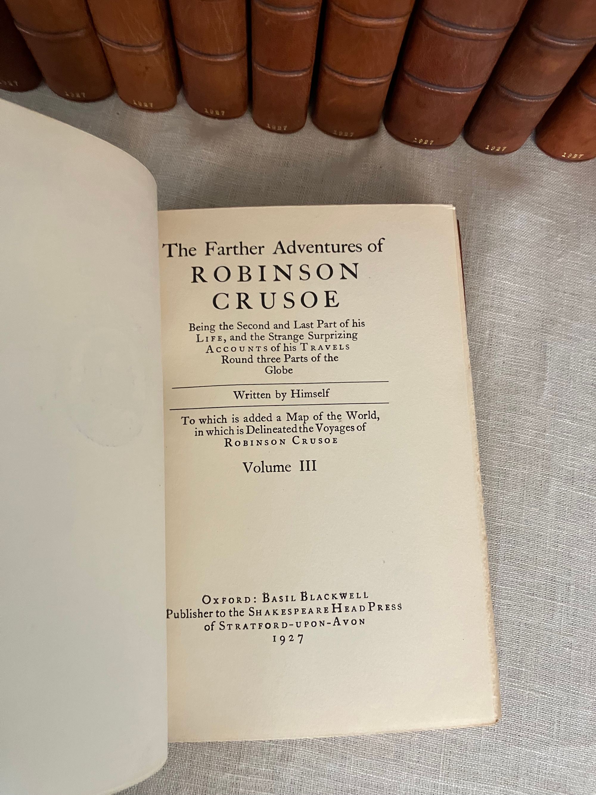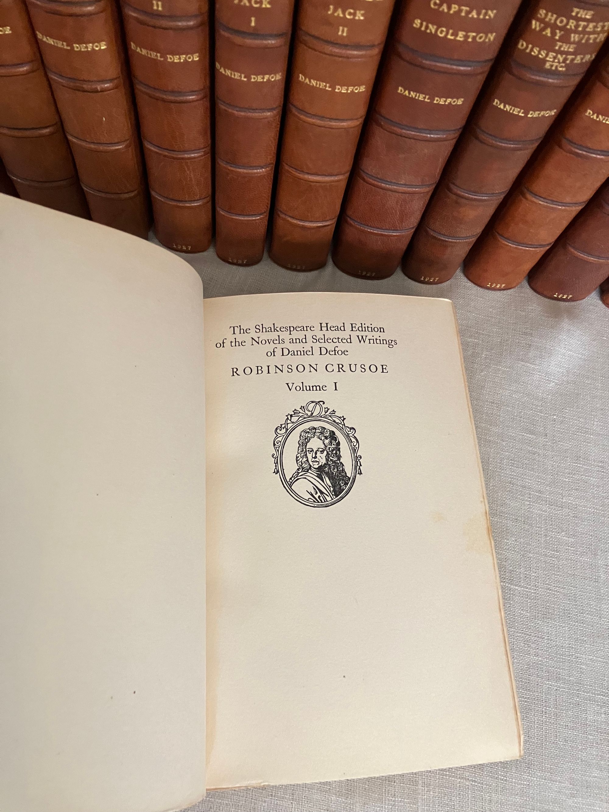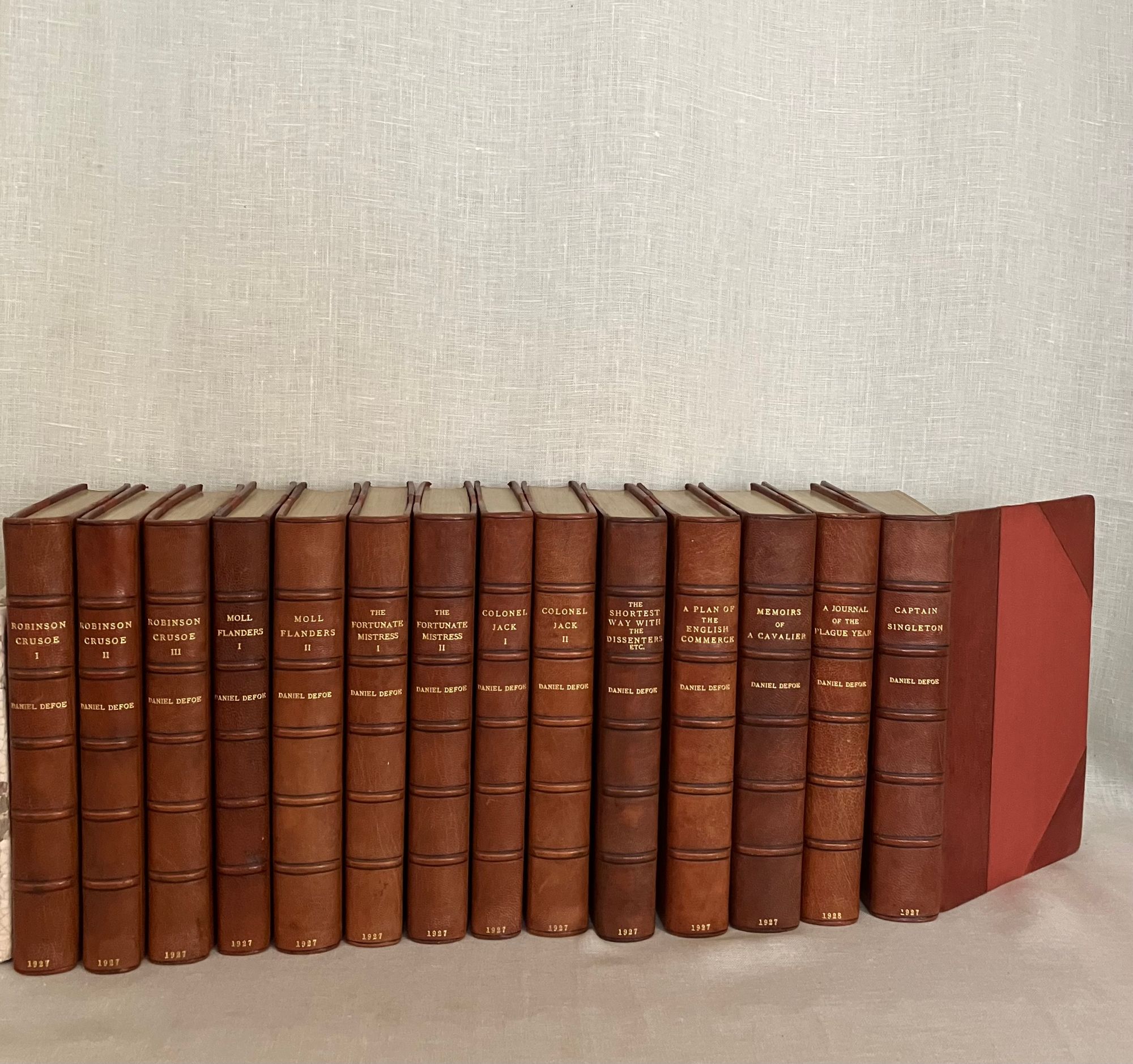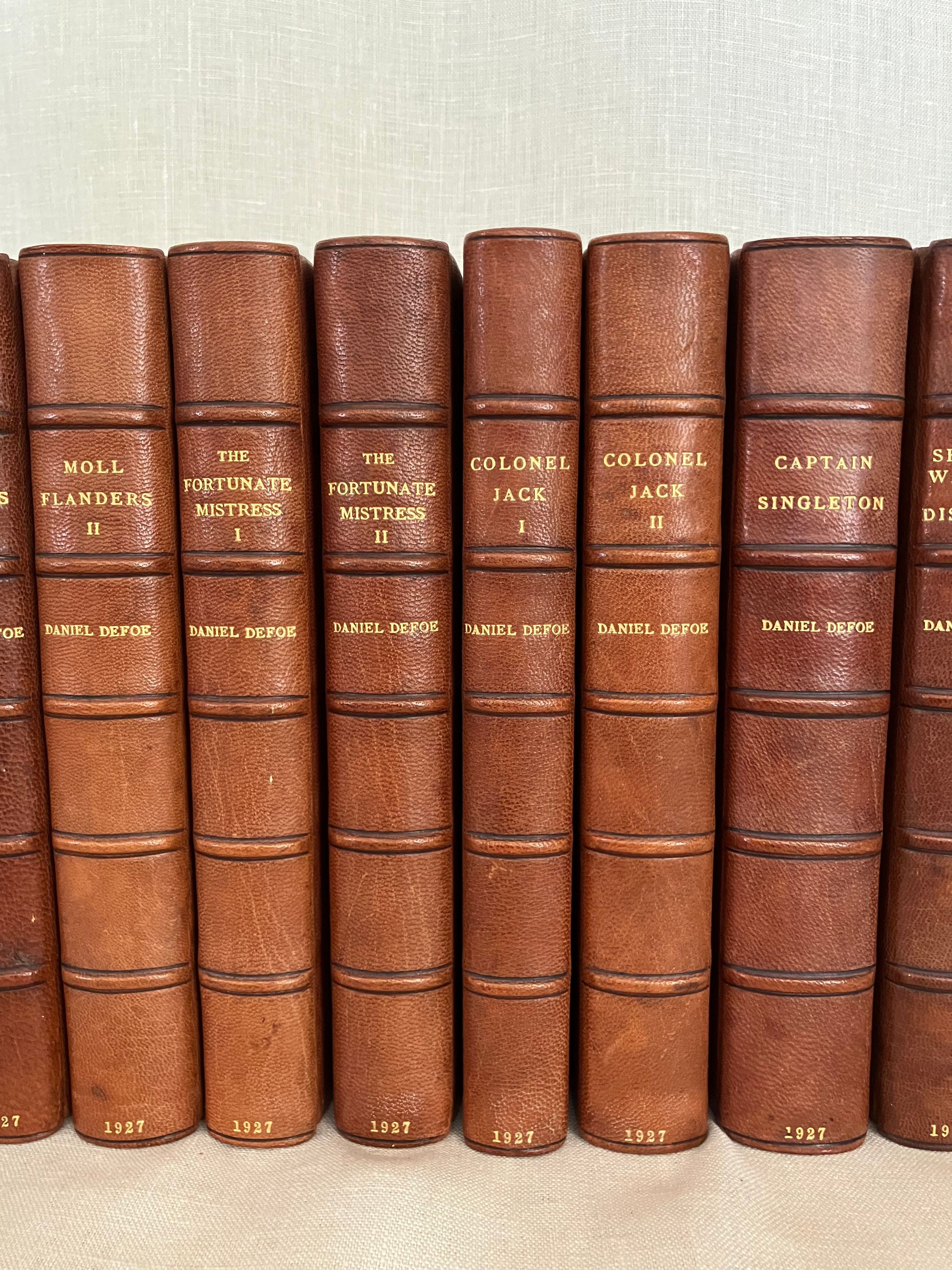 Hard cover, 12mo, (5 1/4 x 7 5/8 inches) in a contemporary fine binding (not signed) of three-quarter crushed morocco over terracotta cloth-covered boards, the five raised bands of the spine and other edges banded by hot tool in blind, with the title and author is in gilt to the second and third compartments to the spine. Top edge gilt, others untrimmed, with cream laid paper paste downs and printed upon similar, heavy wove paper stock, the editions dated 1927-28, First Edition Thus. Various pages. A modern bookplate to the front pastedown of each volume. All type is black. CONDITION: Near Fine, showing virtually no wear. Missing one fold-out map from Vol. I "Robinson Crusoe," but has the one called for in Vol. III. Perhaps left out during the rebinding ? There are several volumes showing some foxing externally to the fore or bottom edge of the text block only; this very rarely intrudes upon the reading area, and very occasionally affects the prelims. There is minor polish offset to the ffeps. The bindings are firm, hinges in order, pages clean and unwritten in. CONTENTS: Each volume of the set contains a half title, limitation statement, and introductory bibliographical page with appropriate introductory editorial comments. The titles are: " The Adventures of Robinson Crusoe" with one foldout-map to rear of Vol.III (3 volumes), 1927. "Moll Flanders," (2 vols.)1927. "The Fortunate Mistress" (2 vols.) 1927. "Colonel Jack." (2 vols.) 1927. "Captain Singleton," 1927. "The Shortest Way with the Dissenters," 1927. A Plan of the English Commerce," 1927. "Memoirs of a Cavalier," 1927, and finally, "A Journal of the Plague Year," 1928.**English Author Daniel Defoe (1660-1731) has been described as a "pamphleteer, novelist, merchant and spy, and "father of the English novel." **This issue constitutes a very early publication from the successors to the founder/publisher of The Shakespeare Head Press, A.H. Bullen, who died in 1927. Sir Basil Blackwell (1889-1984), son of an Oxford bookshop owner, was a pioneering publishing phenom who, according to the New York Times, would go on to found The Blackwell Group "comprised of more than 60 companies involved in printing, publishing, distributing and selling books and periodicals. These include more than 50 bookshops throughout Britain and Europe." (4/11/1984, Sec. B, p. 11.) His early days in the capacity of publishing, however, saw the removal of the Shakespeare Head's offices from Stratford-on-Avon to his native Oxford. The attention to production techniques used by the Shakespeare Head Press in has been said to be carrying on in the William Morris tradition of fine press revival. Takes 17 inches of shelf space. OCLC 735411. Watson 882. Provenance: Sir Alexander Stone, Glasgow banker and philanthropist. (16.3 lbs.)