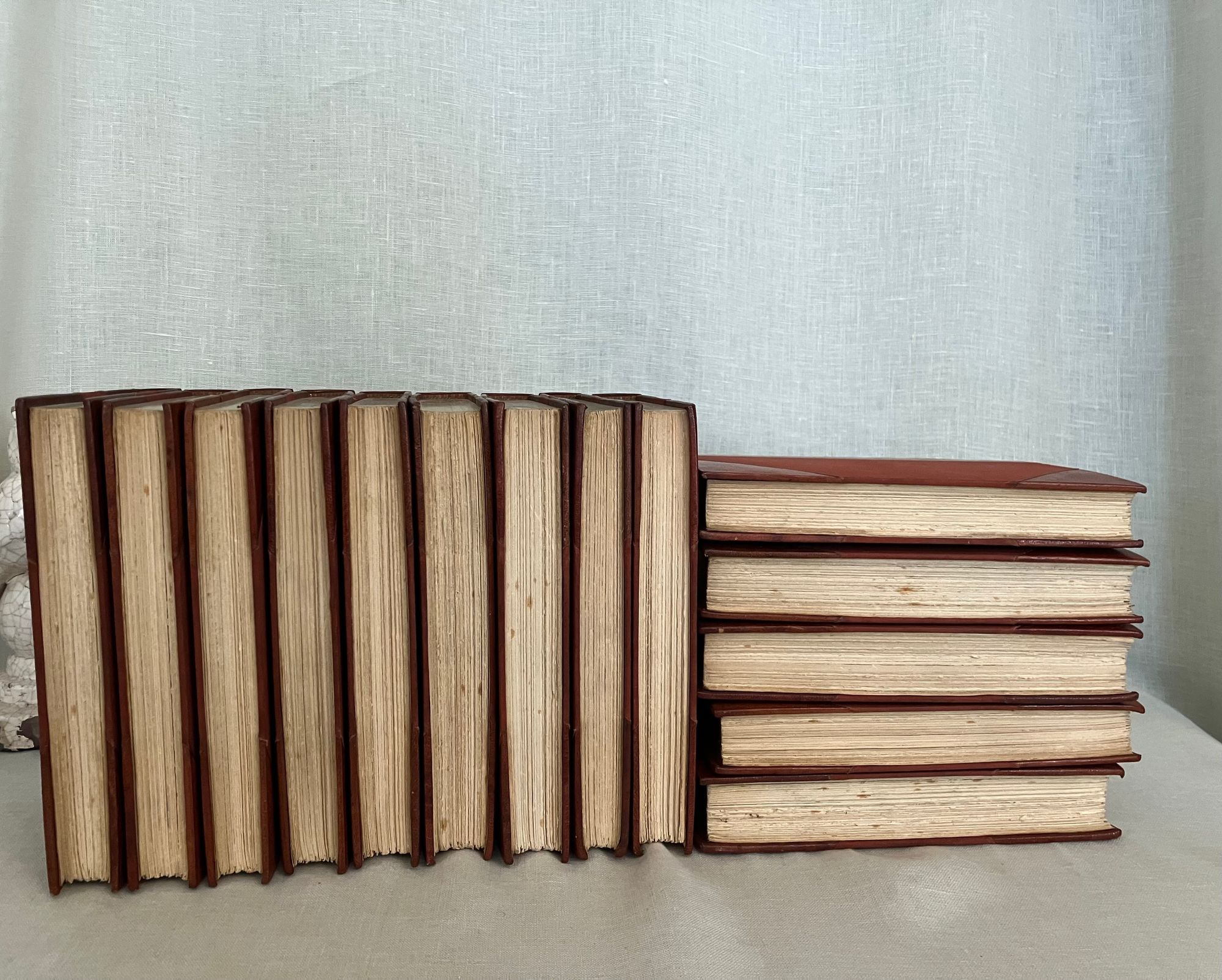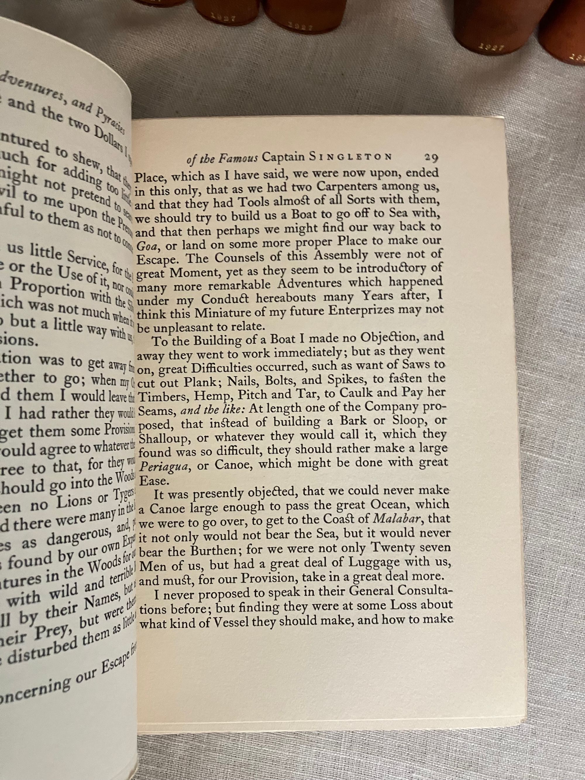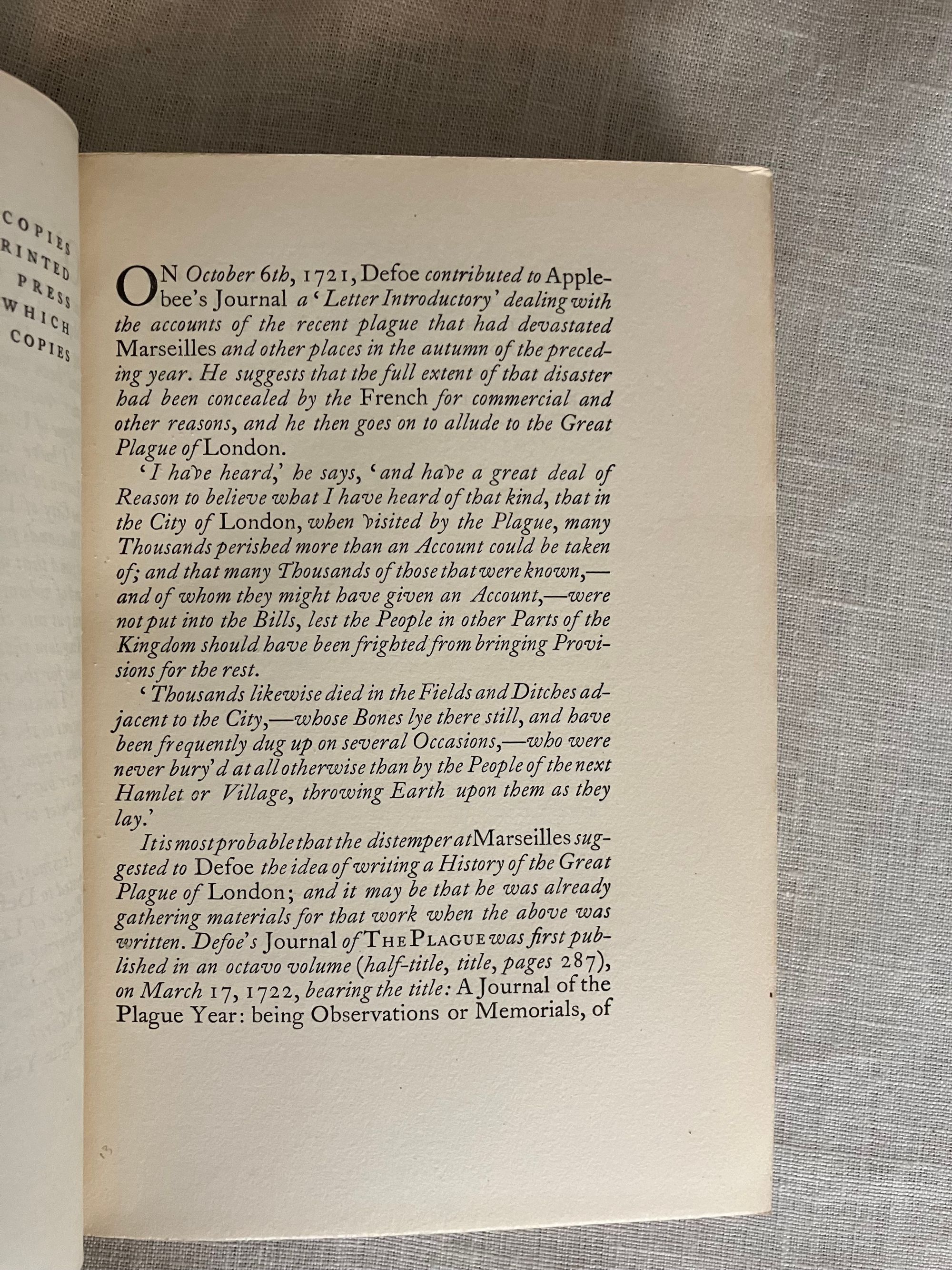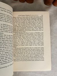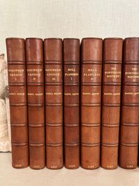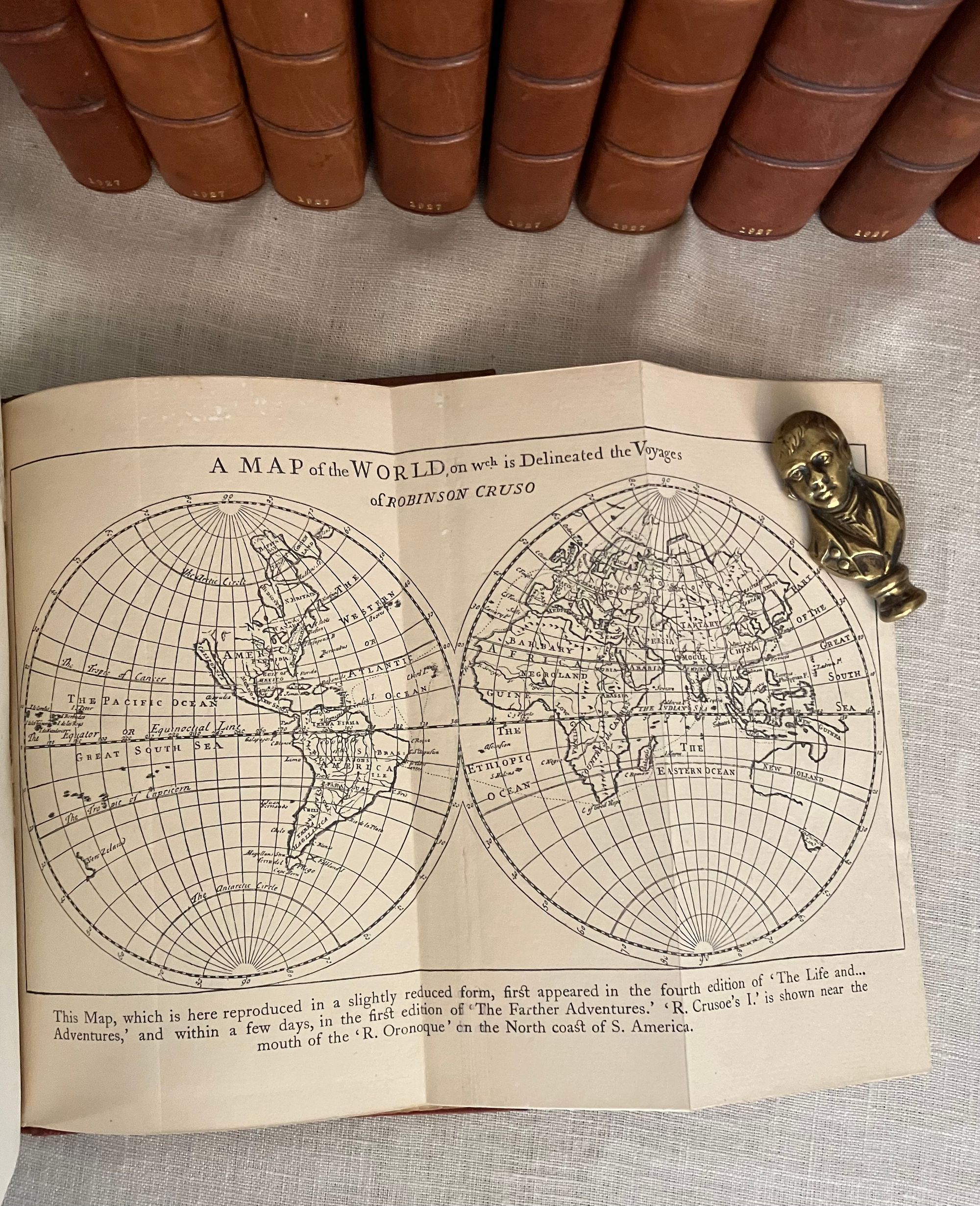 Hard cover, 12mo, (5 1/4 x 7 5/8 inches) in a contemporary fine binding (not signed) of three-quarter crushed morocco over terracotta cloth-covered boards, the five raised bands of the spine and other edges banded by hot tool in blind, with the title and author is in gilt to the second and third compartments to the spine. Top edge gilt, others untrimmed, with cream laid paper paste downs and printed upon similar, heavy wove paper stock, the editions dated 1927-28, First Edition Thus. Various pages. A modern bookplate to the front pastedown of each volume. All type is black. CONDITION: Near Fine, showing virtually no wear. Missing one fold-out map from Vol. I "Robinson Crusoe," but has the one called for in Vol. III. Perhaps left out during the rebinding ? There are several volumes showing some foxing externally to the fore or bottom edge of the text block only; this very rarely intrudes upon the reading area, and very occasionally affects the prelims. There is minor polish offset to the ffeps. The bindings are firm, hinges in order, pages clean and unwritten in. CONTENTS: Each volume of the set contains a half title, limitation statement, and introductory bibliographical page with appropriate introductory editorial comments. The titles are: " The Adventures of Robinson Crusoe" with one foldout-map to rear of Vol.III (3 volumes), 1927. "Moll Flanders," (2 vols.)1927. "The Fortunate Mistress" (2 vols.) 1927. "Colonel Jack." (2 vols.) 1927. "Captain Singleton," 1927. "The Shortest Way with the Dissenters," 1927. A Plan of the English Commerce," 1927. "Memoirs of a Cavalier," 1927, and finally, "A Journal of the Plague Year," 1928.**English Author Daniel Defoe (1660-1731) has been described as a "pamphleteer, novelist, merchant and spy, and "father of the English novel." **This issue constitutes a very early publication from the successors to the founder/publisher of The Shakespeare Head Press, A.H. Bullen, who died in 1927. Sir Basil Blackwell (1889-1984), son of an Oxford bookshop owner, was a pioneering publishing phenom who, according to the New York Times, would go on to found The Blackwell Group "comprised of more than 60 companies involved in printing, publishing, distributing and selling books and periodicals. These include more than 50 bookshops throughout Britain and Europe." (4/11/1984, Sec. B, p. 11.) His early days in the capacity of publishing, however, saw the removal of the Shakespeare Head's offices from Stratford-on-Avon to his native Oxford. The attention to production techniques used by the Shakespeare Head Press in has been said to be carrying on in the William Morris tradition of fine press revival. Takes 17 inches of shelf space. OCLC 735411. Watson 882. Provenance: Sir Alexander Stone, Glasgow banker and philanthropist. (16.3 lbs.)