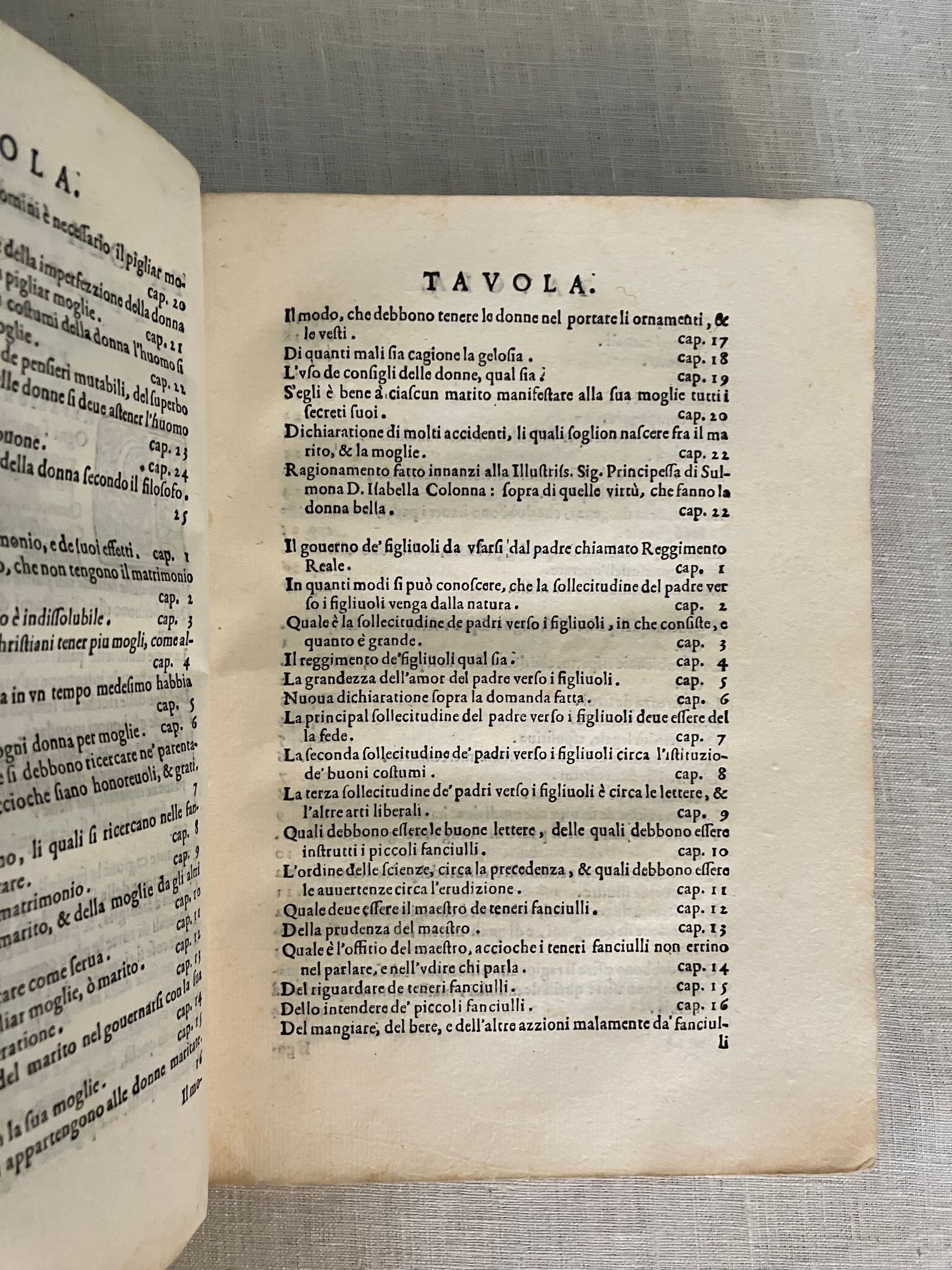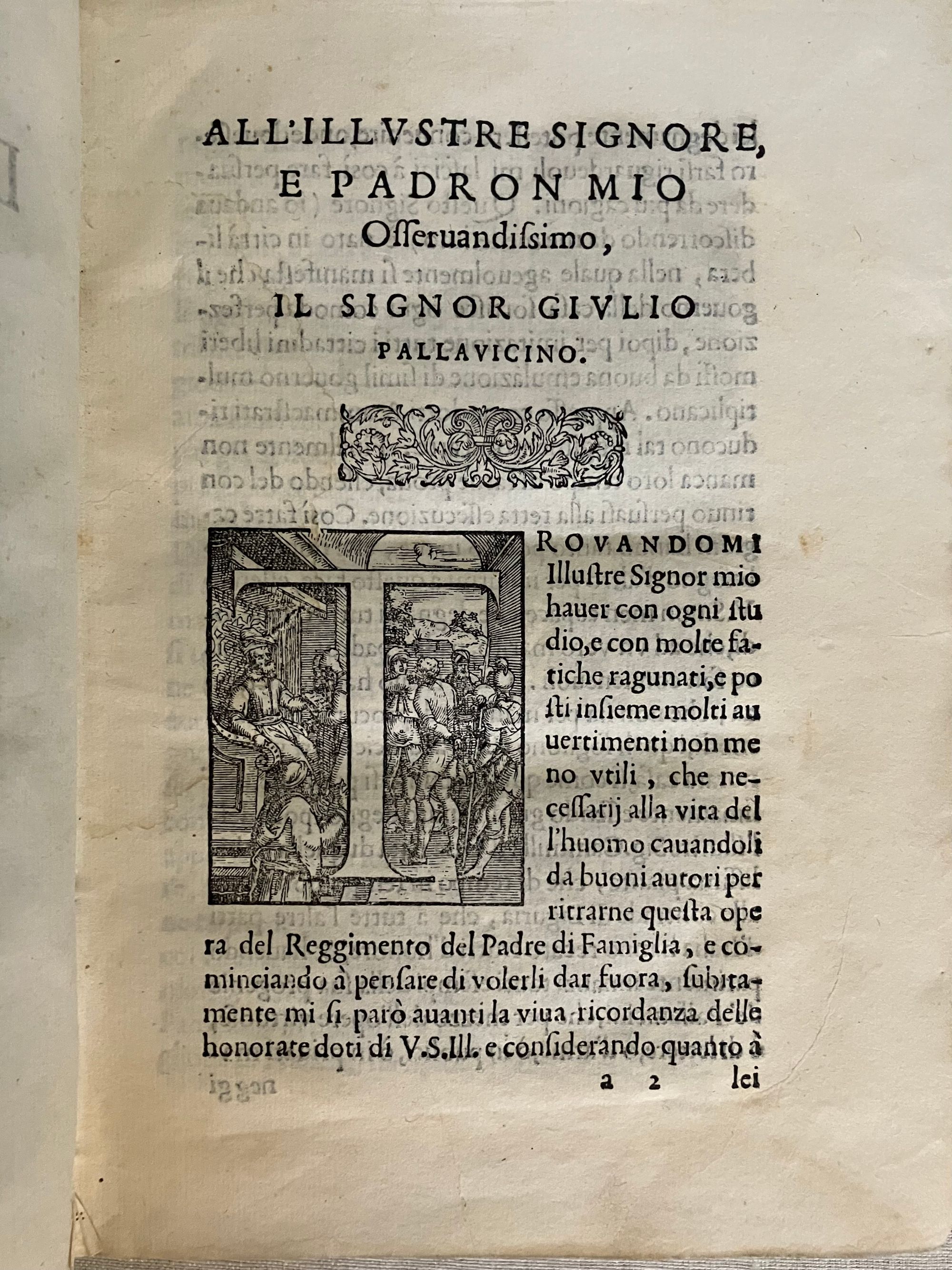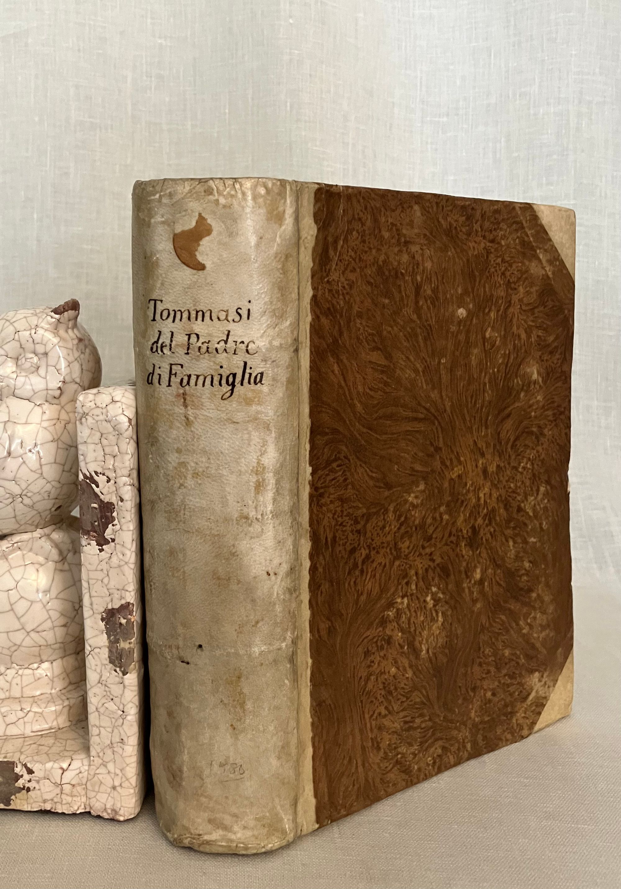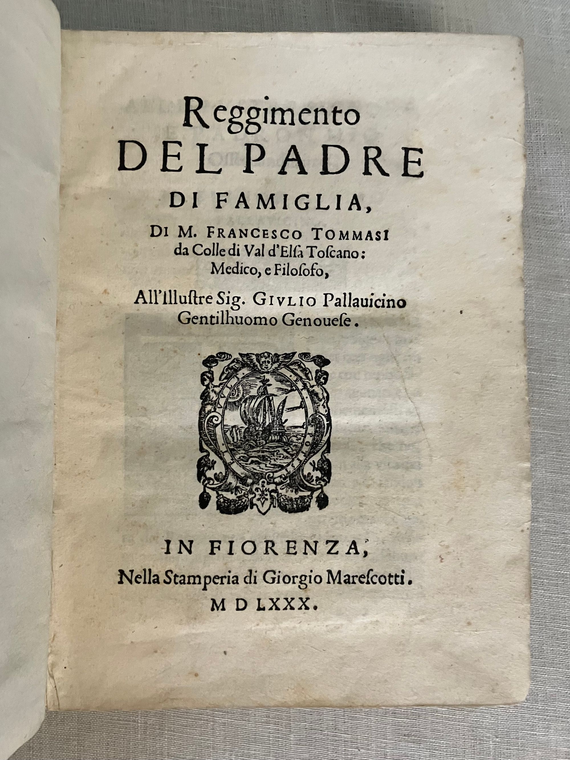 Hard cover 4to (measuring 6 1/2 x 8 3/4 inches,) in the original full vellum case, which appears to have been "updated," perhaps in the eighteenth century, with an onlaid additional layer of vein-painted parchment to resemble tree calf. (Perhaps made to match a collector's library.) An old calligraphic red ink title is lettered along the bottom of the text block, while the spine has the title, in a different hand, neatly lettered in black ink. Two woodcut printer's devices are present, with the initials "GM,": one on the title page measuring 1 3/4 x 2 inches, and a larger one upon the book's final page measur. 2 1/2 x 3 1/2 inches. The title page block depicts a masted ship sailing away on windy seas being aided by four blowing clouds, and a smiling sun amidst architectural festoons flanked by two winged female harpies; the larger printer's device at the rear of the book, however, has the scene reversed with the ship arriving, and the landmarks, wind and sun in mirror image. Also the female harpies are replaced with two flanking male satyrs. An identical motto to both in Latin: Et potest et vult (ready and able).The text contains 13 detailed woodcut historiated capitals. (The largest one illustrating the "T" may contain a portrait of Grand Duke Cosimo I de'Medici seated upon a throne-like seat, surrounded by fellow Florentines, and some of his mercenary halberd-bearing guard, the Lanzi. This is a conjecture based on visual similarity to contemporary portrait busts by Bandini, Bronzino and others.) COLLATION: pp. [80] 1-561 [3] ( 2 Pages are mis-numbered by printer after p. 245, and again after p. 333). a4-k4, A4-Z4, Aa4-Zz4, AAa4-ZZz4, AAaa4, [2]. Complete.**CONDITION: Very Good Plus Antiquarian Condition, including a single old worm track at both hinges, some old water stains at lower edge (not affecting text) and some occasional foxing (usually at top margin of affected pages) and a small number of browned text areas. Many fresh pages overall, however. Binding is firm and generally clean. One former institutional stamp, and neat inventory notes to both paste downs in old ink, pencil and blue china marker(?) **The DEDICATION of the work is to the Illustrious Guilio Pallavicino "gentleman of Genoa." Married into the aristocratic Doria family, Pallavicino had, by 1584, collected a sizable library consisting of more than 2000 volumes. He is described as a historian and writer, and patron of Genoa's humanistic Accademia degli Addormentati (The Academy of Sleepers) between 1563 and 1587. By 1600, he and his brother had donated a church, the Chiesa del Gesù, to the City of Genoa. The Pallavicino/Doria families were also patrons of the artist Peter Paul Rubens when he came to Genoa in 1600, commissioning a number of his paintings. Pallavino's literary interests brought him into contact with the Author.(A. Orlando, Trecanni)**CONTENTS: Dedication letters and verses to Pallavicino are by the author, and include others from Girolamo Catena, Cesare Mazzutelli, commendatory verses from M. Piero Contestabile, doctor of medicine ; M. Cristoforo Castellett, poet and playwright, and M. Averelio Orsi, the Court poet for Cardinale Alessandro Farnese, (and brother to the Vatican artist and mosaicist, Prosero Orsi; Prospero was also a collegue of Caravaggio.) Also a letter by Alberto Picchinesi, lawyer. Other contents incl. Index, and Table of Contents by subject and by Chapter headings. Libra Primo: The moral duties of a man toward his wife and children. Definitions of family, correct behavior and decorum, education, work life and the like. Libre Secunda: This is agricultural in nature and more home economics related. What kinds of industry is a man naturally inclined to. How to store the seeds of various plants: almonds, peaches, melons and apples, figs etc. **AUTHOR of this work FRANCESCO TOMMASI (fl. 1575-1589) was a medical doctor born in Colle Val d'Elsa, a village midway between Florence and Siena to the south. CERL cnp02263700. **The influential Florentine publisher and typographer, GIORGIO MARESCOTTI (fl.1563-1602) was primarily notable for being the first music publisher in that city. Born in France, he came to work in Florence (N. Lamal) providing translation from the French, as well as printing. His widow and daughter, Agnoletta and Margherita Marescotti took over the business upon Giorgio's death in 1602, working respectively as a bookseller and printer. (CERL cnp00573394.)(T. Carter) The SIGNIFICANCE in this work may lie broadly in two areas; the study of contemporary attitudes towards the family and social hierarchy structures in the late Italian Renaissance, as seen in education and employment, the raising of children, the place of women in both the traditional family and work settings. Also, the study of agricultural and land use as related to the former.**USTC 859361. CNCE (EDIT16) 282918. OPAC SBN TO0E 001169. B. Gamba da Bassanno (1839) Nr.1700. p. 485. T. Carter on Marescotti: "Music Printing in Late Sixteenth and Early Seventeenth Century Florence: Giorgio Marescotti, in Early Music History, Vol. 9 (1990), pp. 27-72. A. Orlando: "Rubens in Genoa, Awe and Wonder" in Wanannes Art Magazine interview. A really interesting inventory of the household goods and equipment belonging to the printer's family is discussed in D. Parker: Women in the Book Trade in Italy, 1475-1620," Renaissance Quarterly, Autumn 1996. pp.509-541. PROVENANCE: Lawes Agricultural Library. This very book listed in Aslin, "Library Catalogue of Printed Books and Pamphlets on Agriculture published between 1471 and 1840" Rothamsted Experimental Station, Harpenden, (1940) p. 275.