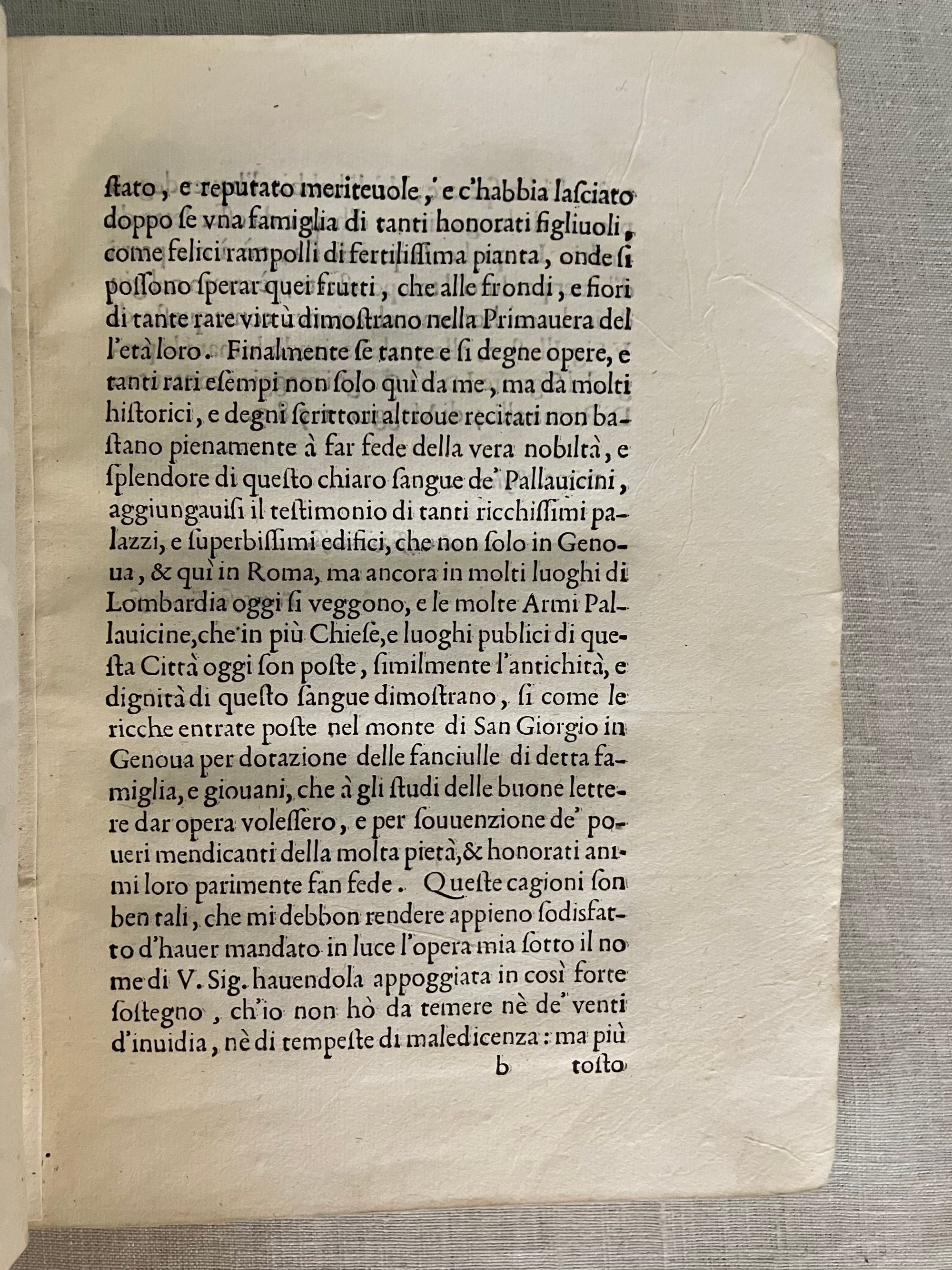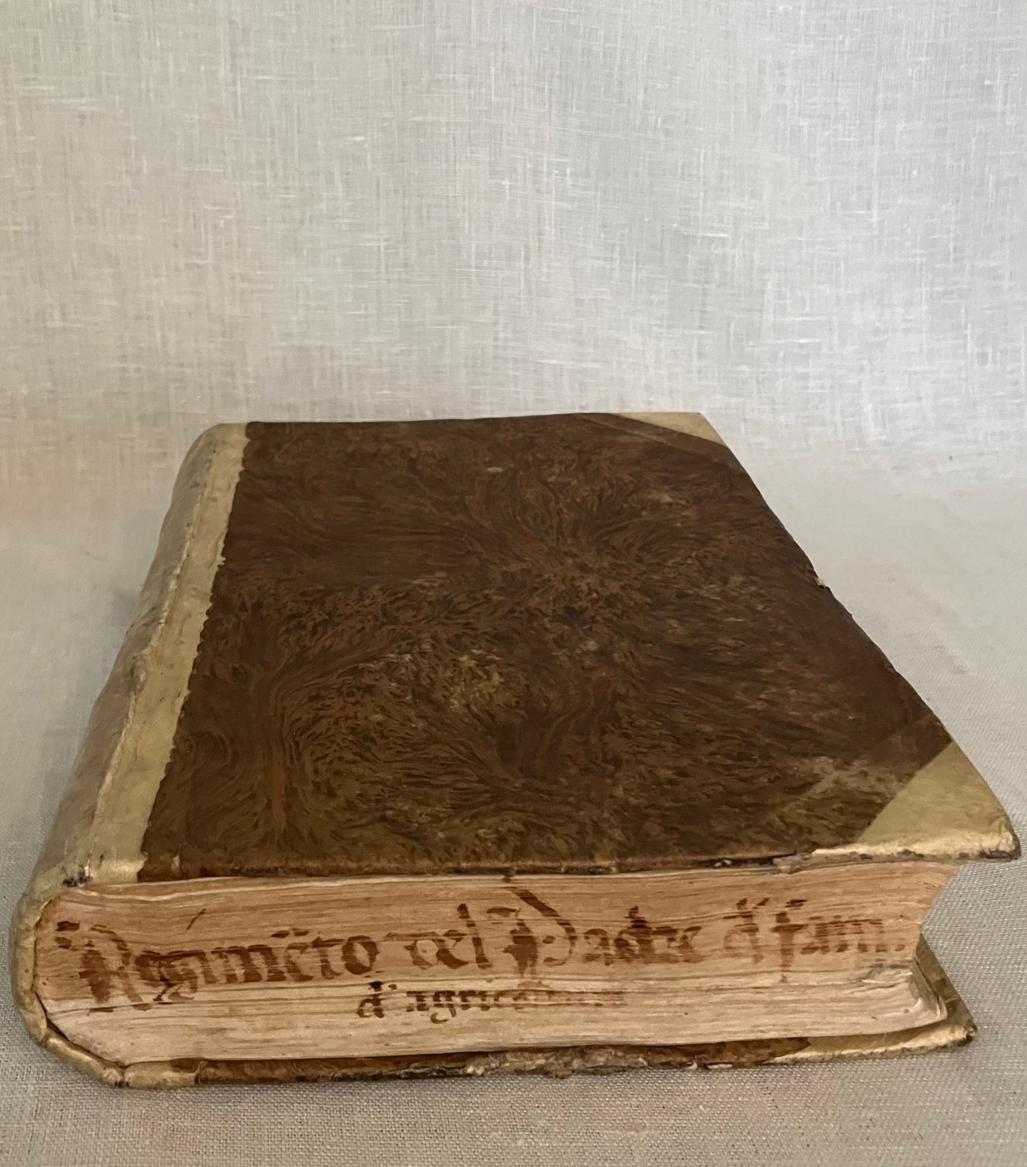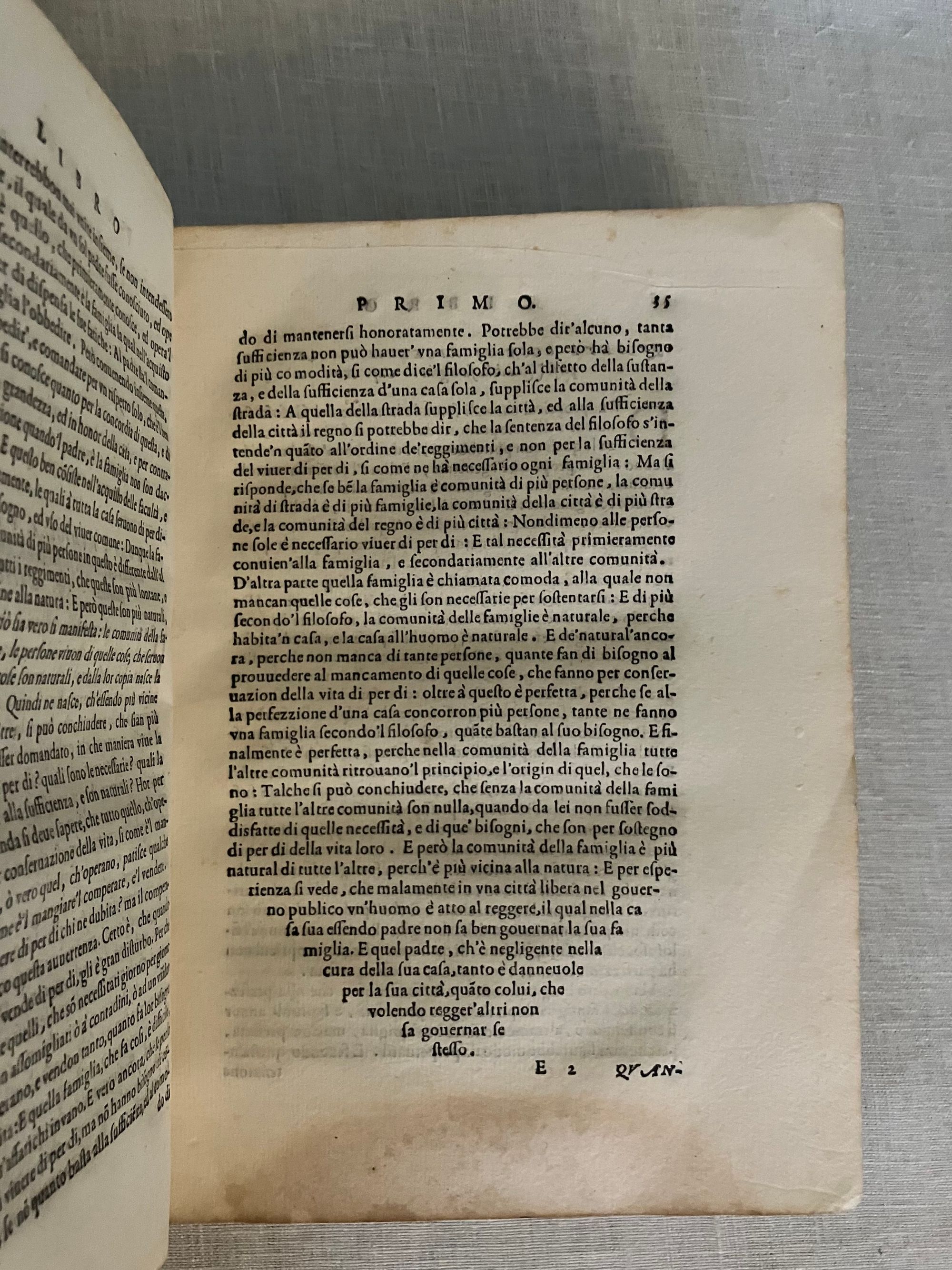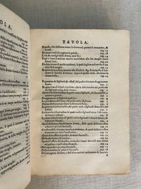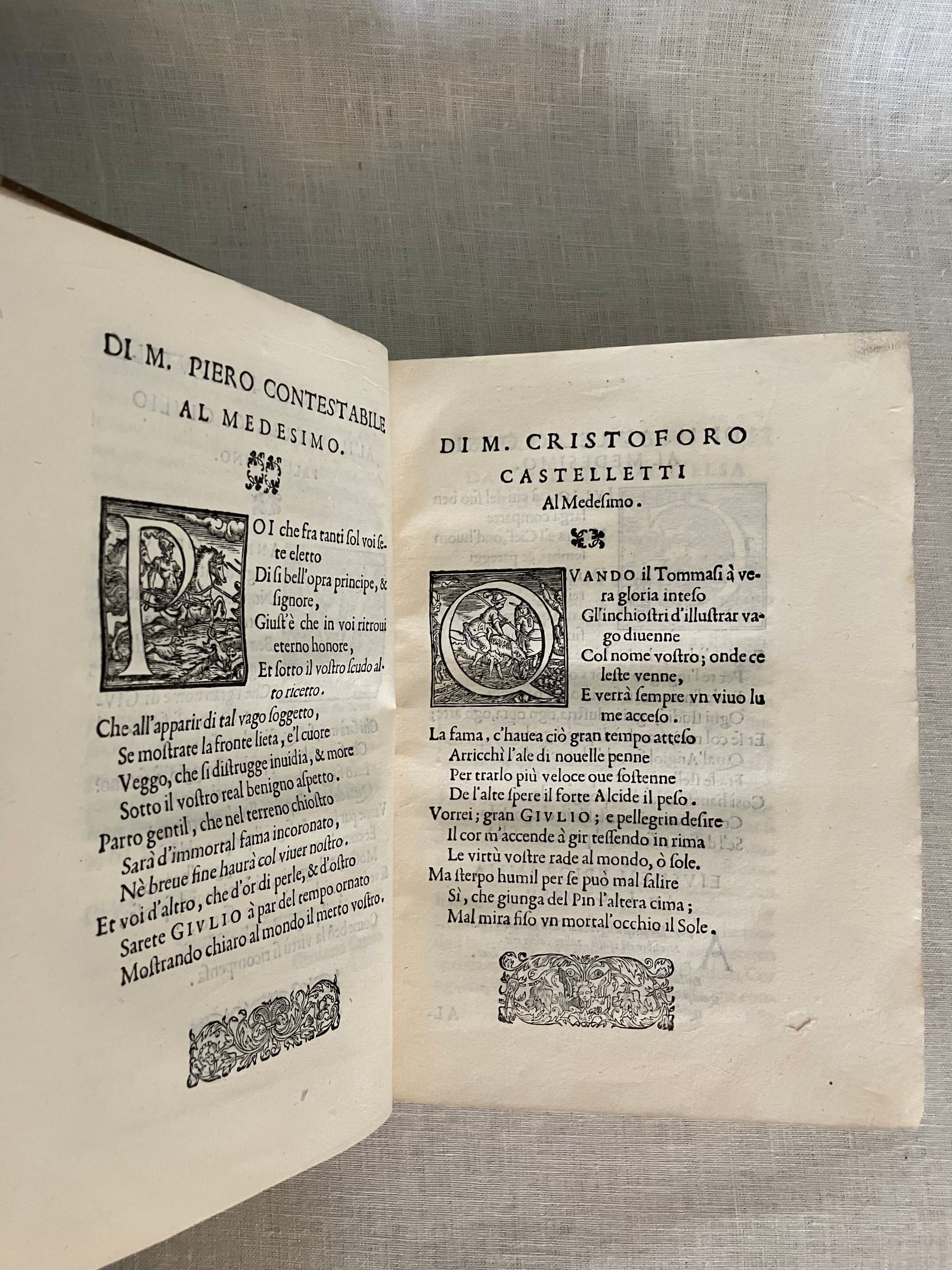 Hard cover 4to (measuring 6 1/2 x 8 3/4 inches,) in the original full vellum case, which appears to have been "updated," perhaps in the eighteenth century, with an onlaid additional layer of vein-painted parchment to resemble tree calf. (Perhaps made to match a collector's library.) An old calligraphic red ink title is lettered along the bottom of the text block, while the spine has the title, in a different hand, neatly lettered in black ink. Two woodcut printer's devices are present, with the initials "GM,": one on the title page measuring 1 3/4 x 2 inches, and a larger one upon the book's final page measur. 2 1/2 x 3 1/2 inches. The title page block depicts a masted ship sailing away on windy seas being aided by four blowing clouds, and a smiling sun amidst architectural festoons flanked by two winged female harpies; the larger printer's device at the rear of the book, however, has the scene reversed with the ship arriving, and the landmarks, wind and sun in mirror image. Also the female harpies are replaced with two flanking male satyrs. An identical motto to both in Latin: Et potest et vult (ready and able).The text contains 13 detailed woodcut historiated capitals. (The largest one illustrating the "T" may contain a portrait of Grand Duke Cosimo I de'Medici seated upon a throne-like seat, surrounded by fellow Florentines, and some of his mercenary halberd-bearing guard, the Lanzi. This is a conjecture based on visual similarity to contemporary portrait busts by Bandini, Bronzino and others.) COLLATION: pp. [80] 1-561 [3] ( 2 Pages are mis-numbered by printer after p. 245, and again after p. 333). a4-k4, A4-Z4, Aa4-Zz4, AAa4-ZZz4, AAaa4, [2]. Complete.**CONDITION: Very Good Plus Antiquarian Condition, including a single old worm track at both hinges, some old water stains at lower edge (not affecting text) and some occasional foxing (usually at top margin of affected pages) and a small number of browned text areas. Many fresh pages overall, however. Binding is firm and generally clean. One former institutional stamp, and neat inventory notes to both paste downs in old ink, pencil and blue china marker(?) **The DEDICATION of the work is to the Illustrious Guilio Pallavicino "gentleman of Genoa." Married into the aristocratic Doria family, Pallavicino had, by 1584, collected a sizable library consisting of more than 2000 volumes. He is described as a historian and writer, and patron of Genoa's humanistic Accademia degli Addormentati (The Academy of Sleepers) between 1563 and 1587. By 1600, he and his brother had donated a church, the Chiesa del Gesù, to the City of Genoa. The Pallavicino/Doria families were also patrons of the artist Peter Paul Rubens when he came to Genoa in 1600, commissioning a number of his paintings. Pallavino's literary interests brought him into contact with the Author.(A. Orlando, Trecanni)**CONTENTS: Dedication letters and verses to Pallavicino are by the author, and include others from Girolamo Catena, Cesare Mazzutelli, commendatory verses from M. Piero Contestabile, doctor of medicine ; M. Cristoforo Castellett, poet and playwright, and M. Averelio Orsi, the Court poet for Cardinale Alessandro Farnese, (and brother to the Vatican artist and mosaicist, Prosero Orsi; Prospero was also a collegue of Caravaggio.) Also a letter by Alberto Picchinesi, lawyer. Other contents incl. Index, and Table of Contents by subject and by Chapter headings. Libra Primo: The moral duties of a man toward his wife and children. Definitions of family, correct behavior and decorum, education, work life and the like. Libre Secunda: This is agricultural in nature and more home economics related. What kinds of industry is a man naturally inclined to. How to store the seeds of various plants: almonds, peaches, melons and apples, figs etc. **AUTHOR of this work FRANCESCO TOMMASI (fl. 1575-1589) was a medical doctor born in Colle Val d'Elsa, a village midway between Florence and Siena to the south. CERL cnp02263700. **The influential Florentine publisher and typographer, GIORGIO MARESCOTTI (fl.1563-1602) was primarily notable for being the first music publisher in that city. Born in France, he came to work in Florence (N. Lamal) providing translation from the French, as well as printing. His widow and daughter, Agnoletta and Margherita Marescotti took over the business upon Giorgio's death in 1602, working respectively as a bookseller and printer. (CERL cnp00573394.)(T. Carter) The SIGNIFICANCE in this work may lie broadly in two areas; the study of contemporary attitudes towards the family and social hierarchy structures in the late Italian Renaissance, as seen in education and employment, the raising of children, the place of women in both the traditional family and work settings. Also, the study of agricultural and land use as related to the former.**USTC 859361. CNCE (EDIT16) 282918. OPAC SBN TO0E 001169. B. Gamba da Bassanno (1839) Nr.1700. p. 485. T. Carter on Marescotti: "Music Printing in Late Sixteenth and Early Seventeenth Century Florence: Giorgio Marescotti, in Early Music History, Vol. 9 (1990), pp. 27-72. A. Orlando: "Rubens in Genoa, Awe and Wonder" in Wanannes Art Magazine interview. A really interesting inventory of the household goods and equipment belonging to the printer's family is discussed in D. Parker: Women in the Book Trade in Italy, 1475-1620," Renaissance Quarterly, Autumn 1996. pp.509-541. PROVENANCE: Lawes Agricultural Library. This very book listed in Aslin, "Library Catalogue of Printed Books and Pamphlets on Agriculture published between 1471 and 1840" Rothamsted Experimental Station, Harpenden, (1940) p. 275.