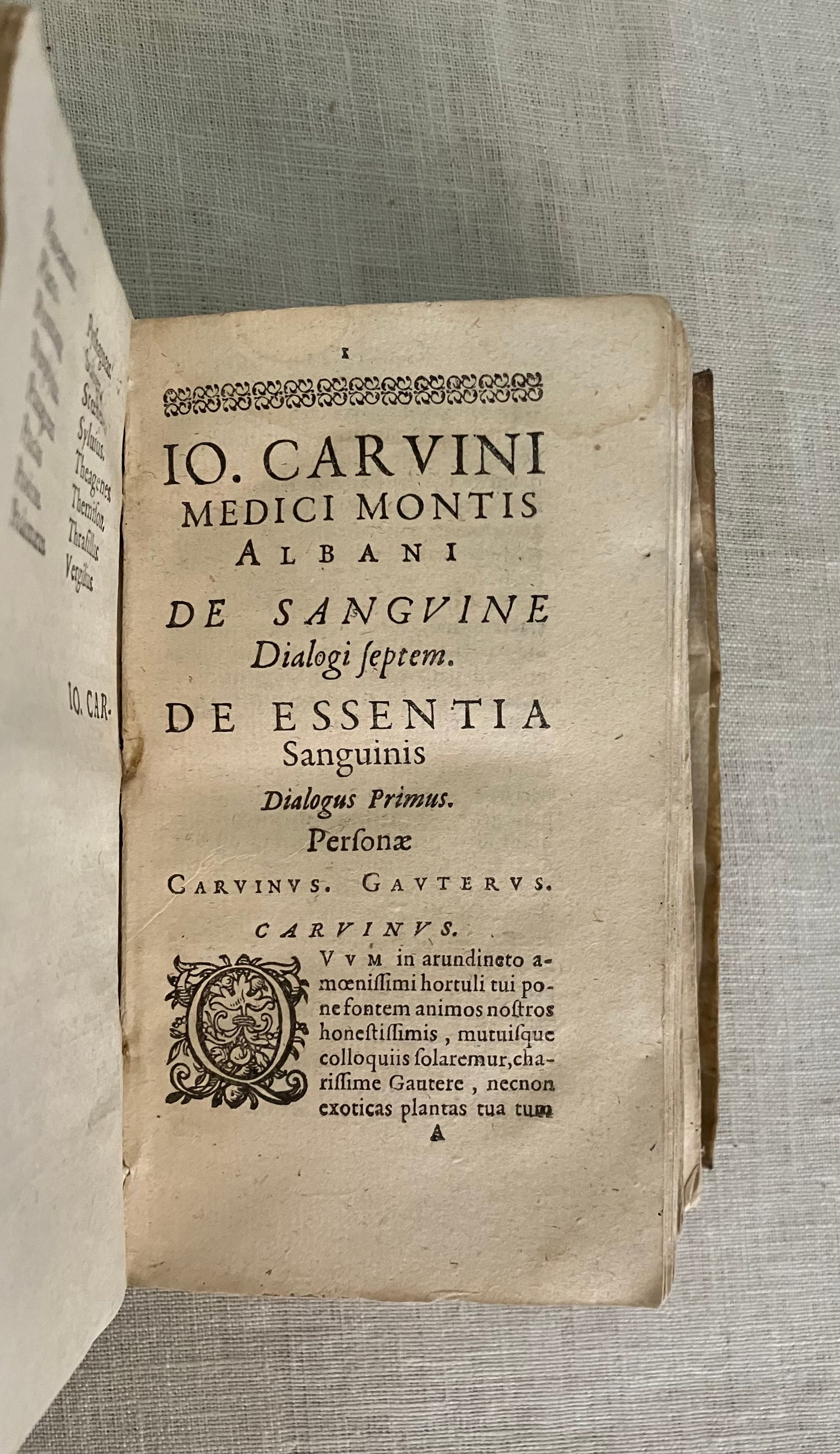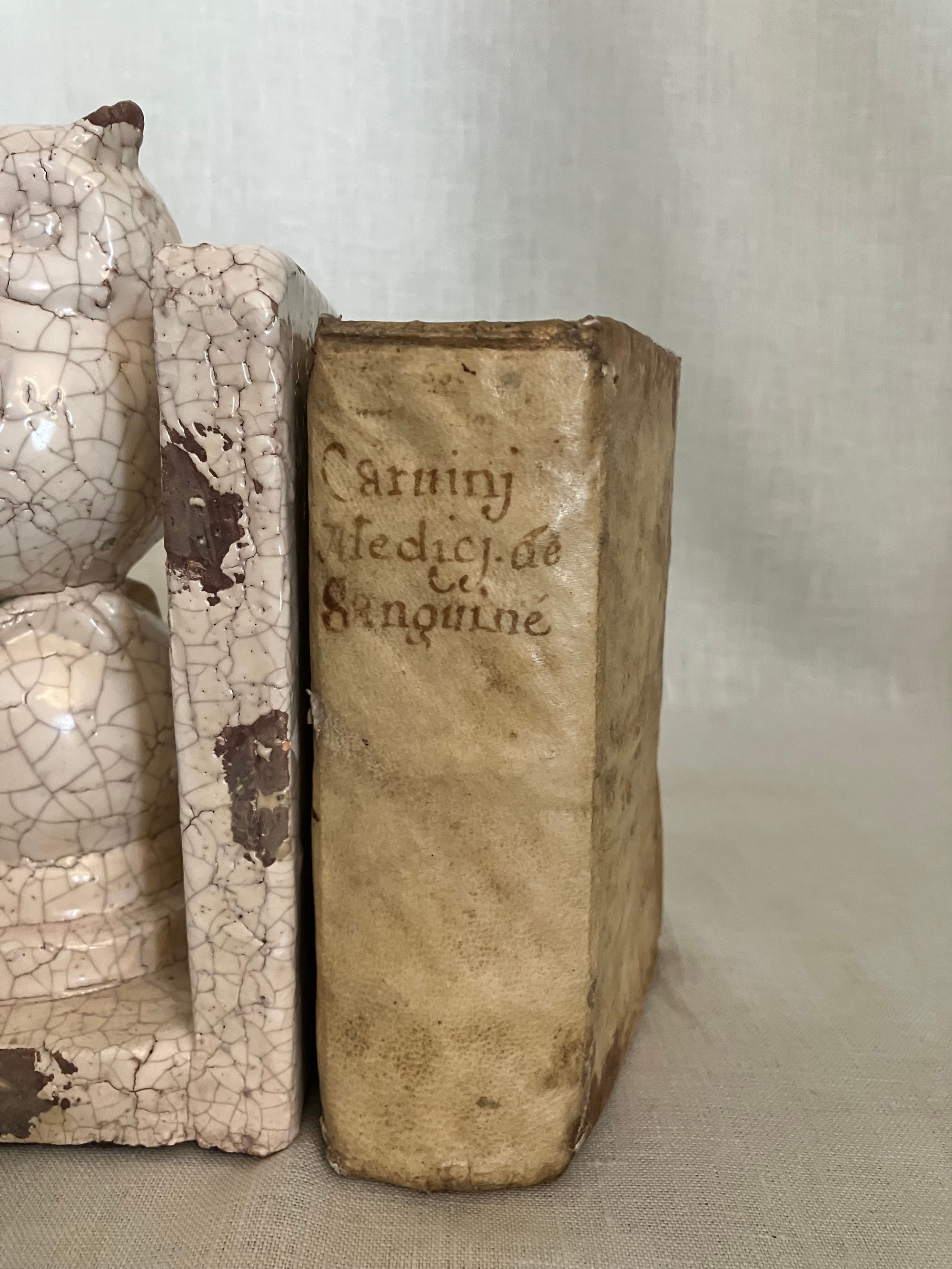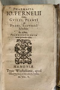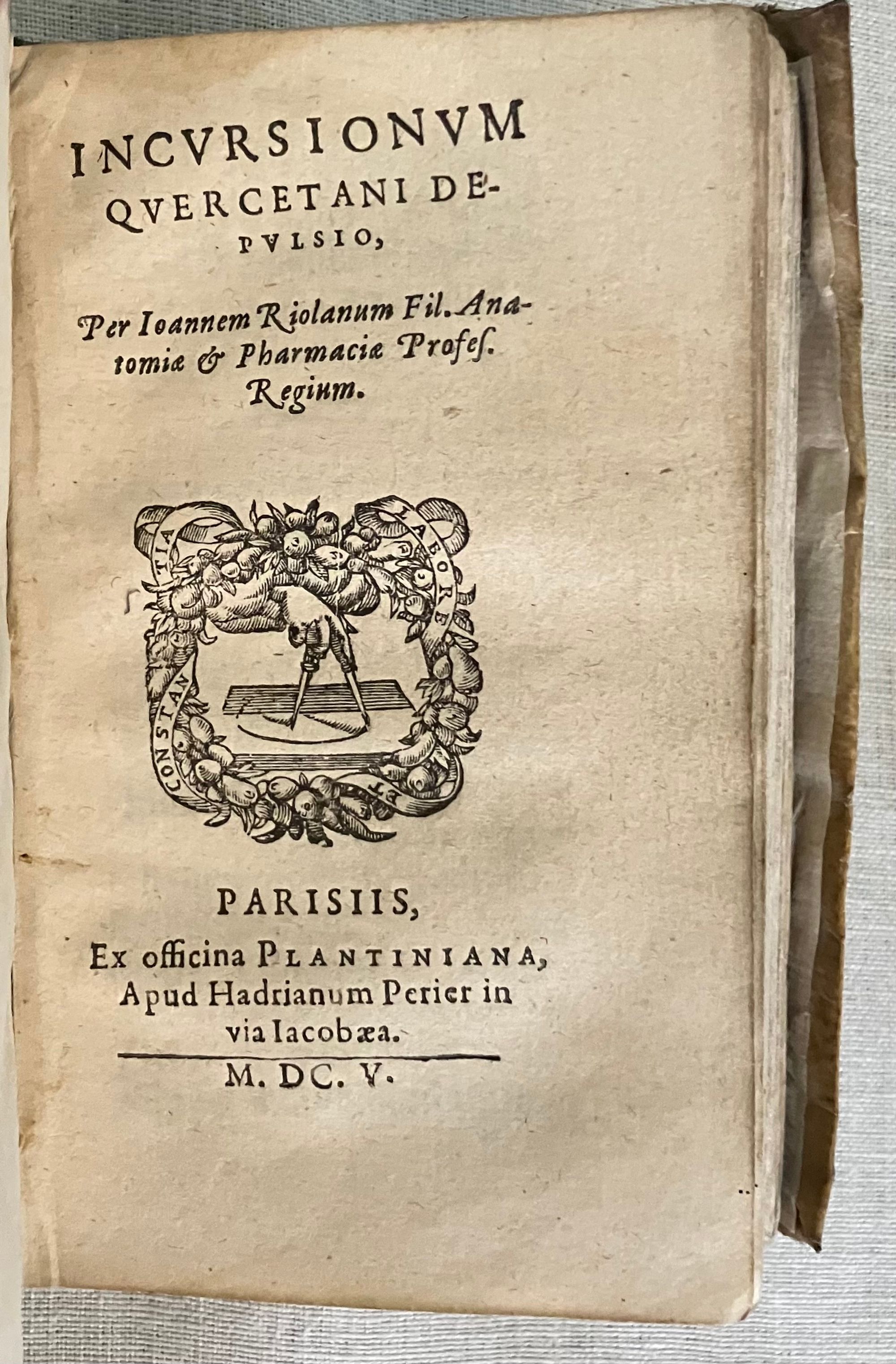 Sammelband of THREE SCARCE EARLY MEDICAL WORKS from 1605. Hardcover, 12mo (3 ¼ x 5 ¼ inches) in vellum binding, pp [24] 258 [6]; [2] 66 [4]; [12] 348 [8]. Collation: [12] A-K12, L10 [2]; A-C12; A18, B-O12, P10 [I2 misnumbered as I3]. In Latin. CONDITION: Very Good Antiquarian Condition. Binding is firm. Some light damp stains to corner of some pages, especially in the "Pharmacia". Some small chips & tears to fore-edges of a few pages, not affecting text. A few pages showing worming, generally at margins.** FIRST TITLE: "De Sanguine, Diolgi VII," Hanoviae: Typis Welcelianus, apud Claudium Marrinium & haeredes Ioan. Aubrii, 1605. Reprint. (First published 1562,) Contains seven "dialogues" on Hippocrates, the planets, the gods, blood and the "humors". The participants of the dialogue are: Joannes Fornerius IC. (Jean Fornier, unknown) Petrus Gauterus Pharmacop. (pharmacist, unknown) and AUTHOR Ionnis Carvini, Med. Montisalba, (Jean Carvin, doctor, d. 1562. cnp02409886.) Rare: 4 copies of this edition only shown on USTC 2131349. OCLC 492998989. VD17 1:090922P. ** SECOND TITLE: "Incursionum Quercetani de Pulsio,"1605, First Edition. AUTHOR Ioannem Riolanum Fil. (Jean Riolan the Younger (1577 - 1657, cnp01877741,) was a French physician and the son of physician Jean Riolan the Elder (1539 - 1605). He was appointed royal professor of anatomy and botany by Louis XIII in 1613. He established a botanic garden at the University of Paris, and was physician to Marie de' Medici until her death in 1642. Also known for anatomical studies, publishing several works on his discoveries. The "Querecetanus" of the title of our book refers to Joseph DuChesne (c. 1544 - 1609), a French physician and alchemist, and physician to Henry IV of France (married to Marie de' Medici). DuChesne followed Paracelsus (1493-1541) in advocating the use of chemistry in medical treatments, and published "De priscorum philosophorum verae medicinae materia" ("Of the ancient philosophers the matter of true medicine") in 1603. This was replied to by Jean Riolan the Elder in his "Apologia pro Hippocratis Galeni medicina" ("Apology for Hippocrates Galen's medicine") in 1603, in which Riolan accused DuChesne of sweeping away the wisdom of the Ancients. DuChesne, in his turn, replied with the publication of "Ad Brevem Riolani excursum brevis incursio" in 1605, in which he denied the accusation, and said that he wished to build on the knowledge of the old medicine, adding modern chemistry. This work, in turn, had a few replies, including our book, "Incursionum Quercetani de Pulsio" in 1605, by Jean Riolan the Younger. In this work, Riolan denounces the use of Alchemy in medicine. PUBLISHER OF NOTE, "Ex Officina Plantiniana," refers to the renowned Antwerp-based Renaissance humanist and publisher Christophe Plantin (1520-1589), who ran afoul of religious authorities on more than one occasion, causing him to remove his presses from Paris to Antwerp and back again. His famous works include the Plantin Polyglot Bible and others in a wide variety of languages; his association with typeographer Claude Garamond led to what is considered the height of letterpress printing of the age. He developed an outsourced network of printers for his works, a new business model in this time, this particular printer being "Apud Hadrianum Perier"in Paris 's Via Iocabae, [Adrian Perier, active 1584-1629, cnp01876550.] Plantin's woodblock printer's device on the title page of this work , featuring a fruited garland beribboned with the Latin motto "Labore et Constantia" (by labor and constancy) also features a hand extending from clouds holding a compass inscribing a circle. It has been suggested that the center point of the compasses "indicates constancy, the moving point which renders the circle is the labor" (D. Badkey).OCLC lists only 5 copies worldwide No. 14311536. USTC nor RBH seem to list this title; hence VERY RARE. ** THIRD TITLE: "Pharmacia Io. Fernelii cum Guilel. PlantI & Franc. SaguyerI. Scholiis: In usum Pharmacopoeorum nunc primum edita." (1605), stated First Edition. Published by Typis Wechelianus [heirs of Andreas Wechel,] in Hanoviae. Printers Claud. Marrinium (Claude de Marne)& haeredes Io. Aubrii Johann Aubry I, heirs of.) Note : These are the same publisher/printers as first title in this sammelband. AUTHOR Jean François Fernel (French, 1497 - 1558, cnp01875467) was one of the most celebrated surgeons of the sixteenth century, a physician, who coined the word "physiology". He studied philosophy, math and astrology, and was Professor of Philosophy and of Medicine at the University at Sainte-Barbe. He became court physician to Henry II and his wife Catherine de' Medici. Mentioned in a dedication by Ioannes Crato, 1581. Died Paris 1558. The "Pharmacia" is a compilation of medicinal substances and their applications. Sample entries include: lemon syrup, oxysaccharum simplex, perfumed oil, and "malos odoriferis". OCLC 43176353. USTC No. 2079222, lists 9 copies worldwide. RARE. PROVENANCE: French book collector, René Bégeot, with his bookplate to the front pastedown.