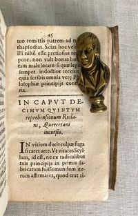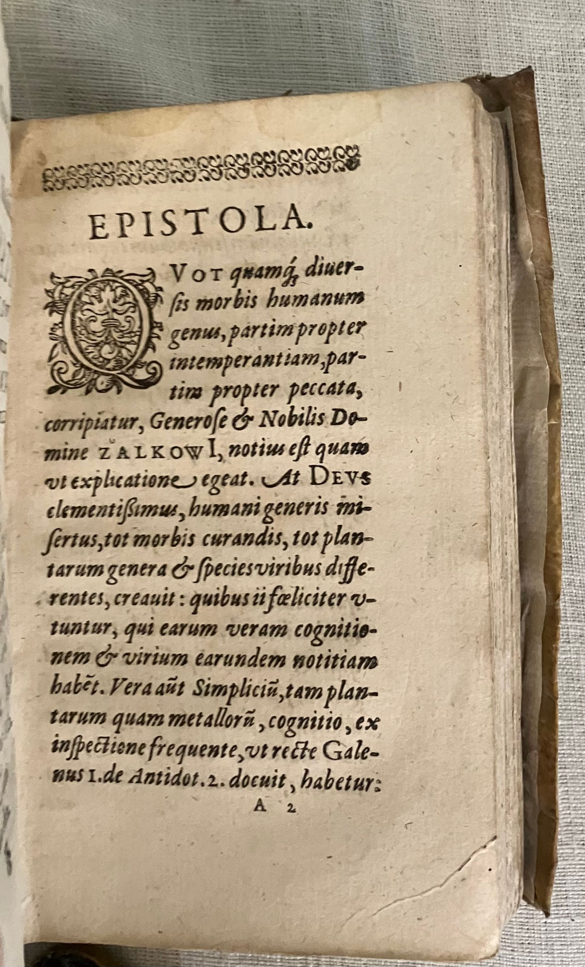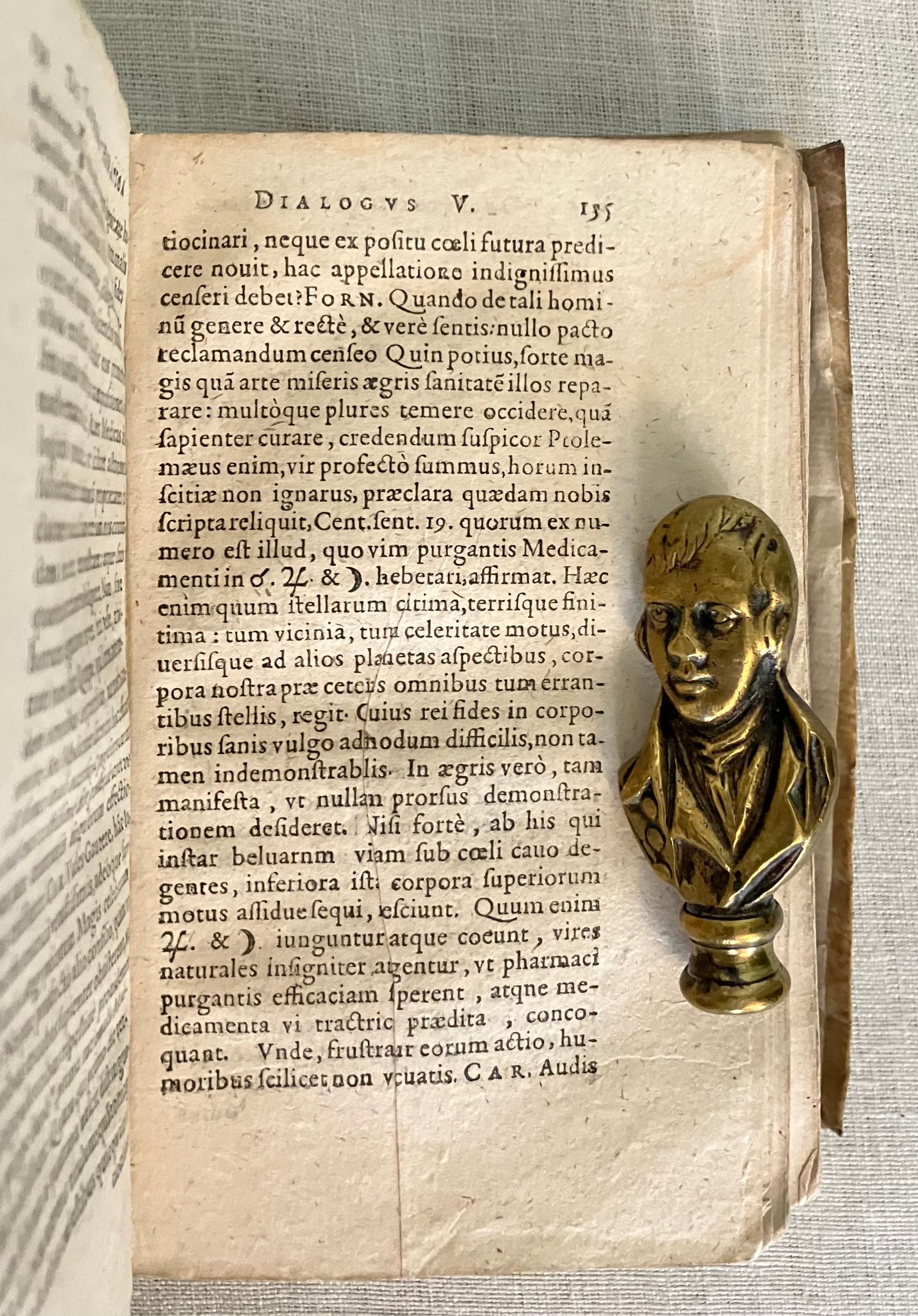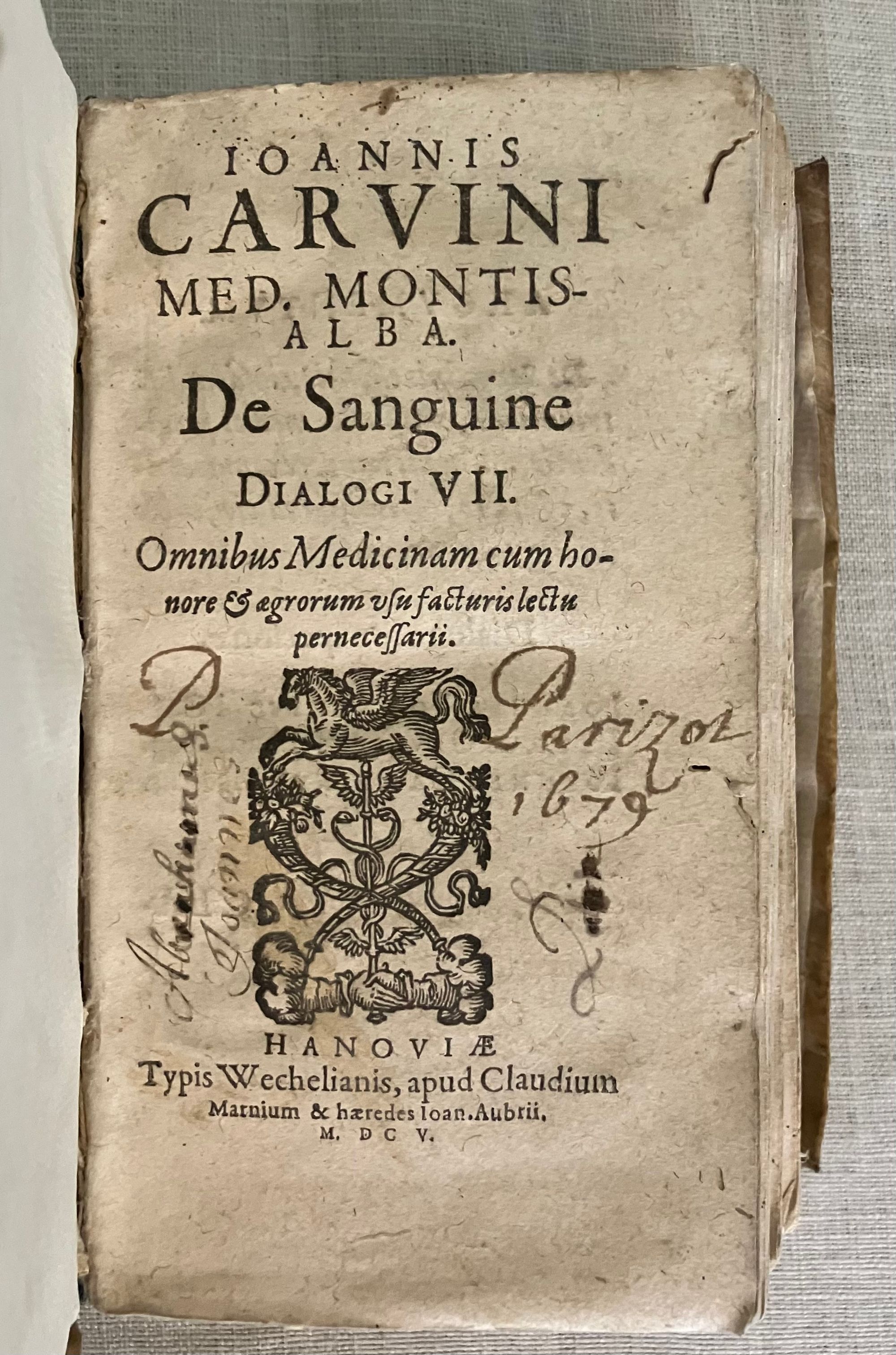 Sammelband of THREE SCARCE EARLY MEDICAL WORKS from 1605. Hardcover, 12mo (3 ¼ x 5 ¼ inches) in vellum binding, pp [24] 258 [6]; [2] 66 [4]; [12] 348 [8]. Collation: [12] A-K12, L10 [2]; A-C12; A18, B-O12, P10 [I2 misnumbered as I3]. In Latin. CONDITION: Very Good Antiquarian Condition. Binding is firm. Some light damp stains to corner of some pages, especially in the "Pharmacia". Some small chips & tears to fore-edges of a few pages, not affecting text. A few pages showing worming, generally at margins.** FIRST TITLE: "De Sanguine, Diolgi VII," Hanoviae: Typis Welcelianus, apud Claudium Marrinium & haeredes Ioan. Aubrii, 1605. Reprint. (First published 1562,) Contains seven "dialogues" on Hippocrates, the planets, the gods, blood and the "humors". The participants of the dialogue are: Joannes Fornerius IC. (Jean Fornier, unknown) Petrus Gauterus Pharmacop. (pharmacist, unknown) and AUTHOR Ionnis Carvini, Med. Montisalba, (Jean Carvin, doctor, d. 1562. cnp02409886.) Rare: 4 copies of this edition only shown on USTC 2131349. OCLC 492998989. VD17 1:090922P. ** SECOND TITLE: "Incursionum Quercetani de Pulsio,"1605, First Edition. AUTHOR Ioannem Riolanum Fil. (Jean Riolan the Younger (1577 - 1657, cnp01877741,) was a French physician and the son of physician Jean Riolan the Elder (1539 - 1605). He was appointed royal professor of anatomy and botany by Louis XIII in 1613. He established a botanic garden at the University of Paris, and was physician to Marie de' Medici until her death in 1642. Also known for anatomical studies, publishing several works on his discoveries. The "Querecetanus" of the title of our book refers to Joseph DuChesne (c. 1544 - 1609), a French physician and alchemist, and physician to Henry IV of France (married to Marie de' Medici). DuChesne followed Paracelsus (1493-1541) in advocating the use of chemistry in medical treatments, and published "De priscorum philosophorum verae medicinae materia" ("Of the ancient philosophers the matter of true medicine") in 1603. This was replied to by Jean Riolan the Elder in his "Apologia pro Hippocratis Galeni medicina" ("Apology for Hippocrates Galen's medicine") in 1603, in which Riolan accused DuChesne of sweeping away the wisdom of the Ancients. DuChesne, in his turn, replied with the publication of "Ad Brevem Riolani excursum brevis incursio" in 1605, in which he denied the accusation, and said that he wished to build on the knowledge of the old medicine, adding modern chemistry. This work, in turn, had a few replies, including our book, "Incursionum Quercetani de Pulsio" in 1605, by Jean Riolan the Younger. In this work, Riolan denounces the use of Alchemy in medicine. PUBLISHER OF NOTE, "Ex Officina Plantiniana," refers to the renowned Antwerp-based Renaissance humanist and publisher Christophe Plantin (1520-1589), who ran afoul of religious authorities on more than one occasion, causing him to remove his presses from Paris to Antwerp and back again. His famous works include the Plantin Polyglot Bible and others in a wide variety of languages; his association with typeographer Claude Garamond led to what is considered the height of letterpress printing of the age. He developed an outsourced network of printers for his works, a new business model in this time, this particular printer being "Apud Hadrianum Perier"in Paris 's Via Iocabae, [Adrian Perier, active 1584-1629, cnp01876550.] Plantin's woodblock printer's device on the title page of this work , featuring a fruited garland beribboned with the Latin motto "Labore et Constantia" (by labor and constancy) also features a hand extending from clouds holding a compass inscribing a circle. It has been suggested that the center point of the compasses "indicates constancy, the moving point which renders the circle is the labor" (D. Badkey).OCLC lists only 5 copies worldwide No. 14311536. USTC nor RBH seem to list this title; hence VERY RARE. ** THIRD TITLE: "Pharmacia Io. Fernelii cum Guilel. PlantI & Franc. SaguyerI. Scholiis: In usum Pharmacopoeorum nunc primum edita." (1605), stated First Edition. Published by Typis Wechelianus [heirs of Andreas Wechel,] in Hanoviae. Printers Claud. Marrinium (Claude de Marne)& haeredes Io. Aubrii Johann Aubry I, heirs of.) Note : These are the same publisher/printers as first title in this sammelband. AUTHOR Jean François Fernel (French, 1497 - 1558, cnp01875467) was one of the most celebrated surgeons of the sixteenth century, a physician, who coined the word "physiology". He studied philosophy, math and astrology, and was Professor of Philosophy and of Medicine at the University at Sainte-Barbe. He became court physician to Henry II and his wife Catherine de' Medici. Mentioned in a dedication by Ioannes Crato, 1581. Died Paris 1558. The "Pharmacia" is a compilation of medicinal substances and their applications. Sample entries include: lemon syrup, oxysaccharum simplex, perfumed oil, and "malos odoriferis". OCLC 43176353. USTC No. 2079222, lists 9 copies worldwide. RARE. PROVENANCE: French book collector, René Bégeot, with his bookplate to the front pastedown.