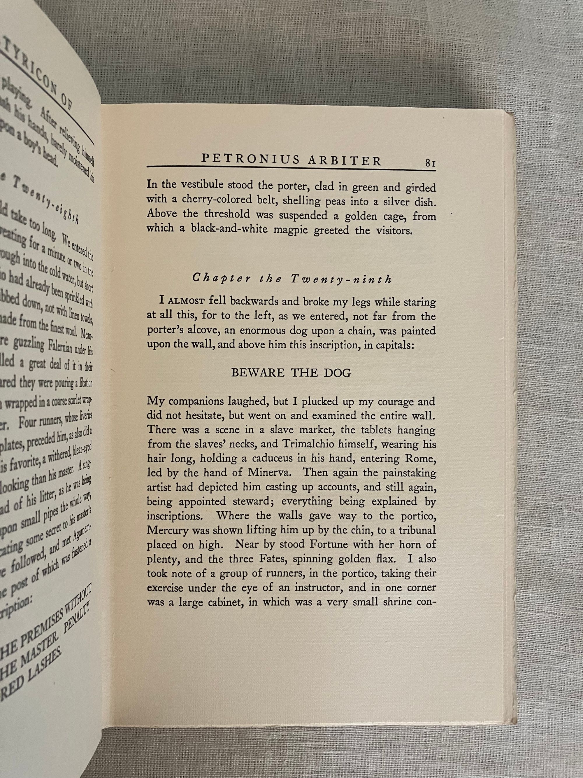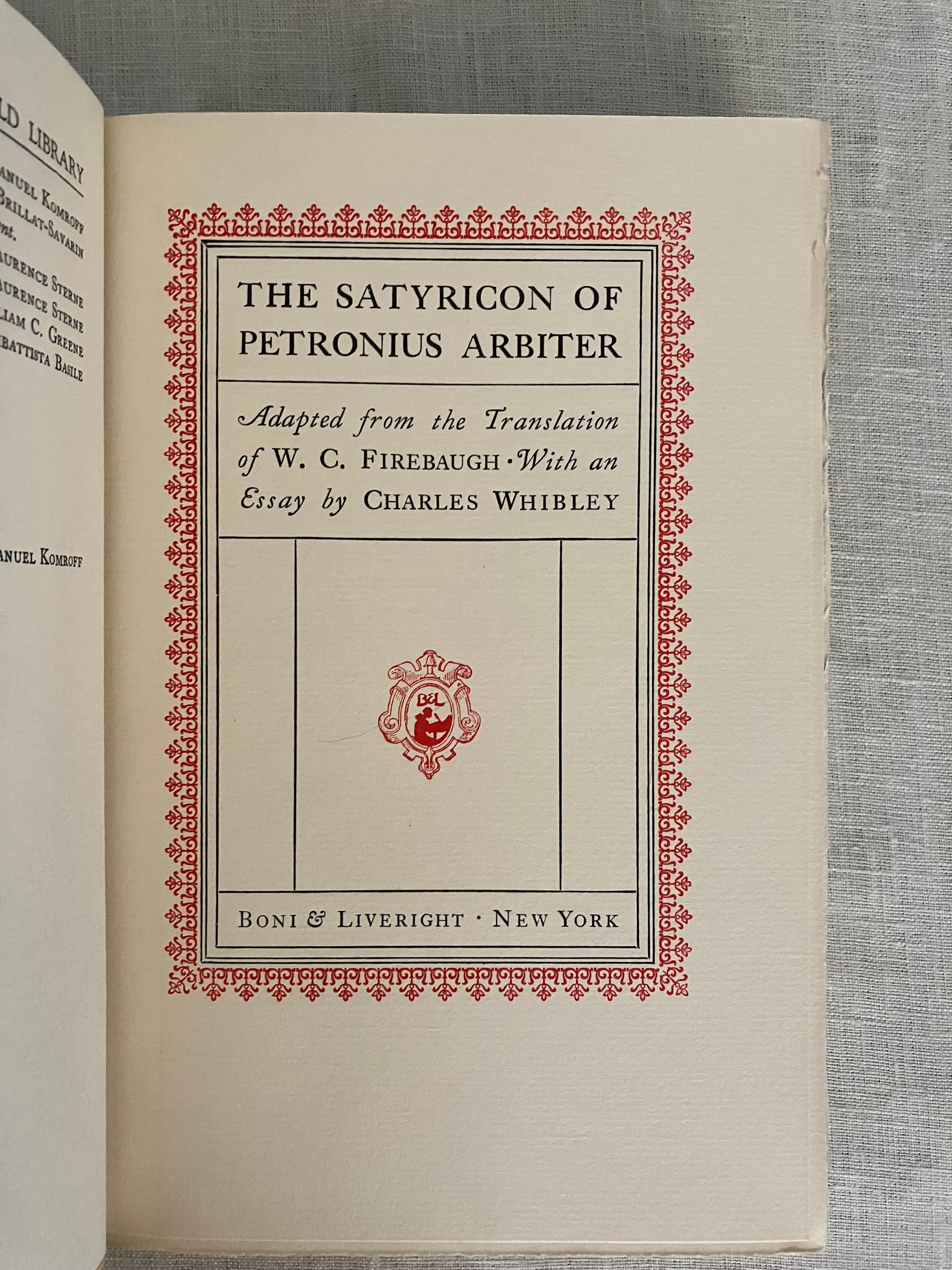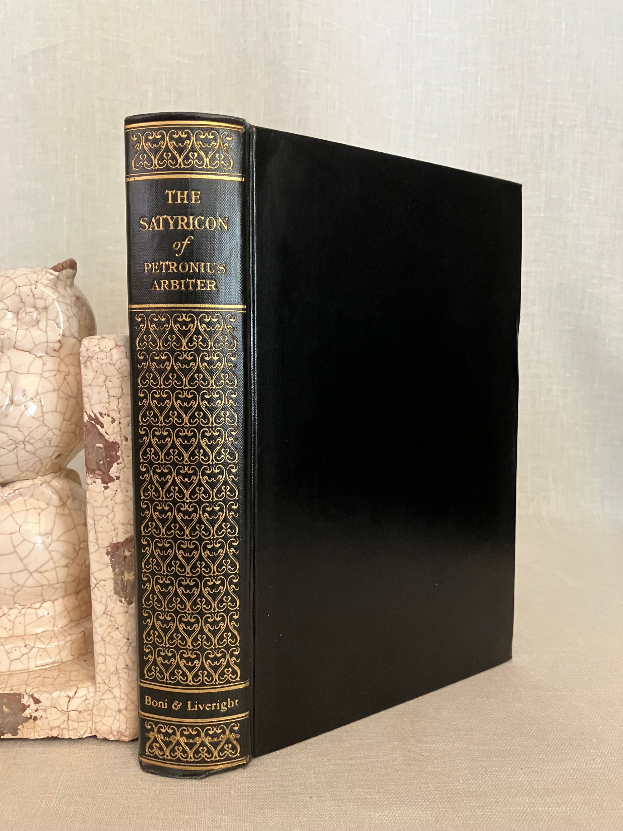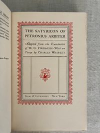 Reprint. In English. Hard cover, 8vo, in black cloth elaborately blocked in gold to the spine, with title and decoration, illustrated endpapers in the style of early Italian woodcuts, top edge trimmed, others untrimmed, printed on watermarked, heavy laid paper, rubricated title page, xxxviii plus 269 pp. Reprint of the "Essay on Petronius" is reprinted from MacMillan/ E.P. Dutton edition of 1922, pp. vii-xxiii. Translator's introduction pp.xxiv-xxxviii, also taken from that edition. Chapters One to One Hundred Forty-First, pp. to 253, plus Notes pp. 255-269. CONDITION: Very Good Plus. Dent to front board fore edge (about 1 1/2 inches). Pencilled signature and bookplate to the half title, dated 1928. Otherwise sound, clean and bright. **The AUTHOR, Caius Petronius Arbiter, was the "Arbiter of Taste" to the infamous first century Roman Emperor Nero. This early epic, or romance, describes the vagrant life given over to various misadventure by a trio of young students, Encolpios, Ascyltos and Giton, It recounts their journey from Cumæ (near Naples) south to Crotona. Some will find intimations of later fabled road trip adventures of Don Quixote or the Three Musketeers in these older tales, but in this case with more licentious detail; not for your pearl-clutching great aunt! Part of the Black and Gold series of classical reprints by Boston publishers Boni and Liveright, who, in addition to popularizing a catalogue of "classics," also first published some of the most important authors of the modernist era, before going bankrupt in 1929.