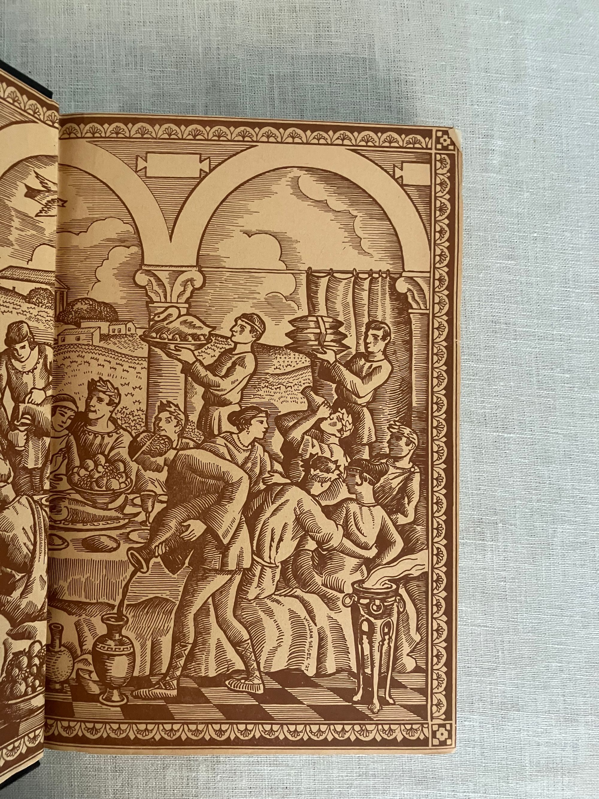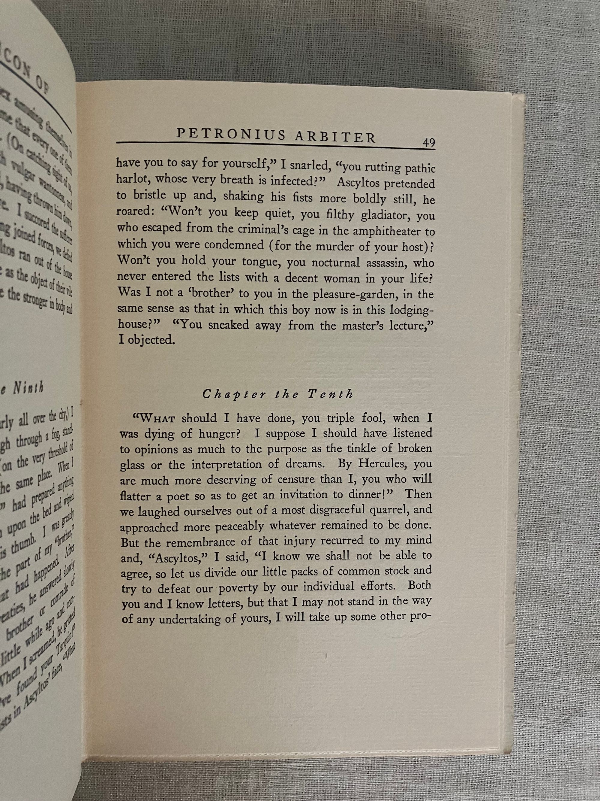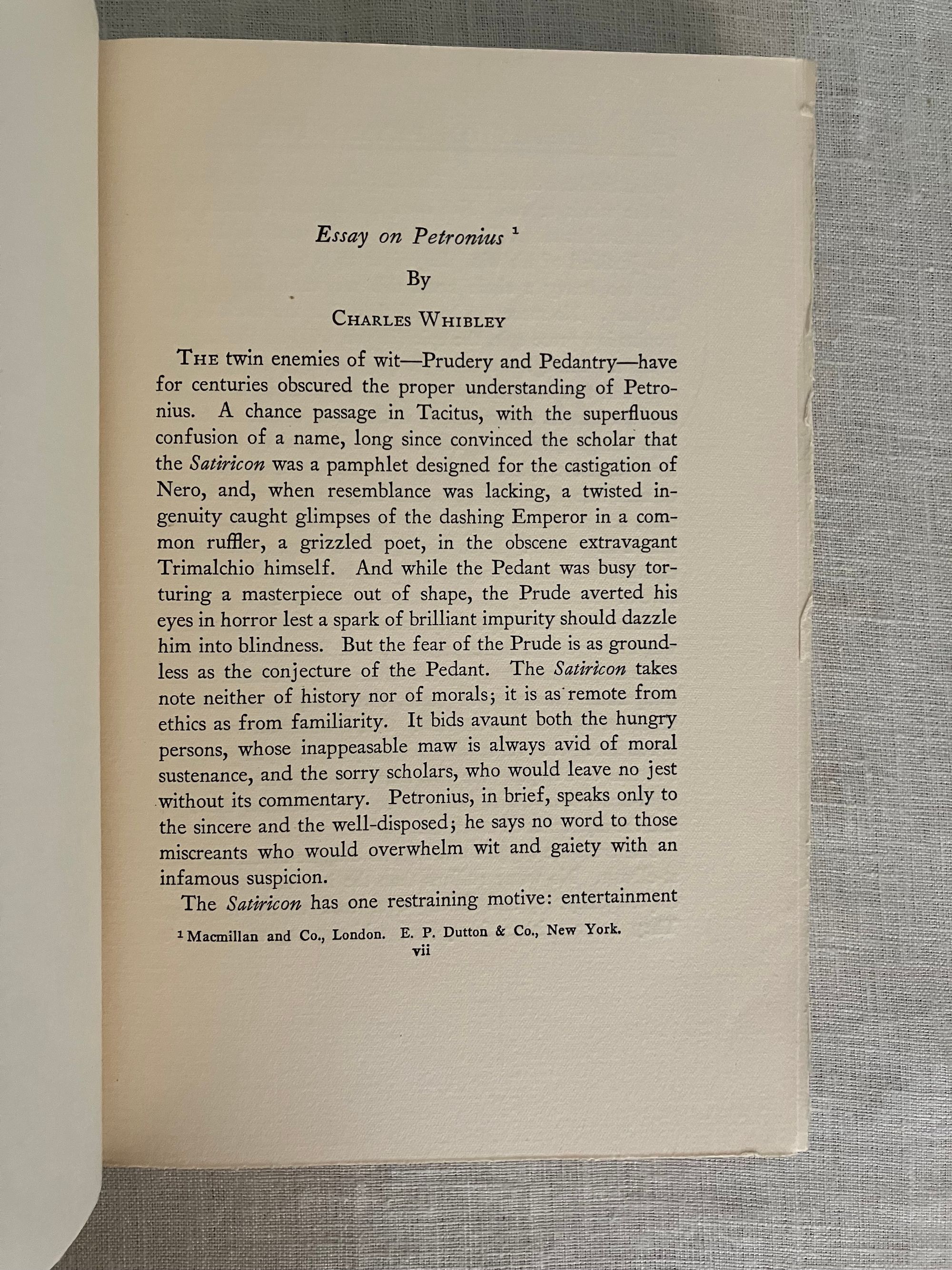 Reprint. In English. Hard cover, 8vo, in black cloth elaborately blocked in gold to the spine, with title and decoration, illustrated endpapers in the style of early Italian woodcuts, top edge trimmed, others untrimmed, printed on watermarked, heavy laid paper, rubricated title page, xxxviii plus 269 pp. Reprint of the "Essay on Petronius" is reprinted from MacMillan/ E.P. Dutton edition of 1922, pp. vii-xxiii. Translator's introduction pp.xxiv-xxxviii, also taken from that edition. Chapters One to One Hundred Forty-First, pp. to 253, plus Notes pp. 255-269. CONDITION: Very Good Plus. Dent to front board fore edge (about 1 1/2 inches). Pencilled signature and bookplate to the half title, dated 1928. Otherwise sound, clean and bright. **The AUTHOR, Caius Petronius Arbiter, was the "Arbiter of Taste" to the infamous first century Roman Emperor Nero. This early epic, or romance, describes the vagrant life given over to various misadventure by a trio of young students, Encolpios, Ascyltos and Giton, It recounts their journey from Cumæ (near Naples) south to Crotona. Some will find intimations of later fabled road trip adventures of Don Quixote or the Three Musketeers in these older tales, but in this case with more licentious detail; not for your pearl-clutching great aunt! Part of the Black and Gold series of classical reprints by Boston publishers Boni and Liveright, who, in addition to popularizing a catalogue of "classics," also first published some of the most important authors of the modernist era, before going bankrupt in 1929.