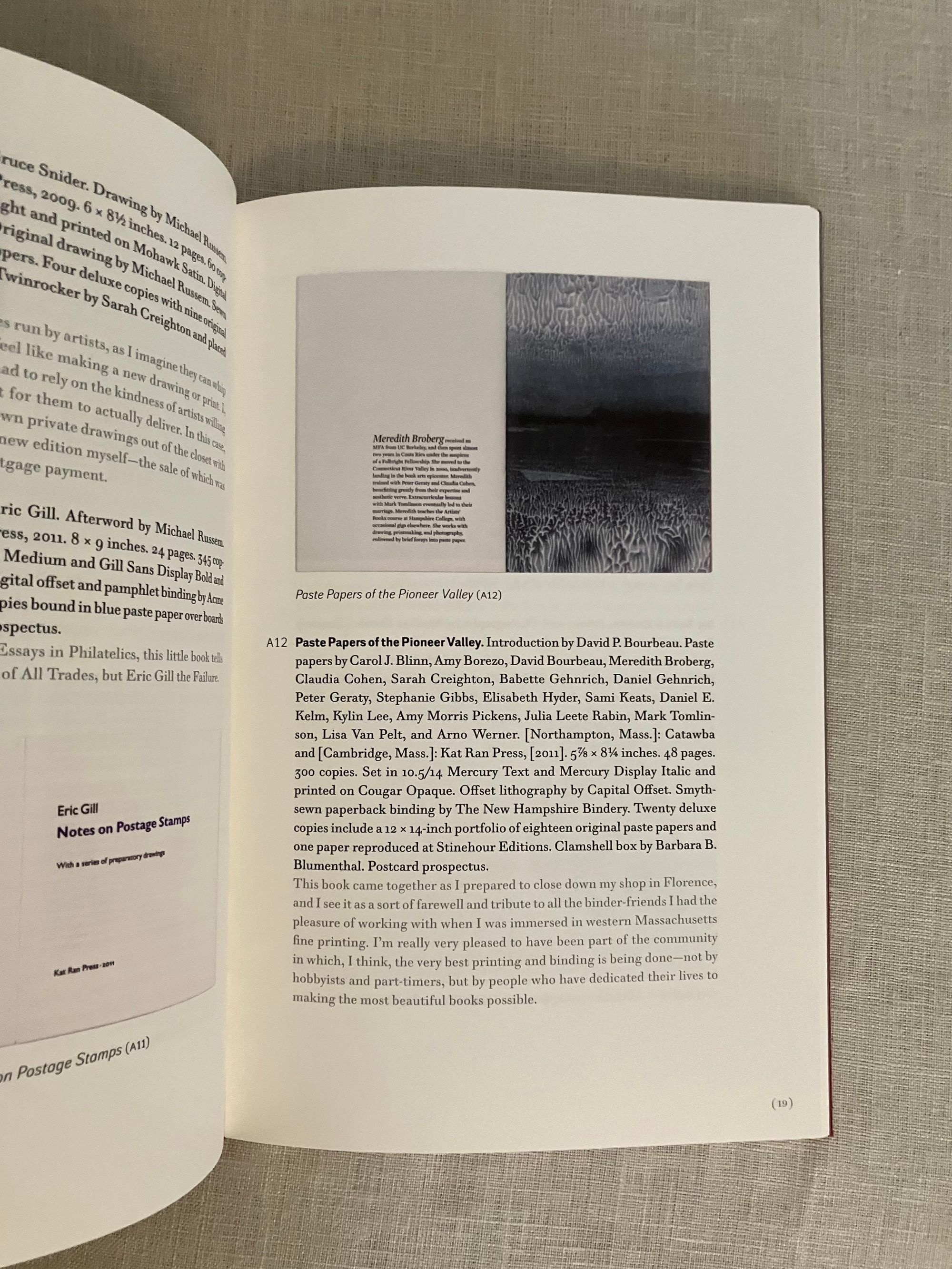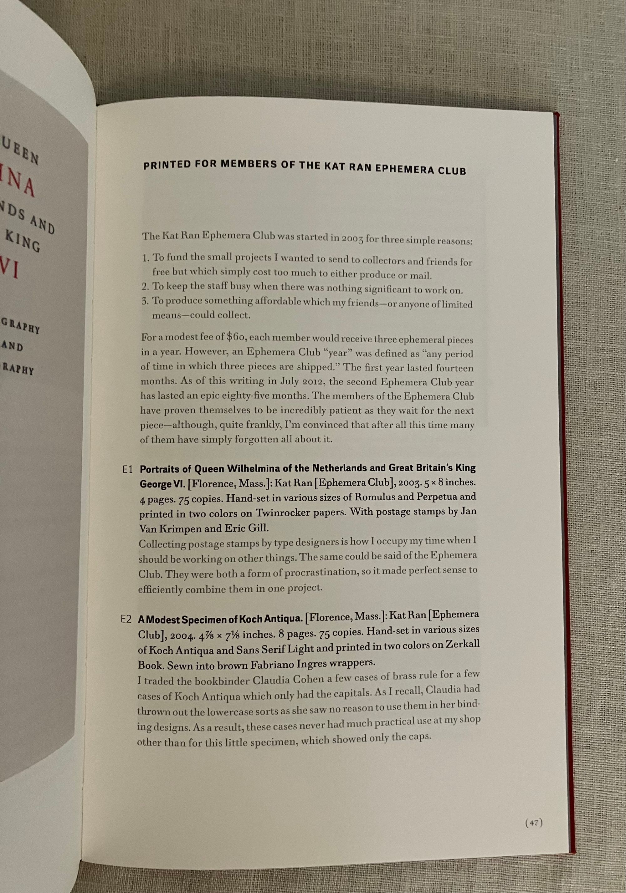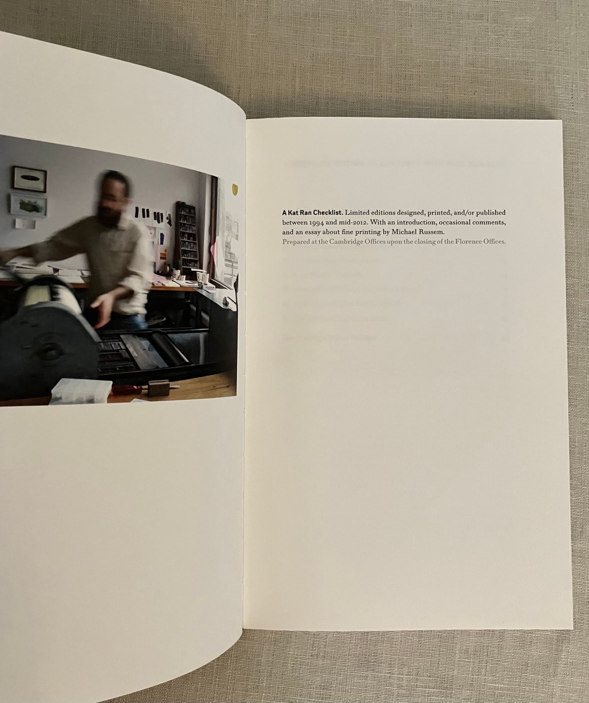 Hard cover, 8vo in red cloth over boards, with applied white paper label to spine in black, grey endpapers, 55 pp., First Edition. A bibliographical listing of the limited edition, fine press art books of Michael Russem. with a reflection on the changing path of his career as a book designer in the Boston area. Includes details of the Kat Ran Ephemera Club. Bound by Sarah Creighton in a limited edition of 50 copies.