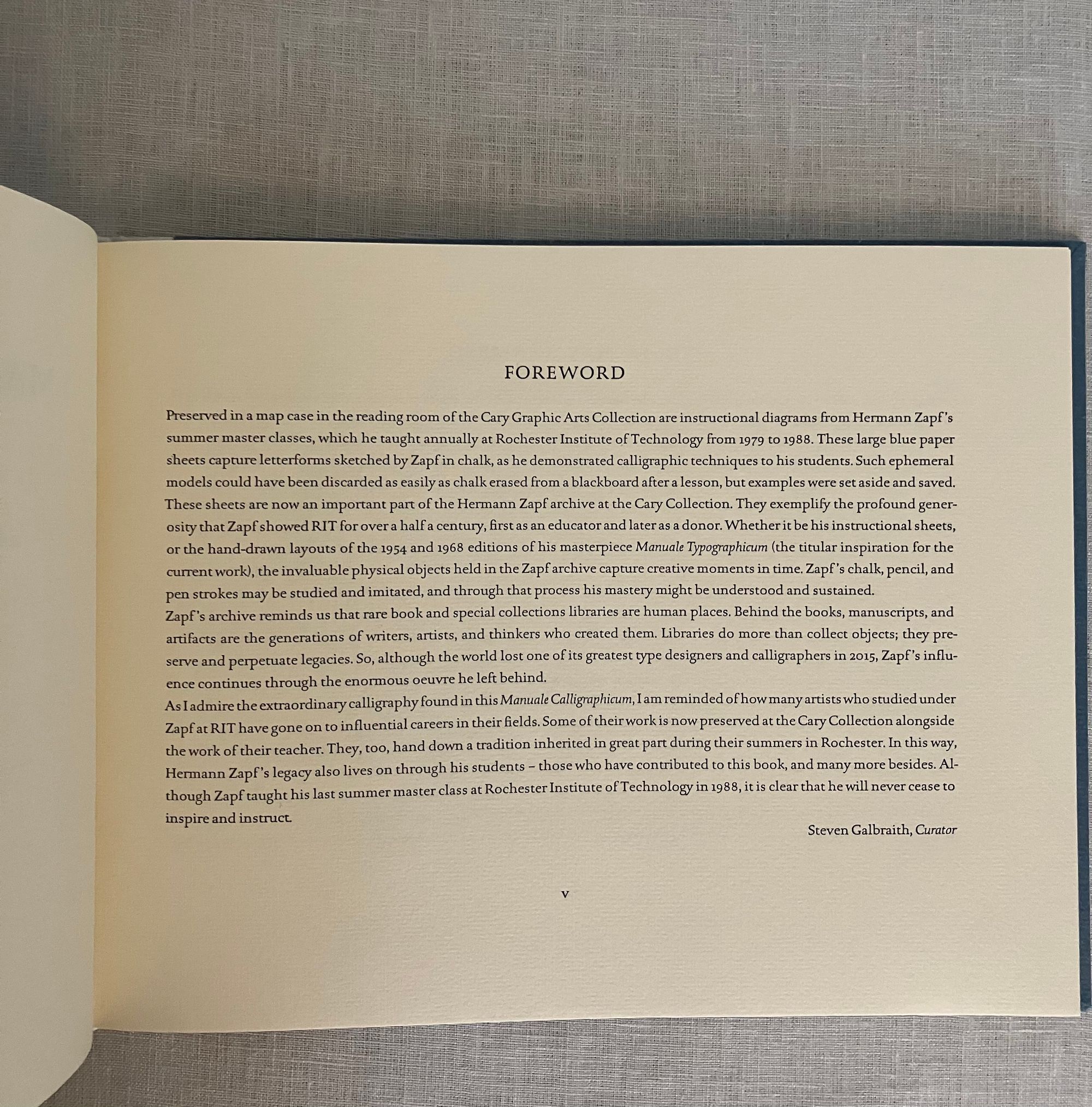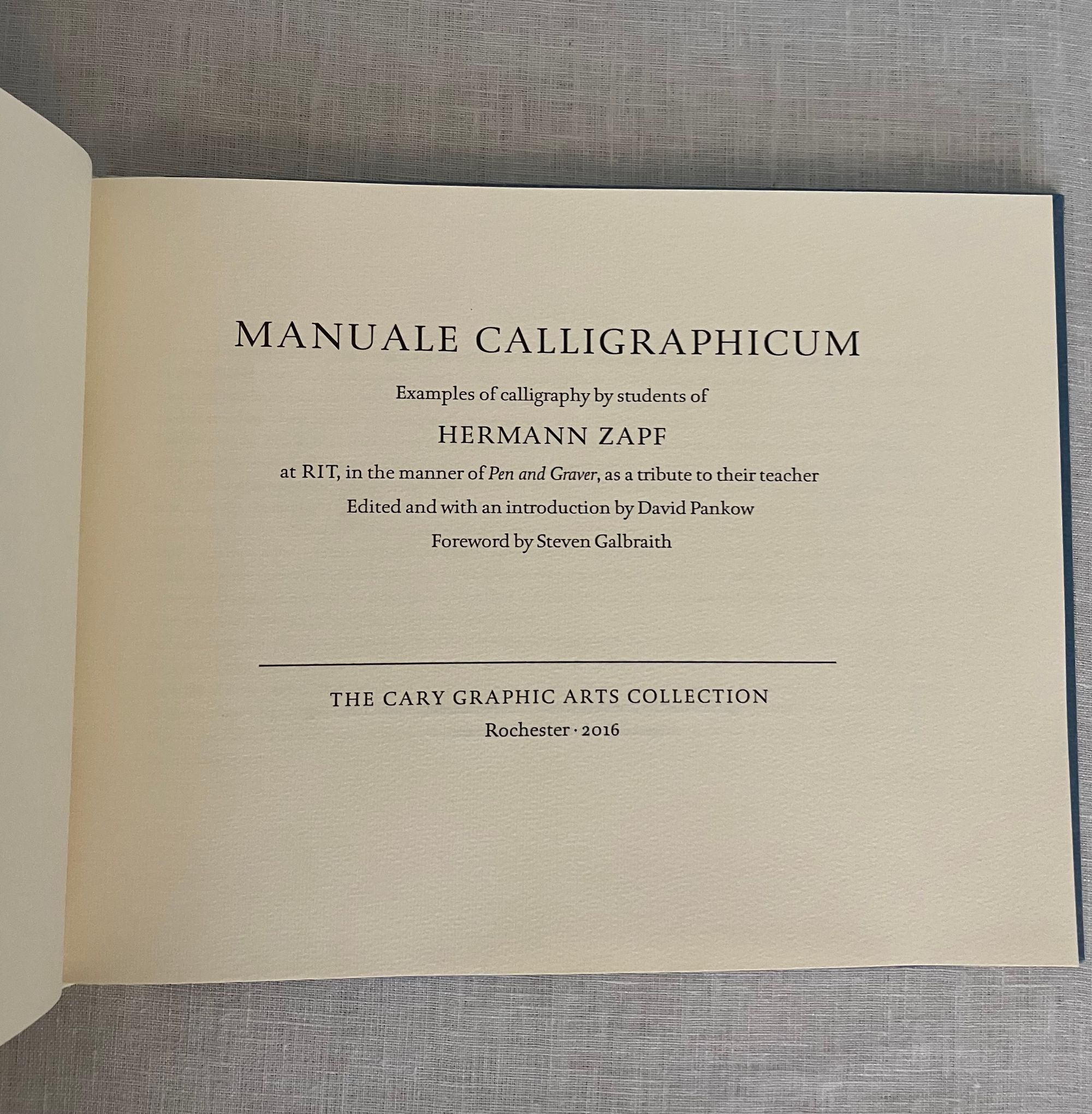 Hard cover, oblong 4to, in quarter vellum over blue laid paper-covered boards, titles to the vellum spine blocked in gold, printed on Hahnemühle paper, letterpress printed in Rilke roman and italic typefaces by Jerry Kelly, with book design by Bradley Hutchinson, LVI pp., First Edition. Limited Edition of 325 copies. **CONDITION: Fine, like new. **This book celebrates the legacy of type designer and calligrapher Hermann Zapf (German, 1918-2015), considered one of the most influential practitioners and teachers of the craft in the modern era. His fonts Palatino, Optima and Zapfino are among his most famous remaining in modern use. This book celebrates his decades-long collaboration with the Rochester Institute of Technology's graphic arts program, and highlights the work of some of his former students. Includes full-page illustrative examples of the craft by 15 calligraphic students as tribute to their mentor, including Larry Brady, Marsha Brady, Annie Cicale, Rick Cusick, Claude Dieterich A, Reggie Ezell, Peter Fraterdeus, Kris Holmes, Jerry Kelly, Peter Noth, Marcy Robinson, Ina Saltz, Steven Skaggs, John Stevens and Julian Waters, and a number of maker biographies.