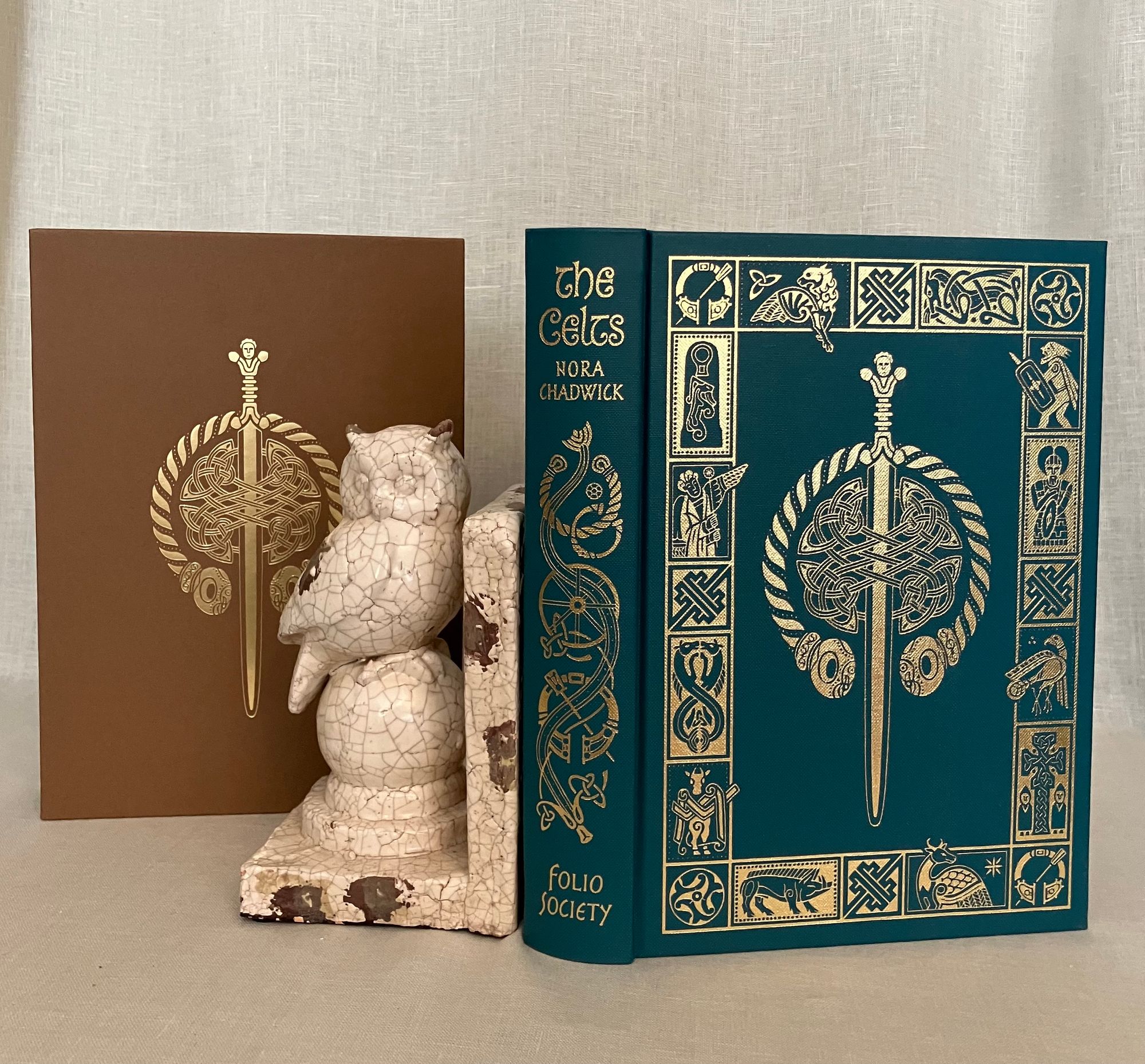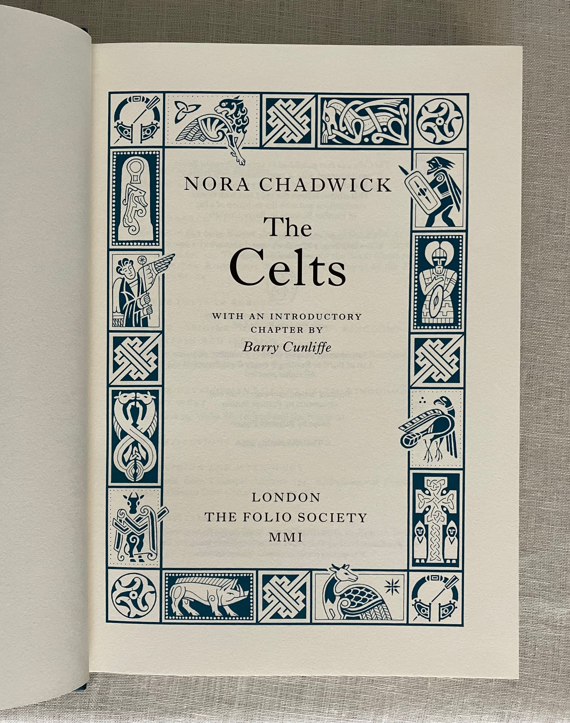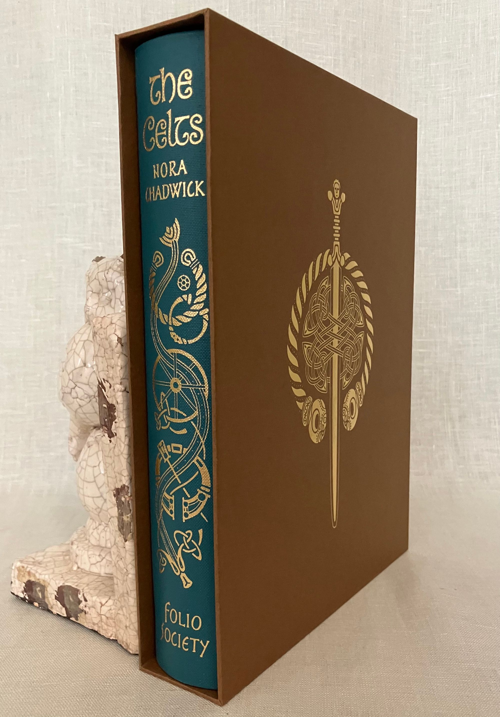 Reprint. (Twelfth Printing of the 2001 FS edition, copyright 2001.) Hard cover, 4to, bound in teal blue-green buckram fabric, Celtic designs blocked in gold on front board and spine, numerous illustrations, ranging from drawn maps to photographs in color, brown endpapers, printed on Yu Long Pure paper, 317pp. In the original brown paper-covered decorative slipcase. Binding design done by Frances Button. Maps drawn by Reginald Piggott, photographs of artifacts from various credited contributors. ** COLLATION: [i-iv] v-xxvi, 1-317pp., [1]. ** CONDITION: Fine, like new, with no visible wear or tear. ** CONTENTS: A comprehensive overview and history of the early Celts, who ranged from England, Ireland, Scotland, and beyond, including topics such as their culture, religion, art, way of life, and literature. A deep delve into all aspects of Celtic history, this edition of "The Celts" includes an introductory chapter and further reading list by Barry Cunliffe, born 1939. ** British AUTHOR Nora Chadwick CBE, FSA, FBA, (1891-1972) was a Cambridge-educated Philologist, an expert in early Northwestern European history, and later lectured on the Early History and Culture of the British Isles, publishing many books as the results of her research over the years. A fresh version of the well-loved classic on the subject. Heavy book, may require extra postage if going abroad. (CJ)