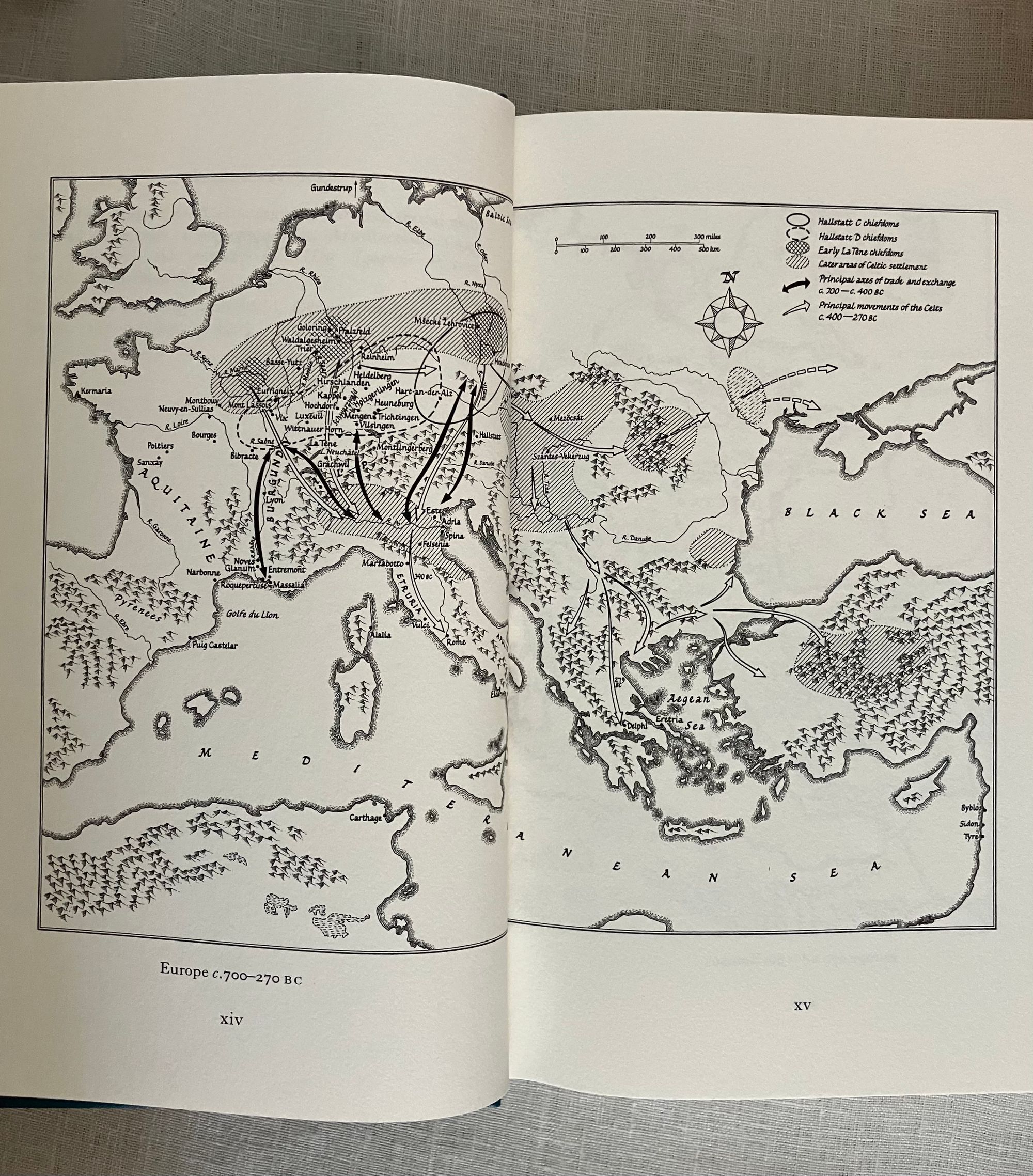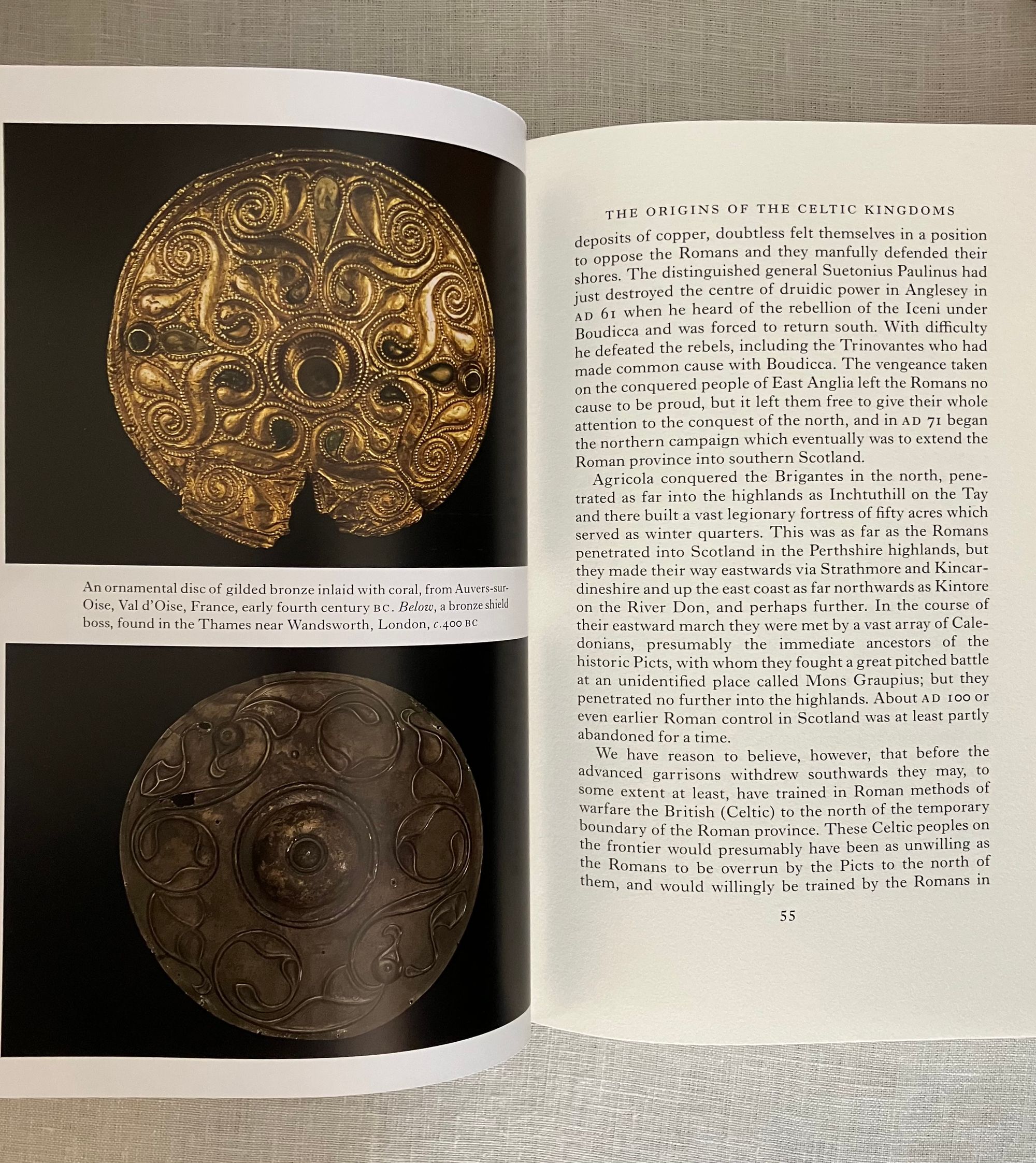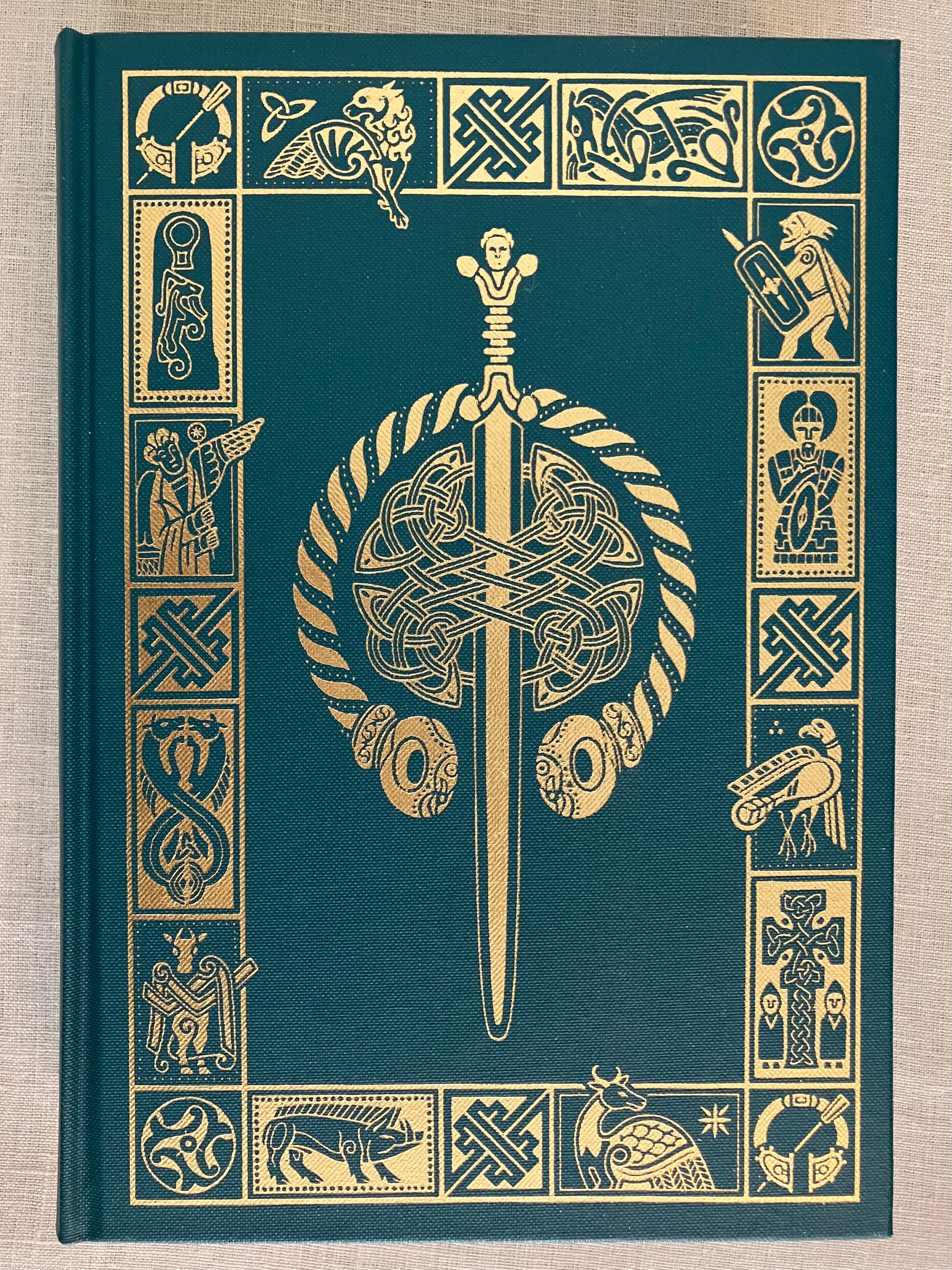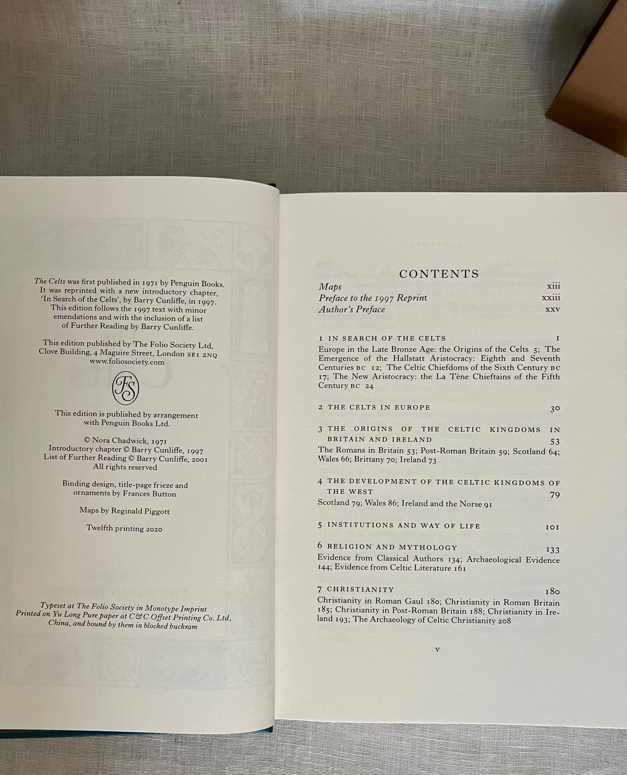 Reprint. (Twelfth Printing of the 2001 FS edition, copyright 2001.) Hard cover, 4to, bound in teal blue-green buckram fabric, Celtic designs blocked in gold on front board and spine, numerous illustrations, ranging from drawn maps to photographs in color, brown endpapers, printed on Yu Long Pure paper, 317pp. In the original brown paper-covered decorative slipcase. Binding design done by Frances Button. Maps drawn by Reginald Piggott, photographs of artifacts from various credited contributors. ** COLLATION: [i-iv] v-xxvi, 1-317pp., [1]. ** CONDITION: Fine, like new, with no visible wear or tear. ** CONTENTS: A comprehensive overview and history of the early Celts, who ranged from England, Ireland, Scotland, and beyond, including topics such as their culture, religion, art, way of life, and literature. A deep delve into all aspects of Celtic history, this edition of "The Celts" includes an introductory chapter and further reading list by Barry Cunliffe, born 1939. ** British AUTHOR Nora Chadwick CBE, FSA, FBA, (1891-1972) was a Cambridge-educated Philologist, an expert in early Northwestern European history, and later lectured on the Early History and Culture of the British Isles, publishing many books as the results of her research over the years. A fresh version of the well-loved classic on the subject. Heavy book, may require extra postage if going abroad. (CJ)