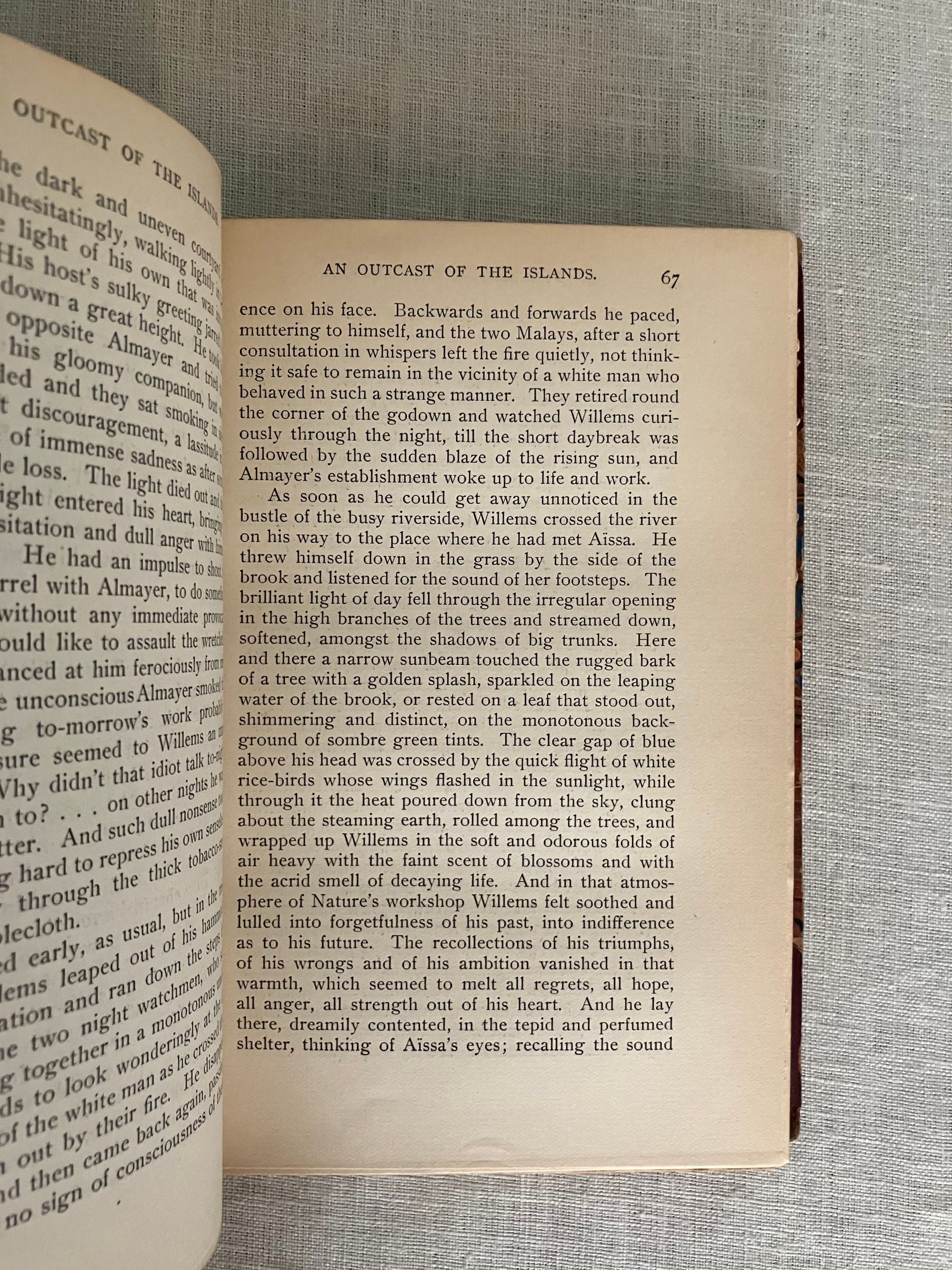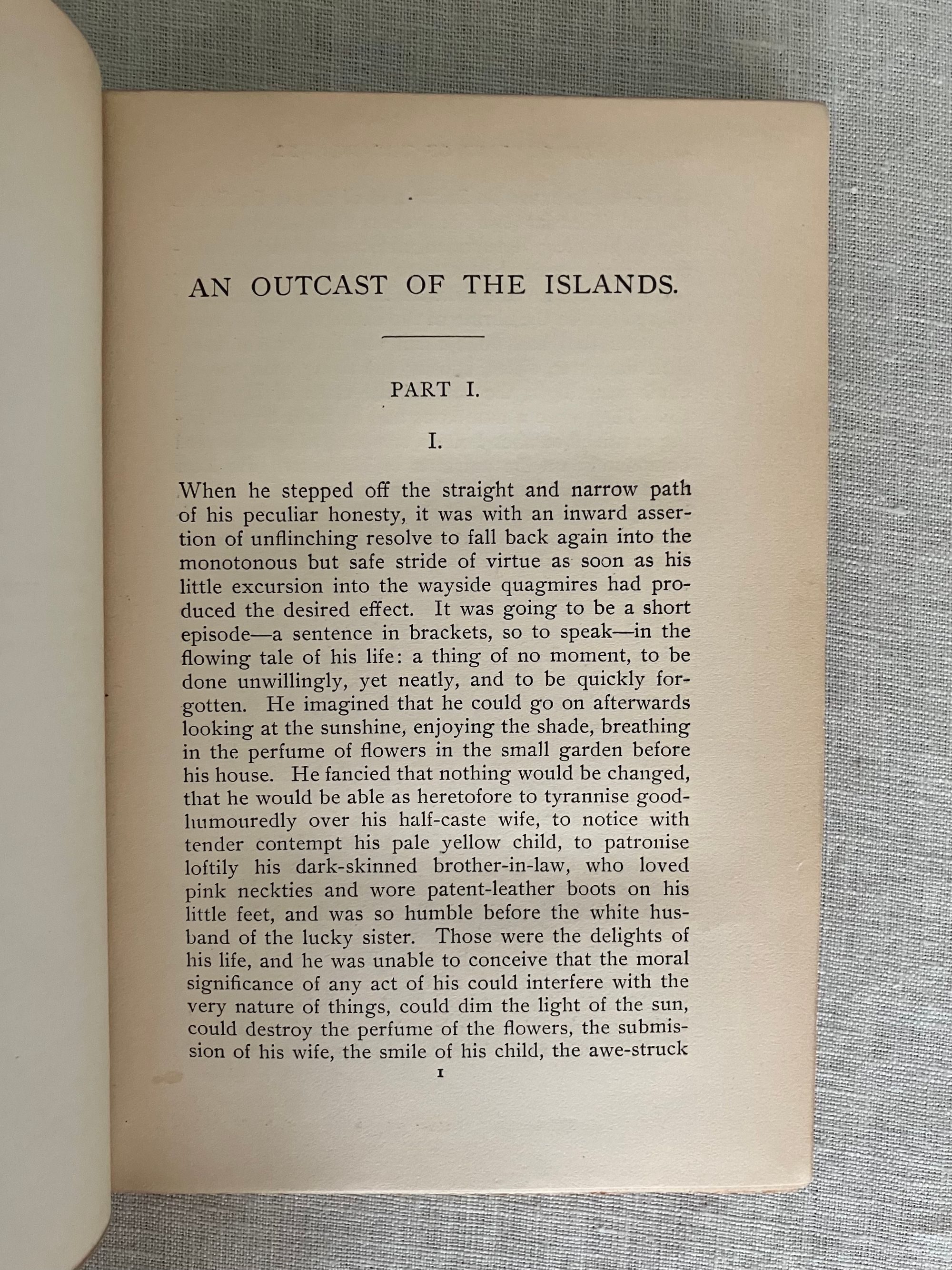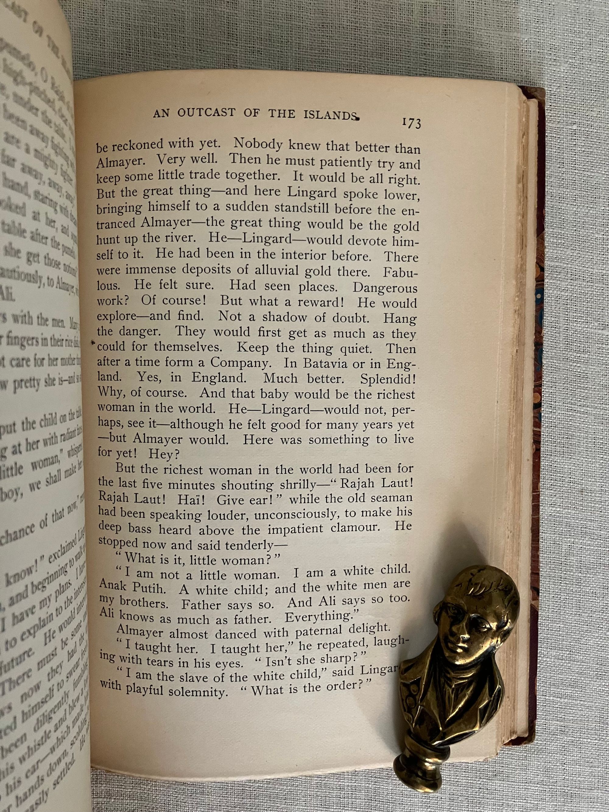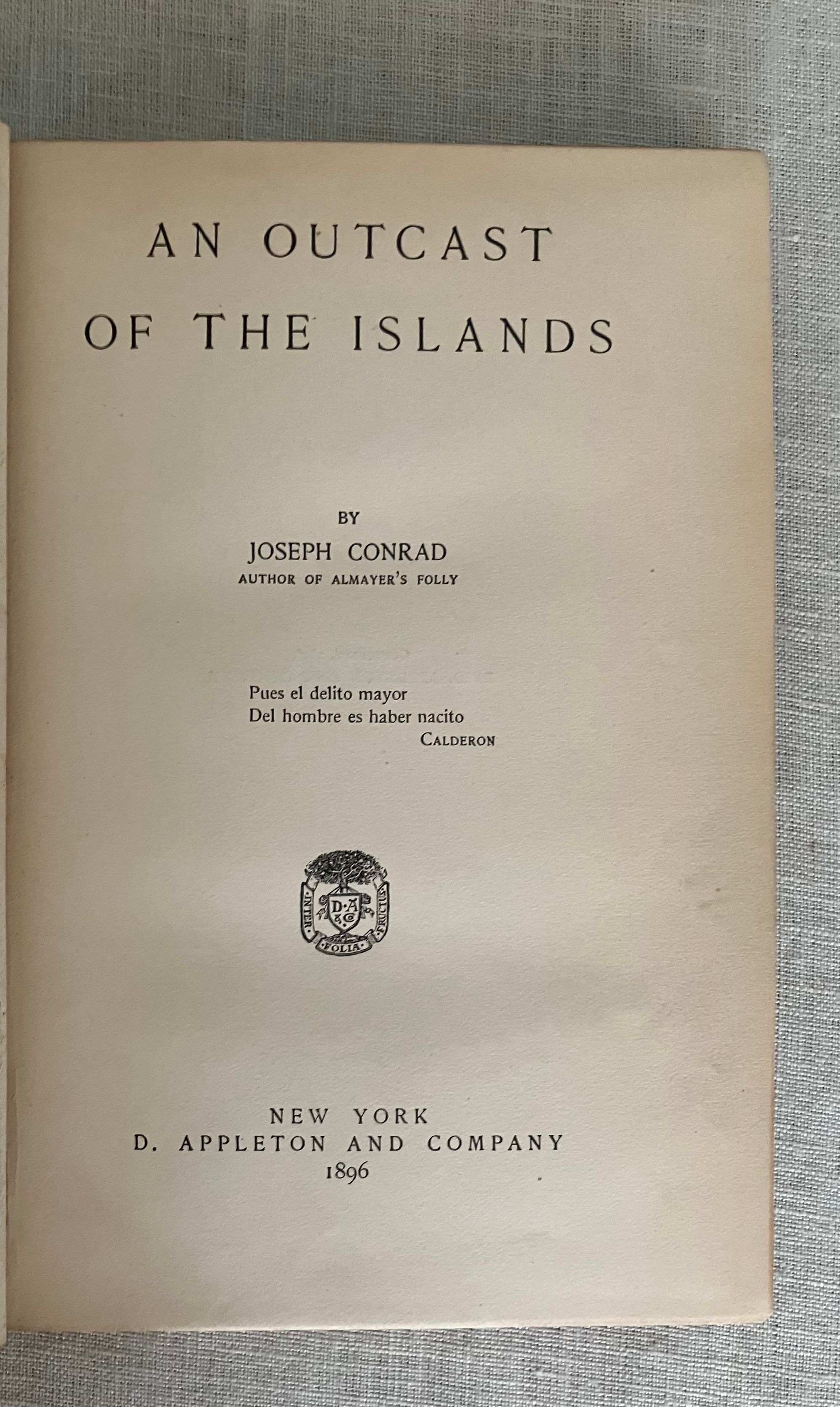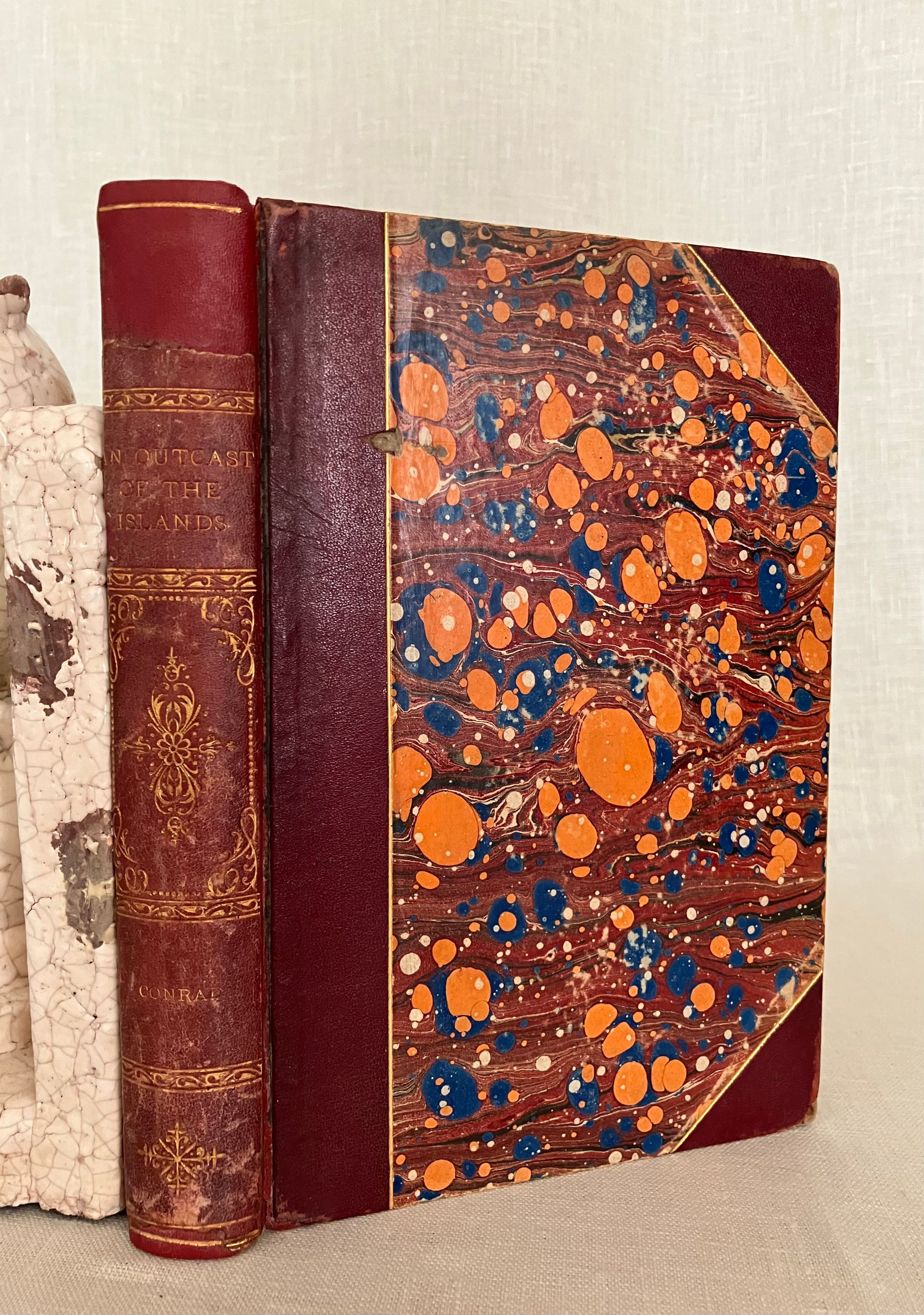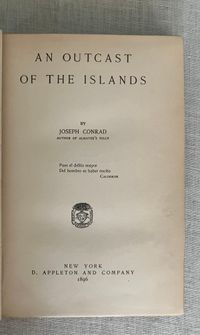 First American Edition, second impression, in the "Deluxe" binding. Hard cover, 12mo, in three quarter red roan, (rebacked,) over marbled paper-covered boards gilt. Top edge is gilt. Decoration and titles are blocked in gilt to the spine. COLLATION: [2][4]1-335,[4] pp. CONDITION: Very Good Plus. Many copies seen of this edition have much deterioration of the spine leather, so the re-backing preservation done here to retain as much as possible of the original is a boon; there is about an inch of loss to the original at head of spine and a quarter inch along the foot. Spine titles are somewhat faded, but legible. Shows some rubbing and one unobtrusive gouge (front) to marbled paper on the boards, shelf wear (mostly bottom edge) and rubbed tips. Inside, hinges are in order. Some penciled notations to ffep. as to edition. Mild age toning to the text, and moderate along the fore and bottom edges of the text block. Overall, the book remains clean, square and firm.** "An Outcast of the Islands" is the second novel written by Conrad, and forms a prequel to the story begun in 1895's "Almayer's Folly." The briefly noted "Almayer" character Peter Willems is here revisited by Conrad as a younger man. An over-confident cheat, gun-runner and general cad, Willems has a comeuppance after being caught embezzling funds from his Dutch employer, Hudig & Company, in Macassar, Malaysia. He presumes he will one day be made partner in the firm, when in fact he ends up being run out of town, loses all his friends and the goodwill of his ill-treated Malay-Portuguese wife and family. His youthful mentor Capt. Tom Lingard rescues him and relocates Willems to the remote trading outpost at Sambir, Borneo where he does not get along with the previous headman, Almayer. A new romantic obsession brings Willems into more strife, the trading post is attacked by an Arab rival and the story goes on from there.** Joseph Conrad's real life experiences as a mate onboard the tramp steamer Vidar on the Java Sea have been identified by scholars as the fictional basis for many of the characters and depictions of Malay life and culture in these novels. [Note: Another edition of this book with an identical title page was produced the same year in green cloth, and marketed as part of the Appleton's "Town & Country Library (No. 198)"--for this, see our listing 9186.] Cagle A2.B(3). Supino A2.12.0. , which was not issued with publisher's adverts.