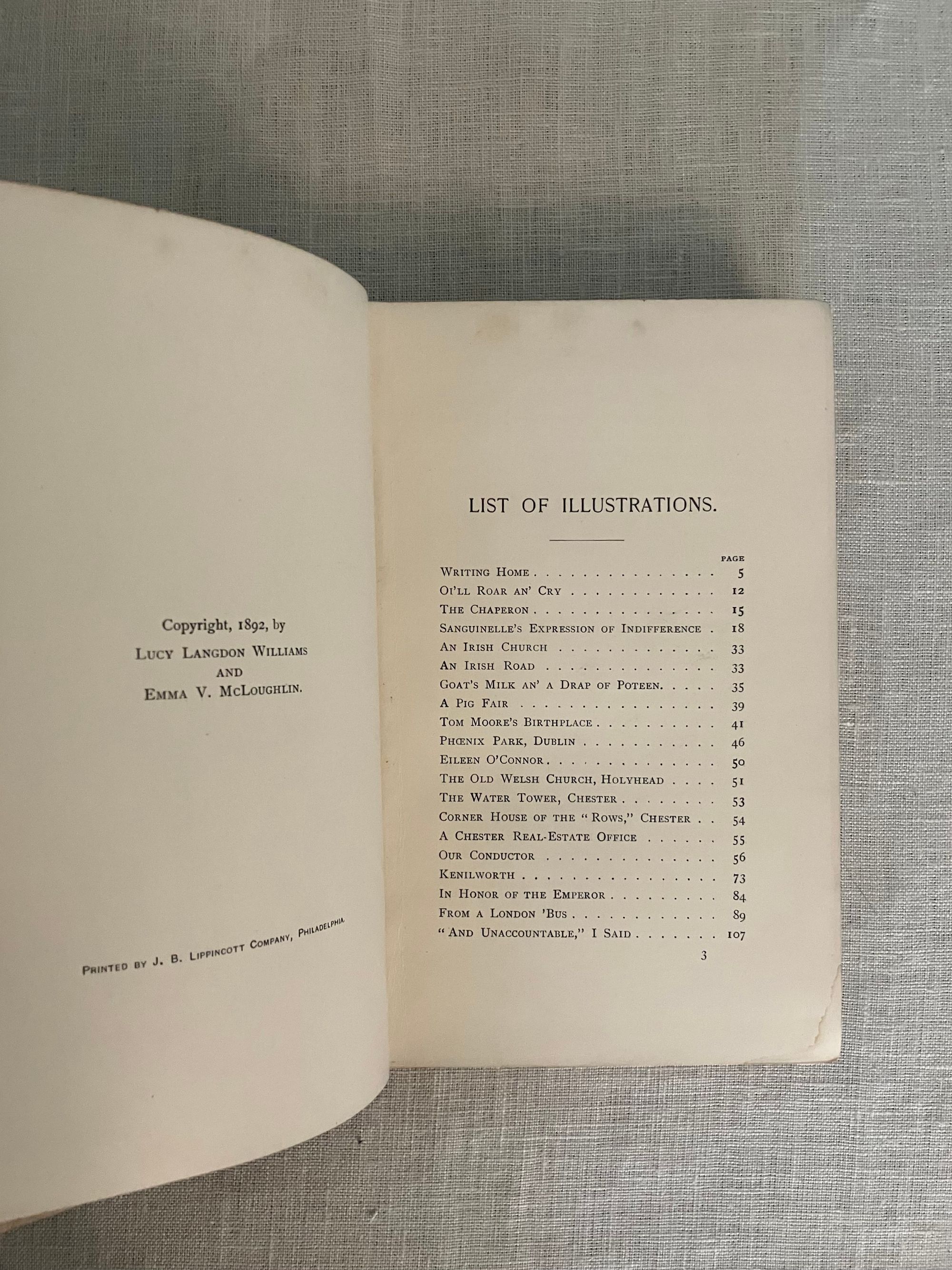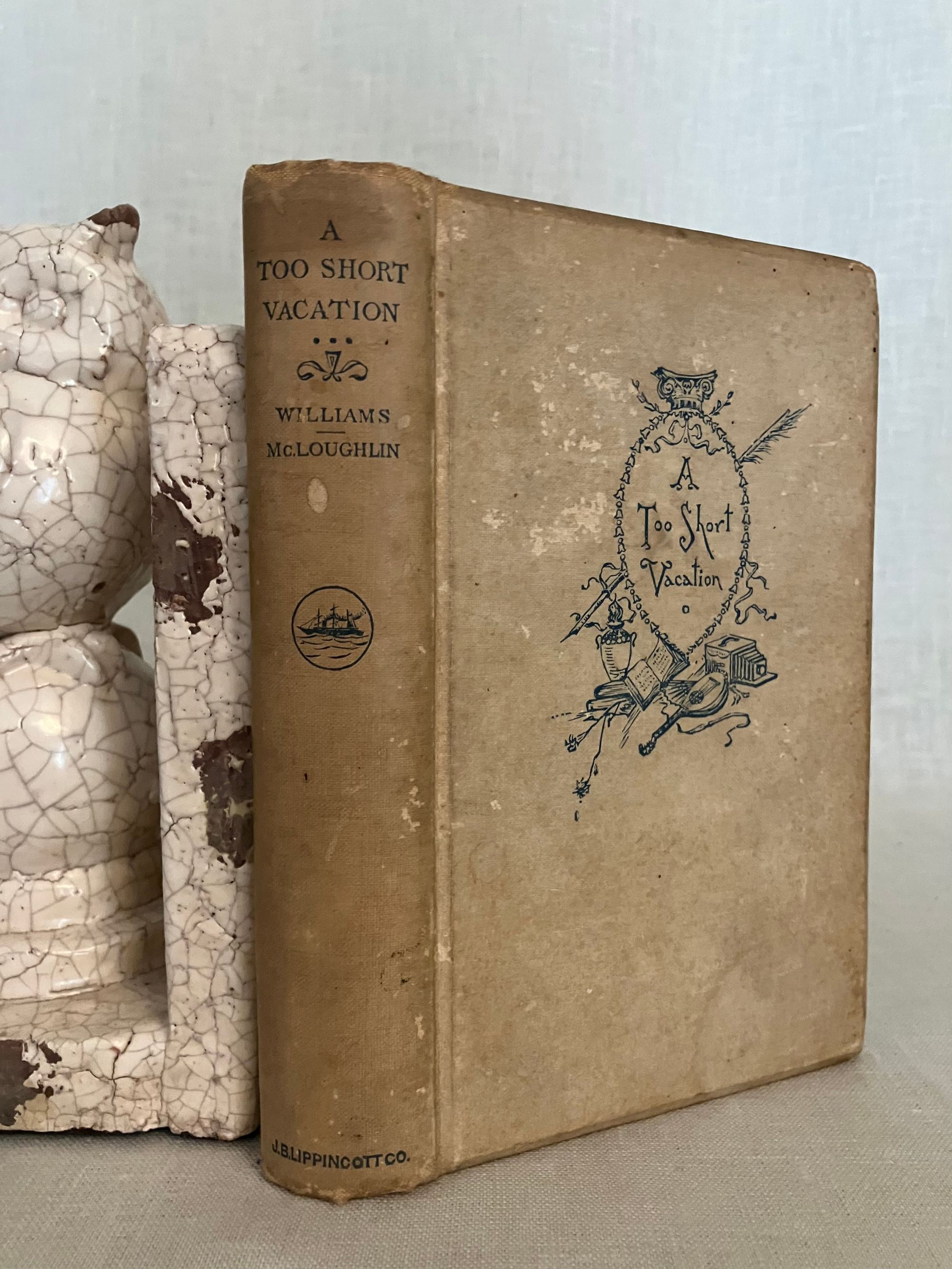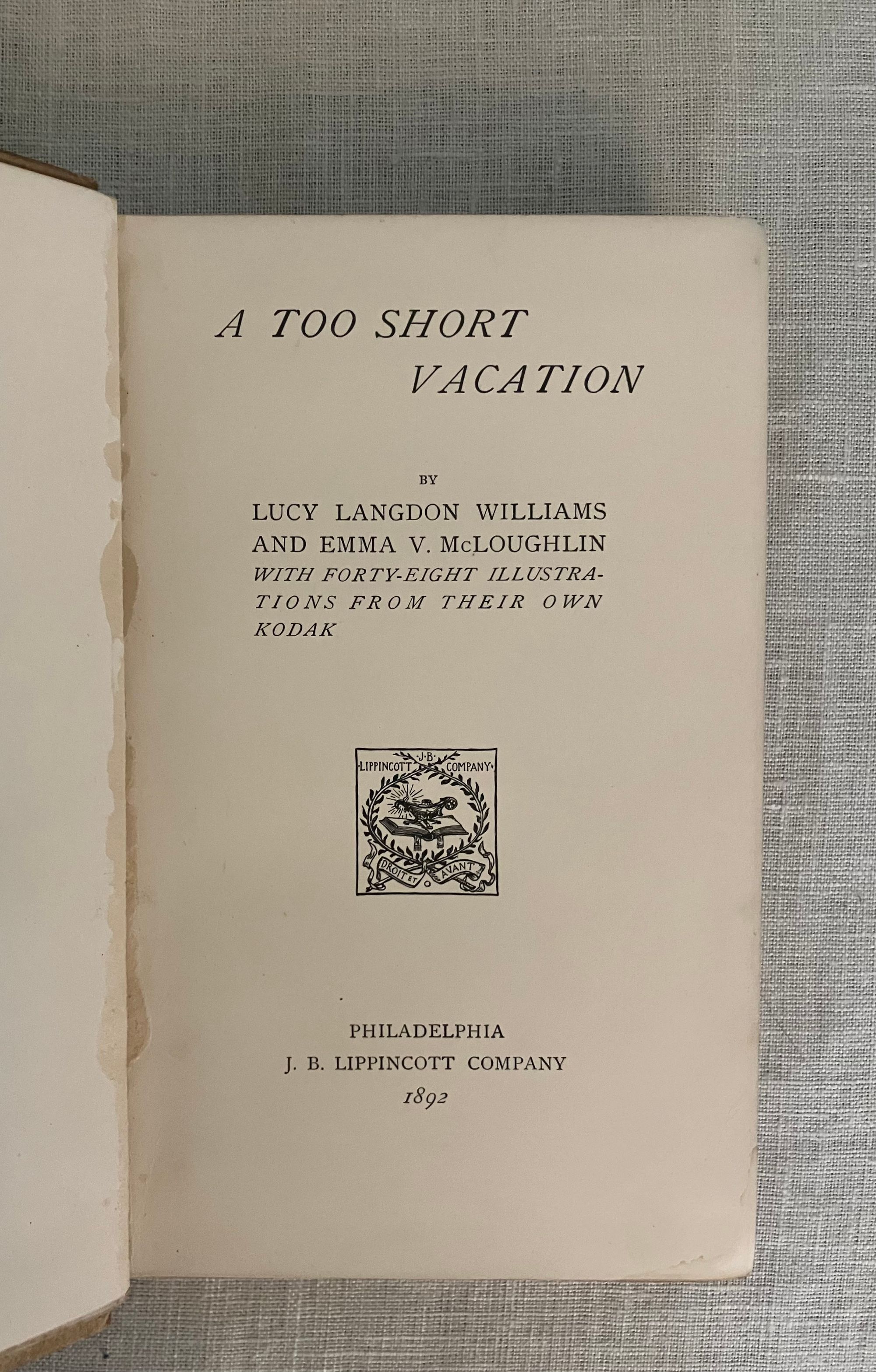 Hard cover, 16mo, in cream cloth-covered, bevelled-edged boards with the titles printed in green titles inside a decorative vignette frame showing a lute, camera, book and architectural capital. The spine with titles, a vignette of a steam-assisted sailing vessel, and publisher J.B. Lippincott Co. at foot. No dust jacket. Top edge stained light brown. Cream glazed end papers. An index of the 48 illustrations within the text, from photos taken by the authors. [1], [1-2], 3-264 pp. [1]. First edition. **CONDITION: Very Good. Exterior shows general soiling, with minor wear at head of spine. Spine a bit darkened. Edges a bit dusty. Inside, however, hinges are in order, the glazed pages are only mildly age toned, clean and square. Some glue residue in gutter opposite title pg. Now in mylar. **George Eastman's Kodak camera process first came into use in July 1888, eliminating the complex use of plates and exposures of earlier models, and his Kodak Brownie camera introduced in 1901 made photography more available to the non-specialist, such as our authors. (Kodak History, archived) The illustrations appear to be reproduced using the early Meisenbach/Ives methods of halftone screen reproduction. **This semi-autobiographical novel of a trip taken by steamer to Europe by a couple of progressive, high-spirited young women "Sanguinelle" and "Marion," is interesting on several points. The young women are obviously college educated, aware of and taking about, scientific advances. They document their story with the newly introduced Kodak Brownie camera in a series of in-text black and white vignettes. Langley's recent (1891) experiments with air-ships are casually mentioned. While in some ways a conventional melodrama about a vacation romance, there are really interesting and sometimes hysterically funny characterizations of the attitudes and actions of the more traditional women they come across, such as the "Personage with a Lorgnette." This is definitely a read for those interested in first wave feminism.**Vermont-born AUTHOR Lucy Langdon Williams [Wilson], referred to professionally as Dr. Lucy Wilson, (1864- 1937) was an international proponent of progressive education for women, and spent most of her career as an educator in the Philadelphia area at both boys and girls schools. She would later found, and become principal of, the South Philadelphia High School for Girls in 1916. (Philadelphia Hist. Society) A trained biologist, she was associated with the Woods Hole Marine Laboratory, and also did work on Southwest anthropology and ethnography, rounding out her lengthy educational career as a professor of at Temple University. Her traveling companion and CO-AUTHOR, was Emma V. McLoughlin. OCLC 4309602. Scarce.