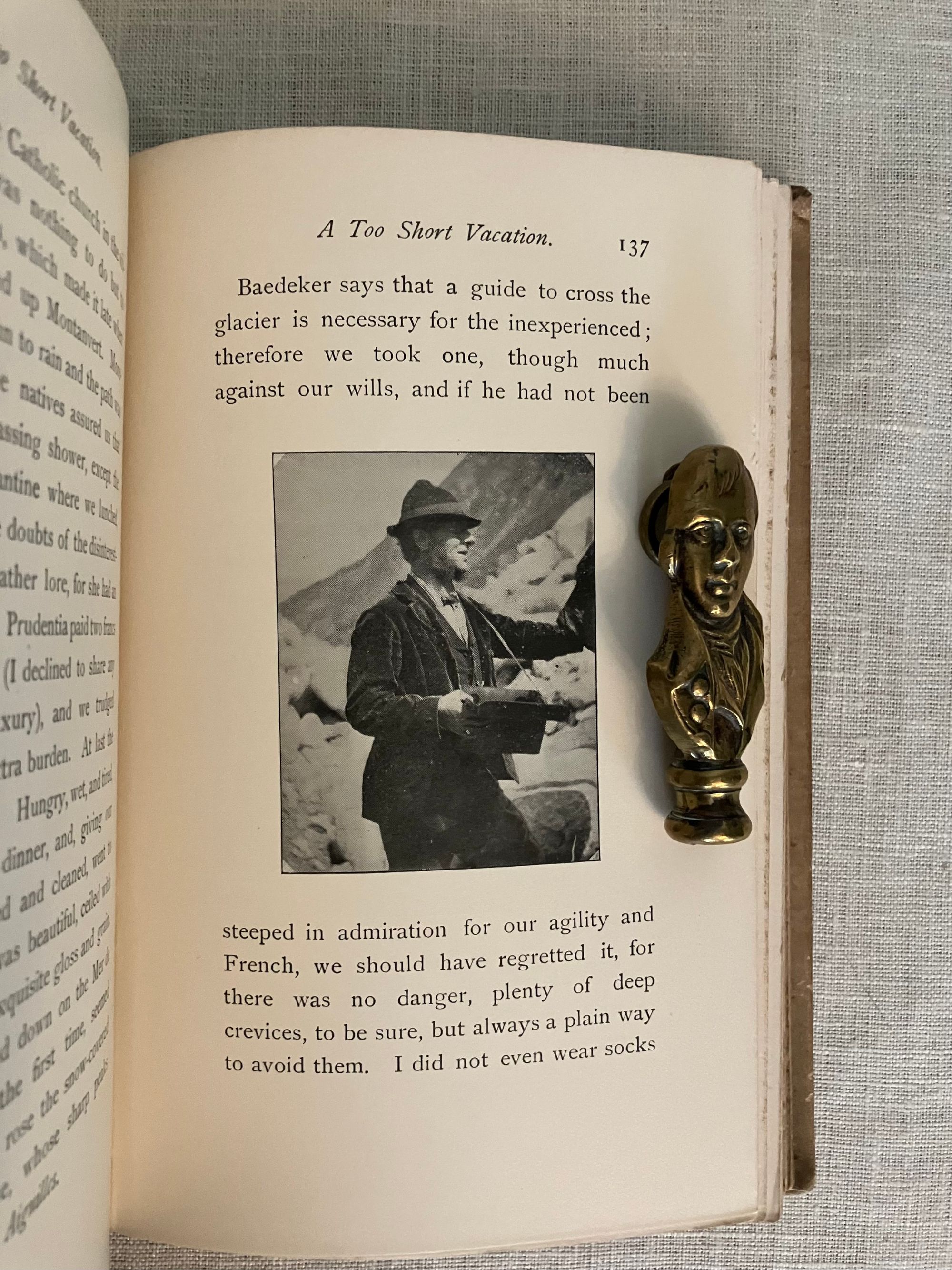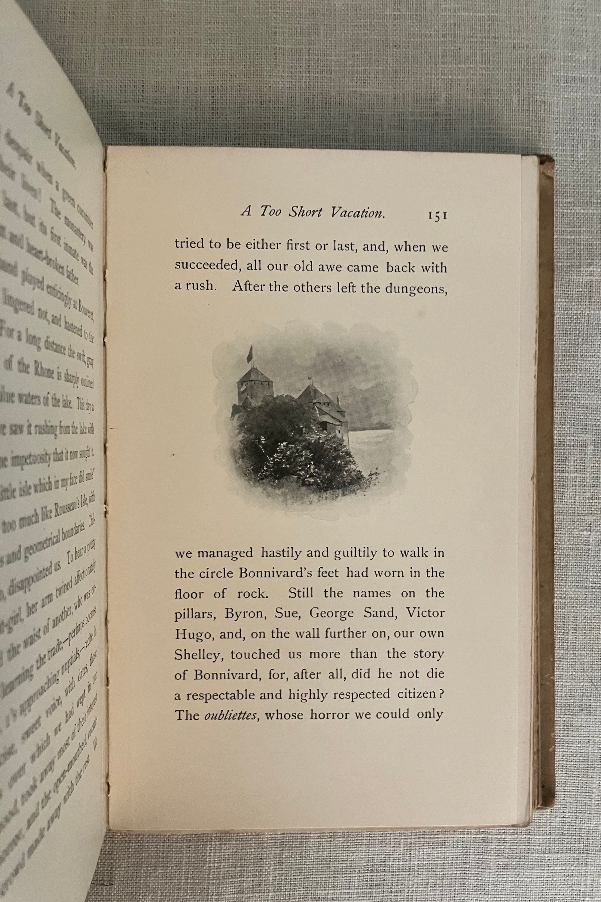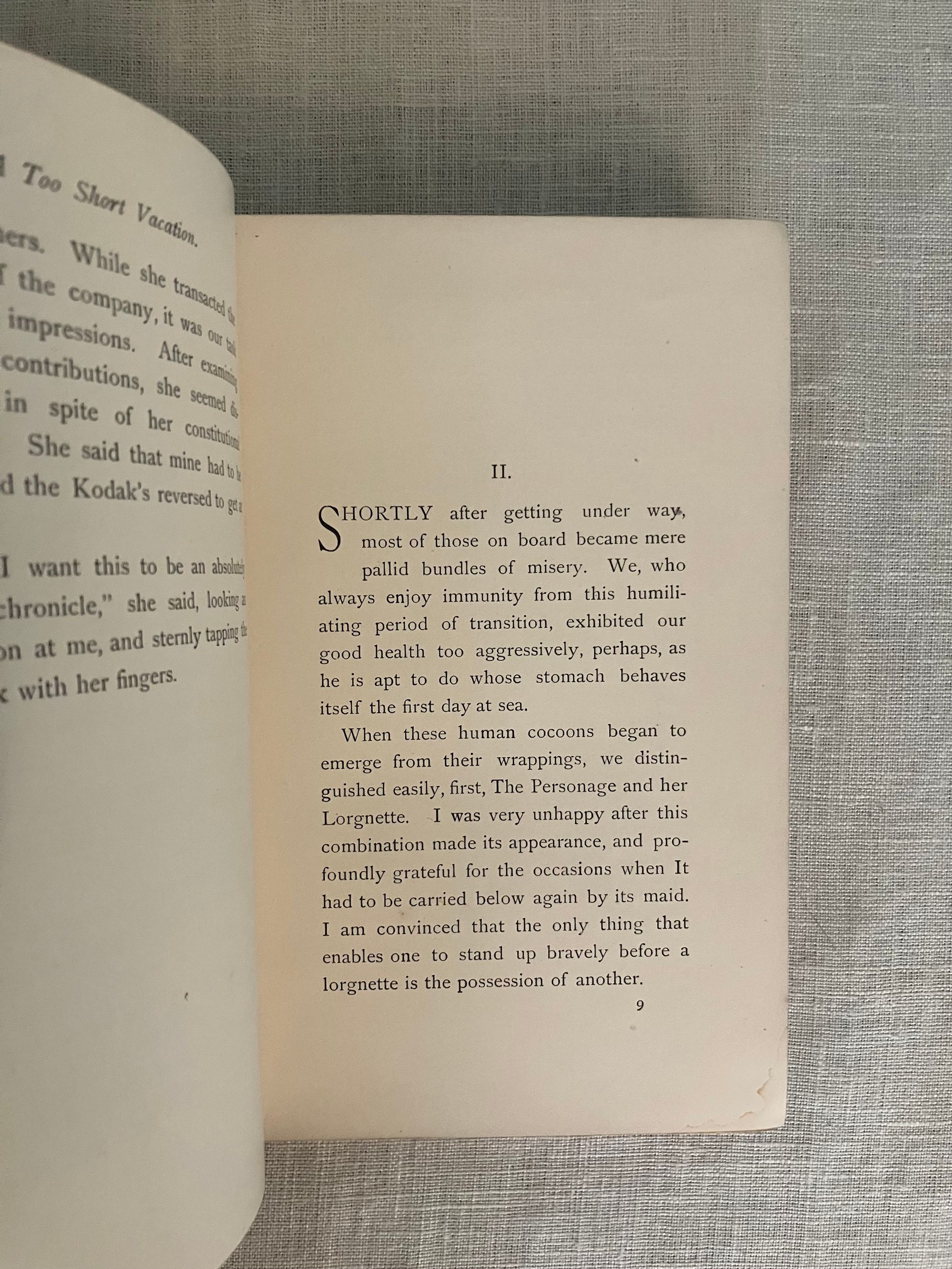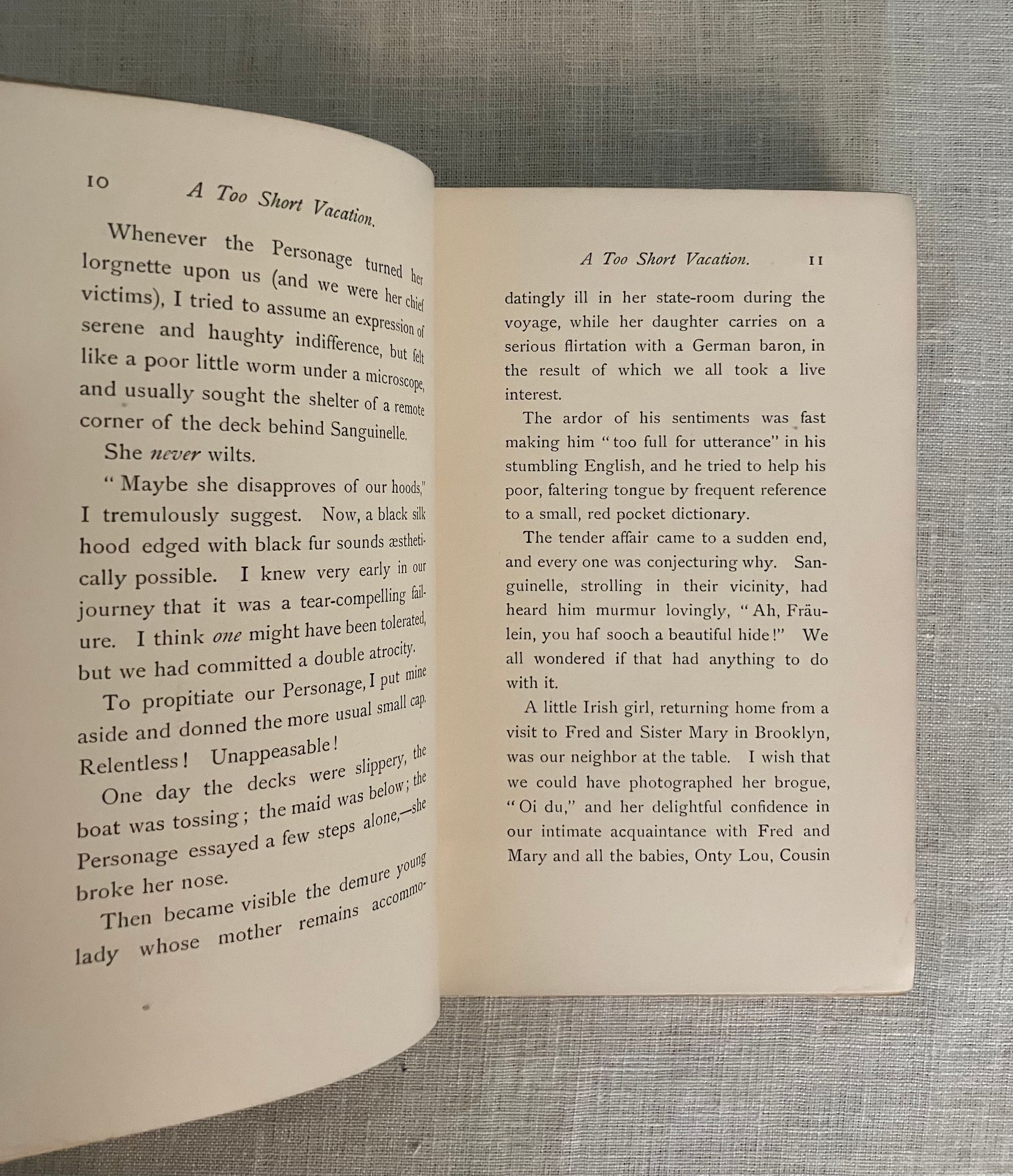 Hard cover, 16mo, in cream cloth-covered, bevelled-edged boards with the titles printed in green titles inside a decorative vignette frame showing a lute, camera, book and architectural capital. The spine with titles, a vignette of a steam-assisted sailing vessel, and publisher J.B. Lippincott Co. at foot. No dust jacket. Top edge stained light brown. Cream glazed end papers. An index of the 48 illustrations within the text, from photos taken by the authors. [1], [1-2], 3-264 pp. [1]. First edition. **CONDITION: Very Good. Exterior shows general soiling, with minor wear at head of spine. Spine a bit darkened. Edges a bit dusty. Inside, however, hinges are in order, the glazed pages are only mildly age toned, clean and square. Some glue residue in gutter opposite title pg. Now in mylar. **George Eastman's Kodak camera process first came into use in July 1888, eliminating the complex use of plates and exposures of earlier models, and his Kodak Brownie camera introduced in 1901 made photography more available to the non-specialist, such as our authors. (Kodak History, archived) The illustrations appear to be reproduced using the early Meisenbach/Ives methods of halftone screen reproduction. **This semi-autobiographical novel of a trip taken by steamer to Europe by a couple of progressive, high-spirited young women "Sanguinelle" and "Marion," is interesting on several points. The young women are obviously college educated, aware of and taking about, scientific advances. They document their story with the newly introduced Kodak Brownie camera in a series of in-text black and white vignettes. Langley's recent (1891) experiments with air-ships are casually mentioned. While in some ways a conventional melodrama about a vacation romance, there are really interesting and sometimes hysterically funny characterizations of the attitudes and actions of the more traditional women they come across, such as the "Personage with a Lorgnette." This is definitely a read for those interested in first wave feminism.**Vermont-born AUTHOR Lucy Langdon Williams [Wilson], referred to professionally as Dr. Lucy Wilson, (1864- 1937) was an international proponent of progressive education for women, and spent most of her career as an educator in the Philadelphia area at both boys and girls schools. She would later found, and become principal of, the South Philadelphia High School for Girls in 1916. (Philadelphia Hist. Society) A trained biologist, she was associated with the Woods Hole Marine Laboratory, and also did work on Southwest anthropology and ethnography, rounding out her lengthy educational career as a professor of at Temple University. Her traveling companion and CO-AUTHOR, was Emma V. McLoughlin. OCLC 4309602. Scarce.