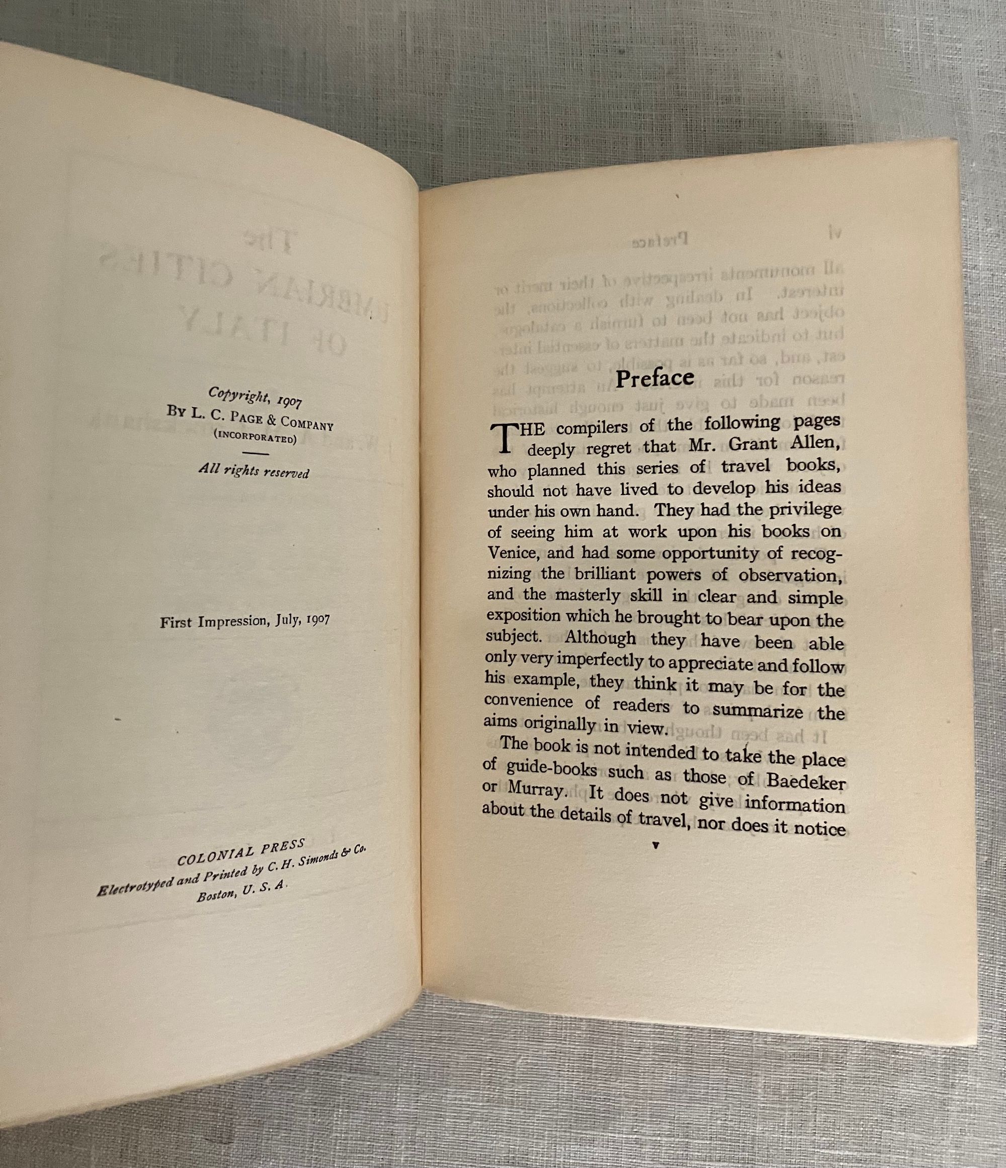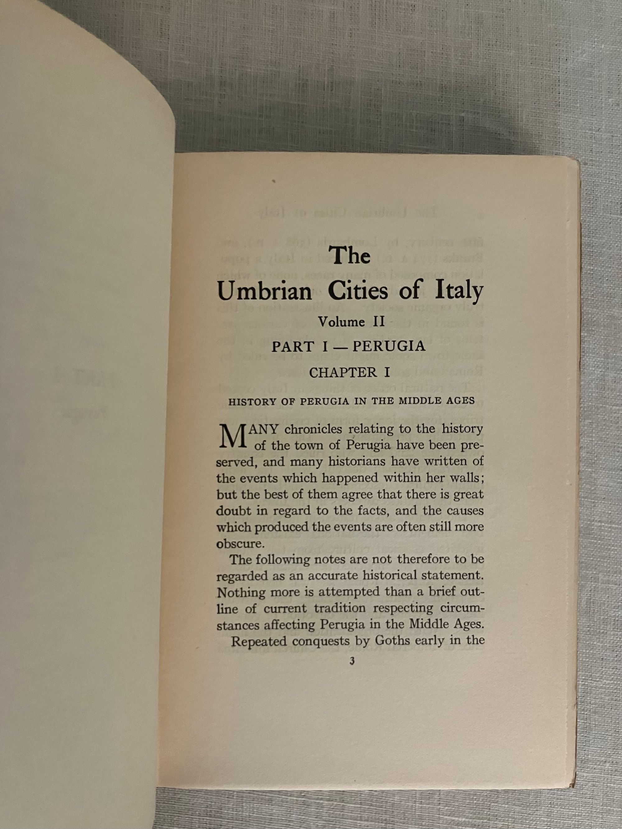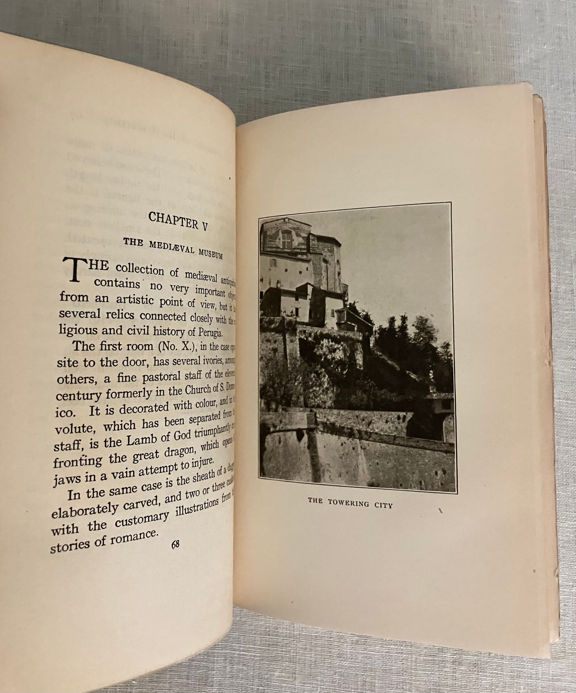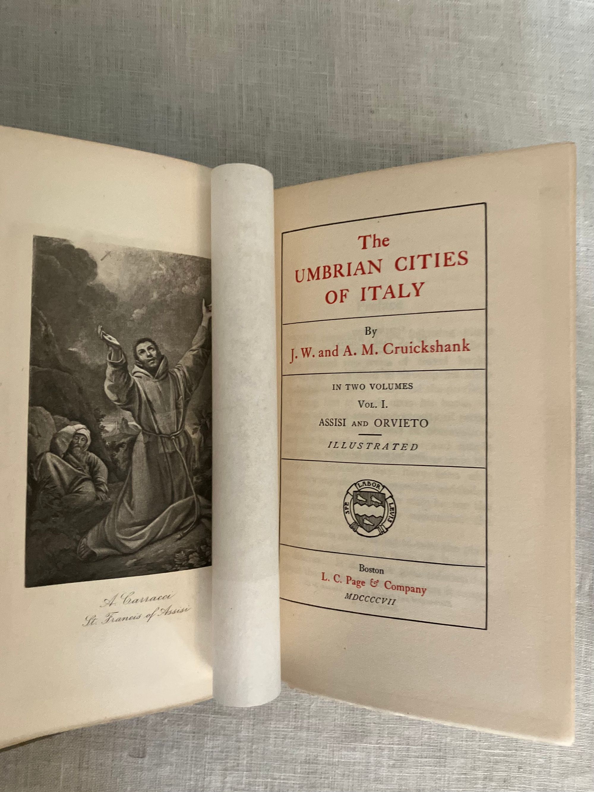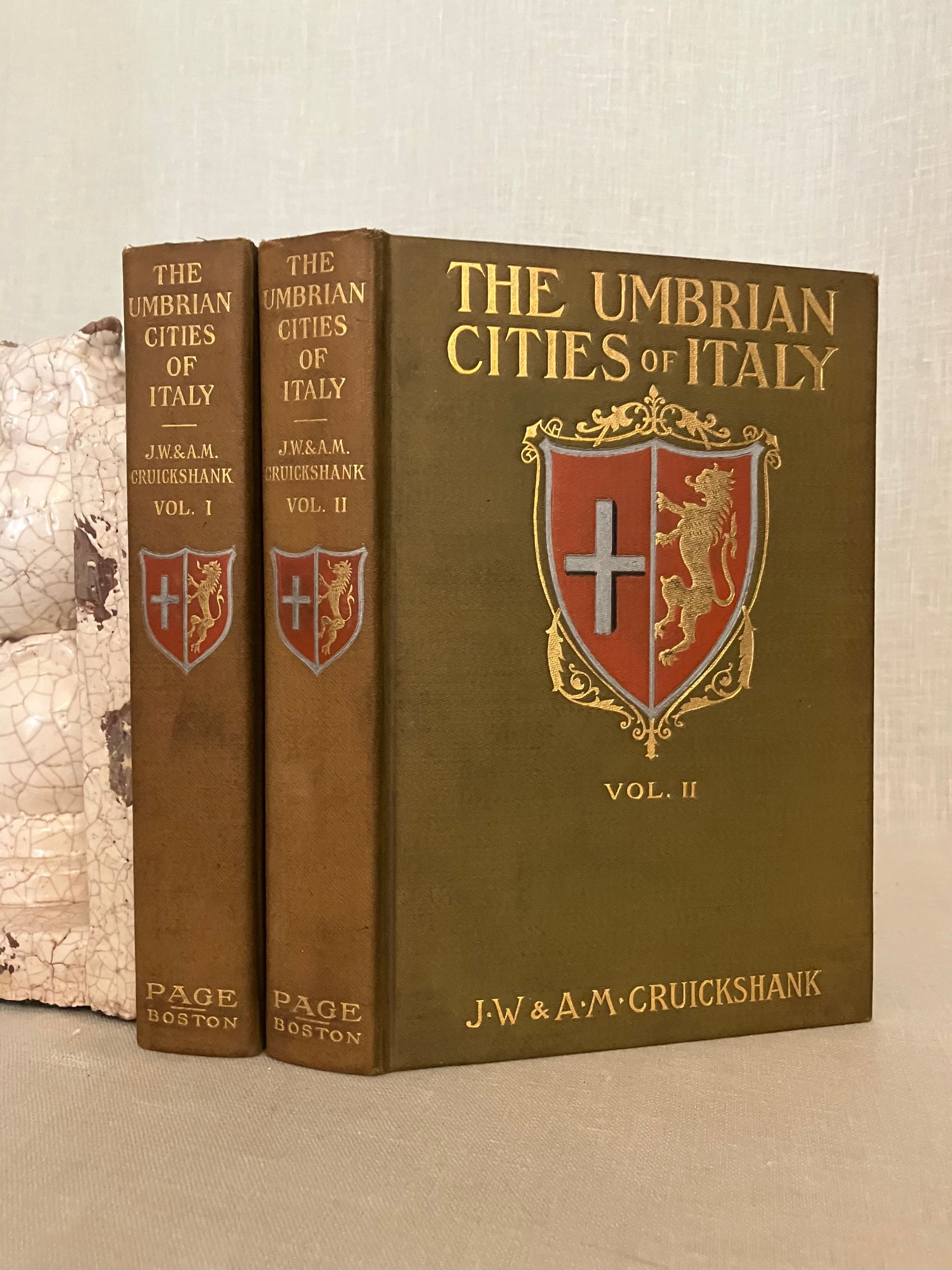 First Edition, stated First impression, July 1907. In English. Hard cover 12mo, in green cloth, the titles blocked in gilt, with a vignette shield in red, light blue and gold with a lion rampant and cross, the author and illustrator's names at the foot of the front board. The spine has a similar design. Top edge gilt, fore edge of text block untrimmed. Vol. I, xx, 365 pp. Vol. II viii, 367, including Indexes and Apendices.**CONDITION: Very Good Plus. Sunning to the front and spines of the two volumes has oxidized the color to a degree, as seen in photos. A few inconsequential smudges to boards. **The thirteenth installment of the "The Travel Lovers Library," Boston publisher L.C. Page & Company's illustrated travel series, modeled on the success of other contemporary travel publishers, such as Britain's A. & C. Black, who were benefitting from the new era of relatively affordable tourism brought about by the advent of expanded rail links and steam- powered sailing vessels around the turn of the twentieth century. Vol. I describes the cities of Assisi and Orvieto, including a biography of the life of St. Francis of Assisi, elevations and black and white photo reproductions of the interior of Chiesa Nuova, the Church of S. Francesco, Assisi and other monuments and museums. Also a chapter on places of interest in Orvieto, once "one of the richest and most powerful cities of the Etruscan confederation." (p. 203.) Vol. II details some of the attractions of Perugia, and some of the smaller Umbrian Towns, and has useful Appendices on Umbrian Art to be found outside of Italy, as well as additional reading suggestions on the arts and artists. The Authors Cruikshank took over the writing of this series after the death of the original instigator, Ontario-born, Oxford educated man of letters, Grant Allen (1848-1899), who in addition to penning works on travel, was also prolifically churning out works on evolution, naturalism, socialism, and science fiction. (N. Ruddick, Oxford Bibliographies). OCLC 1804443.