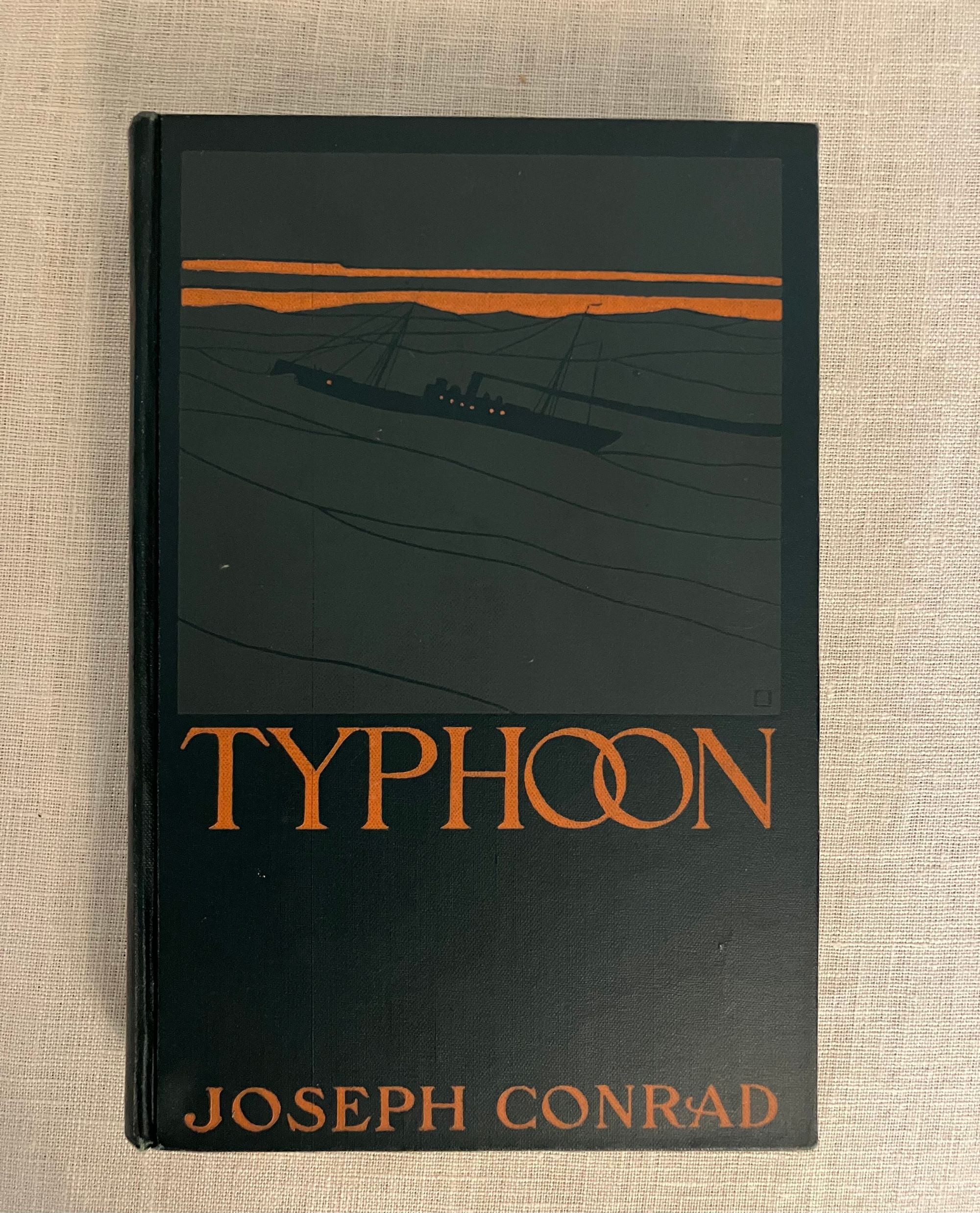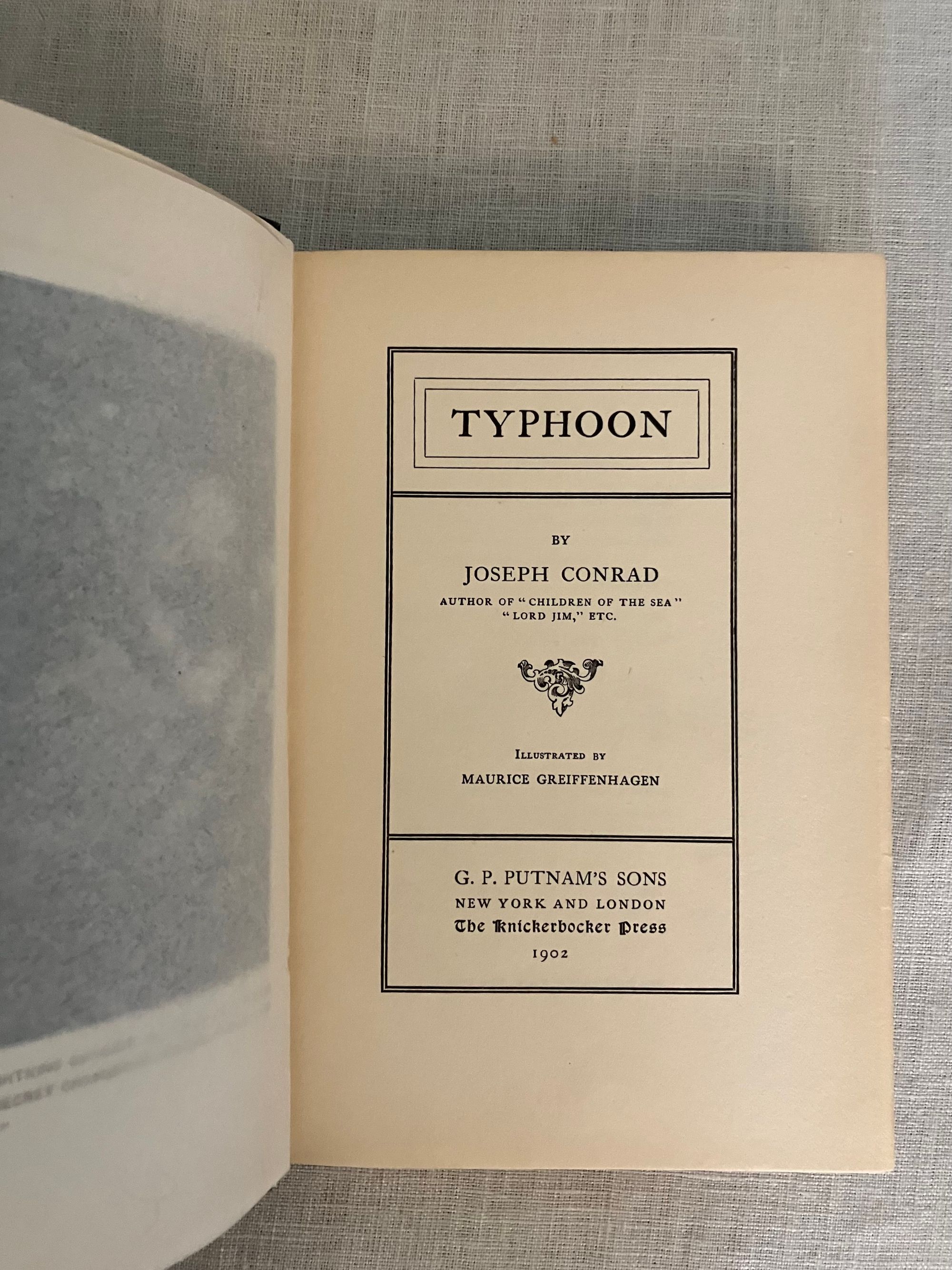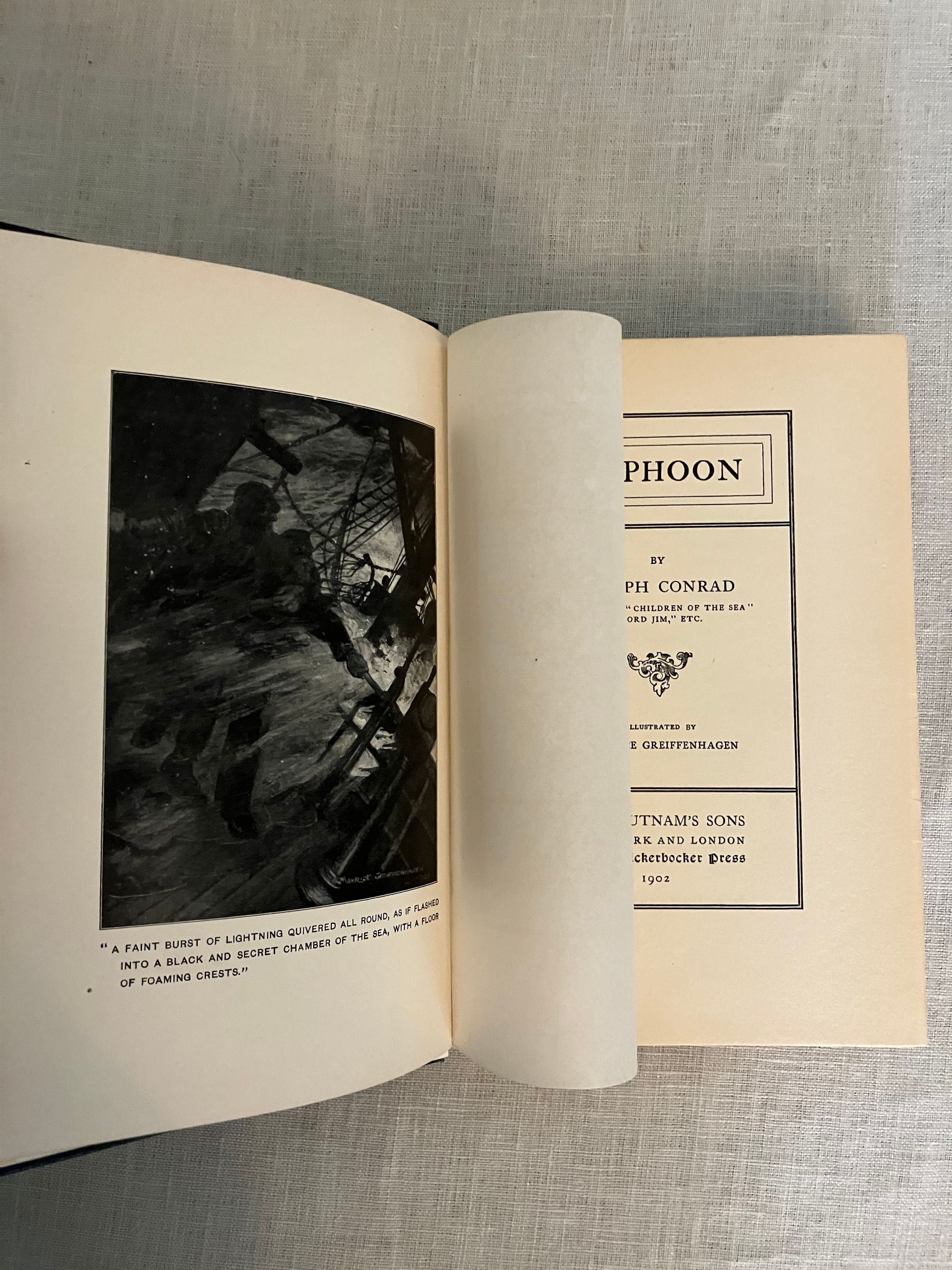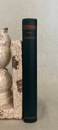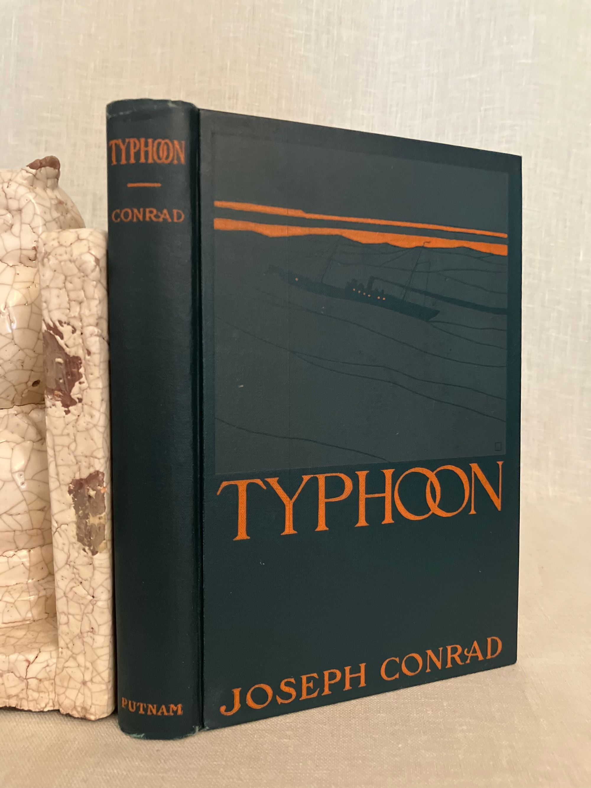 First American Edition, Copyright 1902 by G.P. Putnam's Sons. and published in early September 1902 (see Supino, below.) Hard cover, 16mo, in dark blue green cloth, with the distinctive art deco image of a steam-assisted sailing vessel plying moody, mounting seas at night blocked in black, orange and dark grey. Titles contrast strongly in the orange. Cover art has a "square" monogram signature to the lower right corner. Top edge stained gray. Illustrated with frontispiece and a further 5 black and white illustrations by British Artist Maurice Greiffenhagen R.A.(1862-1931) book illustrator, painter and poster artist.** COLLATION:[2] [i-iv],[frontis and guard], [v], [vi blank], I-205pp., [1], Publisher's advertising section titled"Good Fiction," [4pp.][1].**CONDITION: Very Good. Covers are clean, with perhaps minute wear to tips, ghost of a sticker to rear board. Within, gentle age toning to pages. Both hinges appear to have been reglued. Book is square and tight, with no signs of foxing. Engraved bookplate of former owner to front pastedown. Lacking dust jacket. ** First serialized in Pall Mall Magazine, Jan. - March 1902. This First American Edition does not contain the additional tales contained in the First English Edition. **This classic nautical tale of Capt. McWhirr and the voyage of the Nan-Shan through the roughest China Seas puts the reader right in the eye of the proverbial hurricane, where character and resolve of even the most experienced crew are pitted against nature itself. Moral conundrums arise involving the treatment of the Chinese crew, and the Siamese flagging of what is essentially a British merchant vessel in this powerfully written novel by the Polish-Ukrainian Author Joseph Conrad, writing in his third language, English, which he began learning a mere twenty or so years earlier. Lohf & Sheehy 161. David J. Supino, A8.1.0, p. 94-97 in "Joseph Conrad, A Bibliographical Catalogue of Editions to 1930," (Liverpool Univ. Press, 2022.)