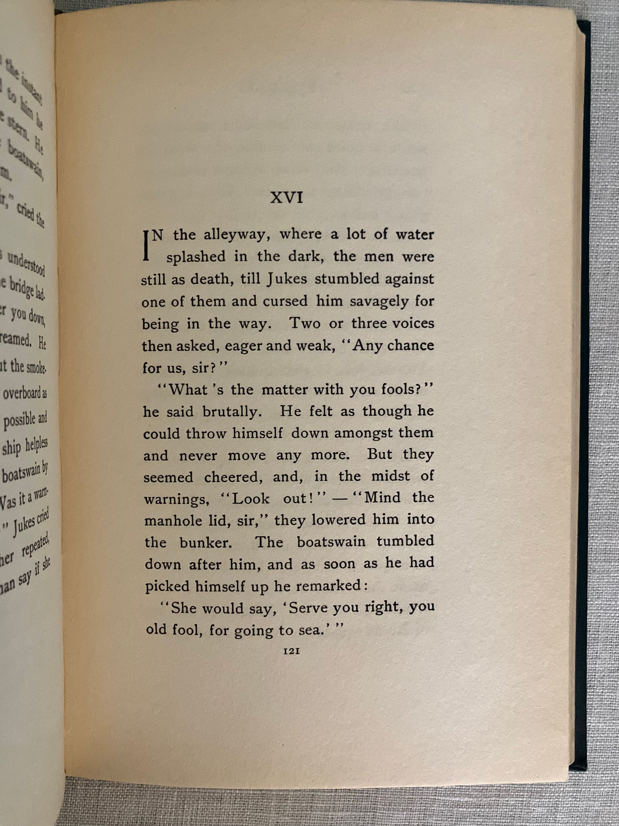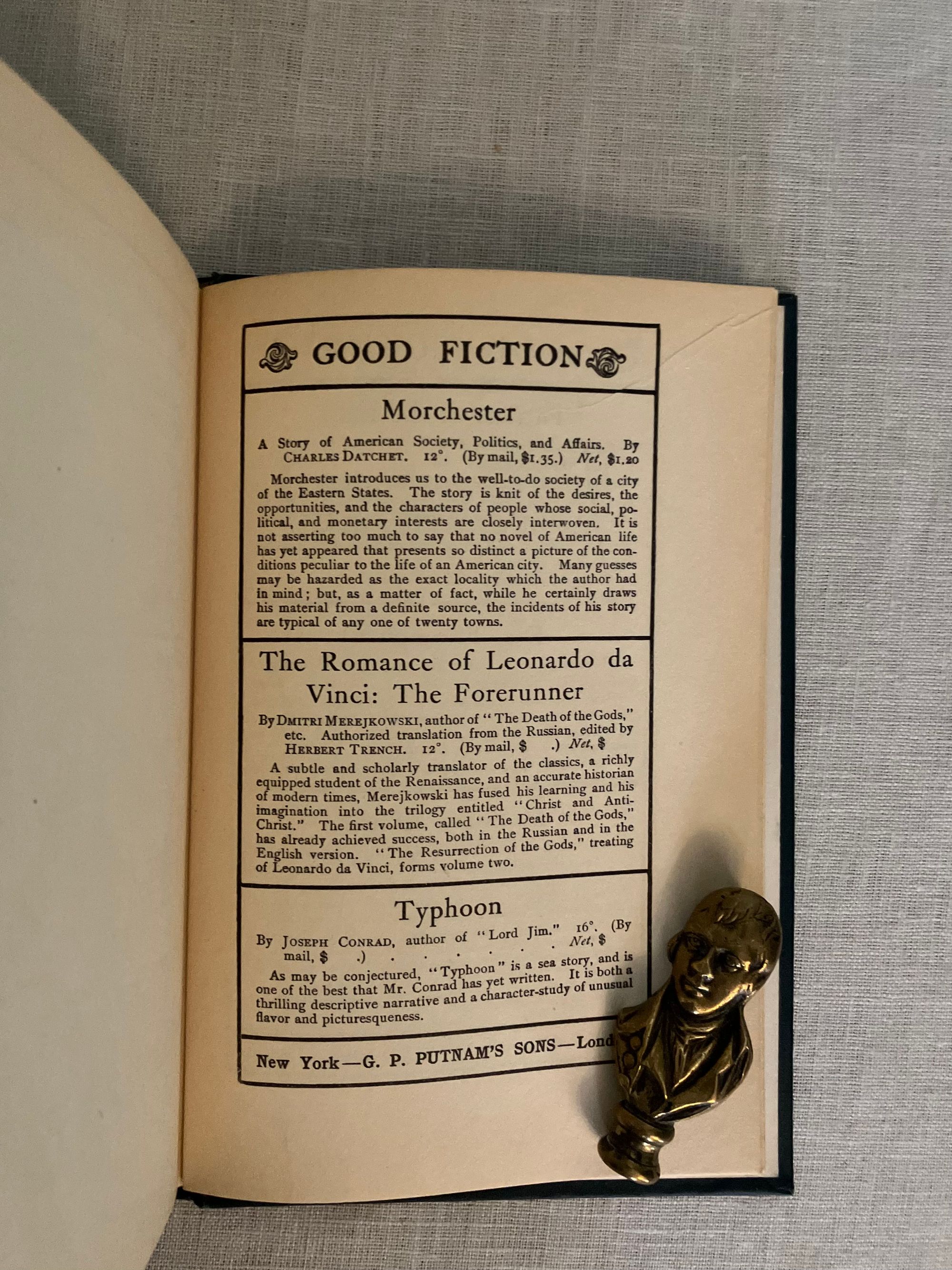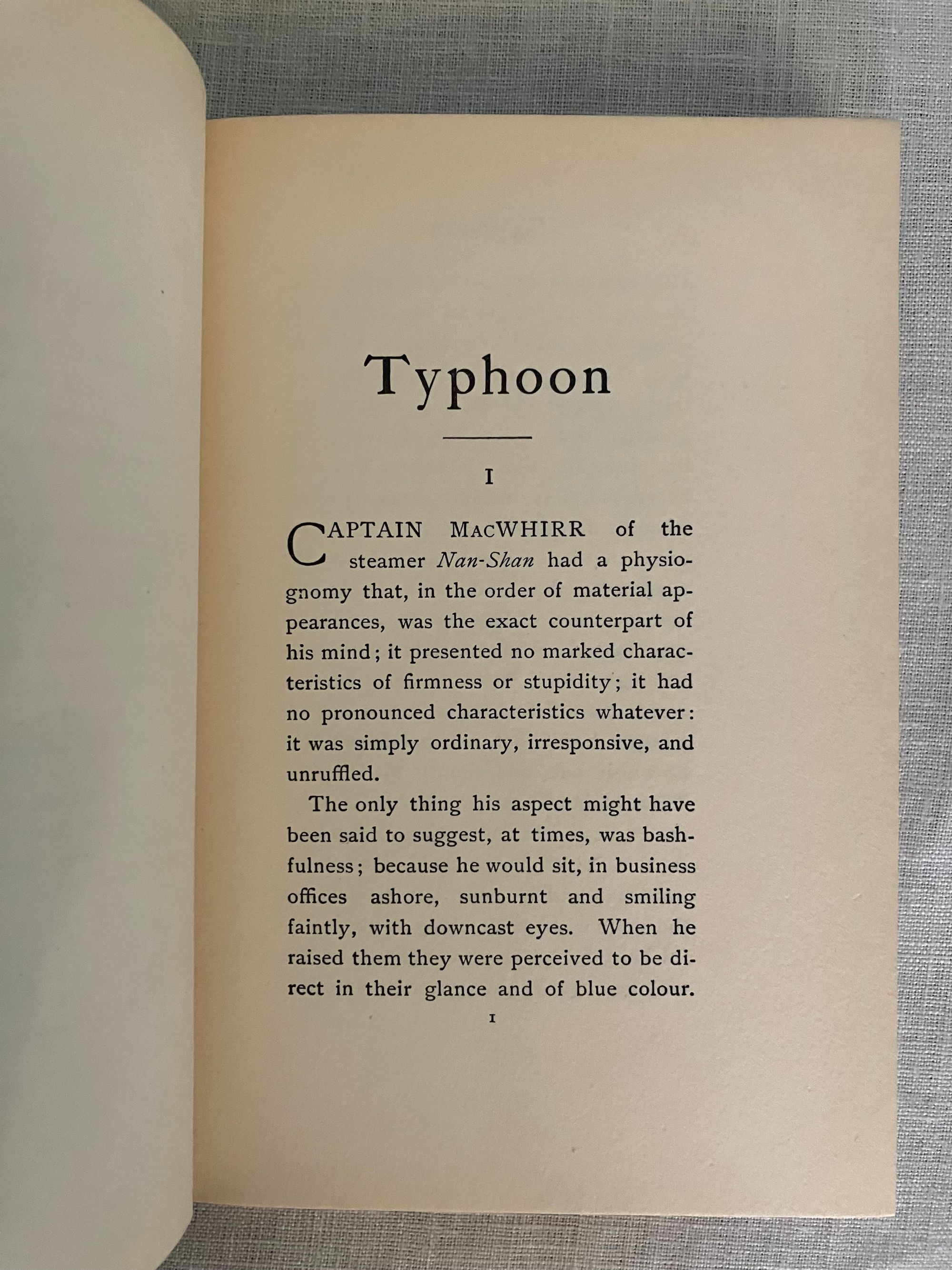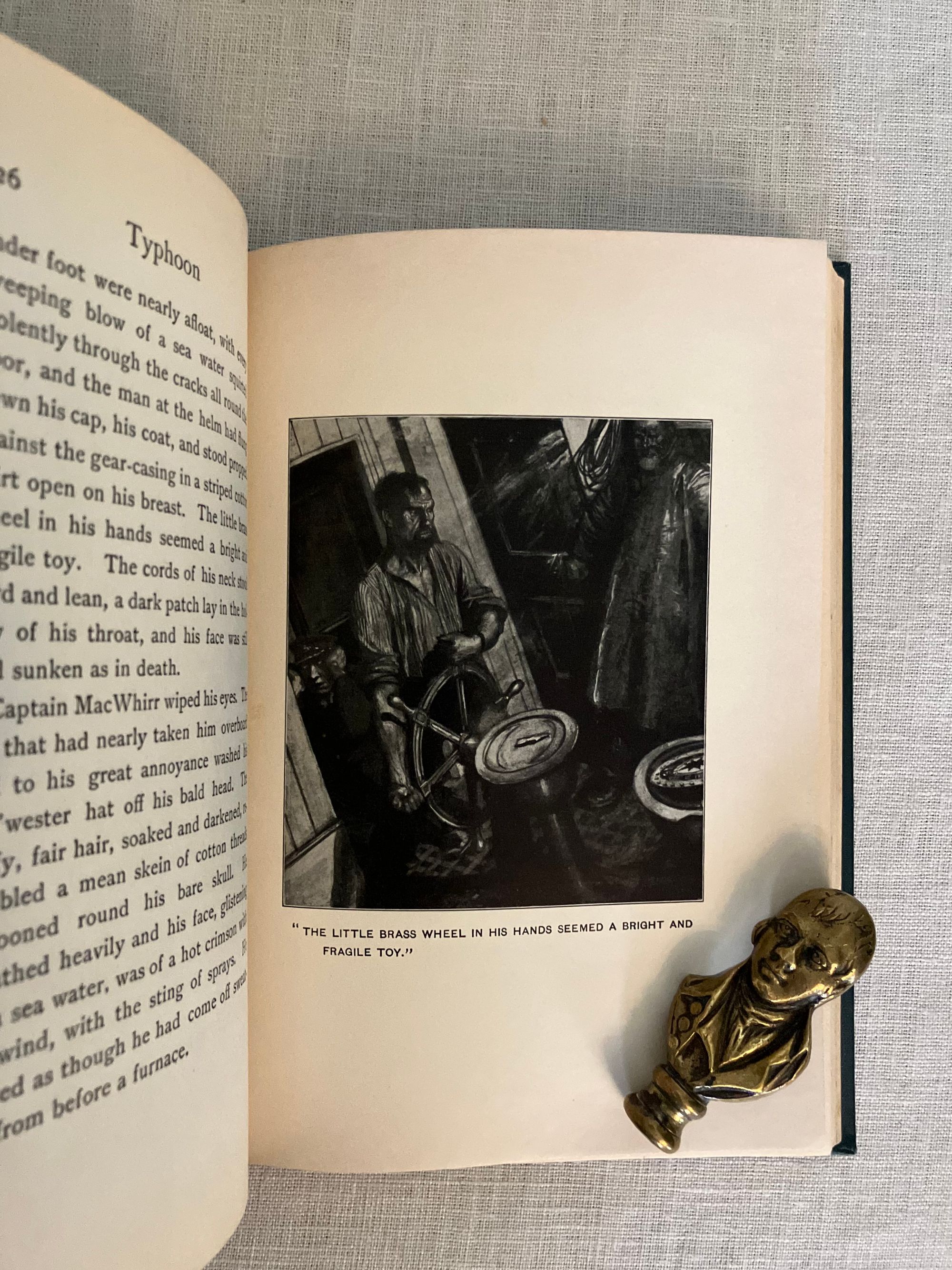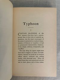 First American Edition, Copyright 1902 by G.P. Putnam's Sons. and published in early September 1902 (see Supino, below.) Hard cover, 16mo, in dark blue green cloth, with the distinctive art deco image of a steam-assisted sailing vessel plying moody, mounting seas at night blocked in black, orange and dark grey. Titles contrast strongly in the orange. Cover art has a "square" monogram signature to the lower right corner. Top edge stained gray. Illustrated with frontispiece and a further 5 black and white illustrations by British Artist Maurice Greiffenhagen R.A.(1862-1931) book illustrator, painter and poster artist.** COLLATION:[2] [i-iv],[frontis and guard], [v], [vi blank], I-205pp., [1], Publisher's advertising section titled"Good Fiction," [4pp.][1].**CONDITION: Very Good. Covers are clean, with perhaps minute wear to tips, ghost of a sticker to rear board. Within, gentle age toning to pages. Both hinges appear to have been reglued. Book is square and tight, with no signs of foxing. Engraved bookplate of former owner to front pastedown. Lacking dust jacket. ** First serialized in Pall Mall Magazine, Jan. - March 1902. This First American Edition does not contain the additional tales contained in the First English Edition. **This classic nautical tale of Capt. McWhirr and the voyage of the Nan-Shan through the roughest China Seas puts the reader right in the eye of the proverbial hurricane, where character and resolve of even the most experienced crew are pitted against nature itself. Moral conundrums arise involving the treatment of the Chinese crew, and the Siamese flagging of what is essentially a British merchant vessel in this powerfully written novel by the Polish-Ukrainian Author Joseph Conrad, writing in his third language, English, which he began learning a mere twenty or so years earlier. Lohf & Sheehy 161. David J. Supino, A8.1.0, p. 94-97 in "Joseph Conrad, A Bibliographical Catalogue of Editions to 1930," (Liverpool Univ. Press, 2022.)