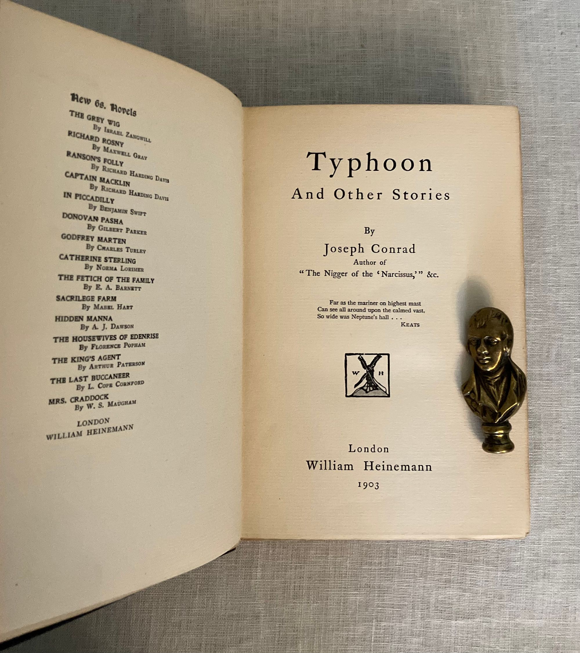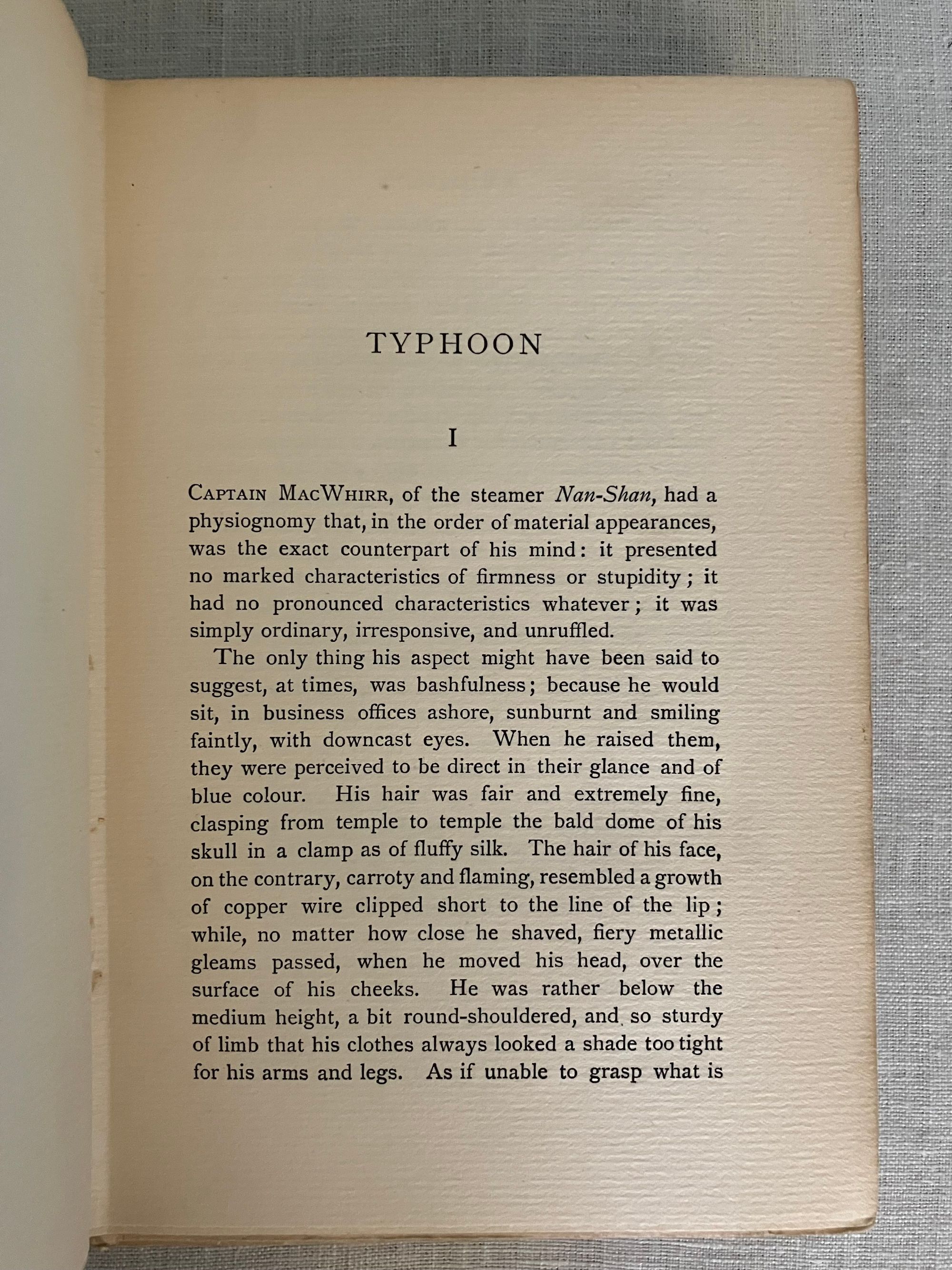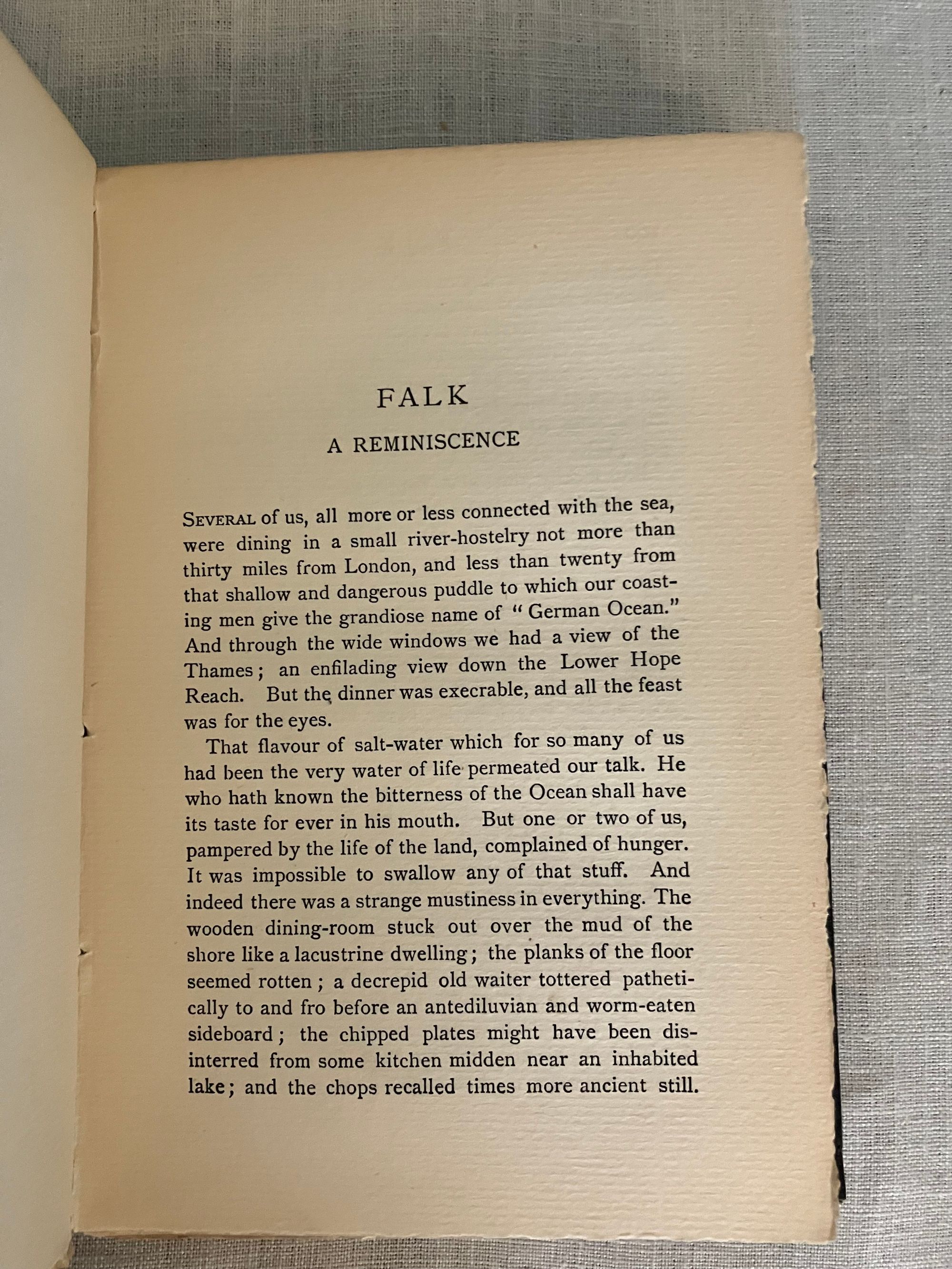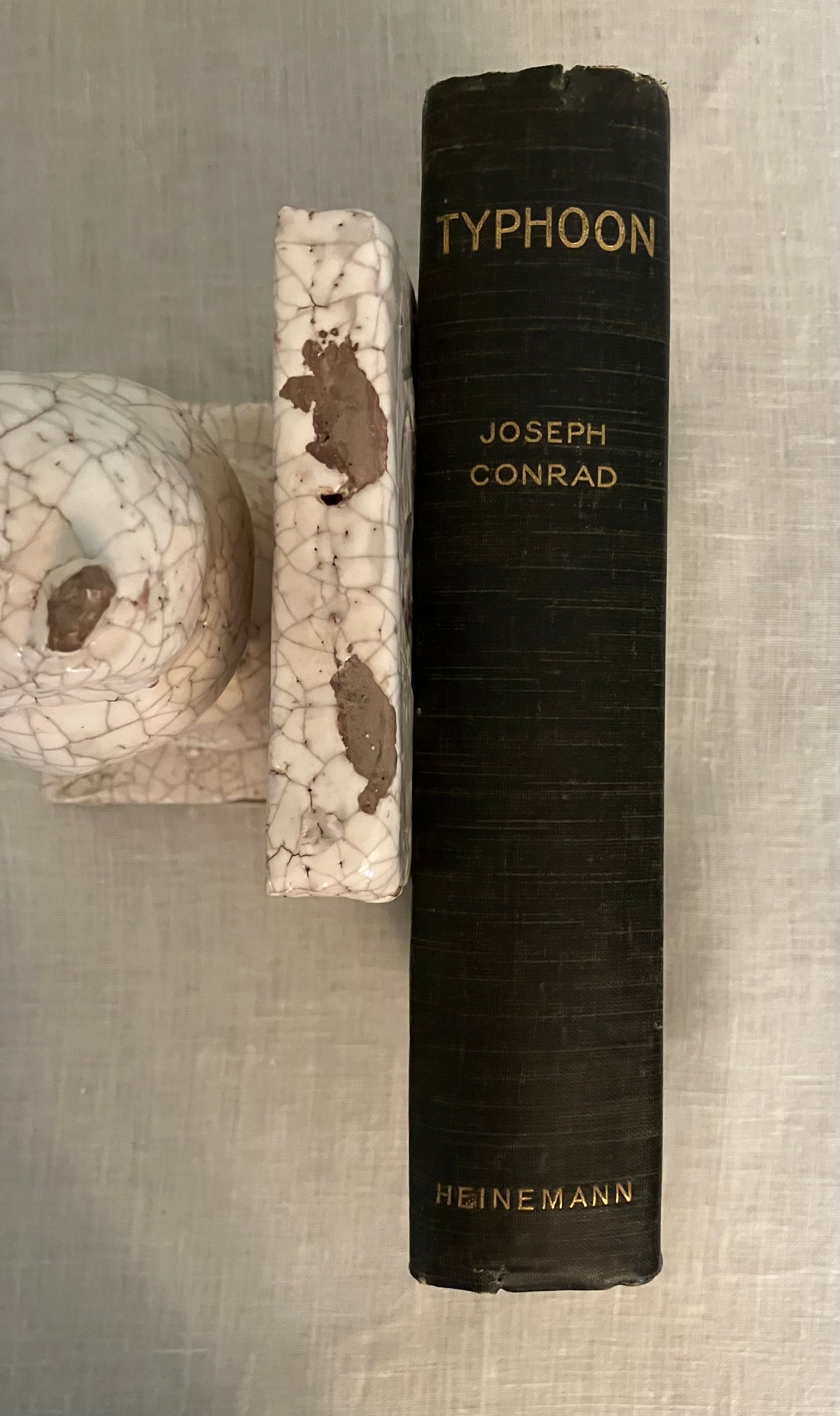 First English Edition, presumed second impression, binding state A. Hardcover, crown 8vo.,( front board 194 mm in height) in the original grey linen -grain cloth, the titles blocked in gold within life-ring vignette frame, to front board. Rear board plain with a circular blind-stamped publisher's initials logo bottom right corner. Printed on heavy laid paper, all edges untrimmed. Page opposite title page lists the publisher's 6-shilling series issues, (not including this volume). Table of contents lists four novellas: "Typhoon," "Amy Foster," "Falk: A Reminiscence," and "To-Morrow." (The first American edition did not include these additional stories.) Printed Ballantyne, Hanson & Co., London & Edinburgh. **Note on the Edition: The presence of the blindstamped publisher's logo on the bottom board is suggestive that this may be an elusive second impression (from 1903) made from 1st impression contents, as the rest of the book complies with Supino's description of the first edition, first impression, binding A variant. **CONDITION: Very Good. A lump in the upper left corner of the top board appears to be a manufacturing defect, and is not so apparent as photo might suggest. Shelfwear to bottom edge, lightly to tips. Spine with 1/8 inch closed tear to cloth at head, and minor abrasion at foot. Rear board with a bit of soiling. Binding is cracked at gathering B, but otherwise holding firm. Moderate age toning to pages. **COLLATION: [2 pp. ads incl. "By the same Author"], [6pp. incl. "New 6 Shilling Novels,"], [2] 3-304pp. [32 pp.Publisher's Advertising, unpaginated]**CONTENTS: "Typhoon," the classic, taut tale of the crew of a merchant steamer on its maiden voyage from the dockyards of Scotland to Fou-Chou, pits man against nature in the most dramatic, elemental fashion as the fury of a massive ocean storm nearly sinks the ship. A study in how an extreme test of endurance brings out the native character of the crew; inhumanity in some, courage in others. Themes of colonialism and racism are also addressed. A great part of the ship's "cargo" consists of Chinese laborers returning from seven-year contracts abroad. (First serialised in Pall Mall Magazine, Jan. - March 1902) "Amy Foster" was first published in the Illustrated London News in 1910, and concerns the distressing sense of alienation felt by the character Yanko Gooral, who upon leaving his economically deprived existence in a central European homeland for a new life in America, is shipwrecked along the Kentish coast of England. He soon meets and falls in love with a young simple countrywoman, but struggles with acceptance by her family and neighbors.** The tale "Falk," is about a Scandinavian tug-boat owner in an Eastern port, who is compelled to tell a young woman he falls in love with of a life-changing past experience. **Polish-Ukrainian born, English emigre merchant navy mariner and novelist Joseph Conrad ( 1857-1924), considered a master of the modern novel. REF: Lohf & Sheehy No. 162 (serialisations) and No. 164. Supino A8.18.0,( p. 110). Watson 398. Scarce edition.