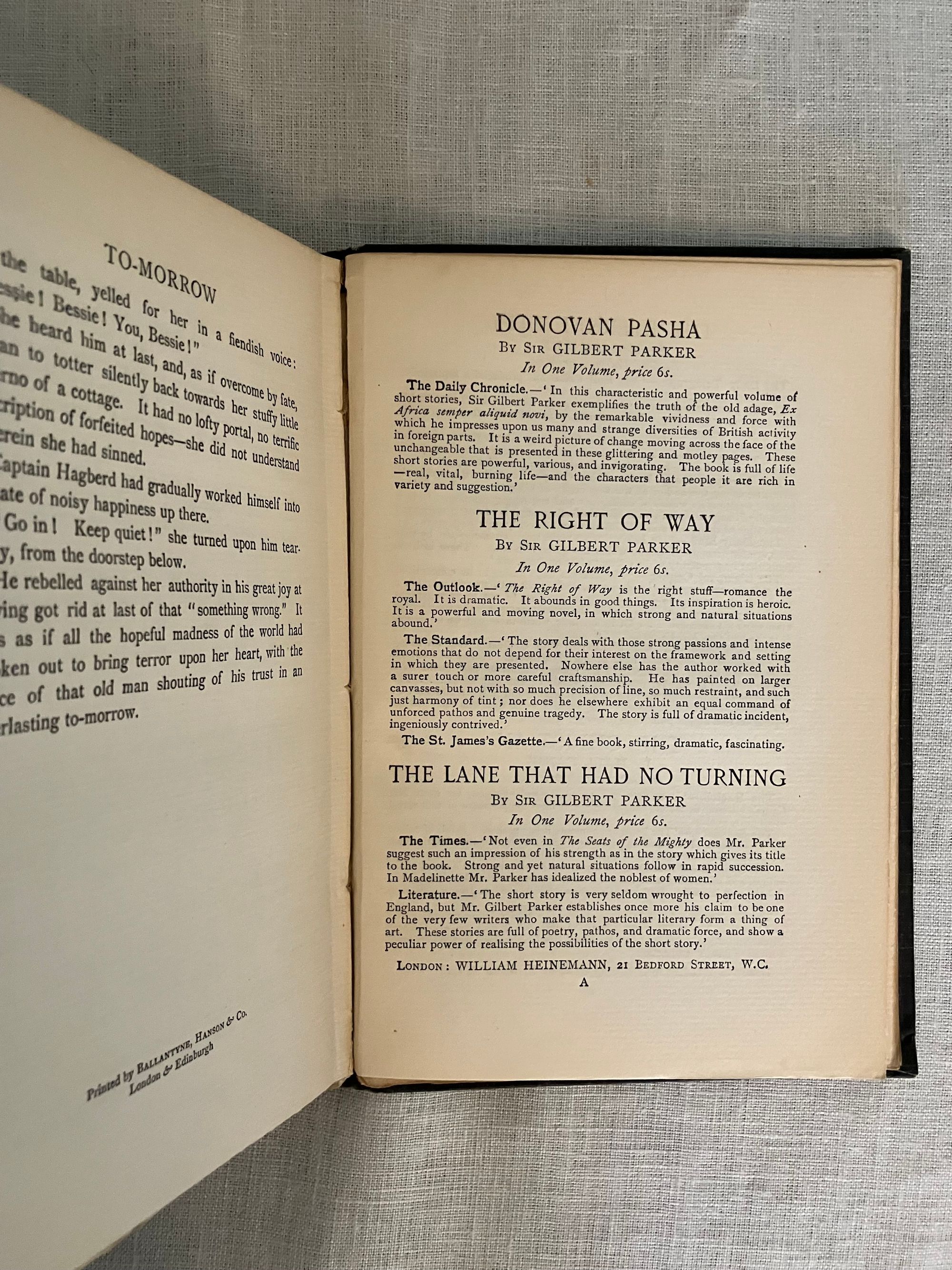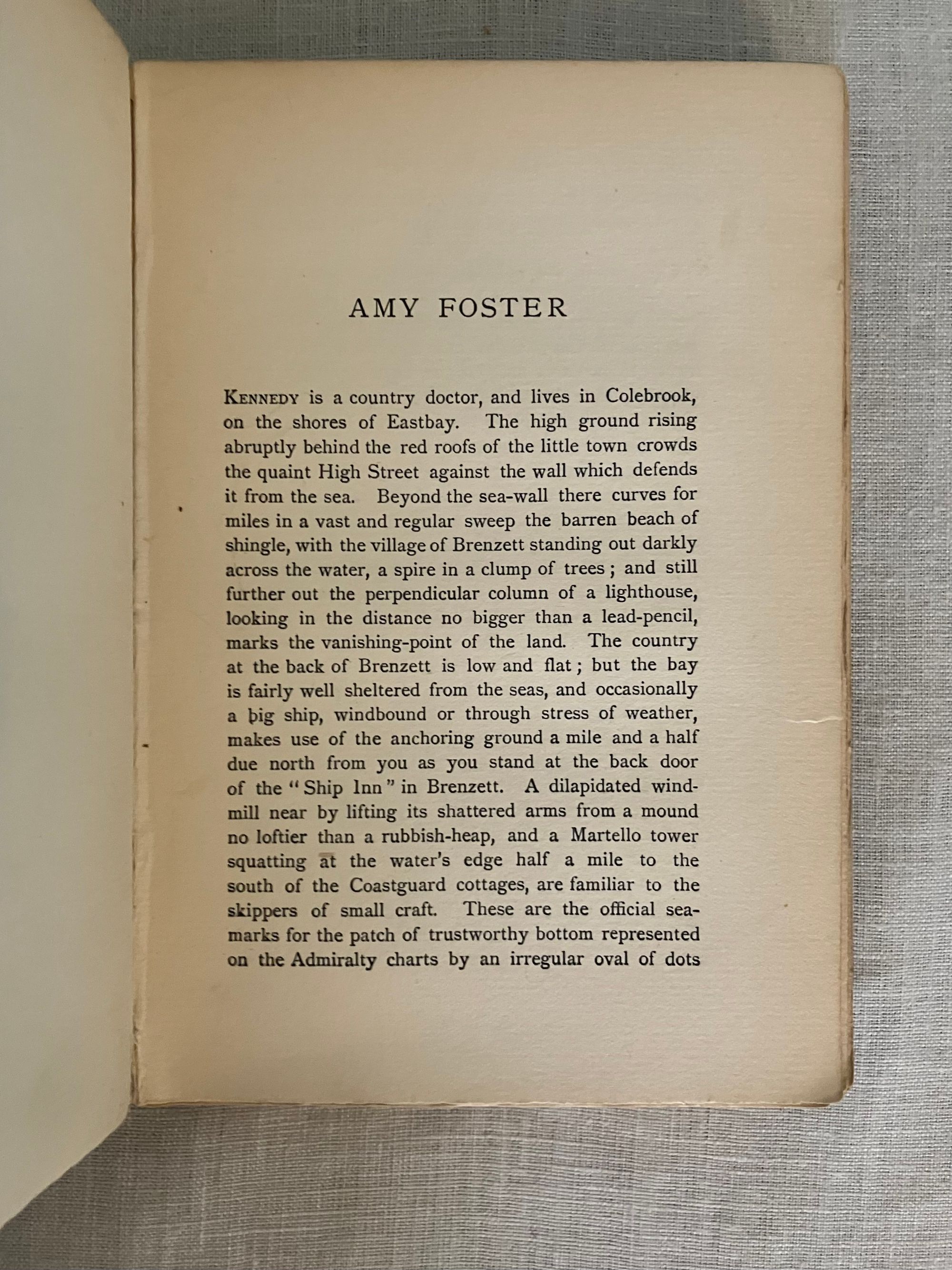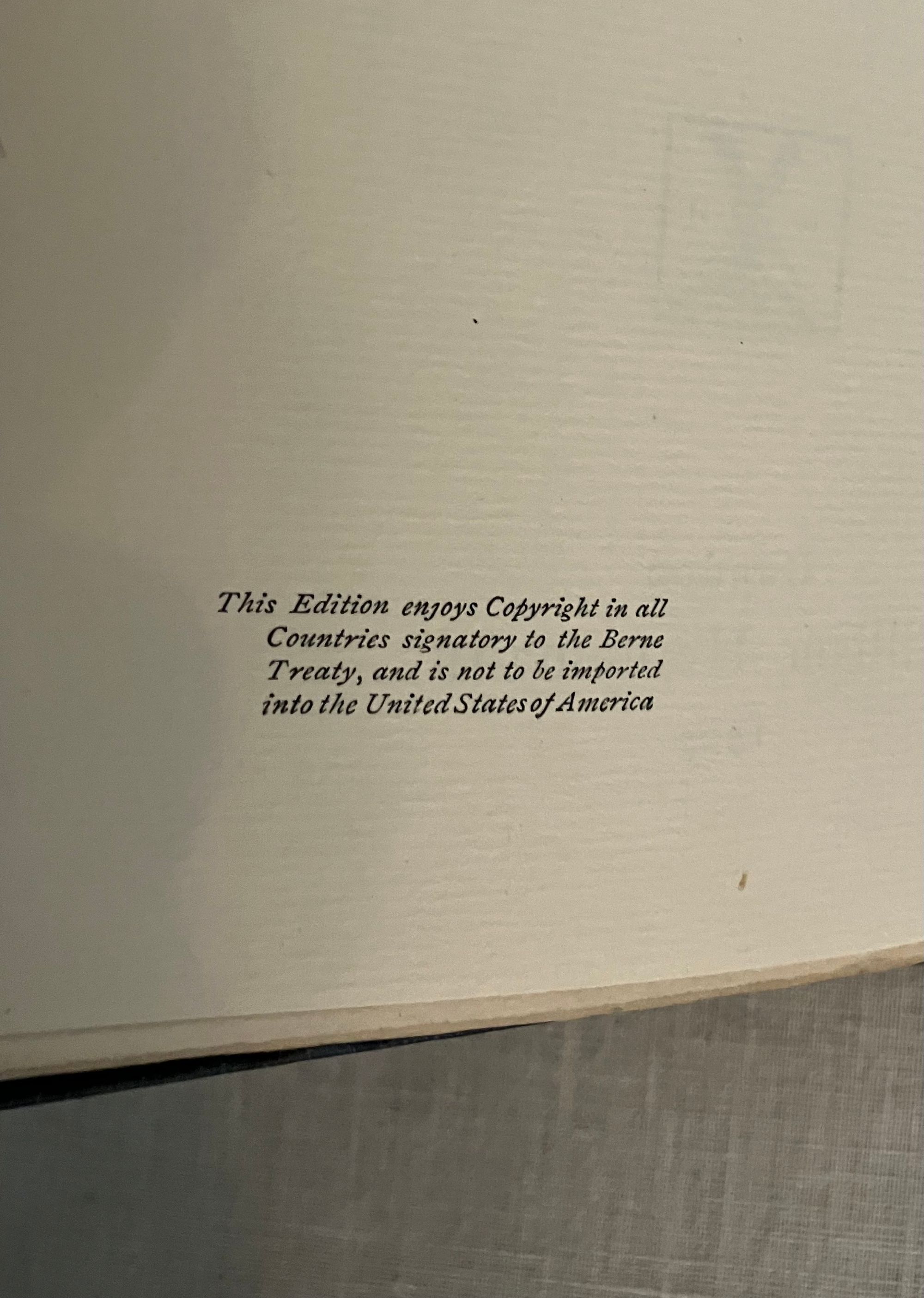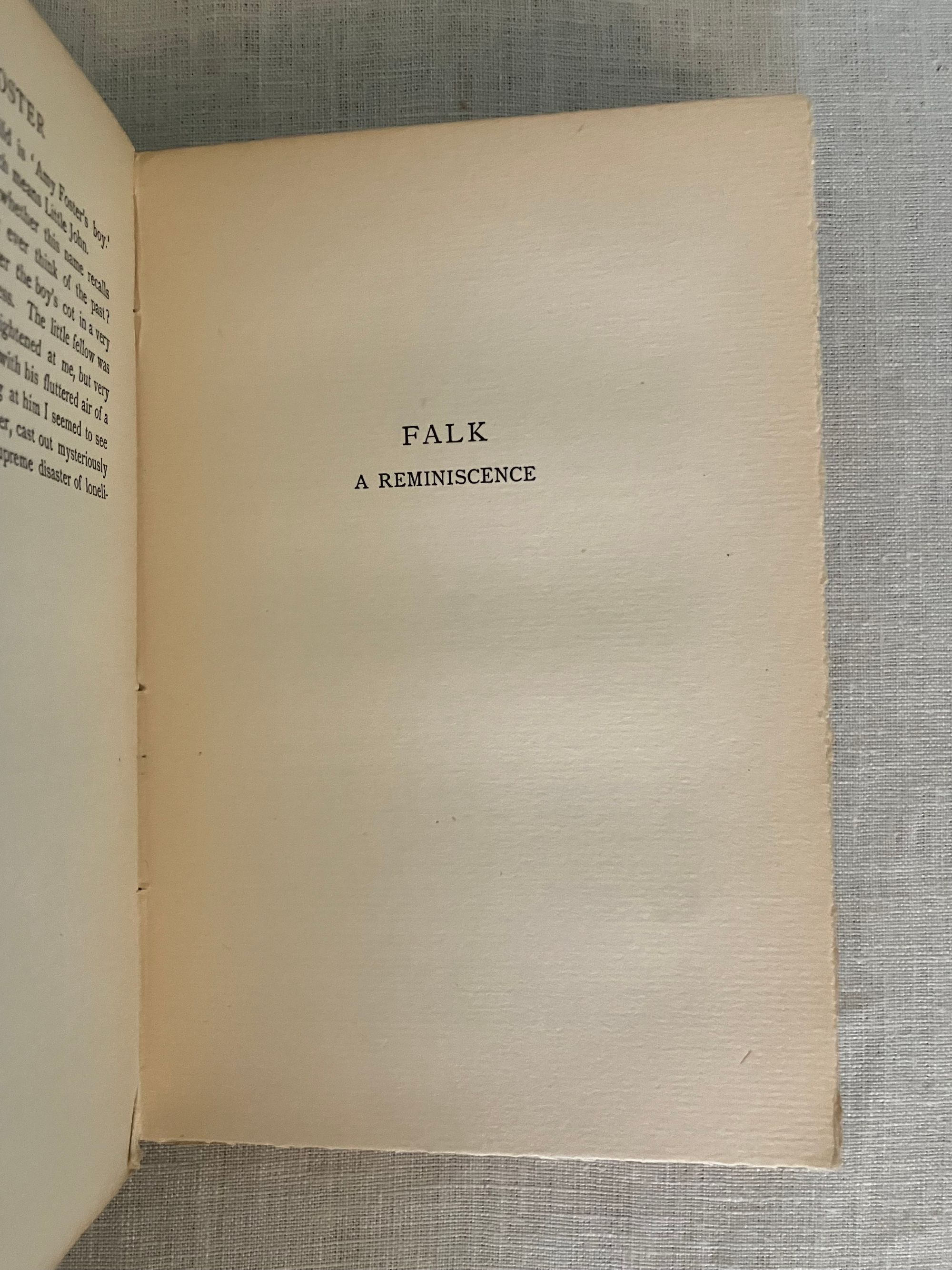 First English Edition, presumed second impression, binding state A. Hardcover, crown 8vo.,( front board 194 mm in height) in the original grey linen -grain cloth, the titles blocked in gold within life-ring vignette frame, to front board. Rear board plain with a circular blind-stamped publisher's initials logo bottom right corner. Printed on heavy laid paper, all edges untrimmed. Page opposite title page lists the publisher's 6-shilling series issues, (not including this volume). Table of contents lists four novellas: "Typhoon," "Amy Foster," "Falk: A Reminiscence," and "To-Morrow." (The first American edition did not include these additional stories.) Printed Ballantyne, Hanson & Co., London & Edinburgh. **Note on the Edition: The presence of the blindstamped publisher's logo on the bottom board is suggestive that this may be an elusive second impression (from 1903) made from 1st impression contents, as the rest of the book complies with Supino's description of the first edition, first impression, binding A variant. **CONDITION: Very Good. A lump in the upper left corner of the top board appears to be a manufacturing defect, and is not so apparent as photo might suggest. Shelfwear to bottom edge, lightly to tips. Spine with 1/8 inch closed tear to cloth at head, and minor abrasion at foot. Rear board with a bit of soiling. Binding is cracked at gathering B, but otherwise holding firm. Moderate age toning to pages. **COLLATION: [2 pp. ads incl. "By the same Author"], [6pp. incl. "New 6 Shilling Novels,"], [2] 3-304pp. [32 pp.Publisher's Advertising, unpaginated]**CONTENTS: "Typhoon," the classic, taut tale of the crew of a merchant steamer on its maiden voyage from the dockyards of Scotland to Fou-Chou, pits man against nature in the most dramatic, elemental fashion as the fury of a massive ocean storm nearly sinks the ship. A study in how an extreme test of endurance brings out the native character of the crew; inhumanity in some, courage in others. Themes of colonialism and racism are also addressed. A great part of the ship's "cargo" consists of Chinese laborers returning from seven-year contracts abroad. (First serialised in Pall Mall Magazine, Jan. - March 1902) "Amy Foster" was first published in the Illustrated London News in 1910, and concerns the distressing sense of alienation felt by the character Yanko Gooral, who upon leaving his economically deprived existence in a central European homeland for a new life in America, is shipwrecked along the Kentish coast of England. He soon meets and falls in love with a young simple countrywoman, but struggles with acceptance by her family and neighbors.** The tale "Falk," is about a Scandinavian tug-boat owner in an Eastern port, who is compelled to tell a young woman he falls in love with of a life-changing past experience. **Polish-Ukrainian born, English emigre merchant navy mariner and novelist Joseph Conrad ( 1857-1924), considered a master of the modern novel. REF: Lohf & Sheehy No. 162 (serialisations) and No. 164. Supino A8.18.0,( p. 110). Watson 398. Scarce edition.