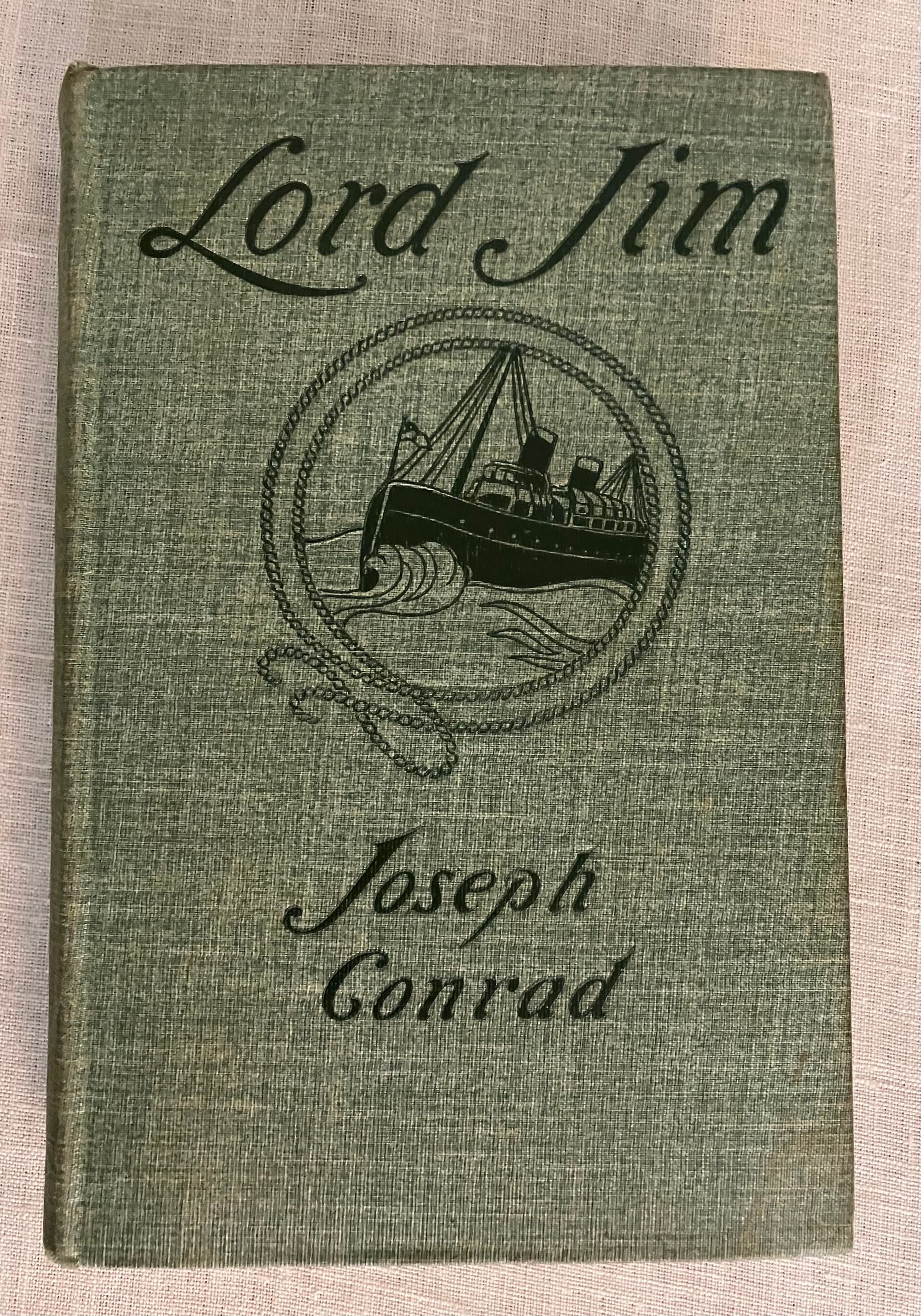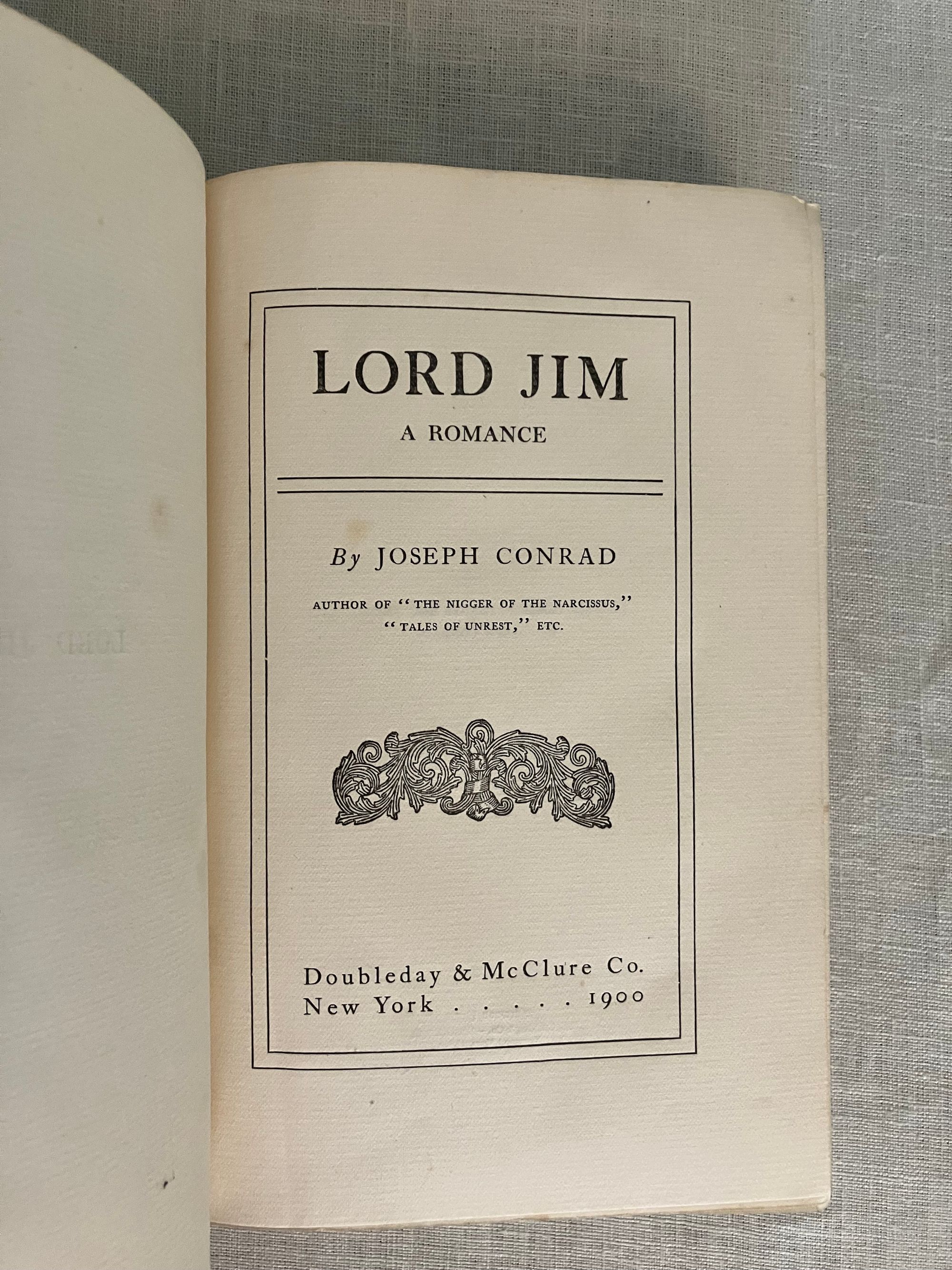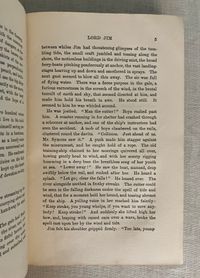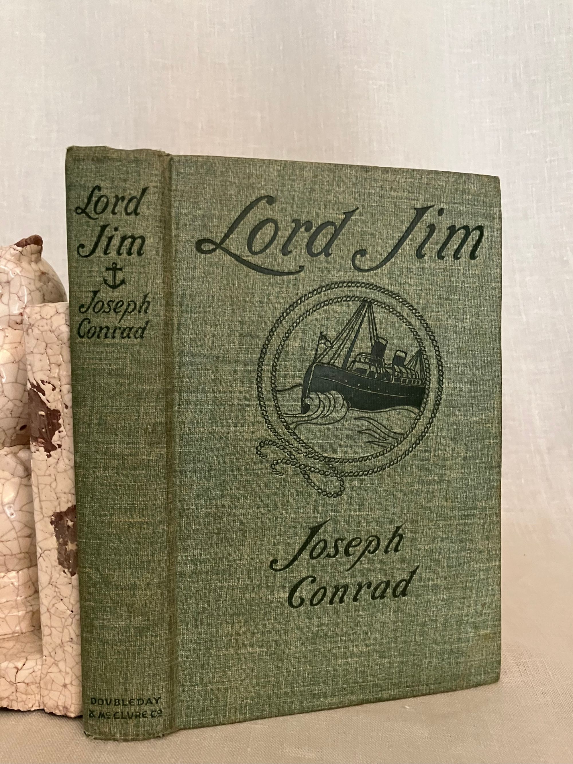 First edition, second impression. Hard cover, 8vo, in light blue-green linen wove cloth, the titles and vignette image of a steamer vessel within a rope frame to the center of front board blocked in darker green. Titles to spine with an vignette anchor in green. All edges trimmed. Copyright page verso t.p. with "1899 and 1900 by Joseph Conrad" with the cancel title/copyright page. Printed at the Norwood Press in Massachusetts. Cream wove end papers, printed upon laid paper, [6], 1-392, [2] pp. *CONDITION: Very Good Slight lean, and minor browning to the endpapers, binding cracked in a couple of places. Otherwise, boards are quite clean, with the head and foot of spine showing crimping and very light abrasion at a couple of joints. Tips and hinges are in order, and pages remain bright, and for the most part unsoiled, and the binding tight. A handsome copy. *CONTENTS: Considered one of the best modern novels, Joseph Conrad's "Lord Jim" was first serialized in Blackwoods Magazine in 1899-1900. The story unfolds gradually with narration from different viewpoints including the storytelling of the recurring Conrad character Captain Marlow. Jim, along with the captain and two others abandons the the SS Patna, carrying 800 pilgrims, when it is believed to be sinking on the way to the port of Aden. The ship is rescued, however, and the deserters face an official inquiry. Jim finds a new career as a tout for a ships' chandler in various eastern ports, but cannot outrun his notoriety. Marlow and a friend intervene, providing the unhappy Jim a new chance to redeem himself. Complex action of the second part of the novel sees Jim as factor and protector to the people of the fictional remote indonesian village of Patusan. REF: D. Supino A5.11.0 (second state). The copyright statement as described above defines the second state (see Supino p. 70).