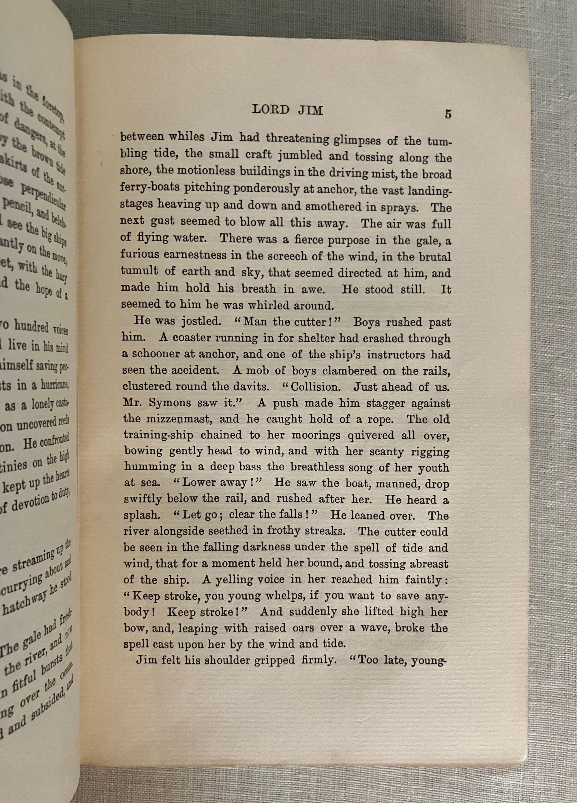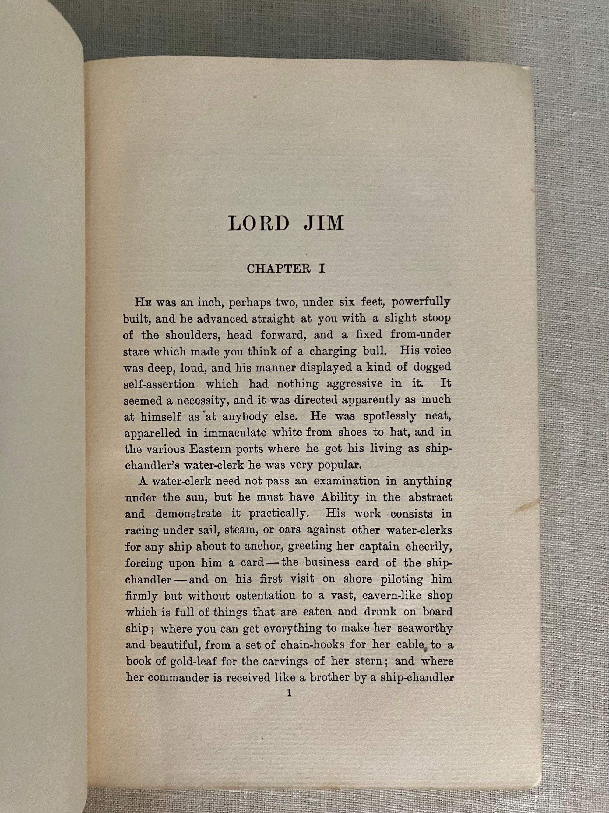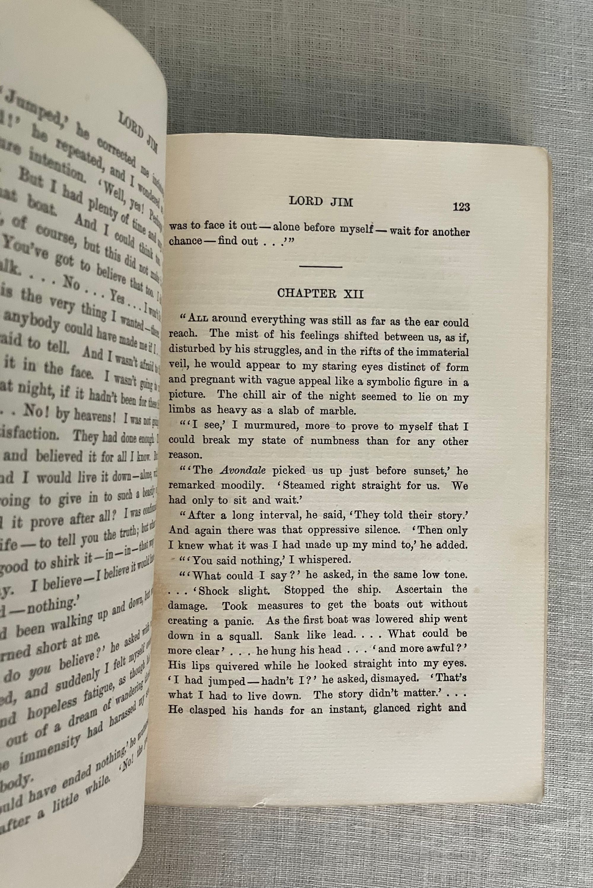 First edition, second impression. Hard cover, 8vo, in light blue-green linen wove cloth, the titles and vignette image of a steamer vessel within a rope frame to the center of front board blocked in darker green. Titles to spine with an vignette anchor in green. All edges trimmed. Copyright page verso t.p. with "1899 and 1900 by Joseph Conrad" with the cancel title/copyright page. Printed at the Norwood Press in Massachusetts. Cream wove end papers, printed upon laid paper, [6], 1-392, [2] pp. *CONDITION: Very Good Slight lean, and minor browning to the endpapers, binding cracked in a couple of places. Otherwise, boards are quite clean, with the head and foot of spine showing crimping and very light abrasion at a couple of joints. Tips and hinges are in order, and pages remain bright, and for the most part unsoiled, and the binding tight. A handsome copy. *CONTENTS: Considered one of the best modern novels, Joseph Conrad's "Lord Jim" was first serialized in Blackwoods Magazine in 1899-1900. The story unfolds gradually with narration from different viewpoints including the storytelling of the recurring Conrad character Captain Marlow. Jim, along with the captain and two others abandons the the SS Patna, carrying 800 pilgrims, when it is believed to be sinking on the way to the port of Aden. The ship is rescued, however, and the deserters face an official inquiry. Jim finds a new career as a tout for a ships' chandler in various eastern ports, but cannot outrun his notoriety. Marlow and a friend intervene, providing the unhappy Jim a new chance to redeem himself. Complex action of the second part of the novel sees Jim as factor and protector to the people of the fictional remote indonesian village of Patusan. REF: D. Supino A5.11.0 (second state). The copyright statement as described above defines the second state (see Supino p. 70).