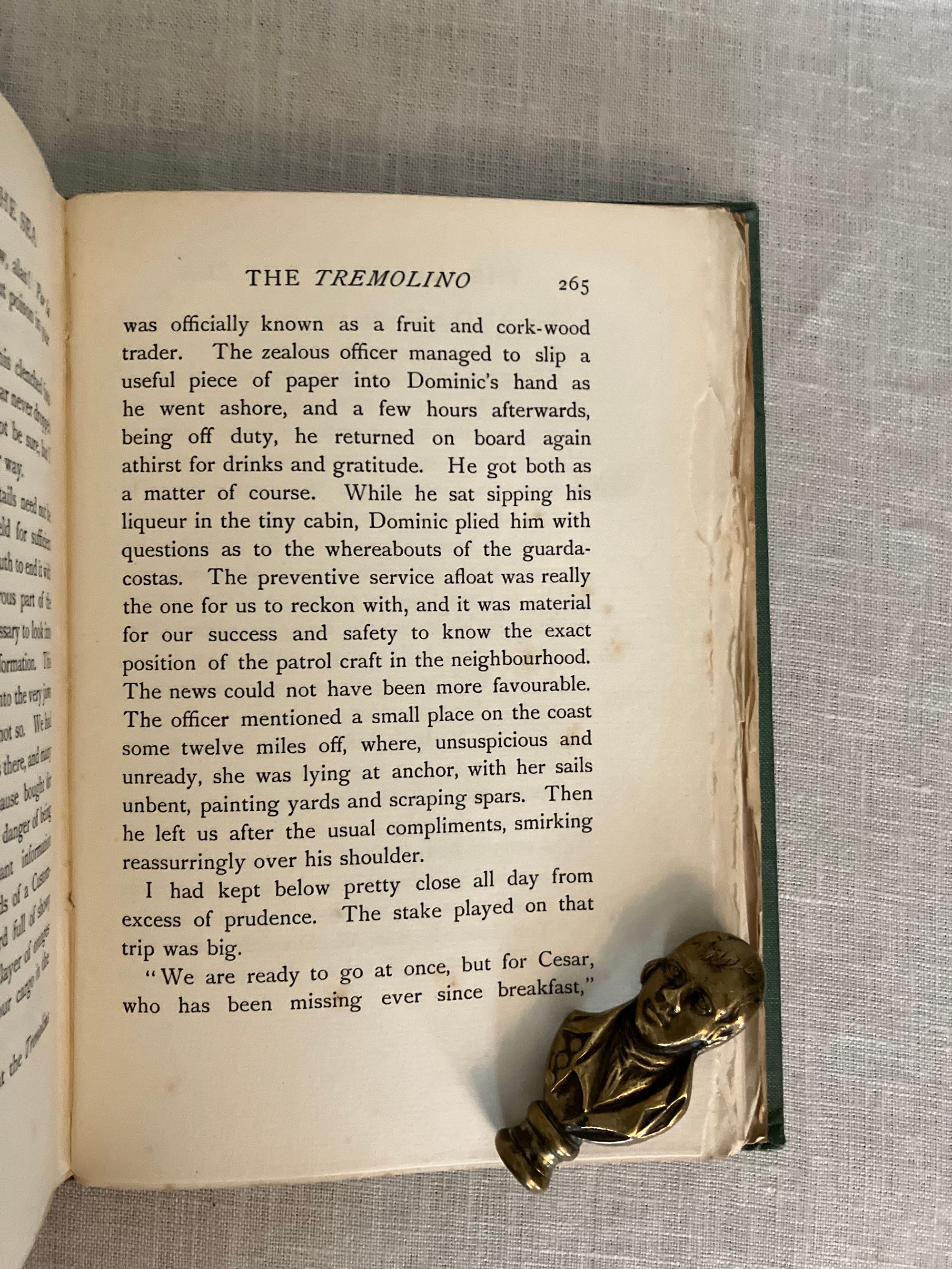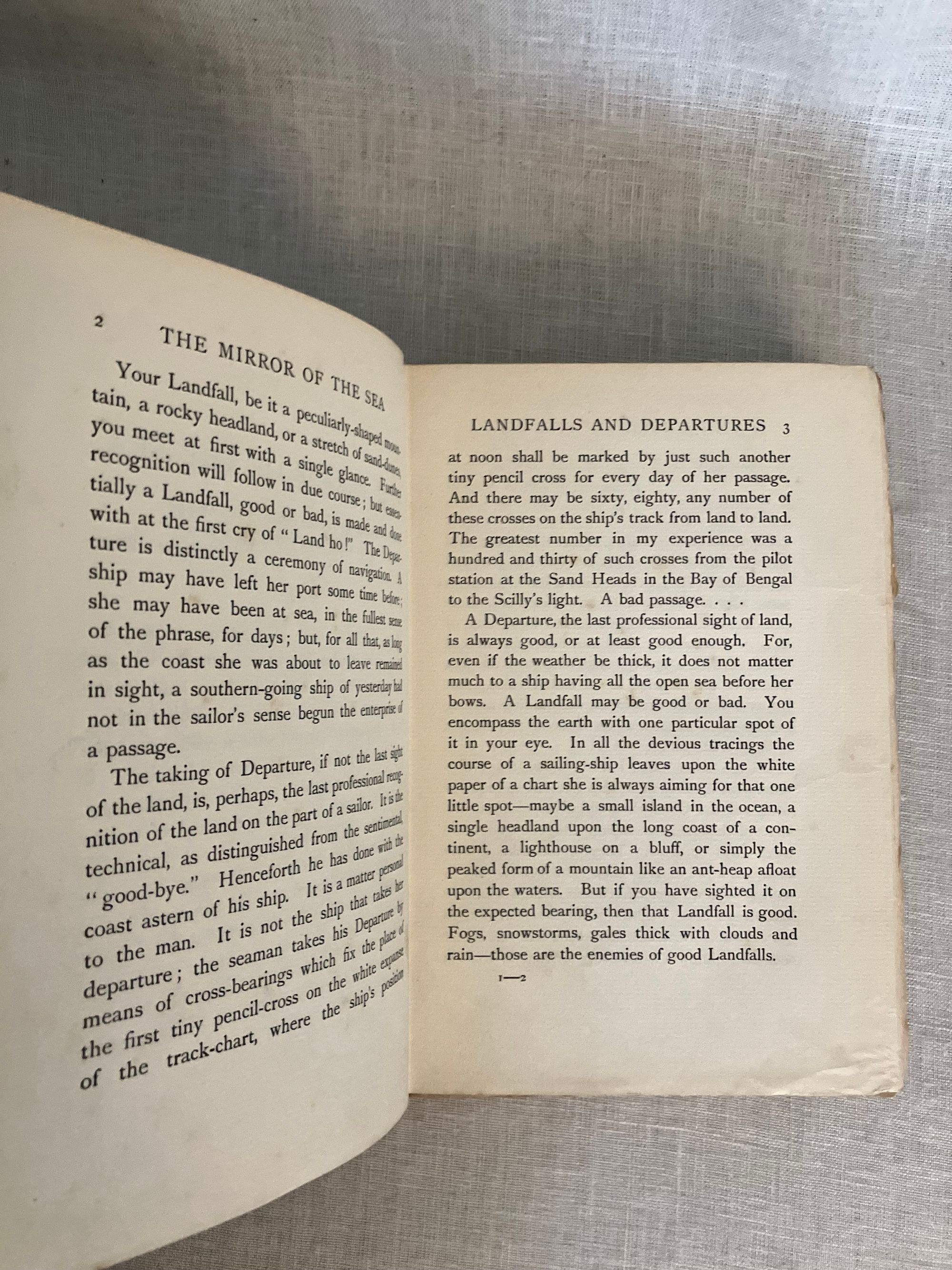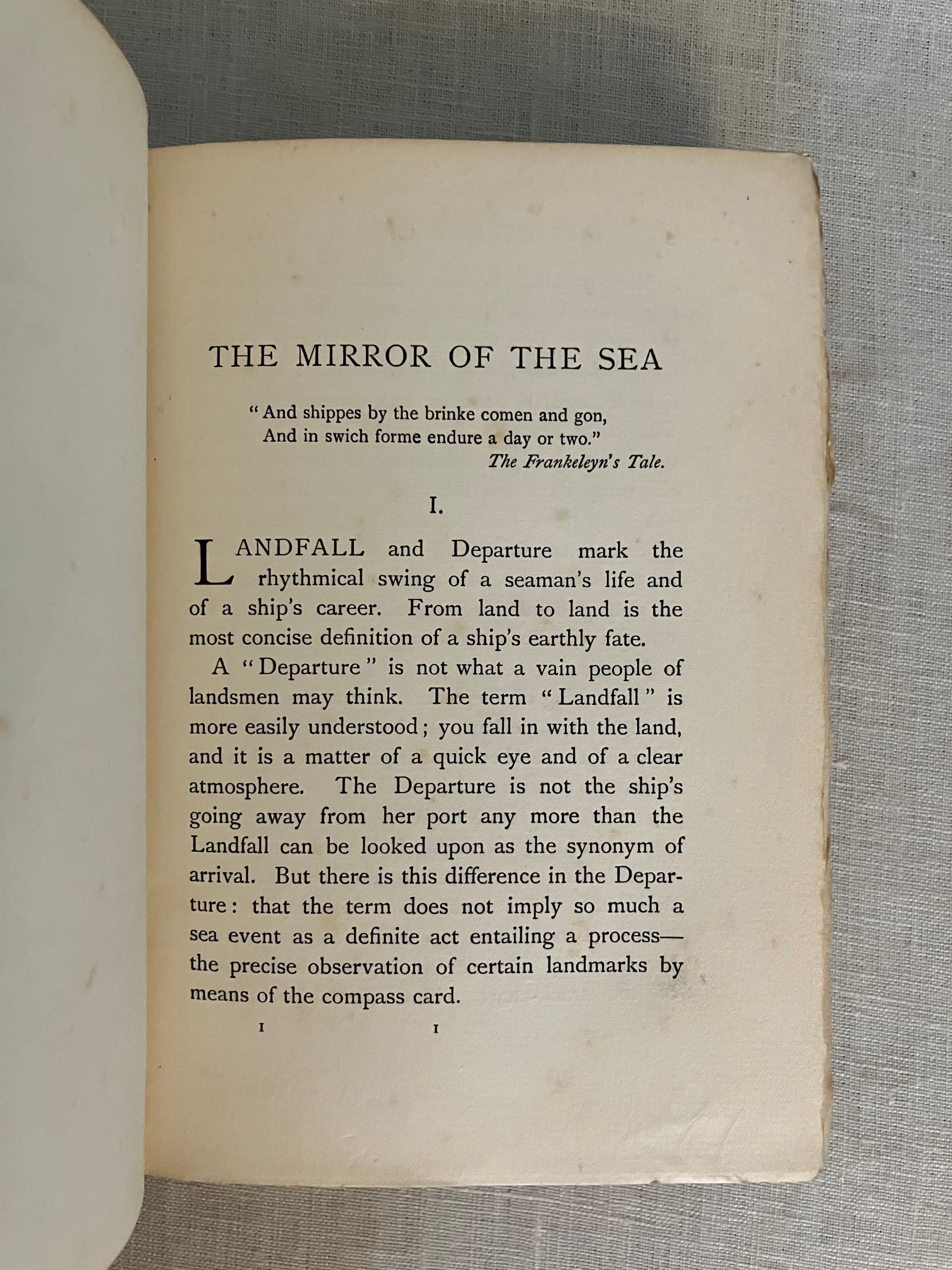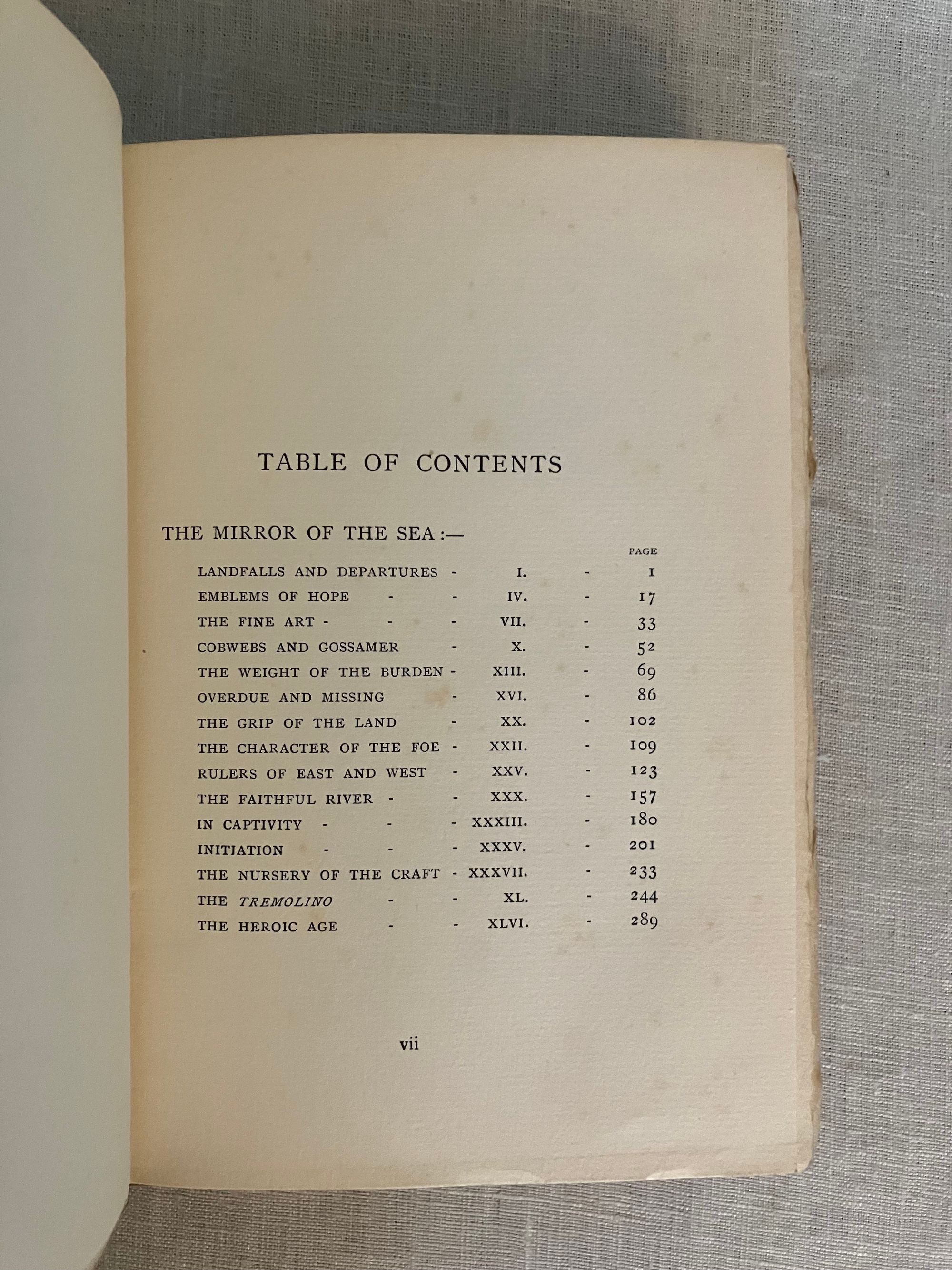 First English Edition, first impression, 1 of 1500 copies. Hard cover 12mo, in green linen wove cloth with titles, shell and coral vignette motifs blocked to the spine in gold, the publisher's name appearing at the foot as "METHVEN." Top edge gilt, other edges untrimmed and printed. upon heavy laid paper. Printed by Billing and Sons Ltd., Guildford. "By the Same Author" opposite title page. Title page in red and black. Copyright reading "First published in 1906." COLLATION: [i-vi], vii, [viii], 1-306pp., [1] 40pp. paginated "Messrs. Methuen & Sons" catalogue bound in at rear, dated August 1906. The Table of Contents lists 15 chapters, the 49 sections of which Keating says are abstracted from prior-serialized material from the Author's memoirs of his life at sea, some appearing in the Pall Mall Magazine Jan.- June 1905.**CONDITION: Very Good. Hinges just starting but holding firmly, light foxing to endpapers, two lightly bumped corners, and head of spine may have two repairs. Some small marks to boards. Still, overall a nice copy with no inscriptions and mildly toned pages in a square and tight binding. Keating says the untrimmed state is scarce, as "the greater part of the edition having been issued with trimmed edges." (Keating p. 153) REFS: Lohf and Sheehy 53. Keating 67. Supino A11.1.0. ( p. 139.)