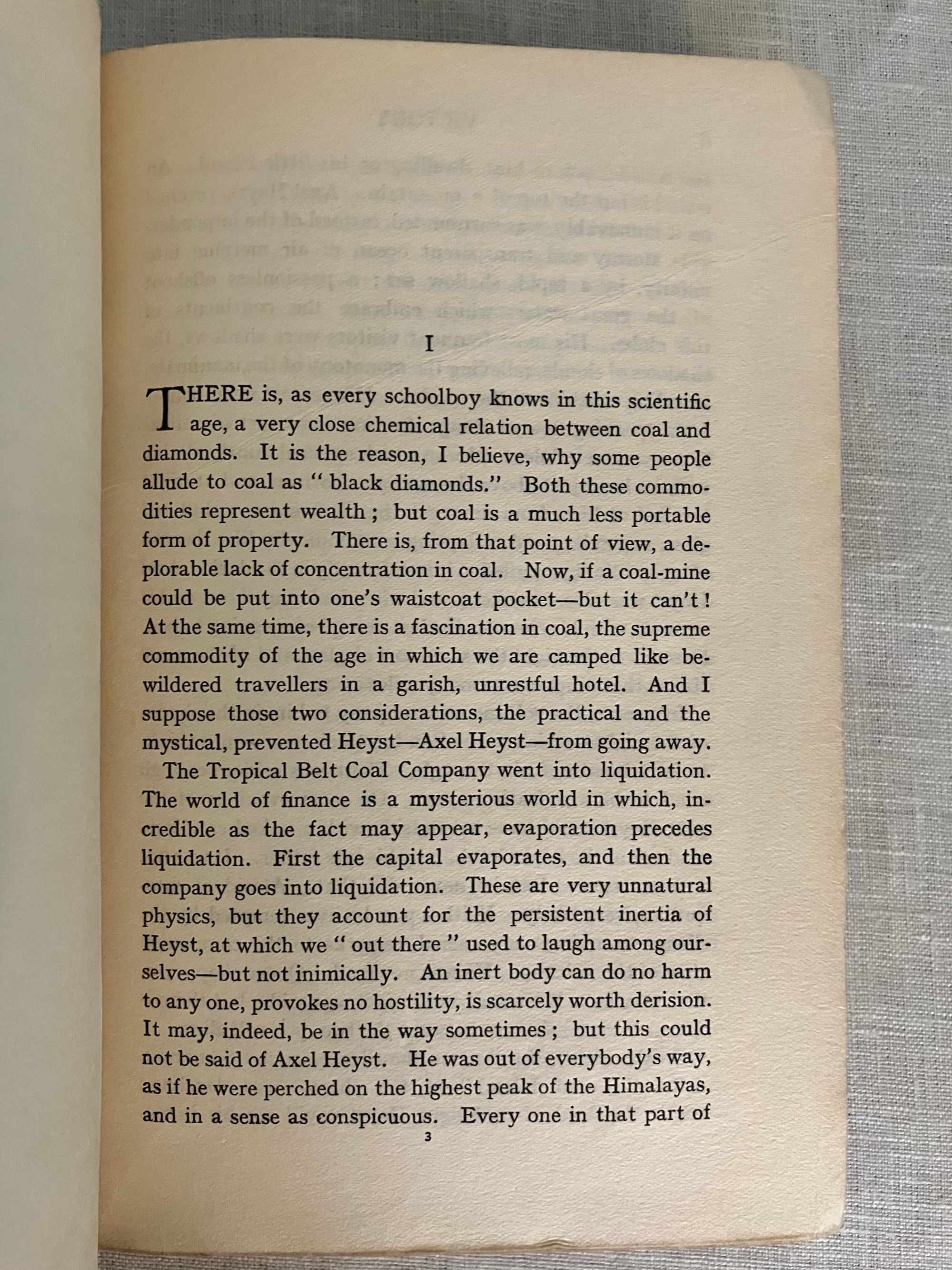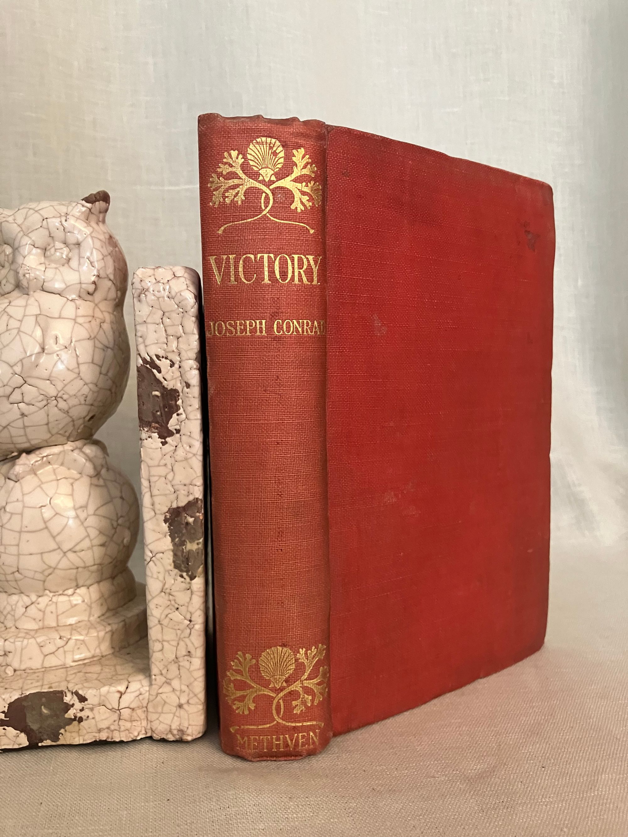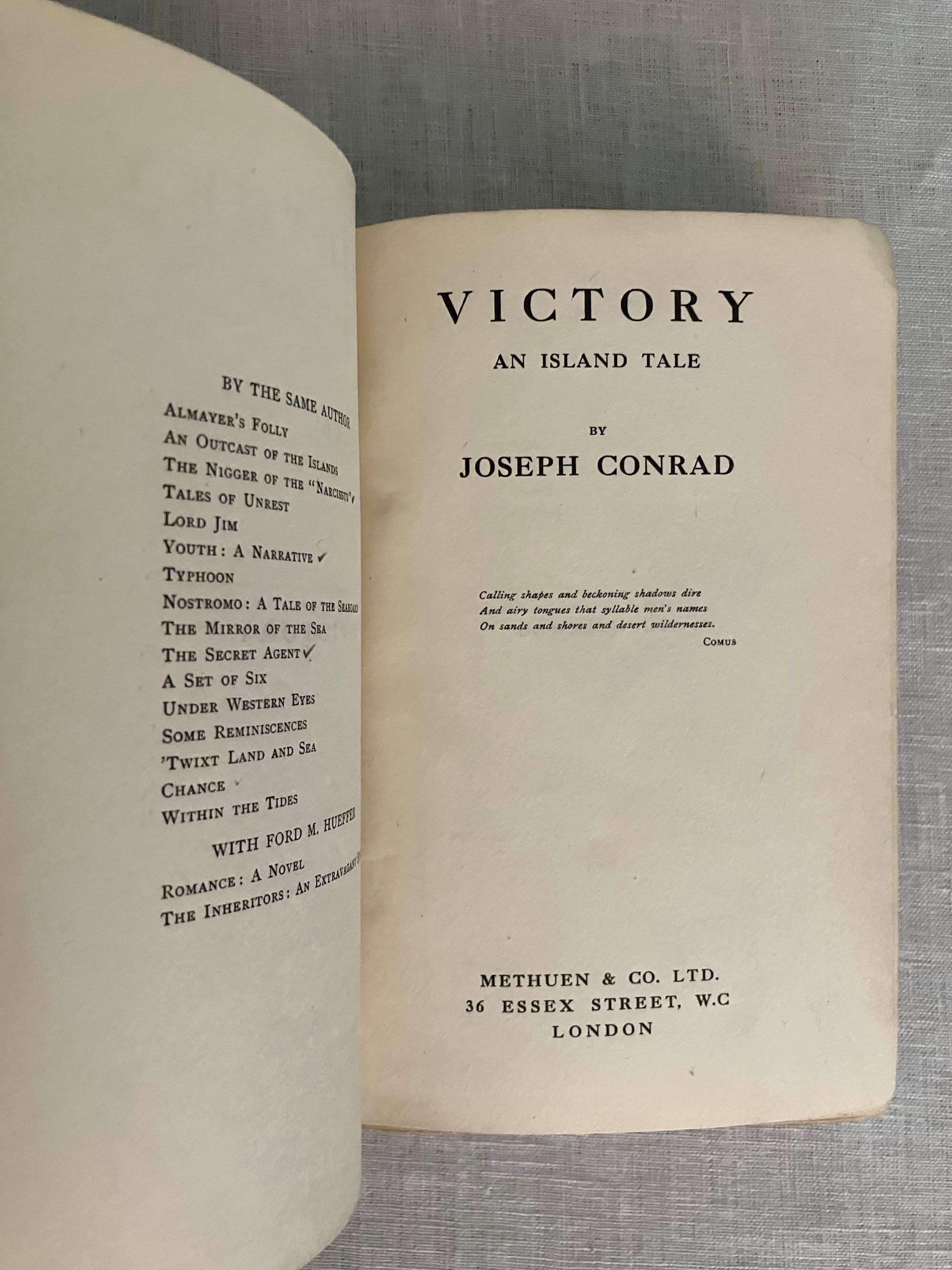First English Edition, first impression. Hard cover, 12mo, in red linen wove cloth, the spine with titles and vignette decoration of coral and shells block in gold. Copyright statement : "First published in 1915." First issue, with comma after Essex Street on t.p. Plain cream wove endpapers, edges trimmed, top edge stained. Has list of 16 works by Conrad, and two with Hueffer,opposite title page.**COLLATION: [i-vi], Author's Note vii-viii, 1,[2], 3- 415pp [1 imprint of Morrison & Gibb, Edinburgh], 4pp. unpaginated catalogue: "Methuen's Popular Novels," dated Autumn 1915, plus: "A Selection of Books Published by Methuen & Co. Ltd. etc." 31pp. paginated, [1].**CONDITION: Very Good Minus. Lacking dust jacket. Some soiling to covers, moderately toned pages. The spine shows no appreciable wear, however. Hinges each have an inch or so crack but the volume is holding firmly. Remains of a sticker to rear pastedown. Still, a rare edition, which because of its popularity, sold out on the date of publication, according to D. Supino, N p. 262. Now in mylar. **Written in 1914, before the start of World War One, when this volume was eventually released in Britain on September 24, 1915, having been postponed because of the hostilities, the Author included a "Note" which is found here (and does not appear in the earlier American First Edition published six months prior.)**This novel, set in the Dutch port of Surabaya on Java, tells the story of Axel Heyst, an otherwise disaffected Swede, who eventually goes into business with a Capt. Morrison upon doing the generous yet impecunious man a small favor. They found the Tropical Belt Coal Company. Heyst remains a hermit on the island once the mine has failed, but he is urged into action by the mistreatment of Lena, a young woman who plays in a dinner orchestra at the unsavory Schomberg's hotel. A hidden treasure, and the greed it awakes in the motives of those around them, leads to unforeseen consequences for the two lovers.REFS: Lohf and Sheehy 174. Keating 115 edition only. D. Supino A.19.7.0. pp. 259-262.