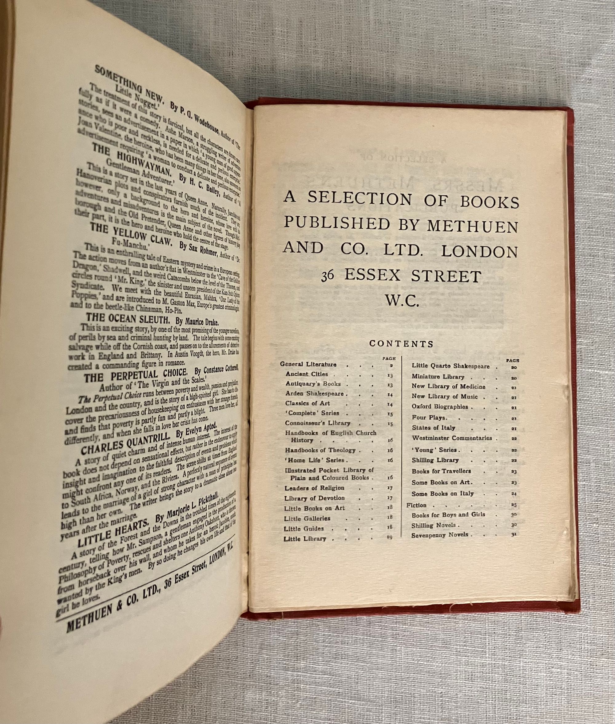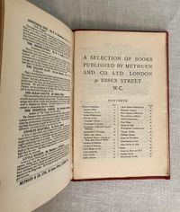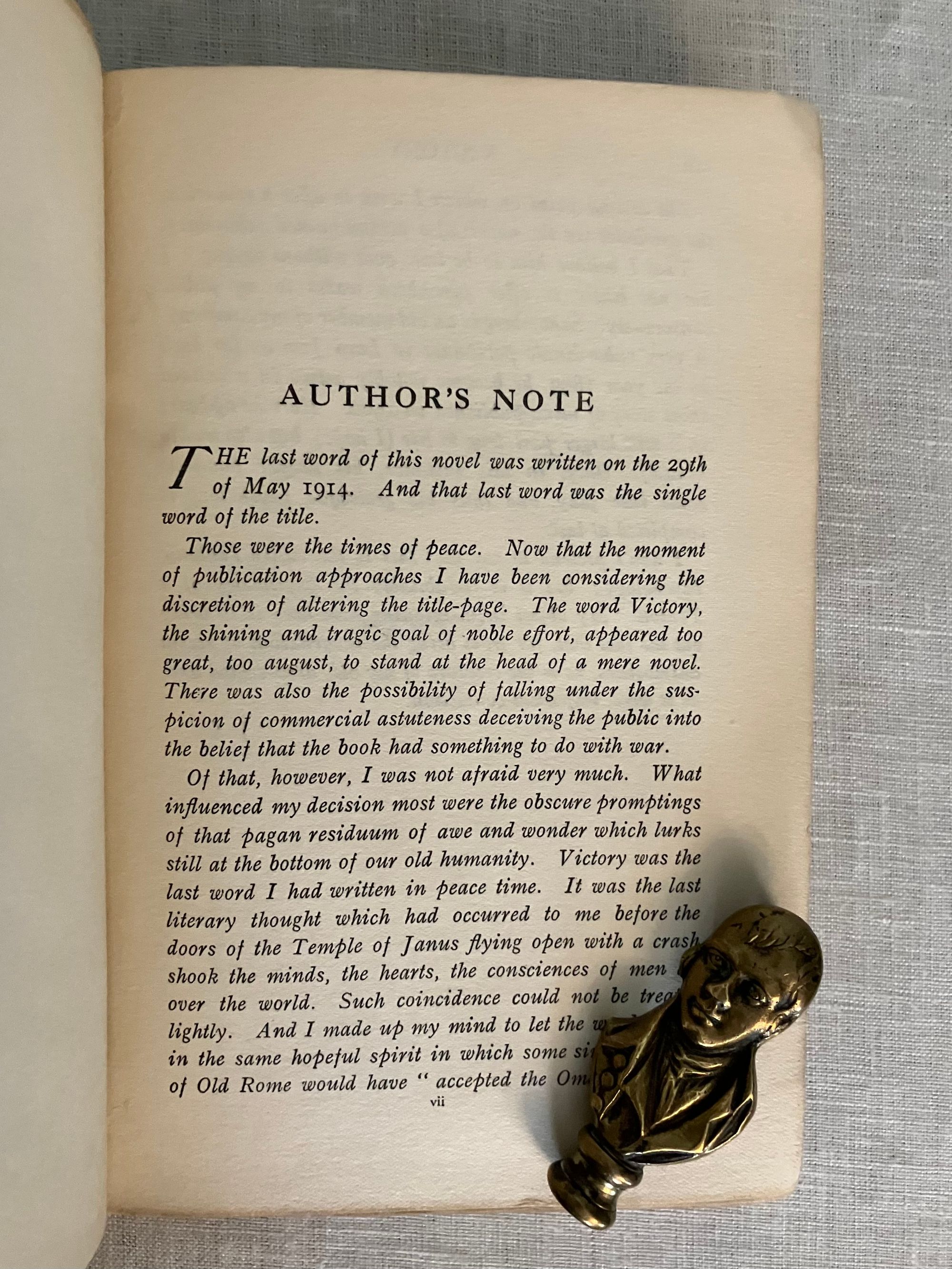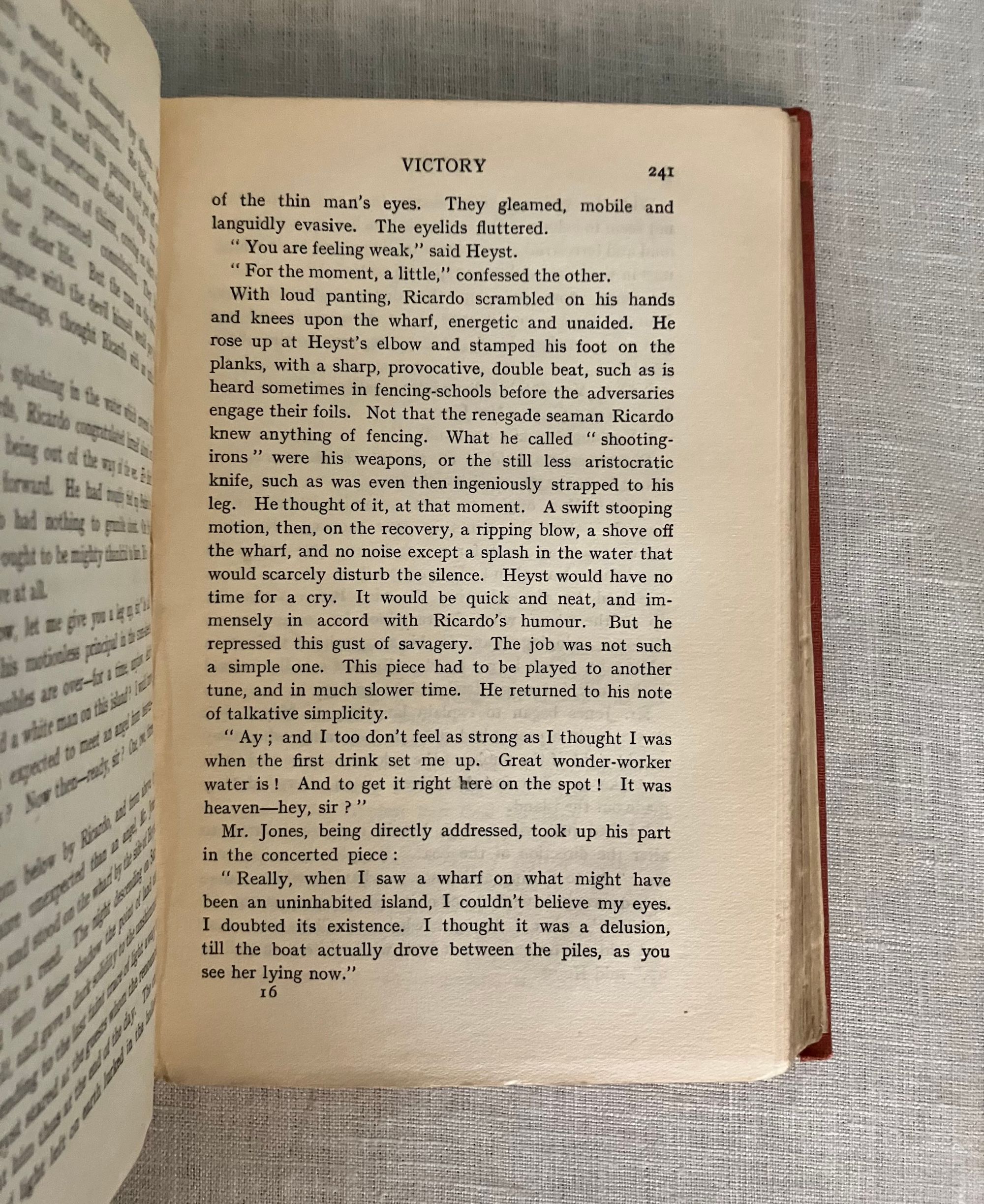 First English Edition, first impression. Hard cover, 12mo, in red linen wove cloth, the spine with titles and vignette decoration of coral and shells block in gold. Copyright statement : "First published in 1915." First issue, with comma after Essex Street on t.p. Plain cream wove endpapers, edges trimmed, top edge stained. Has list of 16 works by Conrad, and two with Hueffer,opposite title page.**COLLATION: [i-vi], Author's Note vii-viii, 1,[2], 3- 415pp [1 imprint of Morrison & Gibb, Edinburgh], 4pp. unpaginated catalogue: "Methuen's Popular Novels," dated Autumn 1915, plus: "A Selection of Books Published by Methuen & Co. Ltd. etc." 31pp. paginated, [1].**CONDITION: Very Good Minus. Lacking dust jacket. Some soiling to covers, moderately toned pages. The spine shows no appreciable wear, however. Hinges each have an inch or so crack but the volume is holding firmly. Remains of a sticker to rear pastedown. Still, a rare edition, which because of its popularity, sold out on the date of publication, according to D. Supino, N p. 262. Now in mylar. **Written in 1914, before the start of World War One, when this volume was eventually released in Britain on September 24, 1915, having been postponed because of the hostilities, the Author included a "Note" which is found here (and does not appear in the earlier American First Edition published six months prior.)**This novel, set in the Dutch port of Surabaya on Java, tells the story of Axel Heyst, an otherwise disaffected Swede, who eventually goes into business with a Capt. Morrison upon doing the generous yet impecunious man a small favor. They found the Tropical Belt Coal Company. Heyst remains a hermit on the island once the mine has failed, but he is urged into action by the mistreatment of Lena, a young woman who plays in a dinner orchestra at the unsavory Schomberg's hotel. A hidden treasure, and the greed it awakes in the motives of those around them, leads to unforeseen consequences for the two lovers.REFS: Lohf and Sheehy 174. Keating 115 edition only. D. Supino A.19.7.0. pp. 259-262.