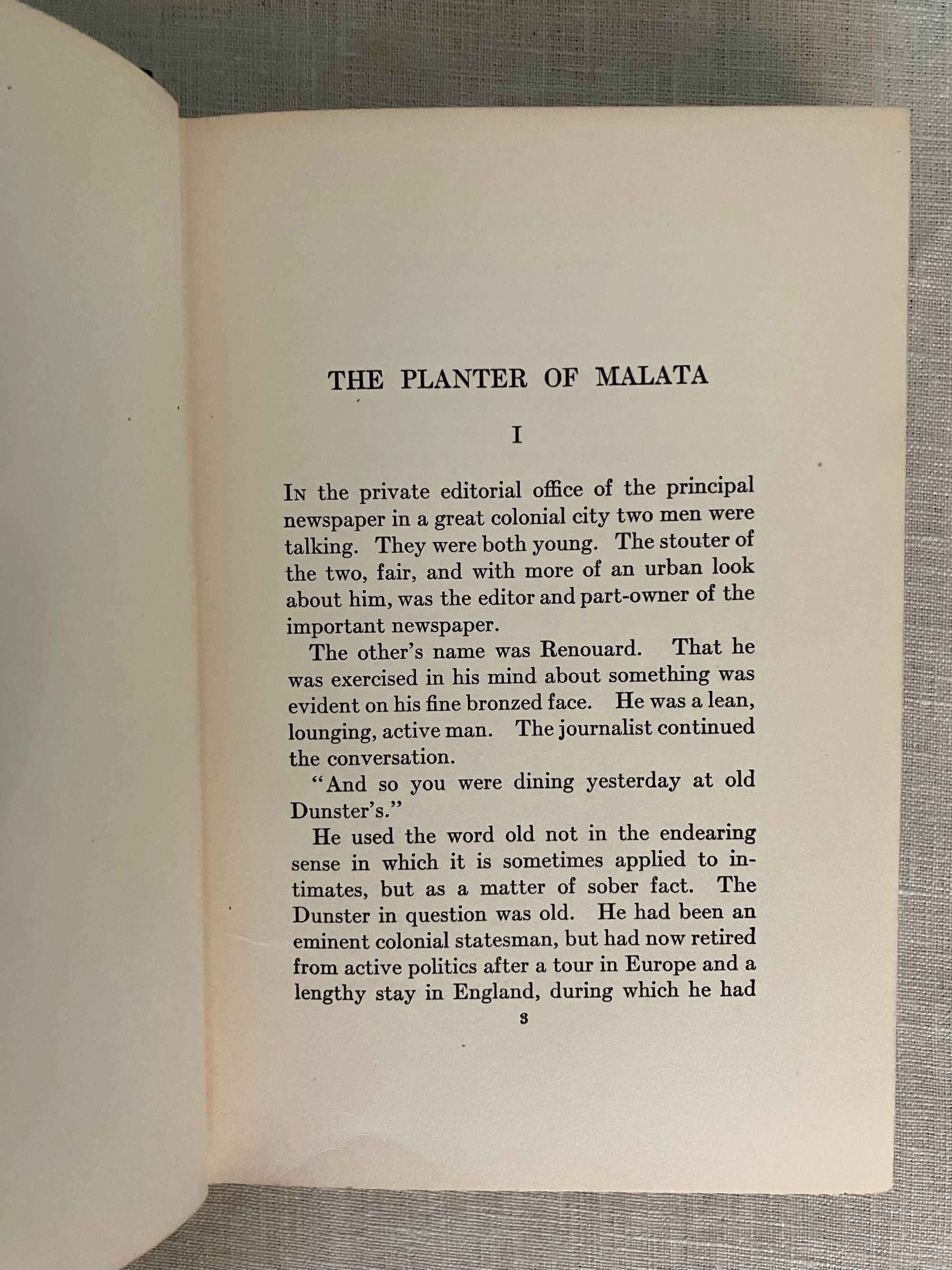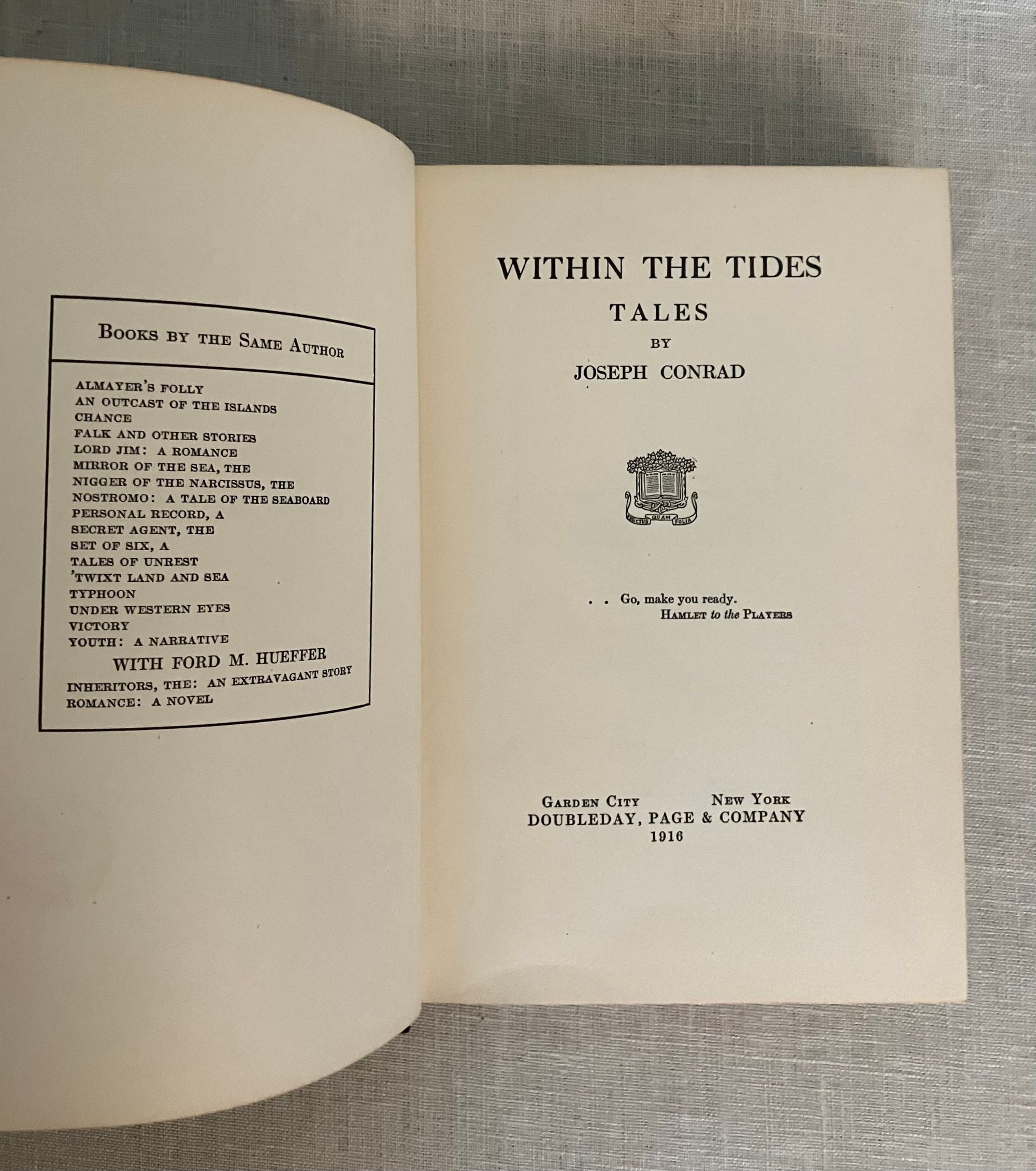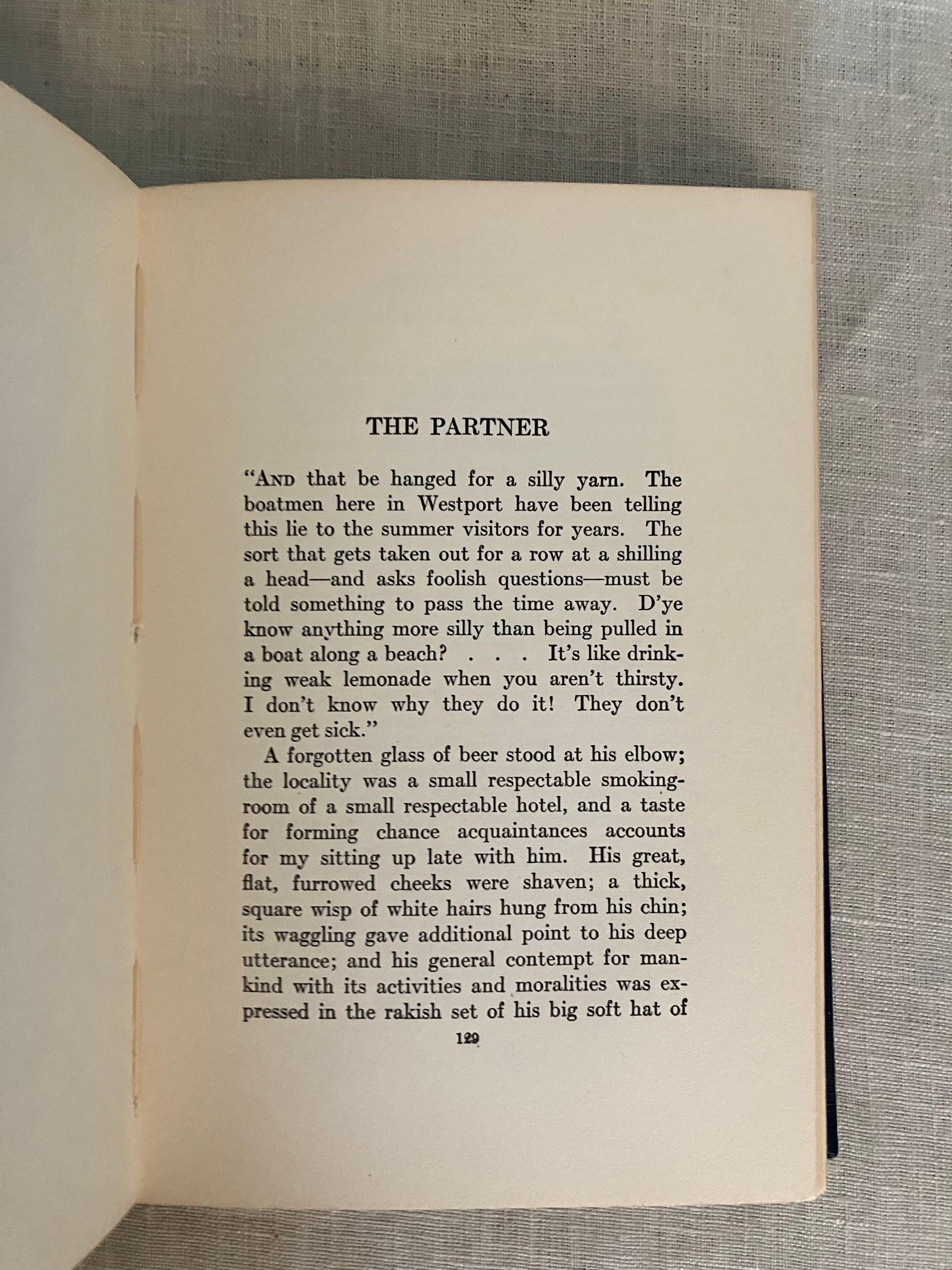 First American Edition, first impression. Hard cover, 8vo, in original blue linen-wove cloth, titles to the front board in a reverse art deco style frame with the ship logo below, and the spine blocked in gold. Copyright, 1916, Doubleday, Page & Company. (With notation of earlier magazine copyrights of 1911 Harper & Brothers as well as 1913, 1914 by Metropolitan Magazine.) Printed Country Life Press, Garden City, N.Y. All edges trimmed.**COLLATION: [i-viii],[1-2], 3-300 pp. [301], [3]pp. **CONDITION: Near Fine. Some spotting to the reverse gold of the title on front board with a couple of spots to boards, minor crimping at head of spine. Otherwise, clean, square, bright and tight with hinges in order. Now protected in mylar. Lacking dust jacket.**This is the First American Edition in book form of this collection of four of Conrad's lesser-known short stories. These include: "THE PLANTER OF MALATA," (first serialized in the American Metropolitan Magazine, June-July 1914) and described on the English first edition jacket thus: as "a thrilling romance of a planter in the little island of Malata, in the South Seas. A planter, Renouard, is developing an artificial silk alternative in the story, which was apparently a colonial enterprise which caused a real life investment bubble. There is a story of unrequited love, ending badly. "THE PARTNER," (appearing in Harper's Magazine Nov. 1911) is described as "a story of a shipwreck and a rogue." "THE INN OF TWO WITCHES" (seen in Pall Mall Magazine, March 1913) is called "a tale of the adventures of an officer and a sailor, on board a sloop-of-war, at an inn in the North of Spain." Finally, the story "BECAUSE OF THE DOLLARS" (appeared as "Laughing Anne" in Metropolitan Magazine, Sept. 1914) "relates the terrible experience of the captain of a steamer in the Malay Archipelago. REFS: Lohf and Sheehy 177. Serialization, J.M. Dent jacket copy, and other Doubleday Page edition information from D. Supino, A.18. 1.0., pp. 244-245. THIS edition is his A.5.0 on page 248-49. Keating 110, edition only.
