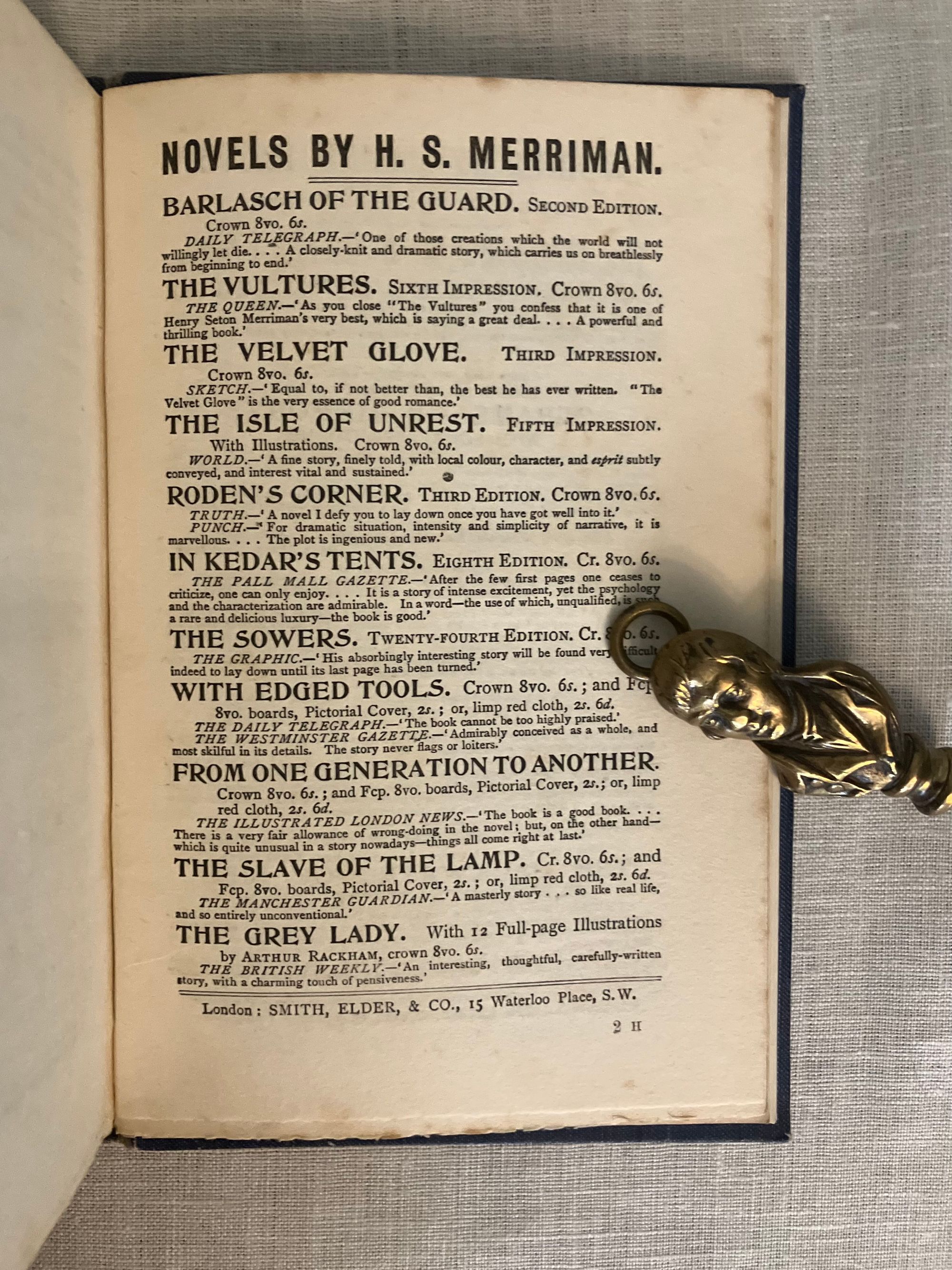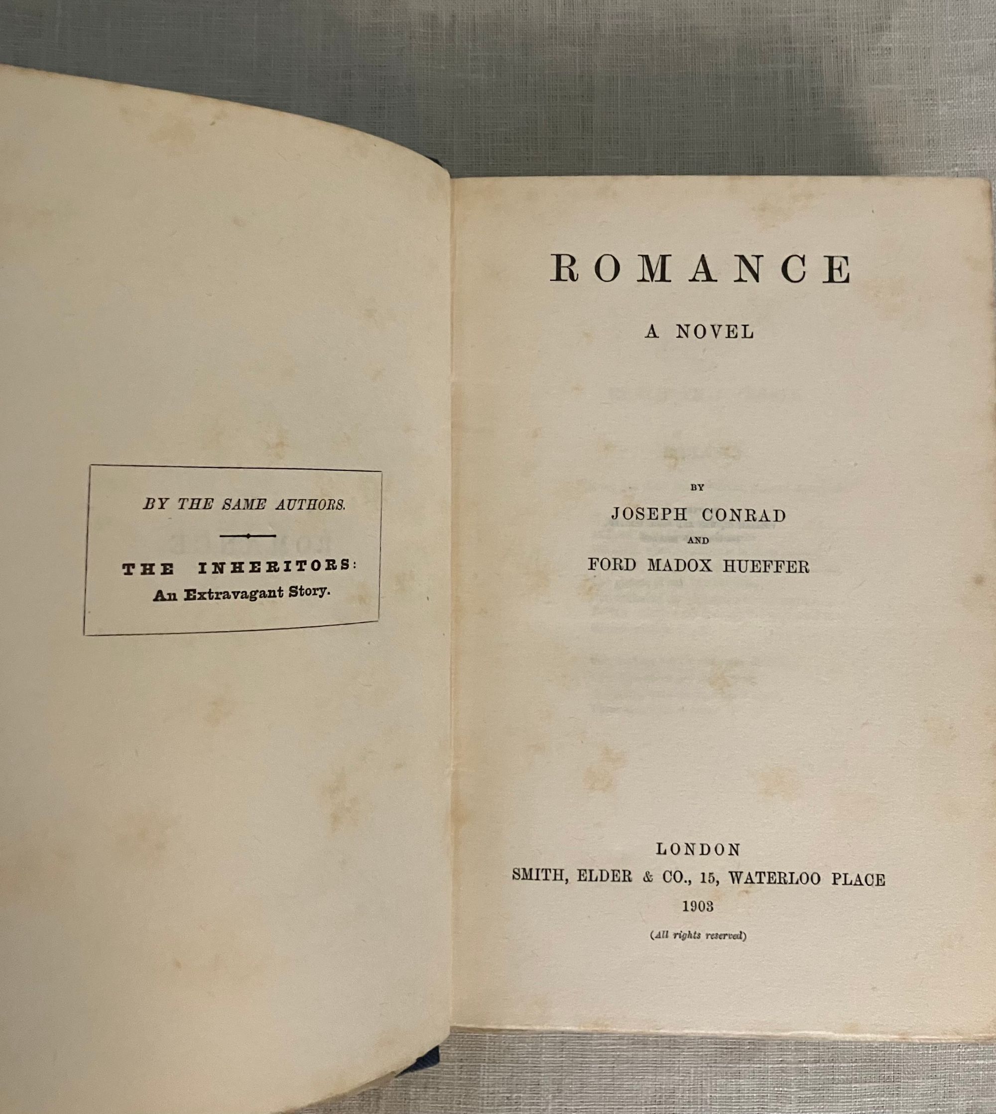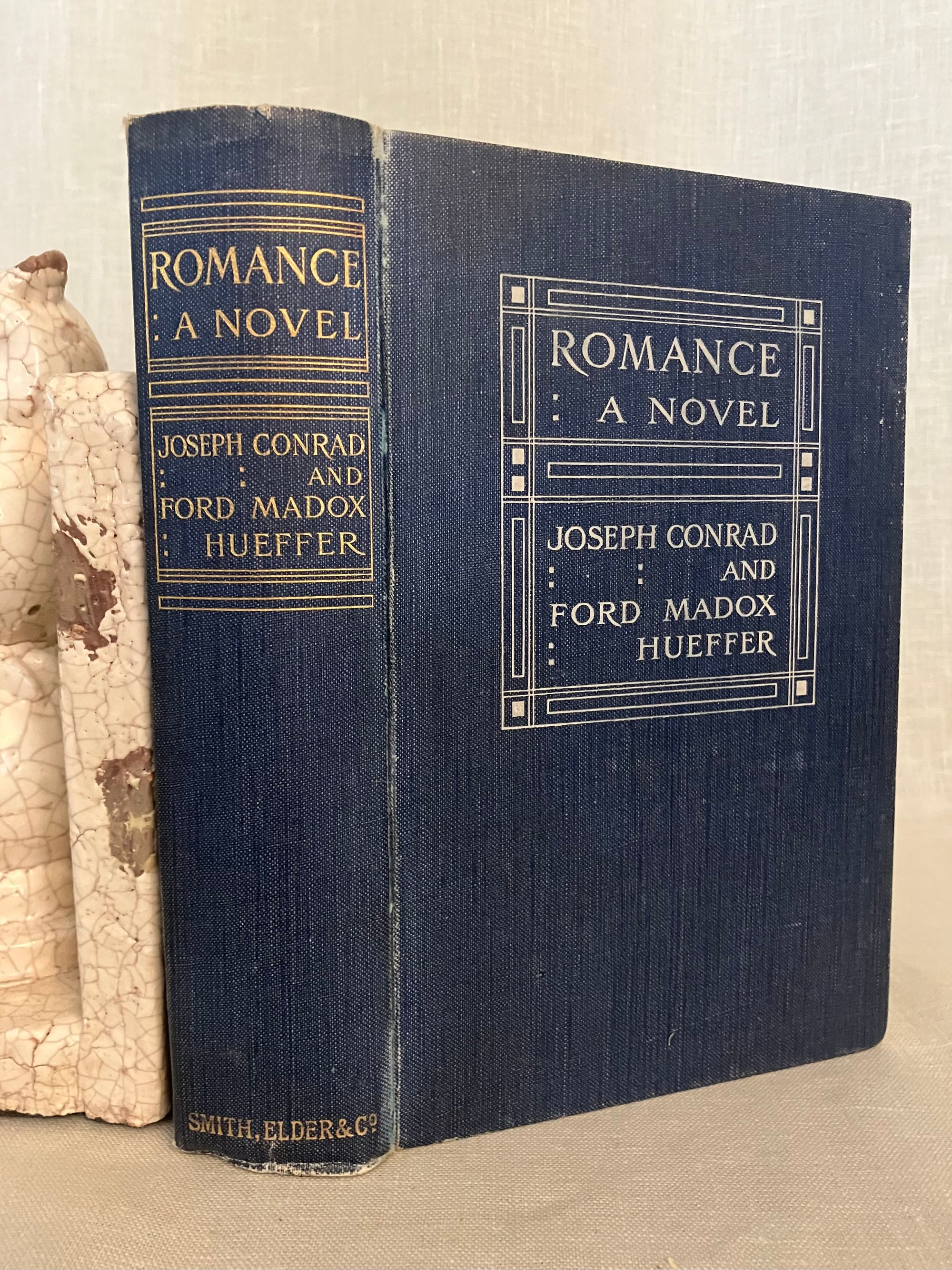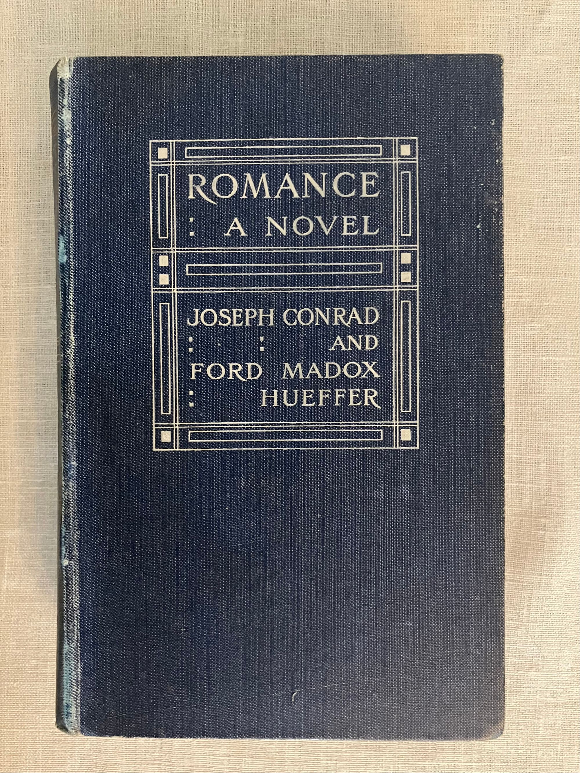 First English Edition, first impression dates from Oct. 16, 1903 (see Supino below) in a printing of 2000 copies. Hard cover, 12mo, in original blue cloth with a Glasgow-style art deco design employing a ruled frame with a number of filled squares and rectangular ruled areas framing the title and authors' names to the front board, blocked in white. Titles to the spine are in gold, in a different but similar frame, with Smith, Elder & Co. appearing at the foot. Top edge trimmed and stained grey, bottom edge untrimmed. Printed at William Clowes and Sons, Limited, London and Beccles. Typo p. 34 "itno." COLLATION: signed, [i-viii], [I] 2-463, [1], [8pp. publisher's catalogue, marked 2 H.] **CONDITION: Very Good.Minus. Some rubbing to the joints edges and tips, also at head and foot of the spine. Rear hinge starting, but holding firm. Foxing seen to text block edges and lightly throughout. Inscribed in fountain pen to ffep. with a former owner's name. Now in mylar.**"Romance" Co-Author, Ford Madox Hueffer, (1873-1939), aka Ford Madox Ford from 1919, later adopted the name of his famous grandfather, the Pre-Raphaelite artist Ford Madox Brown. He was also related through the maternal line to William Michael Rosetti's wife Lucy Madox Brown. Living near the Romney Marsh, in Kent, Hueffer became friends with the area's literary circle who included the authors Henry James, Stephen Crane and H.G.Wells as well as a somewhat impoverished Joseph Conrad around the turn of the twentieth century. Conrad's early supporter and editor, Edward Garnett introduced Conrad and Hueffer in 1898, and their work "Romance," was their second joint publishing effort. It had some commercial success, helping the financially-struggling Joseph Conrad whose earlier titles had met with critical acclaim yet left the author in financial peril. **AN ADVENTURE STORY which begins in England, then continues in the West Indies, Cuba and finally back to England, "Romance" has a complex political plot and a large international cast of characters: Jamaican, Cuban, English, Scottish, Irish, Spanish and Mexican. The action involves the competing interests to Jamaica's sugar trade, and how commercial and colonial policies become corrupted by greed. A young Englishman, John Kemp, the down-at-heels grandson of an unidentified Earl, is eager to escape a quotidian existence, and plans to travel to Jamaica to learn the ropes of running the Horton Pen sugar plantation, owned by the Rooksby family, whose scion, Edward Rooksby, has just married his sister, Veronica. On the way to the ship, he is the victim of a case of mistaken identity and becomes a wanted man, initiating a relationship with a couple of mysterious marauders, Don Carlos and his retainer Castro. Don Carlos has a remote family connection to Kemp, and encourages him to join him at a secret pirate base at Rio Medio, Jamaica. Once arrived in Jamaica, Admiral Rowley's English warship is too large to effectively engage with the smaller pirate vessels which plague the seas, secretly supported by foreign officials in Cuba. John becomes aware of the divisive social and political environment. Slavery, which powers the local commerce, is condemned at home in England (outlawed in 1834,) but a local Jamaican Separatist faction of planters and the Irish ex-pat revolutionary O'Brien, become aligned in the desire to thwart the British by means of secession to the United States, where slave labor still remains legal. A romantic subplot joins John Kemp and Seraphina, daughter to a Castillian trader of influence, Don Ramon Balthasar, in Kingston, with piratical connections... A very good read. REFS: Lohf and Sheehy 120. D. Supino, "Joseph Conrad: A Bibliographical Catalogue of Editions to 1930 " (Univ. of Liverpool, 2022), A9.1.0, p. 114, 115. Keating, 56 (edition only).pp. 131-133 gives the original plot outline by the authors.