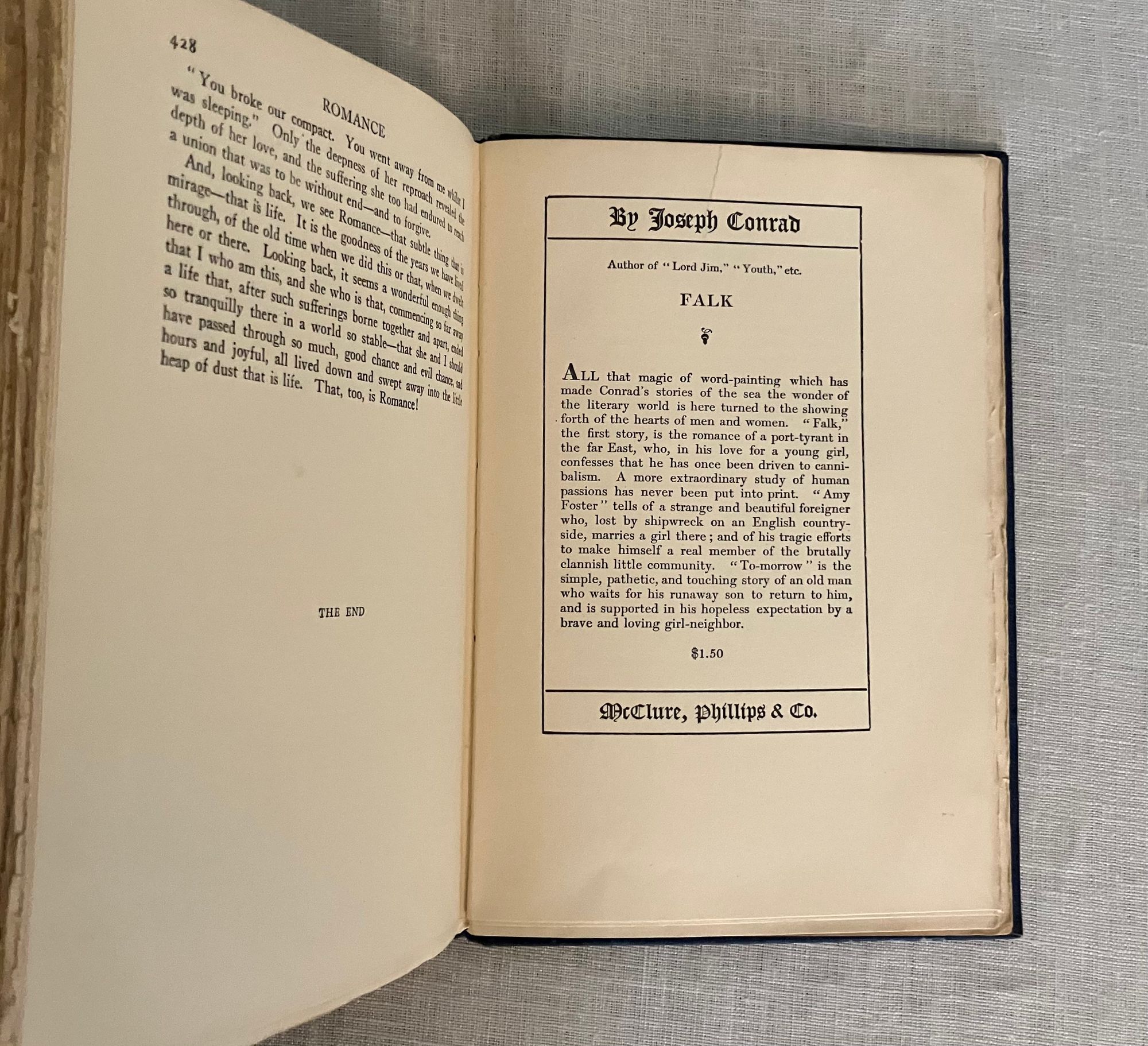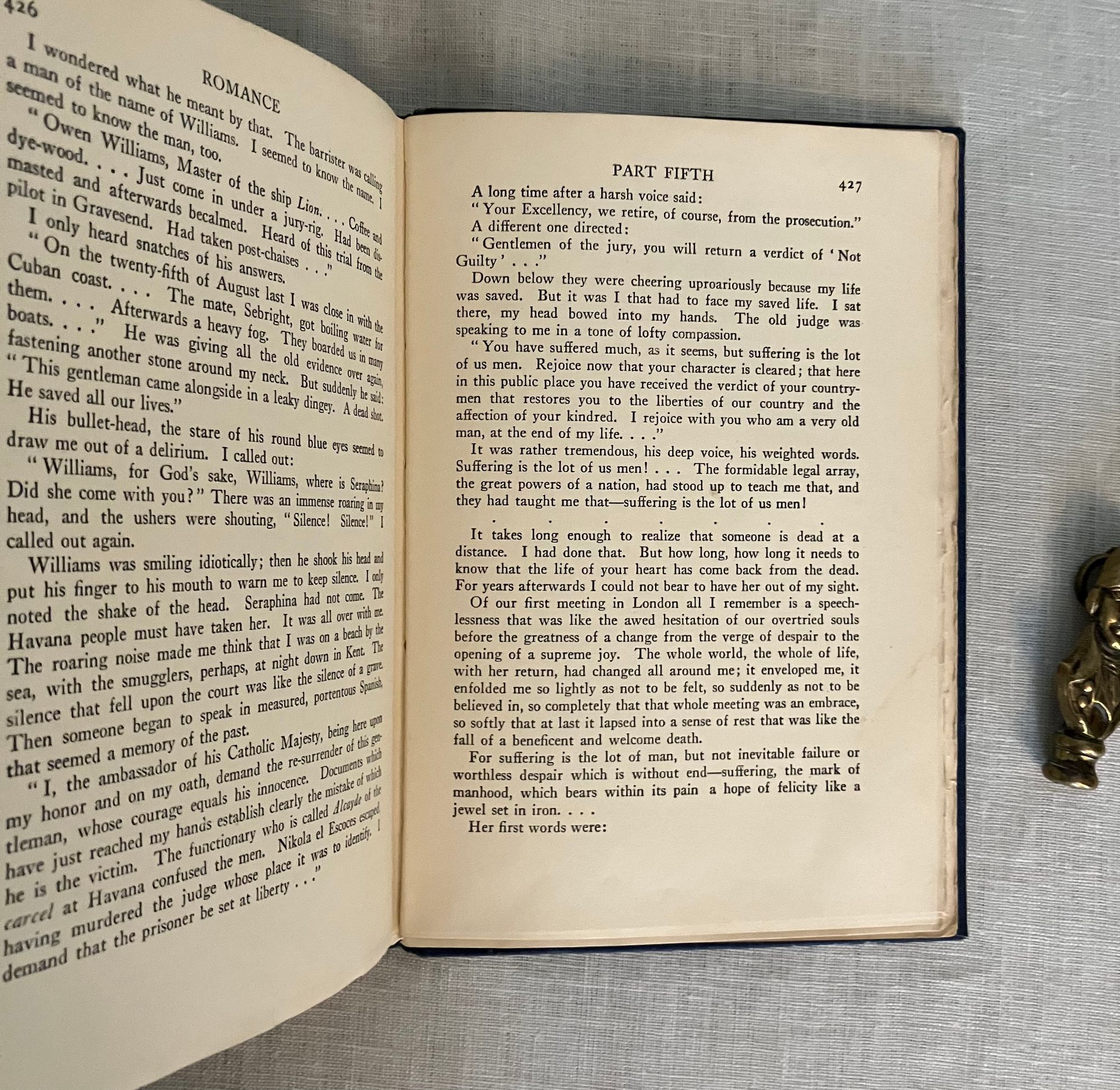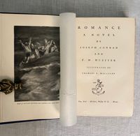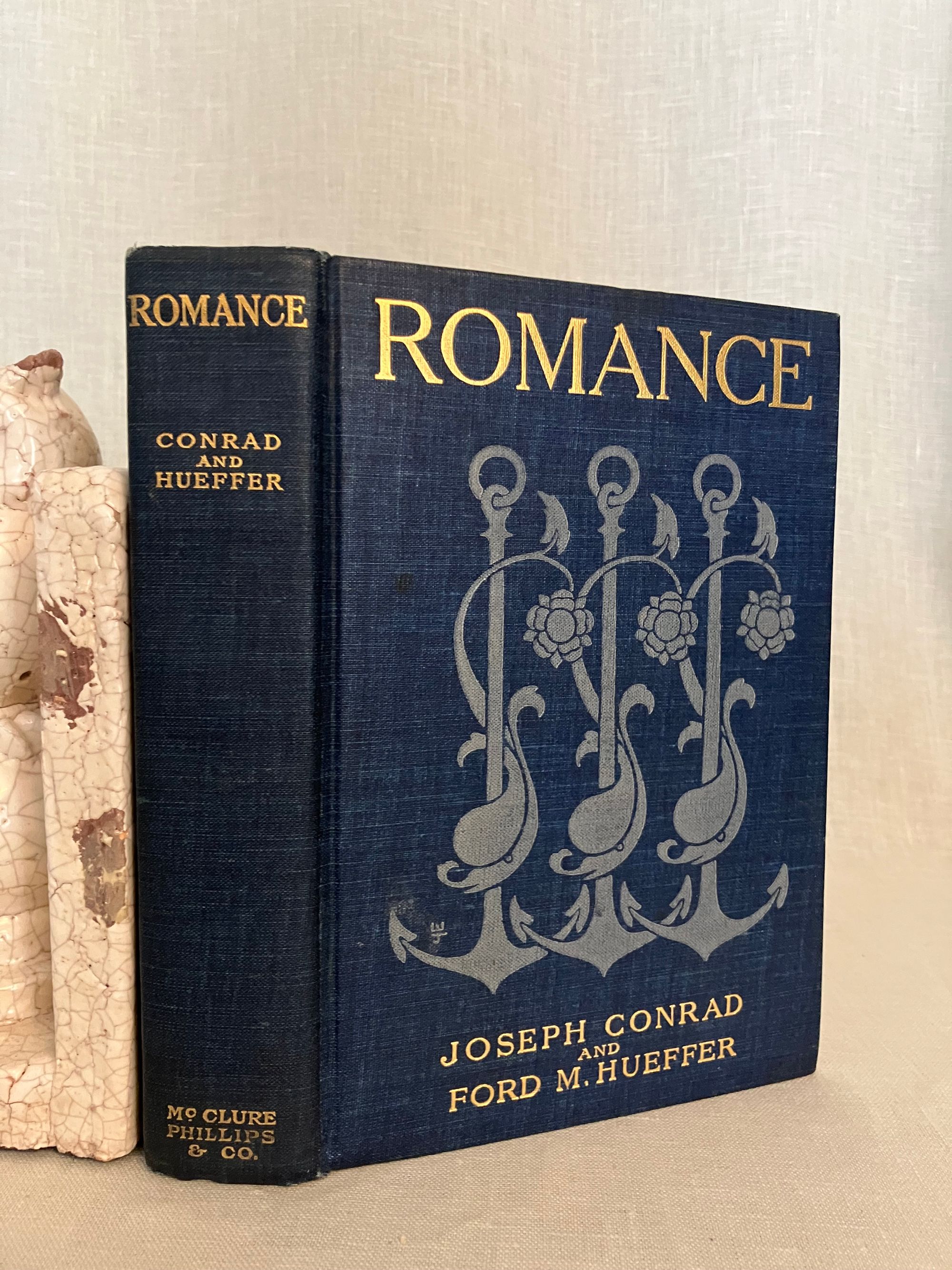 First Edition, first impression, first state. Hard cover, 12 mo, in publisher's original linen-weave indigo blue cloth, decorated with images of three anchors, dolphins and Tudor roses to the front board blocked in gray, (artist initials WJ )and the titles in gold to front and spine. Lacking dust jacket. Top edge stained grey, other edges untrimmed. Copyright verso title page states March 1904; Supino identifies this as the first state. Illustrated with tissue-guarded frontispiece in black and white by the artist Charles M. Macauley, plus an additional seven unpaginated illustrations on coated paper opposite pages of text.**CONDITION: Near Fine. A small closed tear in the center of the frontis tissue guard (half inch.) One small closed tear repaired at top of first page publisher's catalogue. Otherwise, very clean, tight and mildly toned. Lacking dust jacket. Now in mylar. **COLLATION: unsigned, [i -x][1-3] 4-428pp. [8pp. publisher's catalogue.] **Ohio-born ARTIST CHARLES R. MACCAULEY (1871-1934), was a freelance illustrator, one-time animated cartoonist, and eventually a nationally-recognized political cartoonist who won a Pulitzer Prize in 1930 for the political cartoon "Paying for a Dead Horse, which appeared in print in the Brooklyn Daily Eagle in 1929. Aside from political cartoons, published in newspapers in Cleveland, New York and Philadelphia, his political commentary extended to filmmaking, in supporting Woodrow Wilson and Teddy Roosevelt. His obituary states he had friendships with a number of important politicians of the day, among them his godfather Pres. McKinley, and Presidents Taft, Wilson and Roosevelt.**"Romance" CO-AUTHOR, FORD MADOX HUEFFER, (1873-1939), aka Ford Madox Ford from 1919, later adopted the name of his famous grandfather, the Pre-Raphaelite artist Ford Madox Brown. He was also related through the maternal line to William Michael Rosetti's wife Lucy Madox Brown. Living near the Romney Marsh, in Kent, Hueffer became friends with the area's literary circle who included the authors Henry James, Stephen Crane and H.G.Wells as well as a somewhat impoverished Joseph Conrad around the turn of the twentieth century. Conrad's early supporter and editor, Edward Garnett introduced Conrad and Hueffer in 1898, and their work "Romance," was their second joint publishing effort. It had some commercial success, helping the financially-struggling Joseph Conrad whose earlier titles had met with critical acclaim yet left the author in financial peril. **AN ADVENTURE STORY which begins in England, then continues in the West Indies, Cuba and finally back to England, "Romance" has a complex political plot and a large international cast of characters: Jamaican, Cuban, English, Scottish, Irish, Spanish and Mexican. The action involves the competing interests to Jamaica's sugar trade, and how commercial and colonial policies become corrupted by greed. A young Englishman, John Kemp, the down-at-heels grandson of an unidentified Earl, is eager to escape a quotidian existence, and plans to travel to Jamaica to learn the ropes of running the Horton Pen sugar plantation, owned by the Rooksby family, whose scion, Edward Rooksby, has just married his sister, Veronica. On the way to the ship, he is the victim of a case of mistaken identity and becomes a wanted man, initiating a relationship with a couple of mysterious marauders, Don Carlos and his retainer Castro. Don Carlos has a remote family connection to Kemp, and encourages him to join him at a secret pirate base at Rio Medio, Jamaica. Once arrived in Jamaica, Admiral Rowley's English warship is too large to effectively engage with the smaller pirate vessels which plague the seas, secretly supported by foreign officials in Cuba. John becomes aware of the divisive social and political environment. Slavery, which powers the local commerce, is condemned at home in England (outlawed in 1834,) but a local Jamaican Separatist faction of planters and the Irish ex-pat revolutionary O'Brien, become aligned in the desire to thwart the British by means of secession to the United States, where slave labor still remains legal. A romantic subplot joins John Kemp and Seraphina, daughter to a Castillian trader of influence, Don Ramon Balthasar, in Kingston, with piratical connections... A very good read.**REFS: C.R. MacCauley, obituary 11/25/1934, Brooklyn Daily Eagle. Lohf and Sheehey, 120. Keating, 57, edition only. Supino A9.6.0 and Plate 9 (on the right.)