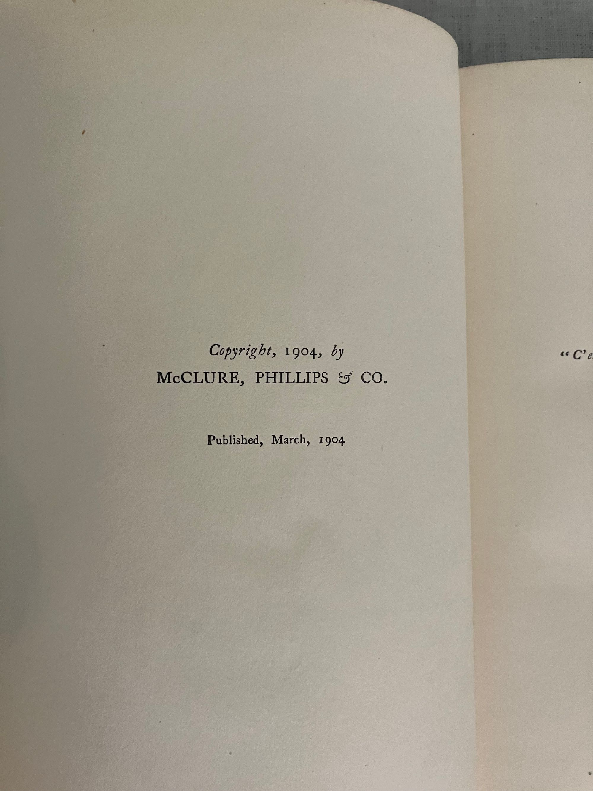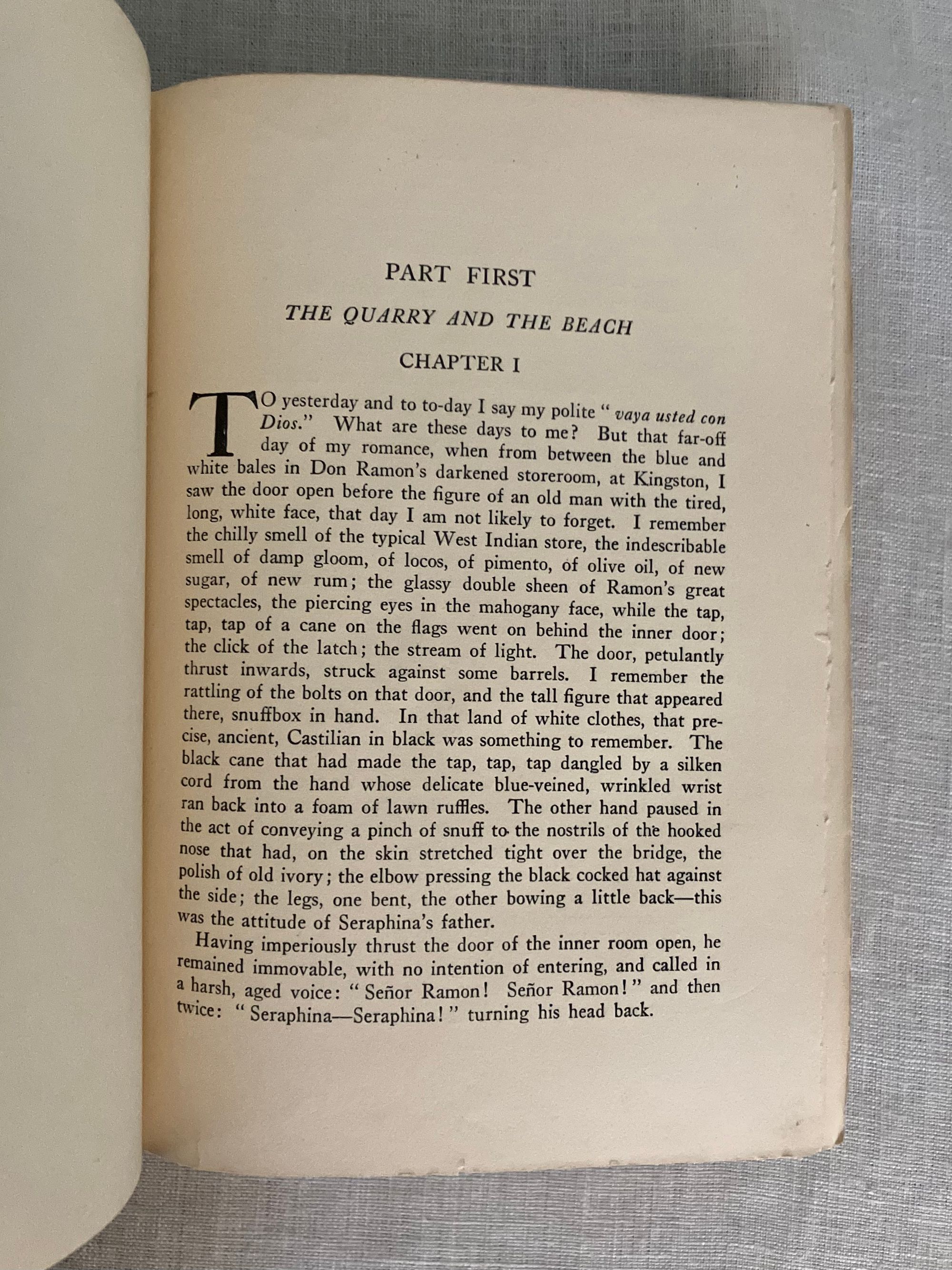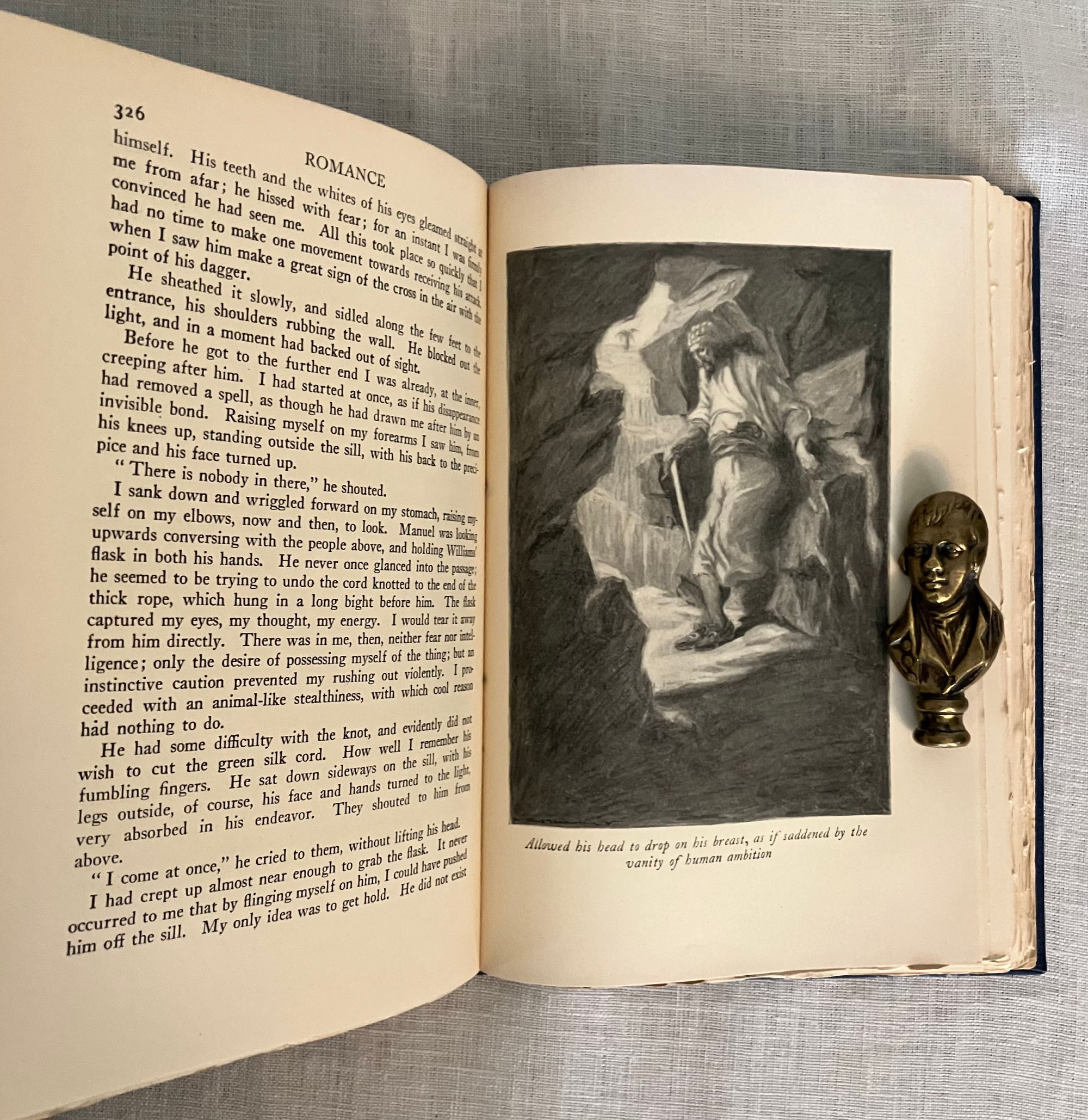 First Edition, first impression, first state. Hard cover, 12 mo, in publisher's original linen-weave indigo blue cloth, decorated with images of three anchors, dolphins and Tudor roses to the front board blocked in gray, (artist initials WJ )and the titles in gold to front and spine. Lacking dust jacket. Top edge stained grey, other edges untrimmed. Copyright verso title page states March 1904; Supino identifies this as the first state. Illustrated with tissue-guarded frontispiece in black and white by the artist Charles M. Macauley, plus an additional seven unpaginated illustrations on coated paper opposite pages of text.**CONDITION: Near Fine. A small closed tear in the center of the frontis tissue guard (half inch.) One small closed tear repaired at top of first page publisher's catalogue. Otherwise, very clean, tight and mildly toned. Lacking dust jacket. Now in mylar. **COLLATION: unsigned, [i -x][1-3] 4-428pp. [8pp. publisher's catalogue.] **Ohio-born ARTIST CHARLES R. MACCAULEY (1871-1934), was a freelance illustrator, one-time animated cartoonist, and eventually a nationally-recognized political cartoonist who won a Pulitzer Prize in 1930 for the political cartoon "Paying for a Dead Horse, which appeared in print in the Brooklyn Daily Eagle in 1929. Aside from political cartoons, published in newspapers in Cleveland, New York and Philadelphia, his political commentary extended to filmmaking, in supporting Woodrow Wilson and Teddy Roosevelt. His obituary states he had friendships with a number of important politicians of the day, among them his godfather Pres. McKinley, and Presidents Taft, Wilson and Roosevelt.**"Romance" CO-AUTHOR, FORD MADOX HUEFFER, (1873-1939), aka Ford Madox Ford from 1919, later adopted the name of his famous grandfather, the Pre-Raphaelite artist Ford Madox Brown. He was also related through the maternal line to William Michael Rosetti's wife Lucy Madox Brown. Living near the Romney Marsh, in Kent, Hueffer became friends with the area's literary circle who included the authors Henry James, Stephen Crane and H.G.Wells as well as a somewhat impoverished Joseph Conrad around the turn of the twentieth century. Conrad's early supporter and editor, Edward Garnett introduced Conrad and Hueffer in 1898, and their work "Romance," was their second joint publishing effort. It had some commercial success, helping the financially-struggling Joseph Conrad whose earlier titles had met with critical acclaim yet left the author in financial peril. **AN ADVENTURE STORY which begins in England, then continues in the West Indies, Cuba and finally back to England, "Romance" has a complex political plot and a large international cast of characters: Jamaican, Cuban, English, Scottish, Irish, Spanish and Mexican. The action involves the competing interests to Jamaica's sugar trade, and how commercial and colonial policies become corrupted by greed. A young Englishman, John Kemp, the down-at-heels grandson of an unidentified Earl, is eager to escape a quotidian existence, and plans to travel to Jamaica to learn the ropes of running the Horton Pen sugar plantation, owned by the Rooksby family, whose scion, Edward Rooksby, has just married his sister, Veronica. On the way to the ship, he is the victim of a case of mistaken identity and becomes a wanted man, initiating a relationship with a couple of mysterious marauders, Don Carlos and his retainer Castro. Don Carlos has a remote family connection to Kemp, and encourages him to join him at a secret pirate base at Rio Medio, Jamaica. Once arrived in Jamaica, Admiral Rowley's English warship is too large to effectively engage with the smaller pirate vessels which plague the seas, secretly supported by foreign officials in Cuba. John becomes aware of the divisive social and political environment. Slavery, which powers the local commerce, is condemned at home in England (outlawed in 1834,) but a local Jamaican Separatist faction of planters and the Irish ex-pat revolutionary O'Brien, become aligned in the desire to thwart the British by means of secession to the United States, where slave labor still remains legal. A romantic subplot joins John Kemp and Seraphina, daughter to a Castillian trader of influence, Don Ramon Balthasar, in Kingston, with piratical connections... A very good read.**REFS: C.R. MacCauley, obituary 11/25/1934, Brooklyn Daily Eagle. Lohf and Sheehey, 120. Keating, 57, edition only. Supino A9.6.0 and Plate 9 (on the right.)