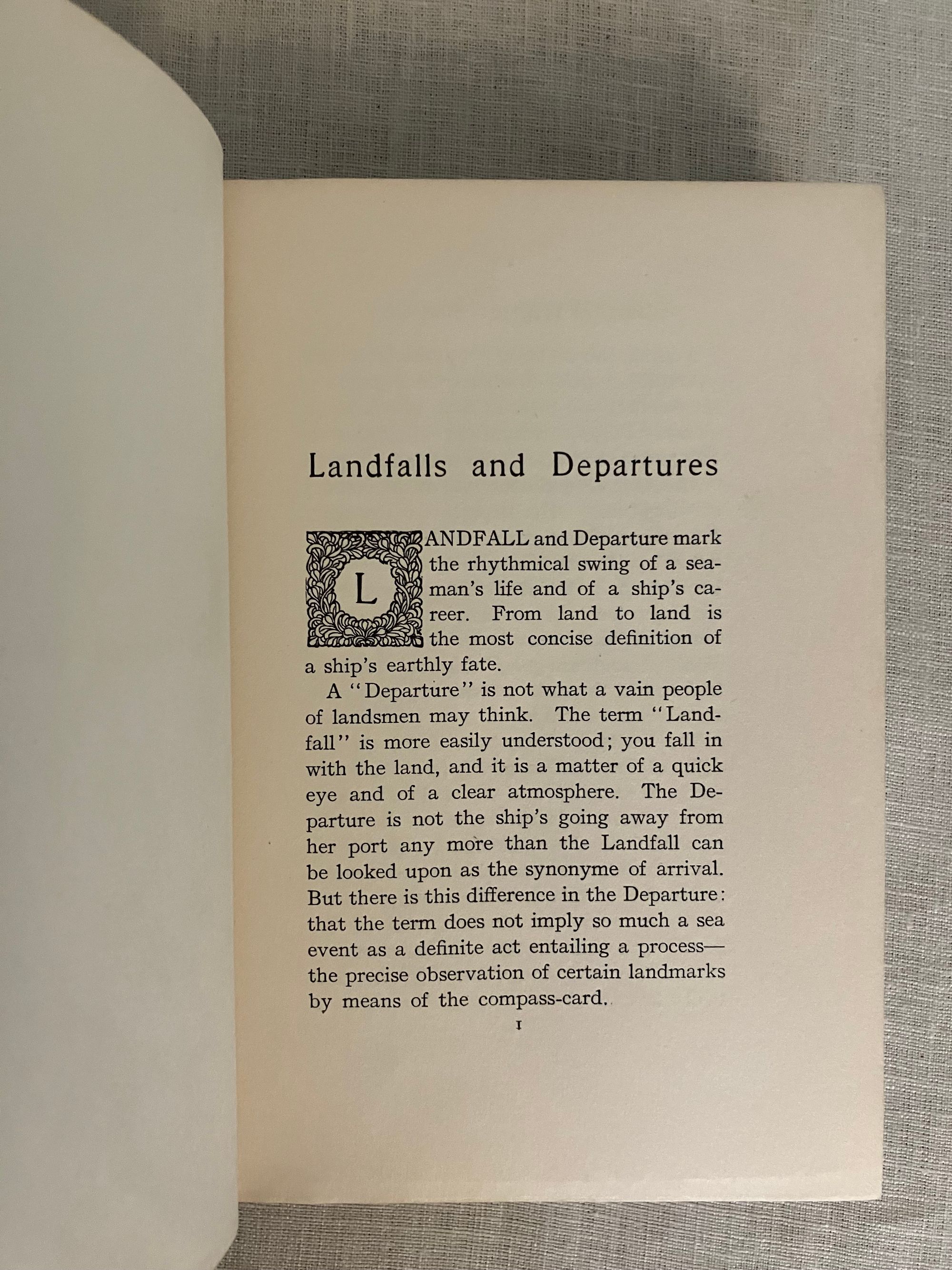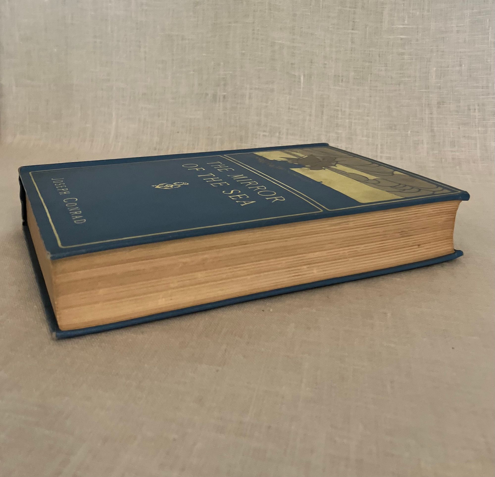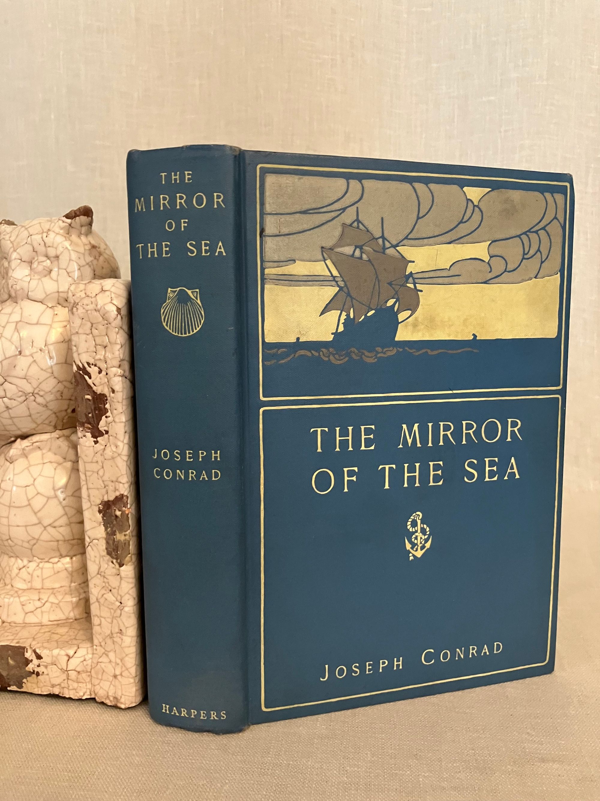 First American Edition, first impression, binding state A. Hard cover, 12mo, in light blue decorated cloth with a clipper ship and cloud illustration blocked in gray, brown and pale yellow to the front boards, within a two-part ruled frame of yellow, an anchor between the title and author name. The spine with titles blocked in pale yellow with a vignette shell below the title. Top edge stained gray, all edges trimmed. Stated Publication date October 1906.COLLATION: [ i-vi] , I-328 [329]. There is no dedication this issue. **CONDITION: Very Good Plus, or better. Small areas of soiling to the yellow sky of the front board (looks like fog,) and a couple of other very small marks to front board. Very minimal shelf wear. Hinges in order, unwritten in, endpapers and text remain bright and binding firm. Lacking dust jacket. Really, a very nice copy.** This book of 15 chapters recounts different incidents, reminiscences and reflections of the Author's life at sea at the close of the nineteenth century, morsels of which became the basis of his maritime fiction. Lohf and Sheehy 53. Supino A11.7.0 (binding state A.)