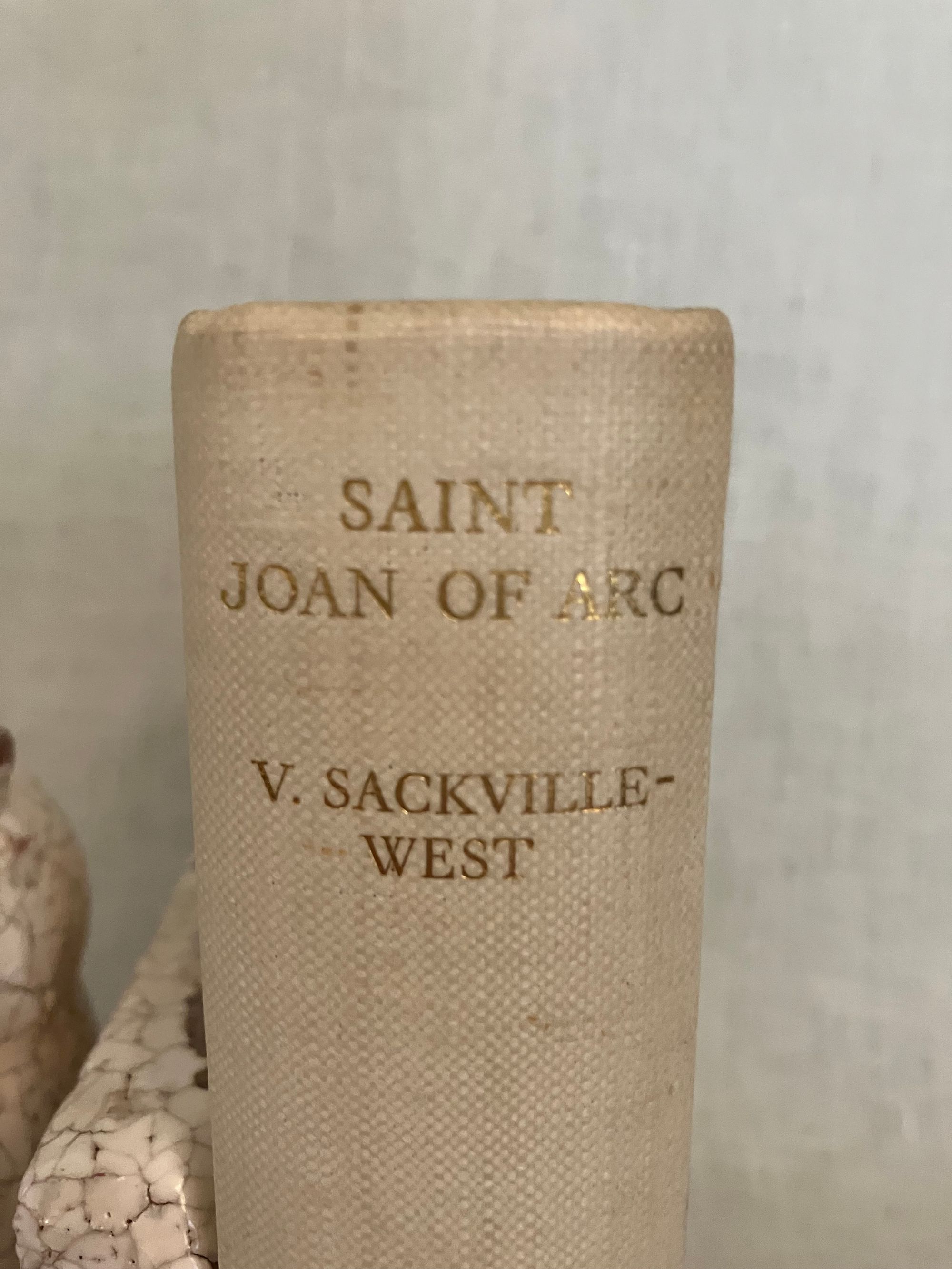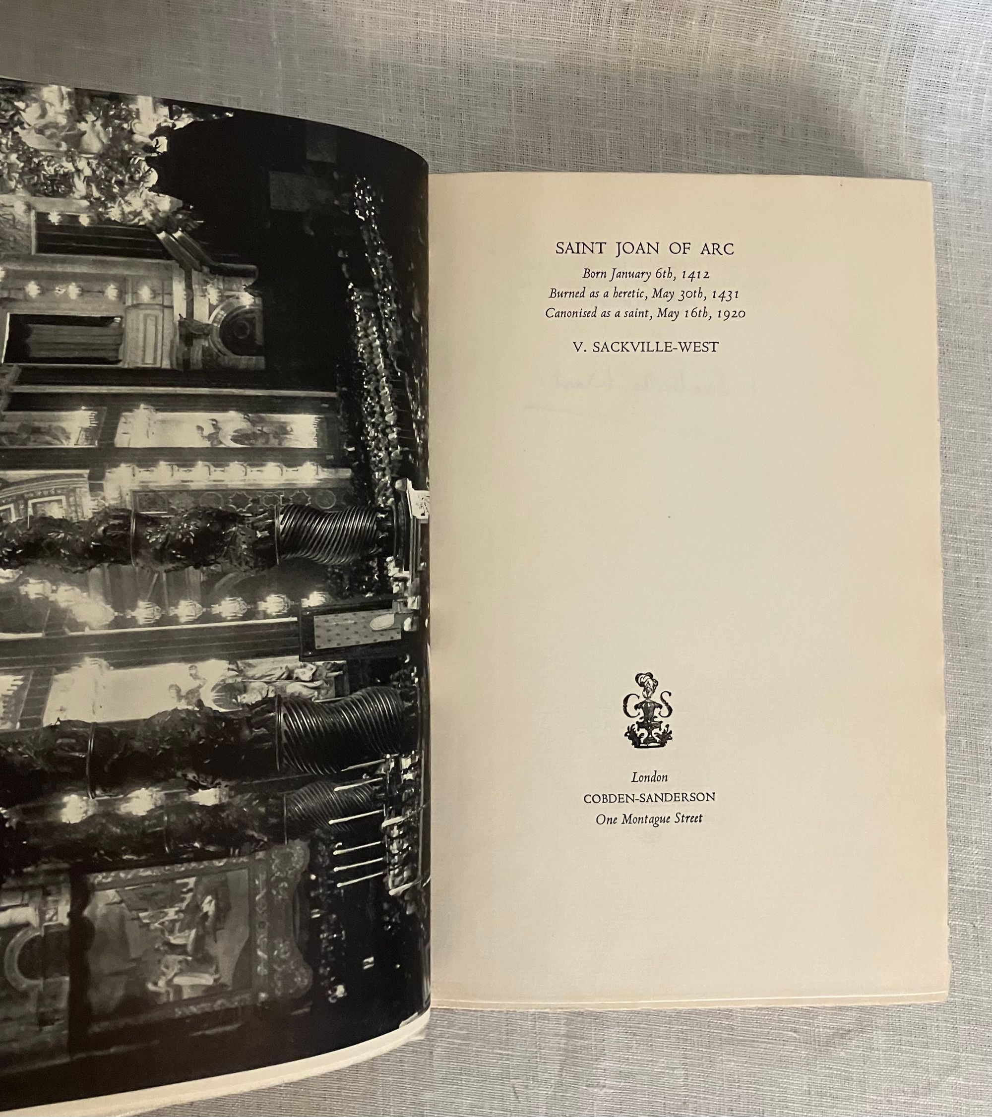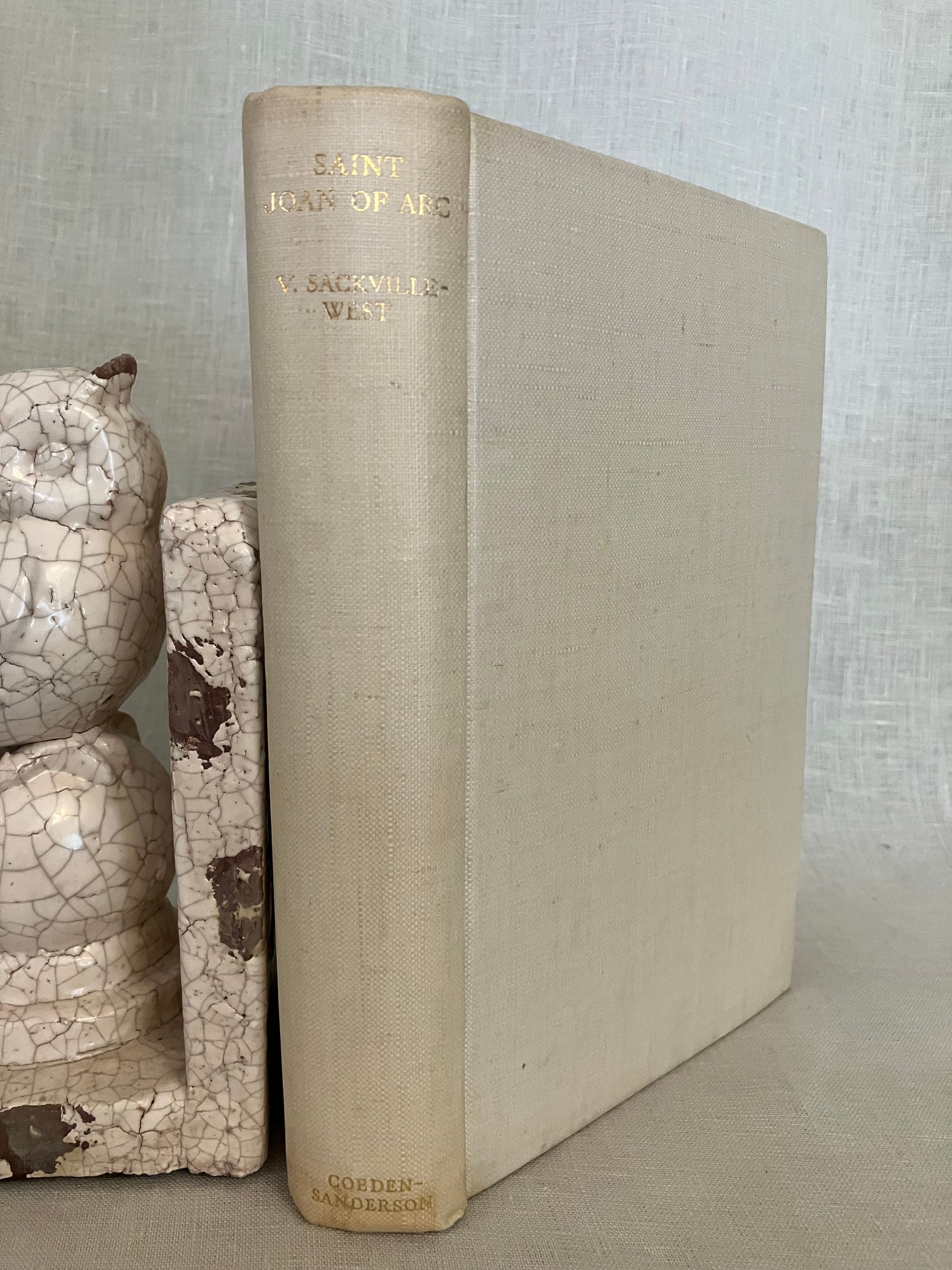 Hard cover in the original ivory buckram covered boards, with the original glassine wraps, with title to spine in gilt, frontispiece halftone photo of opposite title page. Copyright 1906 Harper & Brothers. First edition. No. 7 of 120 copies (20 were not for sale). Top edge gilt, others untrimmed. Cross & Ravenscroft date the printing as of June 1936. Printed in England for R. Cobden-Sanderson Ltd. by The Camelot Press Ltd., London and Southampton on paper supplied by Spaulding and Hodge Ltd., and bound by the Leighton-Straker Bookbinding Company, Ltd. xiii [1] [1]-436 [foldout map][2]. Nine black and white illustrations, including frontispiece, are unpaginated. Three maps within text plus one fold-out map by J.F. Horrabin. Appendices on bibliographical materials, letters, the trial for heresy, translation, genealogy, miracles and chronology, plus index. **CONDITION: Near Fine, in Very Good Minus glassine. The book has a faint darkening in the last 3/8 inch at foot of the spine, (where glassine is absent.) Otherwise, the exterior and interior are exceptionally clean. The gilt remains bright, hinges are in order. The glassine, (now protected in mylar,) has a two closed tears to the rear side, with some loss at head and foot, and right lower corner front.** This is the story of Joan of Arc, patron saint of France, who came to prominence as a visionary young woman warrior during the Hundred Years War. She was finally canonised by the Catholic Church in 1920. Sackville-West paints a psychological profile of the young woman.**Part of London's influential early twentieth-century circle of writers and artists, The Bloomsbury Group, AUTHOR Vita Sackville-West (1892-1962) is today perhaps best remembered for her skills of garden design which she perfected at her home Sissinghurst in Kent with her husband Harold Nicholson, now a major attraction of the National Trust Gardens. This was the second work of history published by Sackville-West, with twelve earlier publications spanning the genres of novels, poetry, criticism and travel. She has been described as something of an autodidact, having been educated at home by governesses until the age of thirteen, followed by a brief enrollment at Miss Woolff's School for Girls in London. **Printer and publisher Richard Cobden-Sanderson (1884-1964) was the son of famed English fine bookbinder T.J. Cobden-Sanderson.**REFS: Cross & Ravenscroft-Hulme A.31(b) Scarce.