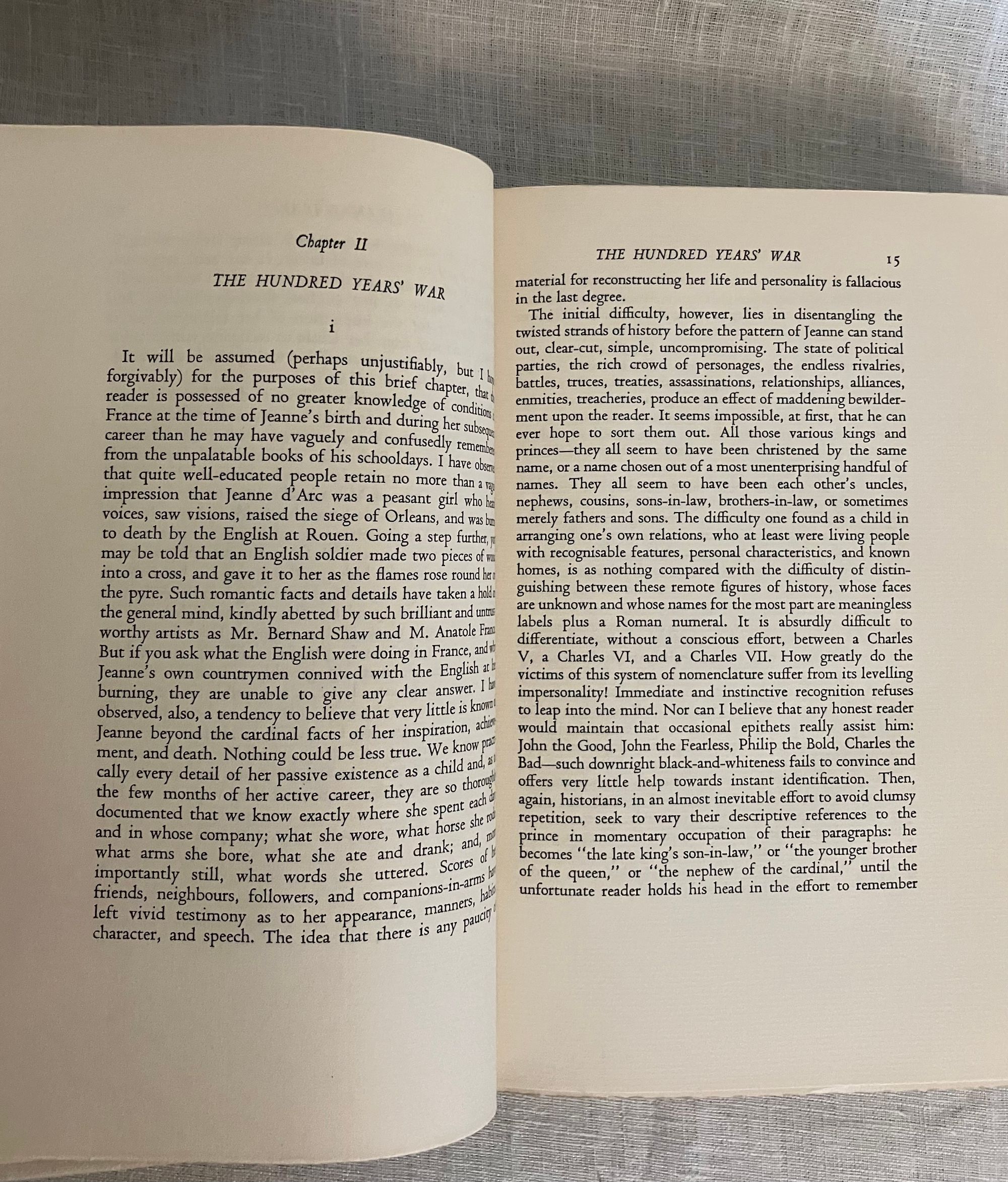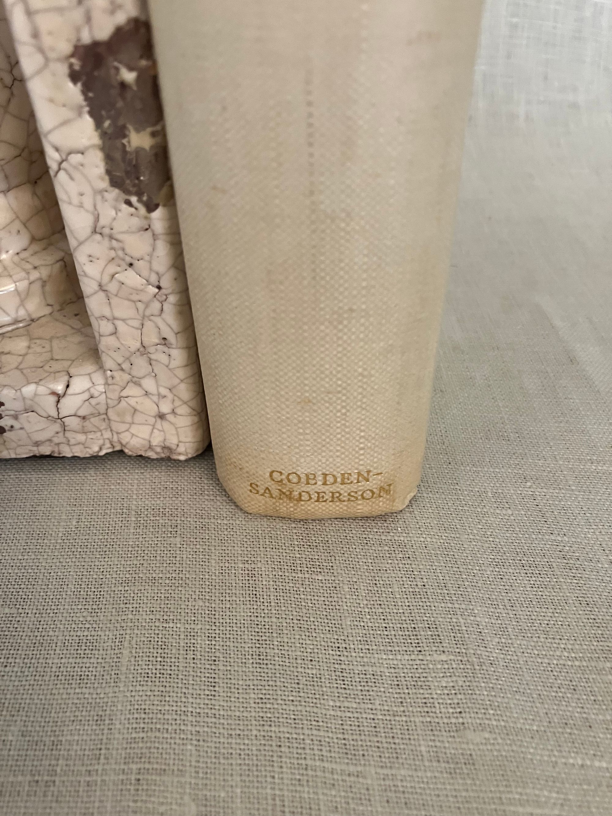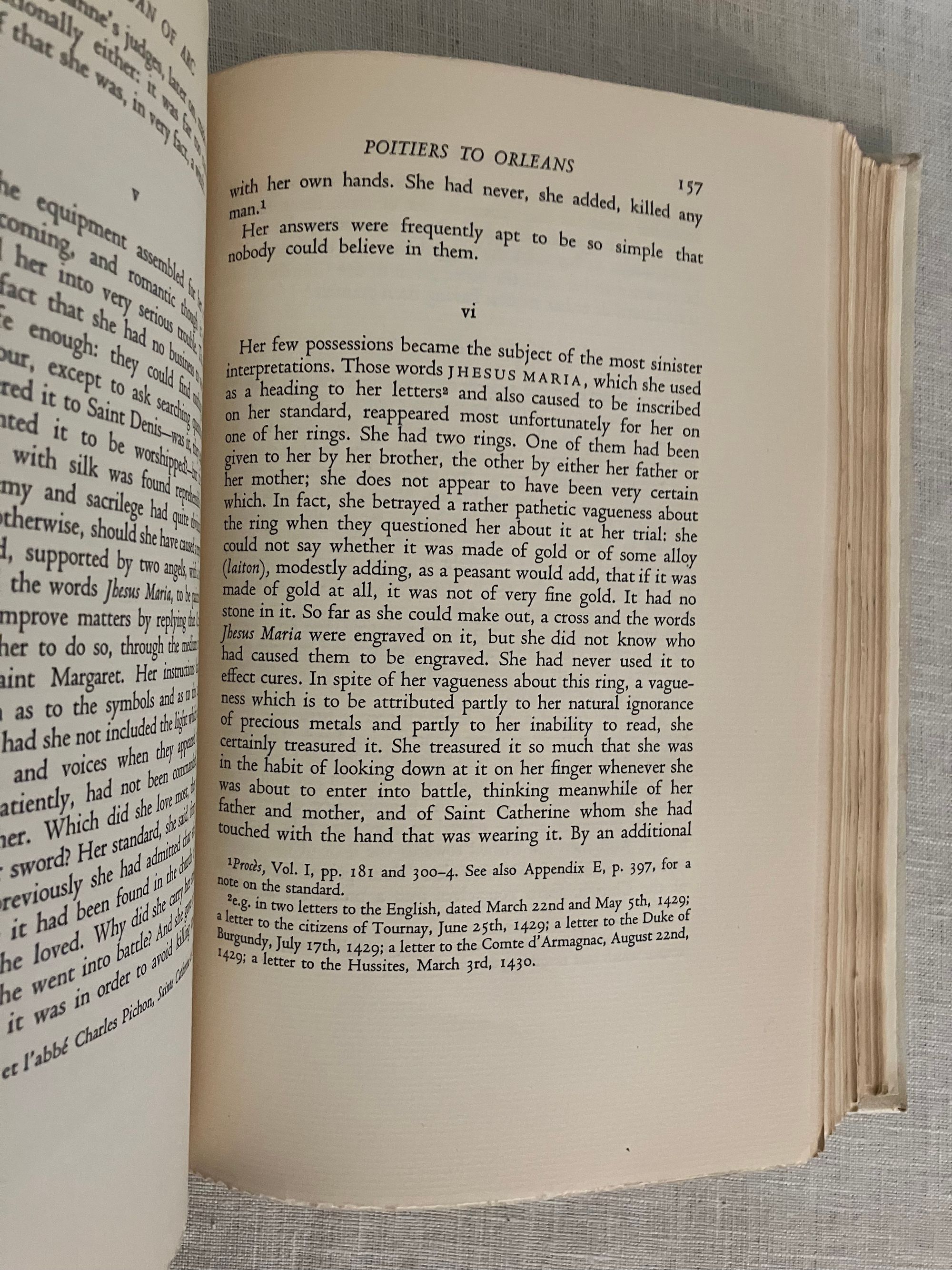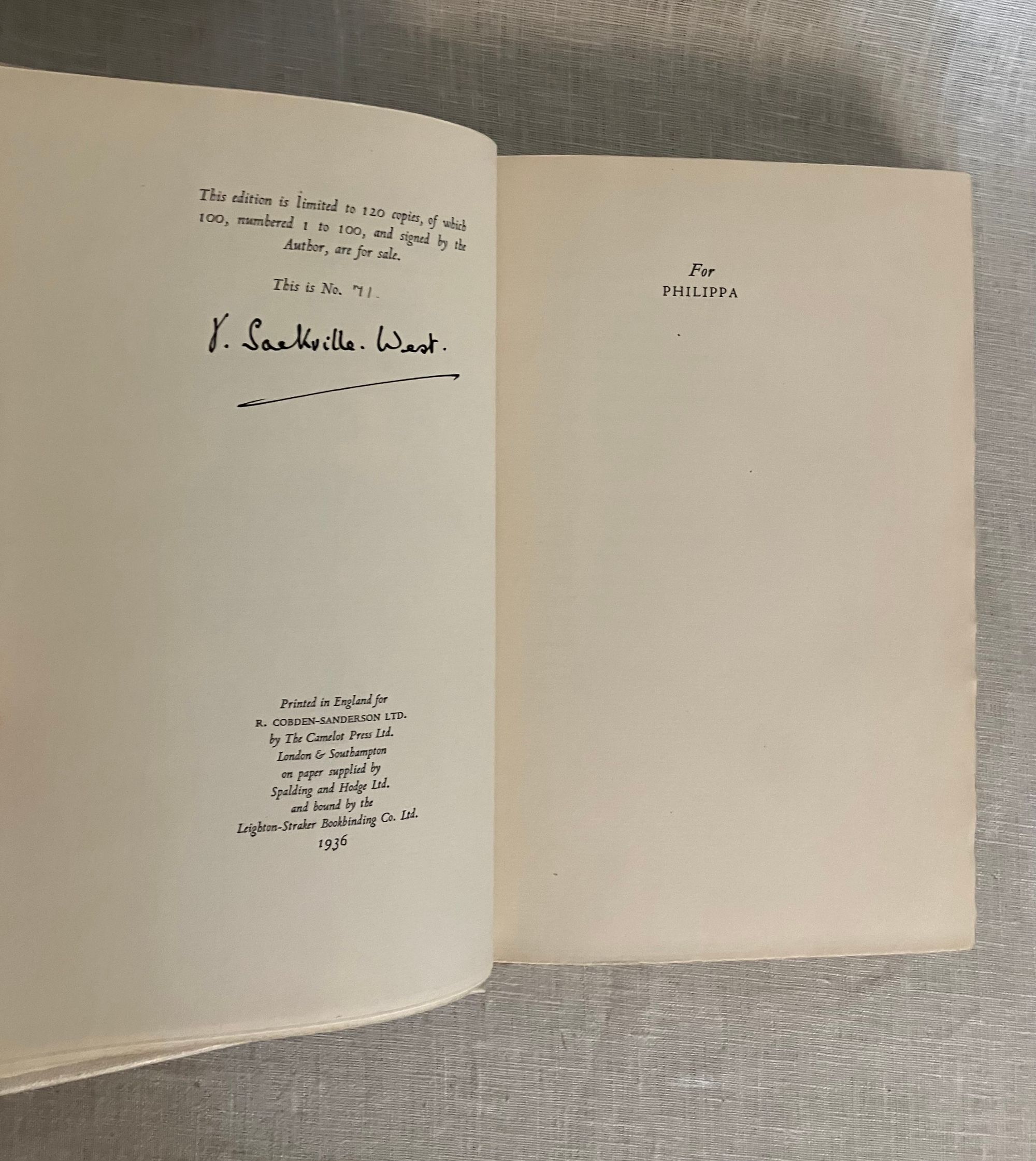Hard cover in the original ivory buckram covered boards, with the original glassine wraps, with title to spine in gilt, frontispiece halftone photo of opposite title page. Copyright 1906 Harper & Brothers. First edition. No. 7 of 120 copies (20 were not for sale). Top edge gilt, others untrimmed. Cross & Ravenscroft date the printing as of June 1936. Printed in England for R. Cobden-Sanderson Ltd. by The Camelot Press Ltd., London and Southampton on paper supplied by Spaulding and Hodge Ltd., and bound by the Leighton-Straker Bookbinding Company, Ltd. xiii [1] [1]-436 [foldout map][2]. Nine black and white illustrations, including frontispiece, are unpaginated. Three maps within text plus one fold-out map by J.F. Horrabin. Appendices on bibliographical materials, letters, the trial for heresy, translation, genealogy, miracles and chronology, plus index. **CONDITION: Near Fine, in Very Good Minus glassine. The book has a faint darkening in the last 3/8 inch at foot of the spine, (where glassine is absent.) Otherwise, the exterior and interior are exceptionally clean. The gilt remains bright, hinges are in order. The glassine, (now protected in mylar,) has a two closed tears to the rear side, with some loss at head and foot, and right lower corner front.** This is the story of Joan of Arc, patron saint of France, who came to prominence as a visionary young woman warrior during the Hundred Years War. She was finally canonised by the Catholic Church in 1920. Sackville-West paints a psychological profile of the young woman.**Part of London's influential early twentieth-century circle of writers and artists, The Bloomsbury Group, AUTHOR Vita Sackville-West (1892-1962) is today perhaps best remembered for her skills of garden design which she perfected at her home Sissinghurst in Kent with her husband Harold Nicholson, now a major attraction of the National Trust Gardens. This was the second work of history published by Sackville-West, with twelve earlier publications spanning the genres of novels, poetry, criticism and travel. She has been described as something of an autodidact, having been educated at home by governesses until the age of thirteen, followed by a brief enrollment at Miss Woolff's School for Girls in London. **Printer and publisher Richard Cobden-Sanderson (1884-1964) was the son of famed English fine bookbinder T.J. Cobden-Sanderson.**REFS: Cross & Ravenscroft-Hulme A.31(b) Scarce.