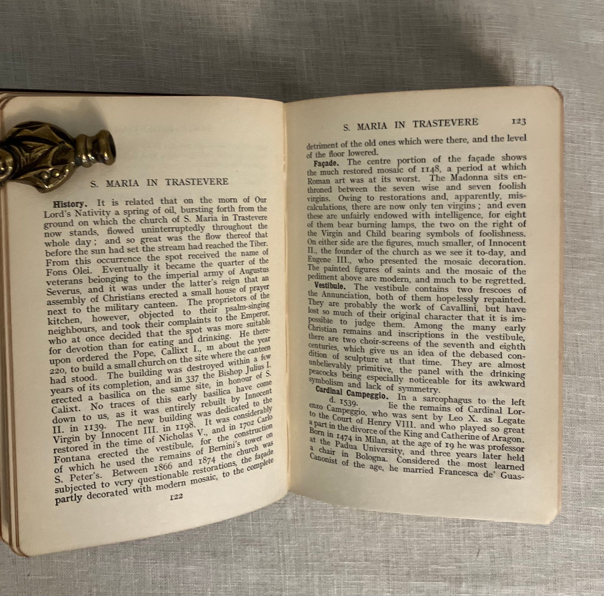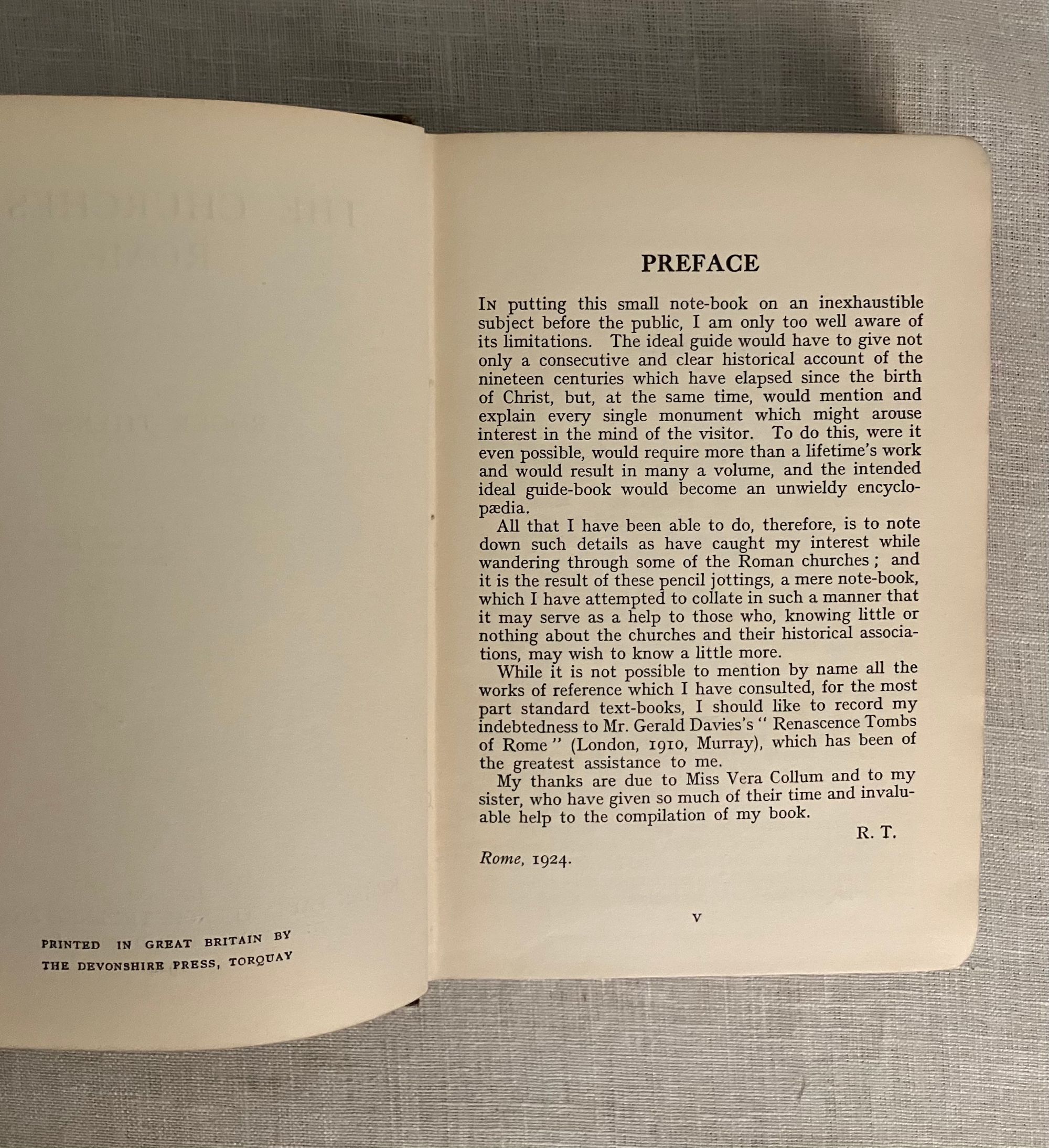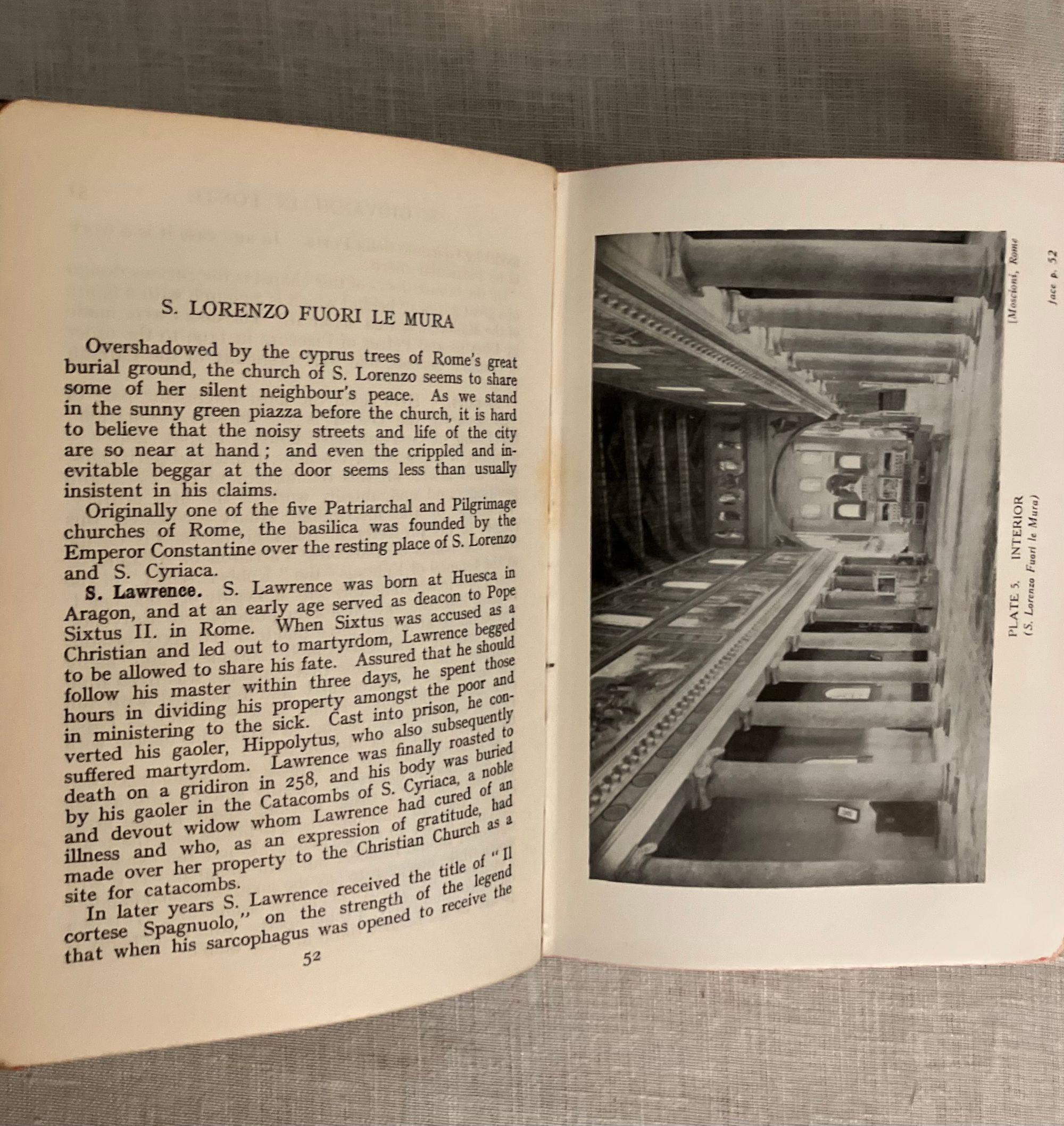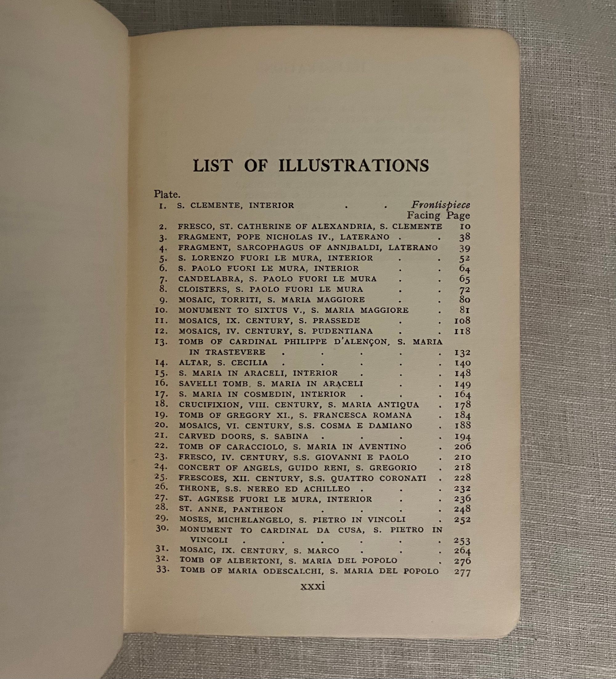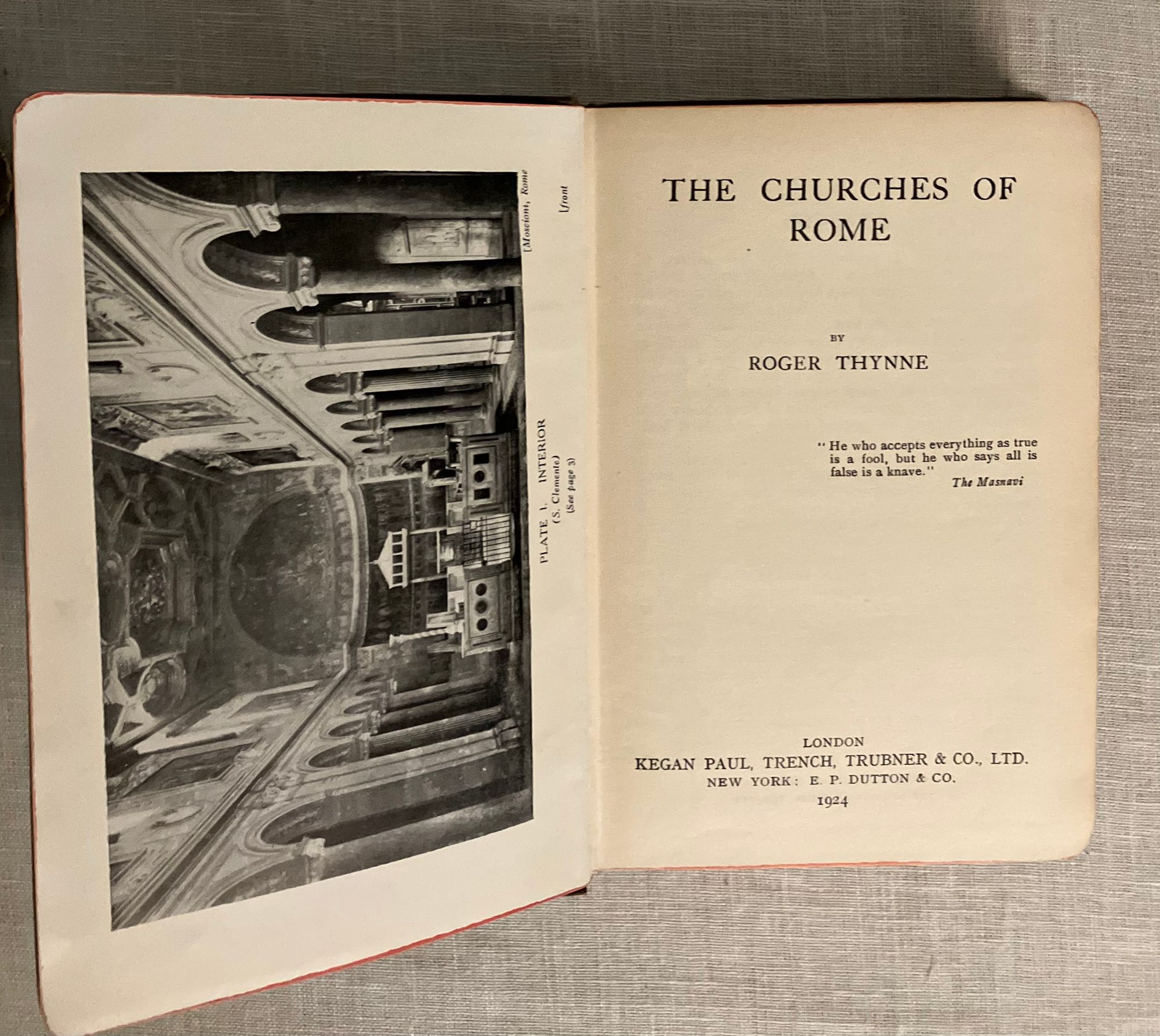 Hard cover, 12mo, bound in black leather-covered (flexible) boards with double rules of red horizontally across the boards and spine, between which are titles blocked in gold. Curved corners to boards. Top of text block edges are stained brown, with white wove end papers, and illustrated with some 48 black and white halftone photo reproductions, and with a color foldout map at the rear of the book. Printed in Great Britain by The Devonshire Press, Torquay, xxxii, 1-460pp. [4]pp. In English. CONDITION: Very Good. One small mark to boards. Some light shelf wear and a bit of fray at the head and tail of the spine. Inside is clean, hinges in order, and pages are only slightly age-toned. A still very useable quide to its subject for the tourist or art historian, which the Author describes as his personal selection of favorites to show visitors to the Eternal City. The Foreward gives a brief history of the Christian Church in Rome, and a vocabulary for discussing the architectural components. Descriptions of 35 individual churches follow, each with their own chapters on the origins, decorations and particular merits to be found within, and feast day calendar.