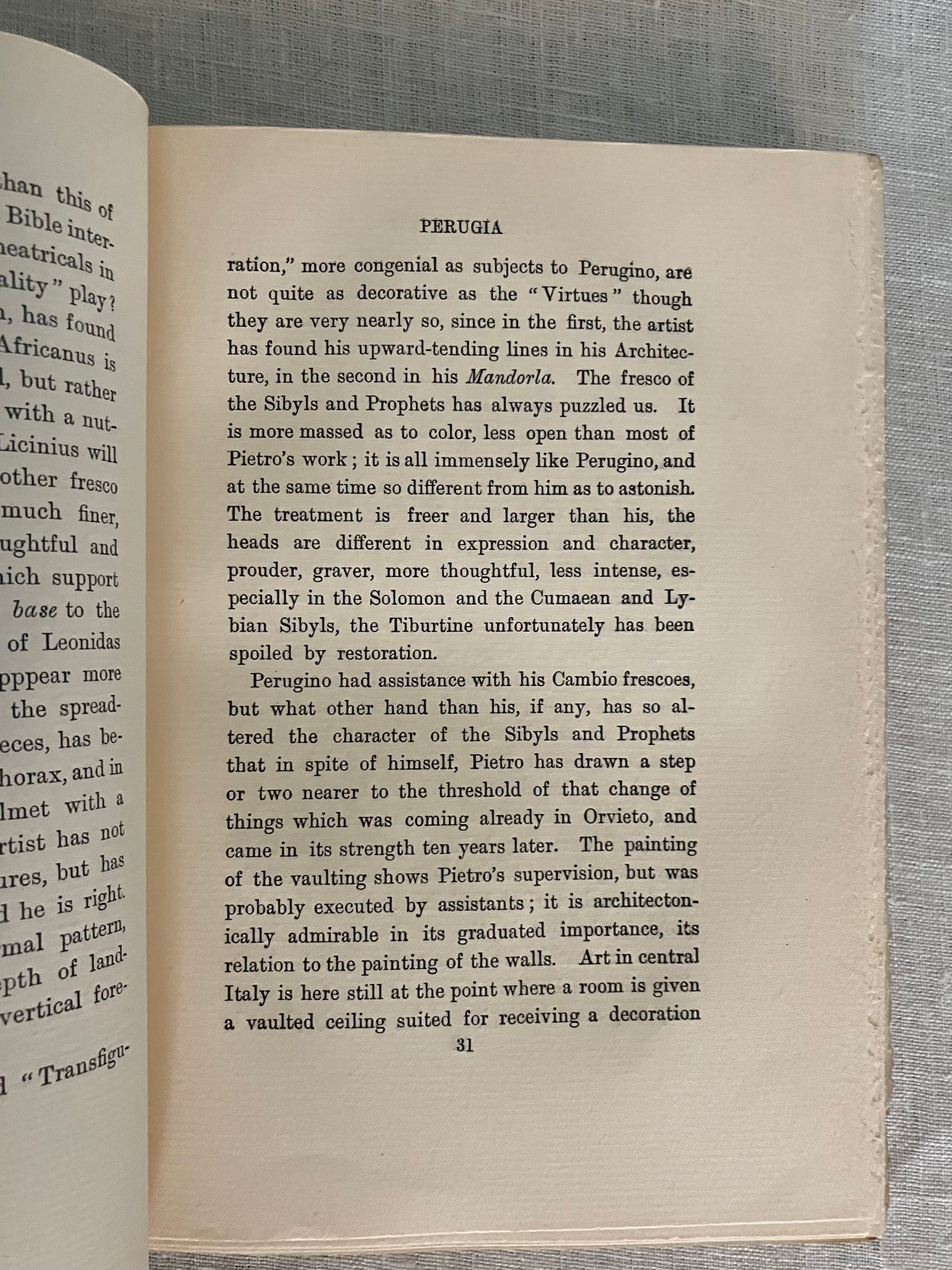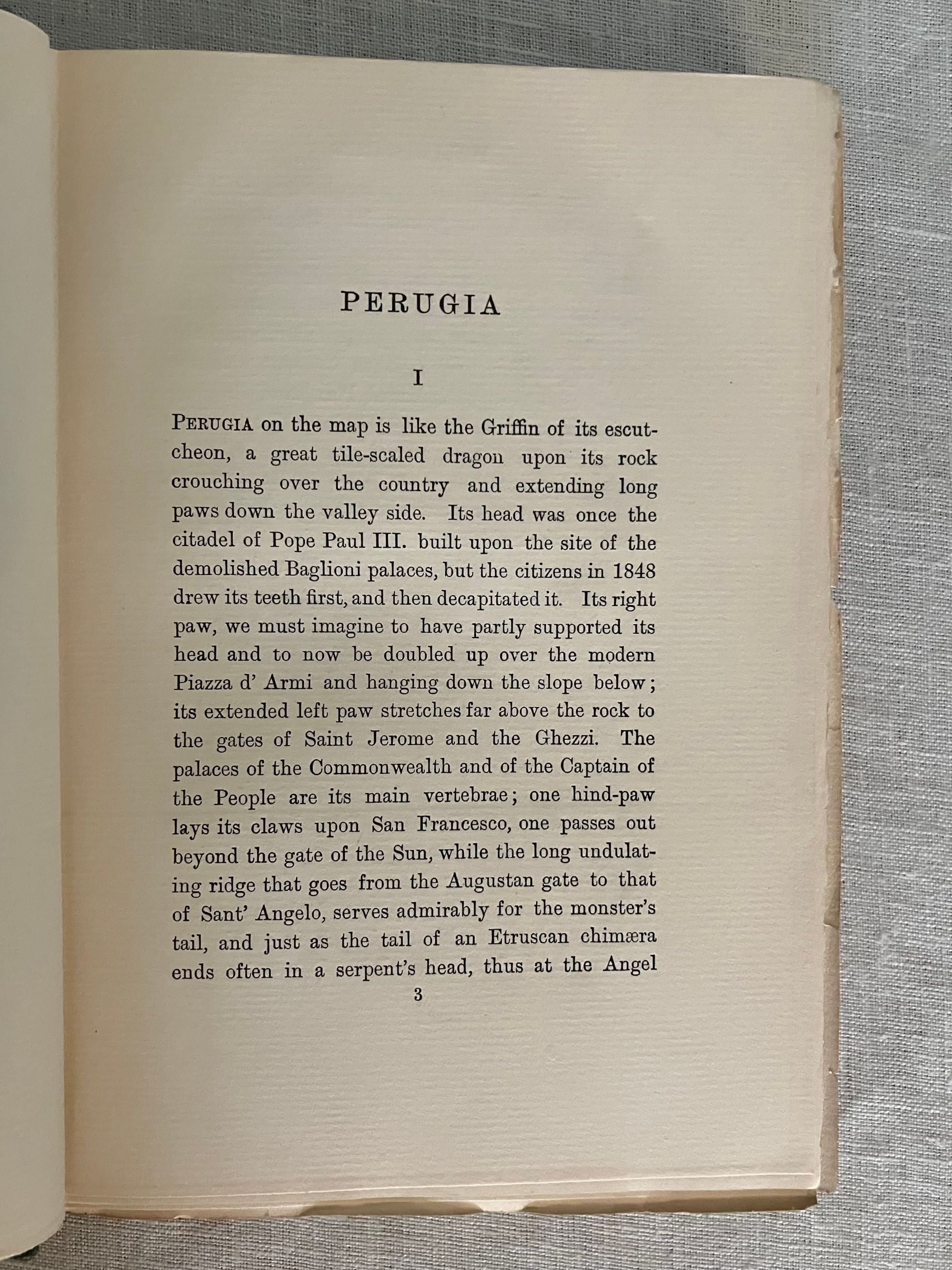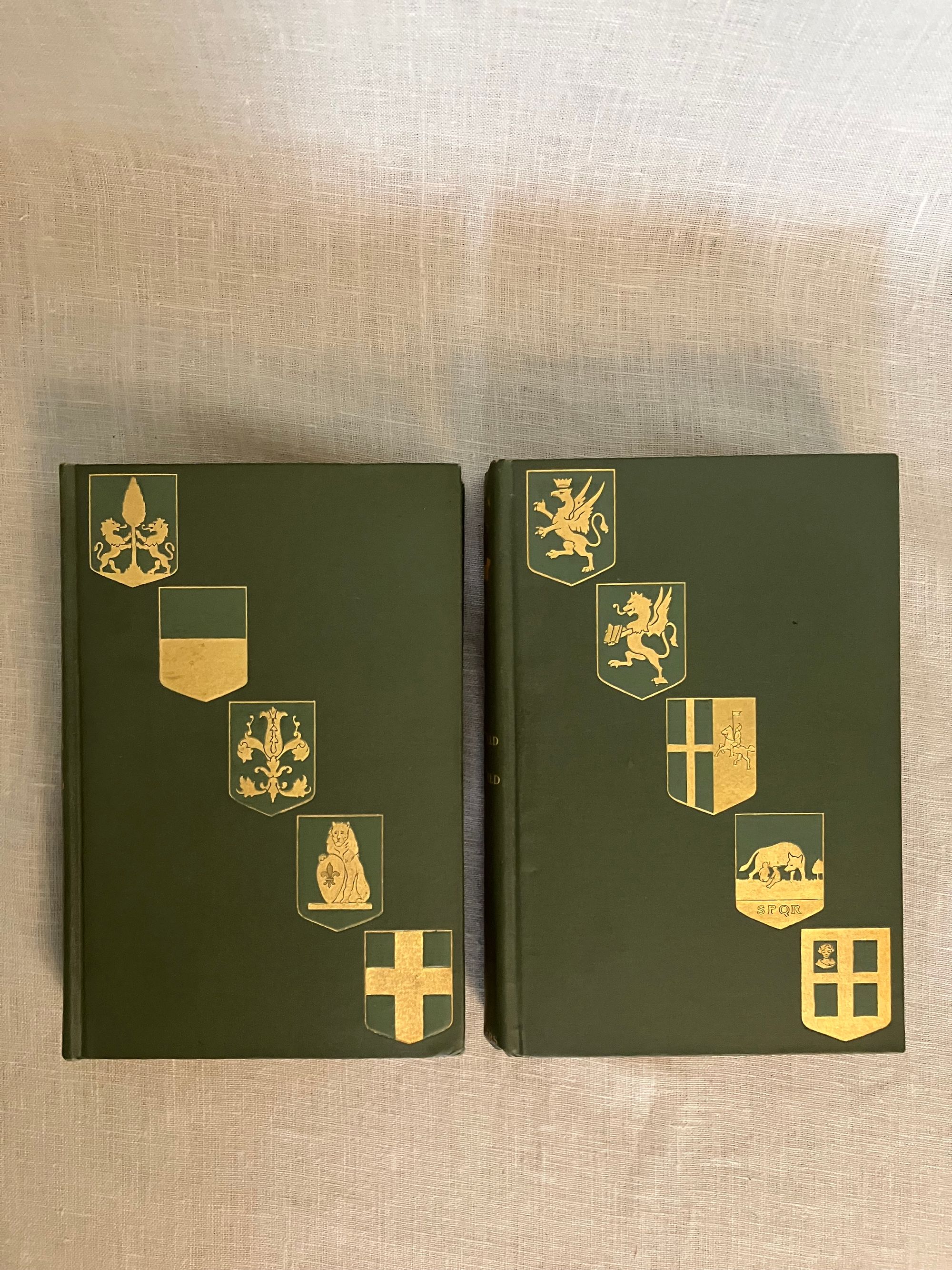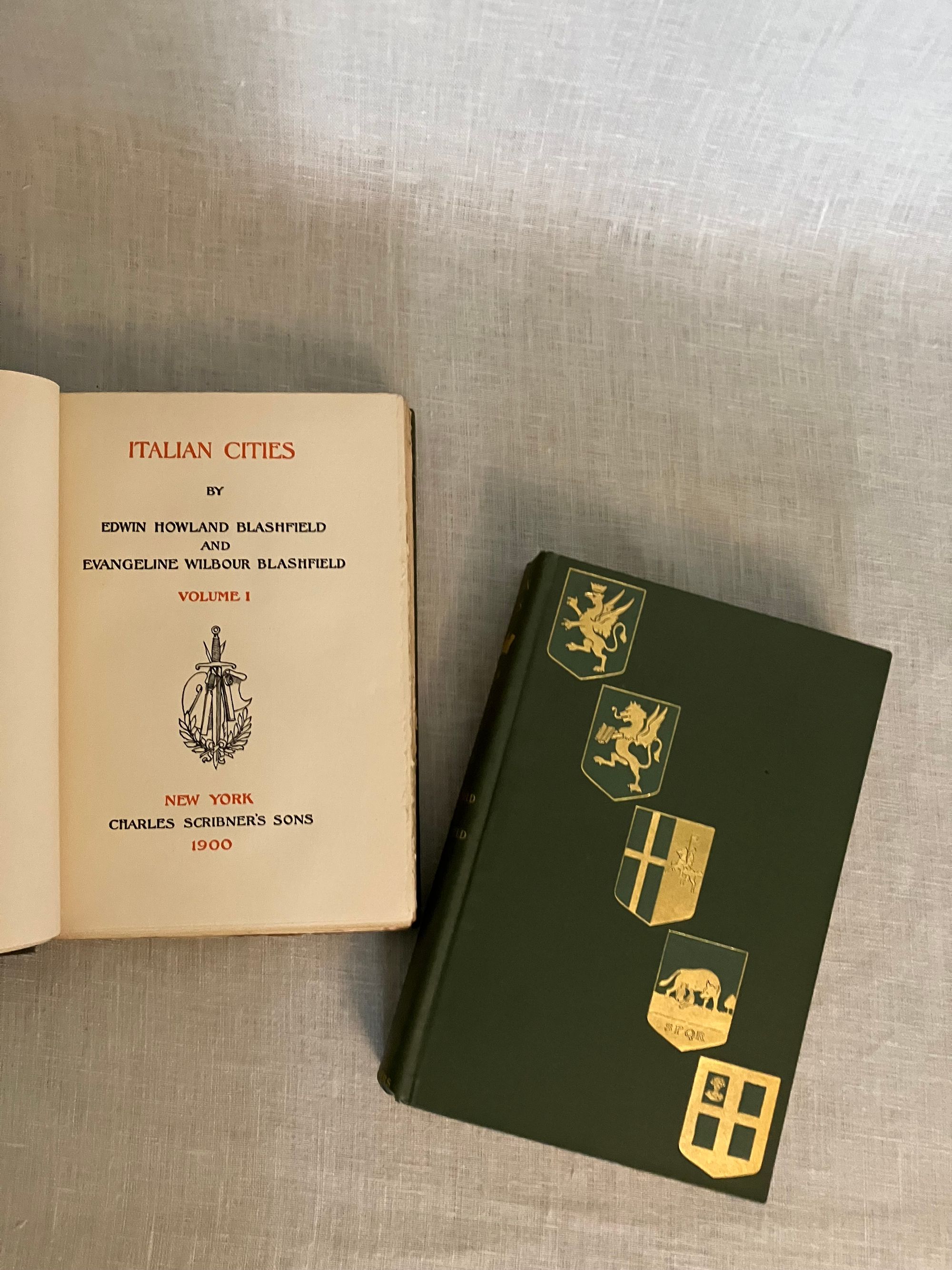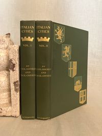 Hard cover, 8vo, in green cloth, each decorated with the design of four heraldic shields of cities contained in the two volumes, blocked in gold and green, and with titles to the spine. Title pages are in black and red. Top edge gilt, others untrimmed, the work printed upon laid paper. Copyright 1900. Printed by University Press, John Wilson and Son, Cambridge, U.S.A. In English. VOL. 1: vi, [erratta insert] 296,[4] pp. VOL 2: vi, [erratta insert], 310, plus 1 pg. publisher's ads, [3] pp. **CONDITION: Near Fine. Clean, firm, bright. One minute spot to front board Vol. 2, (otherwise fine.) Lacking dustjackets. **The authors give their personal impressions of these Italian cities, with reference to political rivalries and foreign incursions through the ages as indicative of regional character. The artists Correggio, Perugino, Raphael, Brunelleschi, Giotto, Dante and Mantegna receive special art historical attention, as does the art of fresco and mosaic. Not really a travelogue, although they mention rail travel, nor a catalogue of specific sites to visit and how to get there. This is very much more so an impressionistic appreciation of places the authors must have spent a great deal of time in, pursuing their art, and in observation of changes brought by, for instance the late nineteenth century attempts at urban renewal and sanification to the city centers. Chapters cover Ravenna, Siena, Parma, Perugia, Cortona, Spoleto, Assisi, Raphael in Rome, Florentine Sketches, and Mantua. **AUTHOR Edward Howland Blashfield, (1848-1936) was a celebrated muralist of the classic tradition in the period before the First World War, whose work included decoration of the Library of Congress. Born in New York, he attended Harvard and MIT as an engineering student, before being recognized for his artistic skills. He studied art in Paris, returned to the United States and won a commission to paint a mural at the World's Columbian Exposition, which led to further public and private commissions. His wife, Evangeline Wilbour Blashfield (1881-1918), the Rhode Island-born daughter of a noted Egyptologist, spent time living abroad before her marriage in 1881. She wrote, or co-wrote with her husband, several books on art topics. The couple lived abroad for fifteen years after their marriage. (from American Art News, Nov. 23, 1918.) An interesting read.