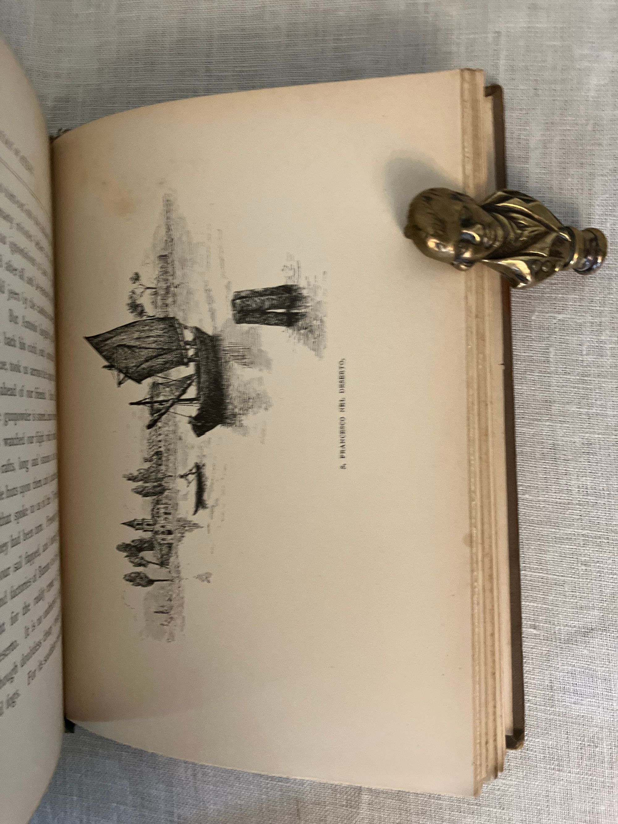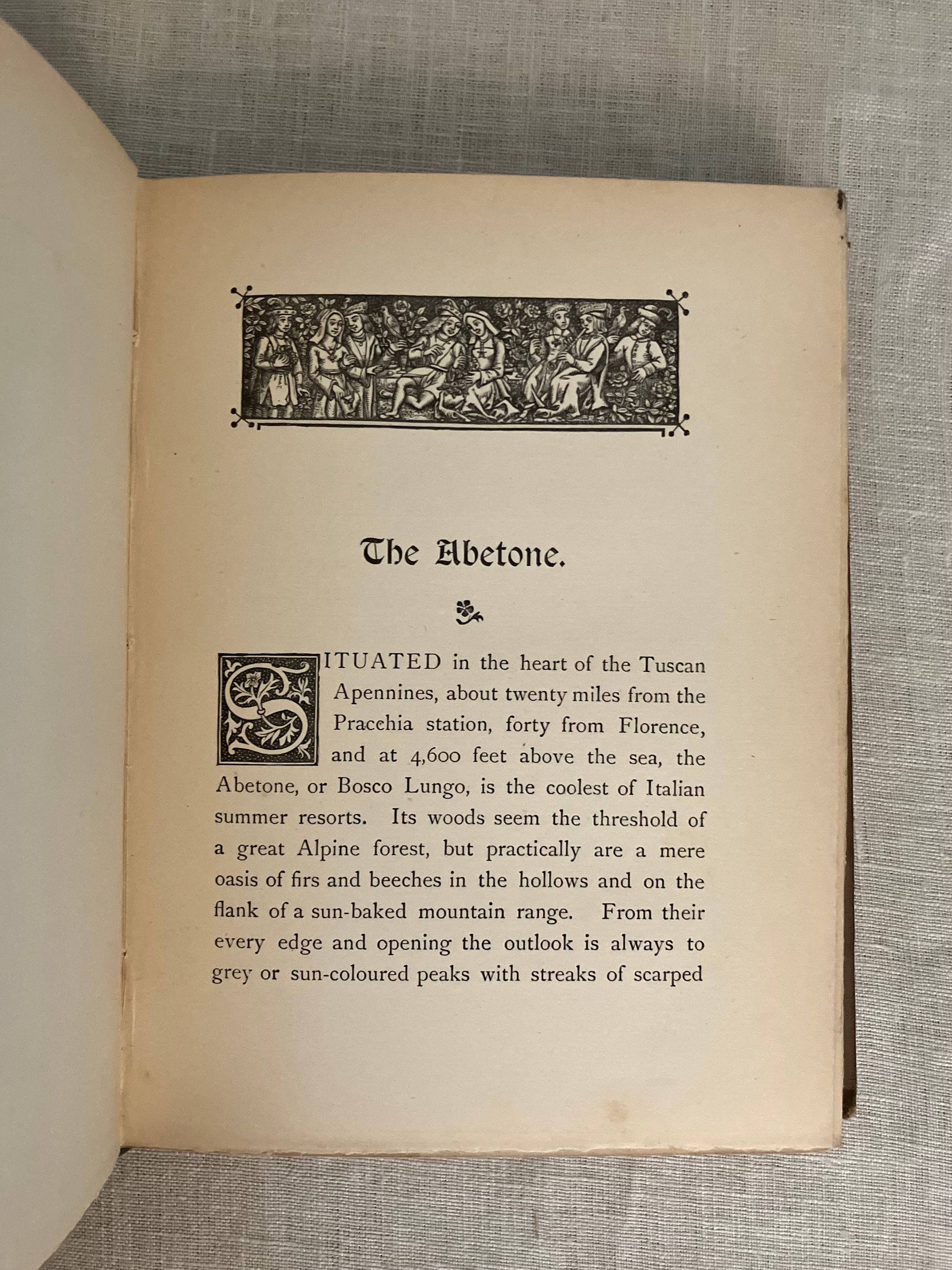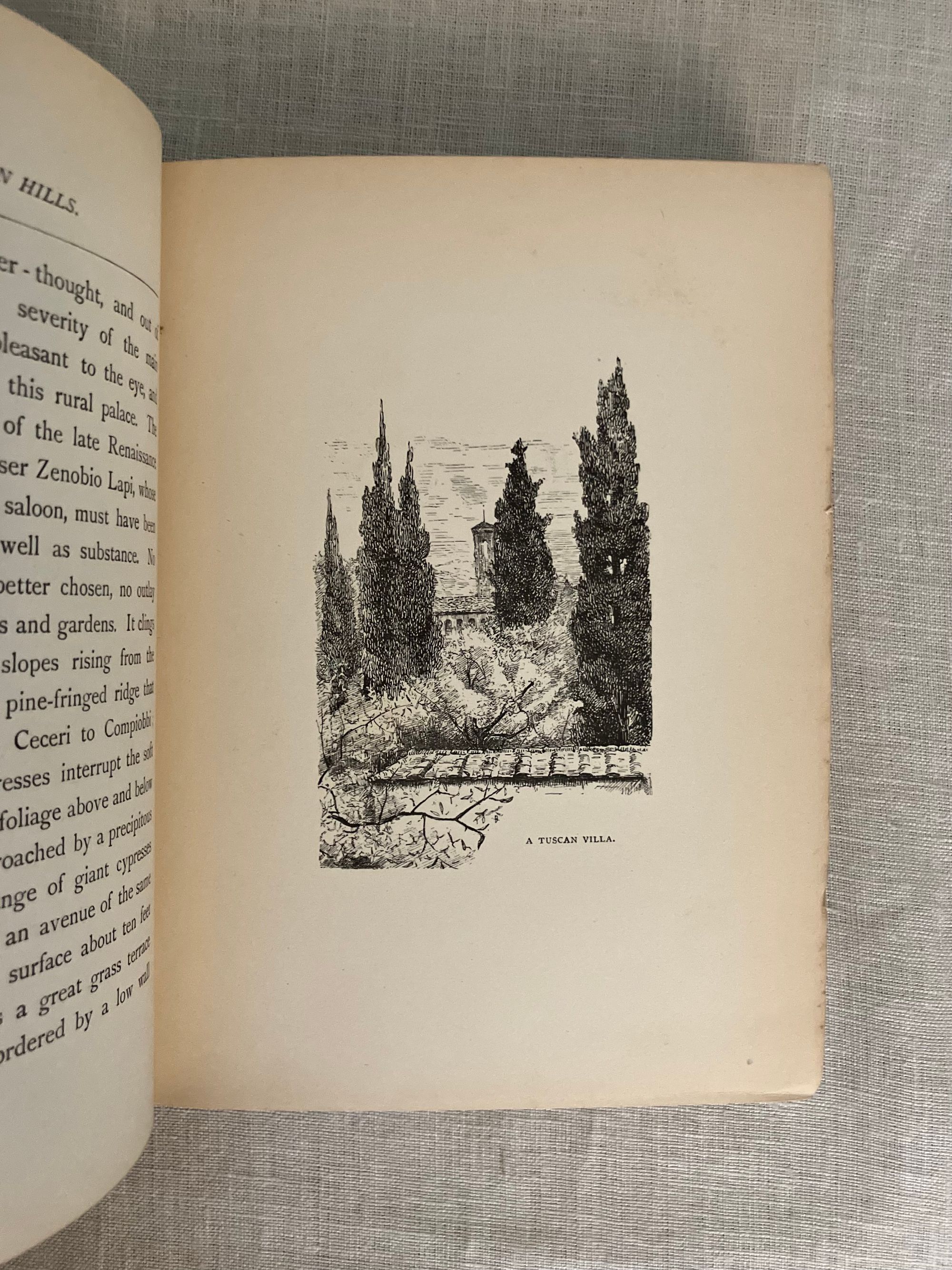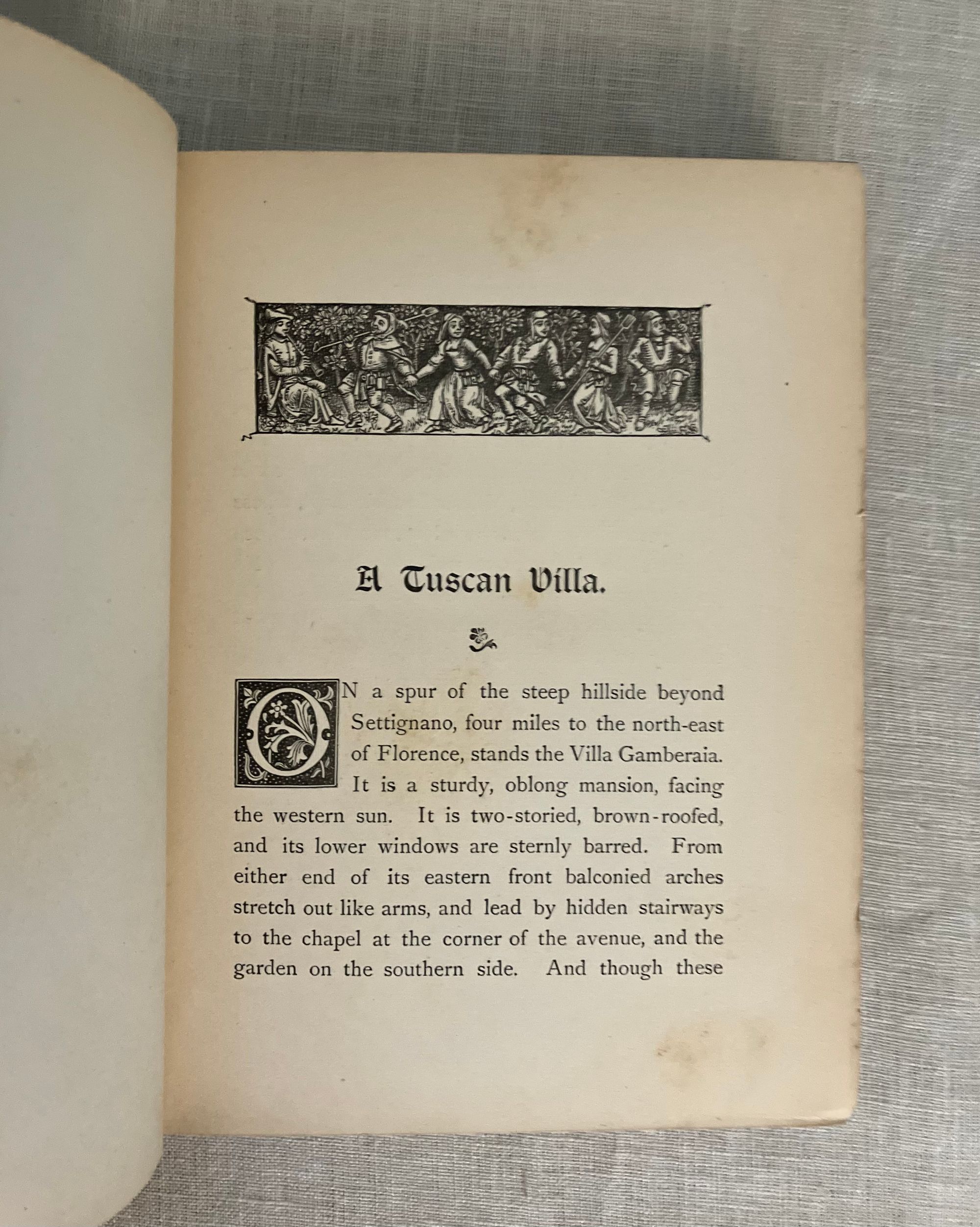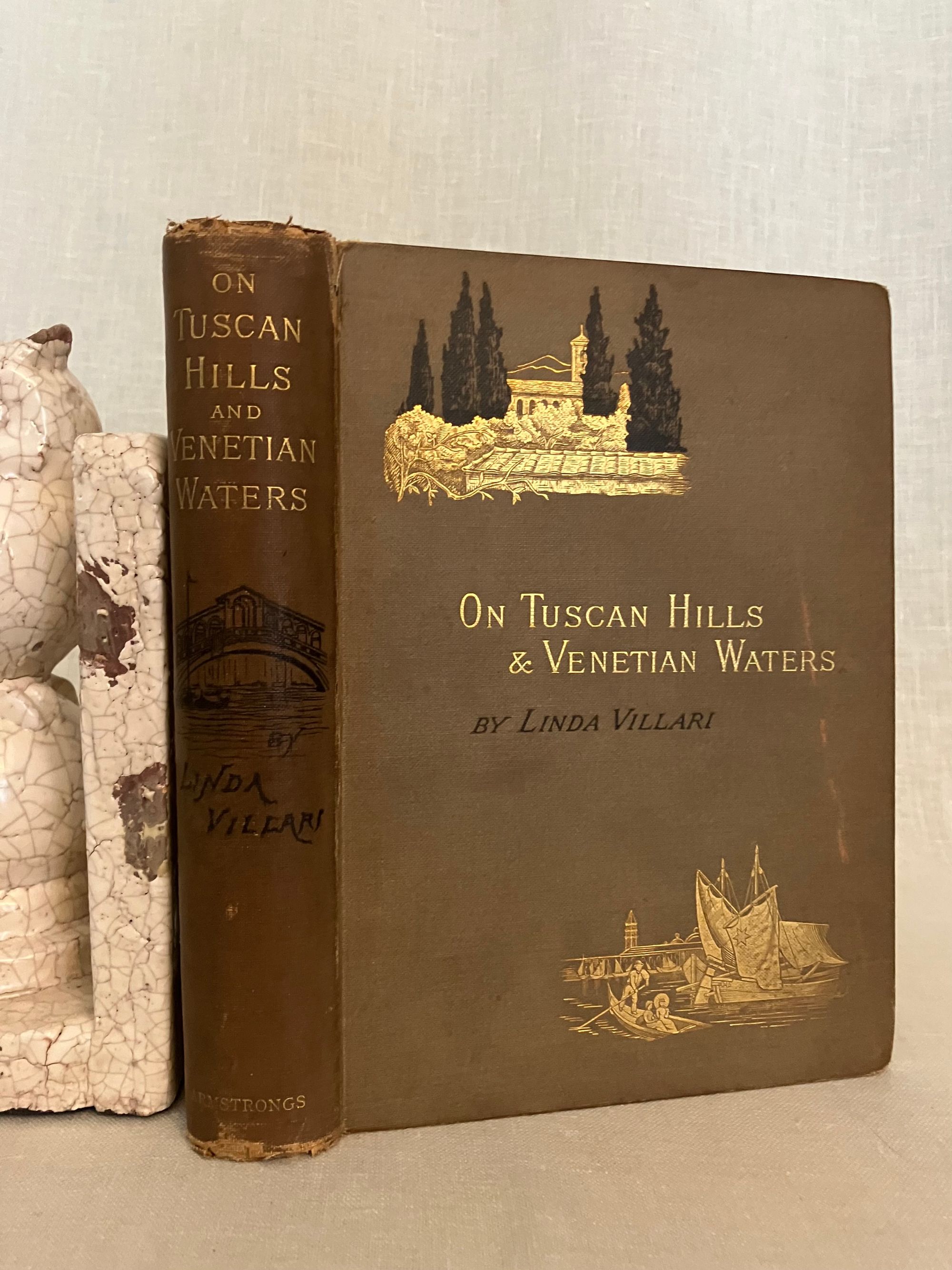 First American Edition, (First English edition was in 1885). Hard cover, 12mo, in olive green cloth with the pictorial cover blocked with landscape and nautical scenes in gilt and black to the front board, the titles and a view of Venice's Rialto Bridge on the spine. Top edge gilt. Illustrated with 10 black and white reproductions from etchings, including the tissue-guarded frontispiece, as well as renaissance-style headers and footers. viii, 280 pp. In English. Printed from the T. Fisher Unwin plates presumably, with their Gresham Press colophon at rear of work. (The cancel title page does not carry the advertisement, on the verso, of the Unwin edition.) **CONDITION: Good. Mark to front board, spine a bit darkened, with some losses of the cloth at head and foot of spine. A one inch split at head of front joint. Inside, both hinges somewhat loose. Occasional foxing and soiling. Still, a pleasing, functional copy of an interesting book. **This travelogue advises on the residence and travels of the English Author (and her second Italian husband) made around Tuscany and Venice in the early years of the twentieth century. Life at the historic Villa Gamberaia, in Settignano on the northeast outskirts of Florence forms the first part of the book, (where Napoleon III was once sequestered while his father invaded Italy.) The integrated house and garden design are extensively commented on. Further north, she writes about the scenic, mountainous commune of Barga, with its Duomo and artworks by the Della Robbias, whose history was so wrapped up in the conflict between the warring Florentine, Pisan and Lucchese dukes. The area's local silk manufacture is mentioned; a trade in which the Author's father was engaged on back in England. The Abetone, a mountainous central Tuscan resort town, forms the third part of the author's narrative, followed by the Palio Races at Siena and festival at Bocca di Rio. Cultural comment on the method of rentals and the hiring of man-servants is made for the prospective ex-pat. The second part of the book, based upon visits to Venice, offers impressions of summering in San Samuele, with descriptions of the distribution of fresh water by barge and gondola, traveling by steam launch to the beach at the Lido, as well as many investigations of lesser-known art treasures and destinations, found down the "side canals" of La Serenissima.