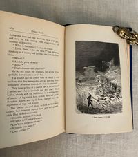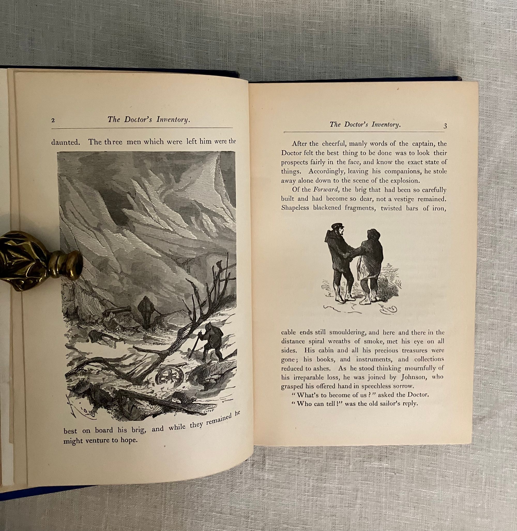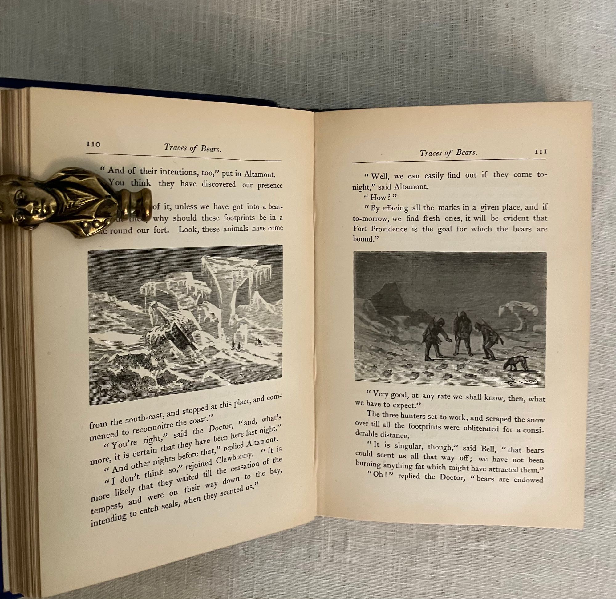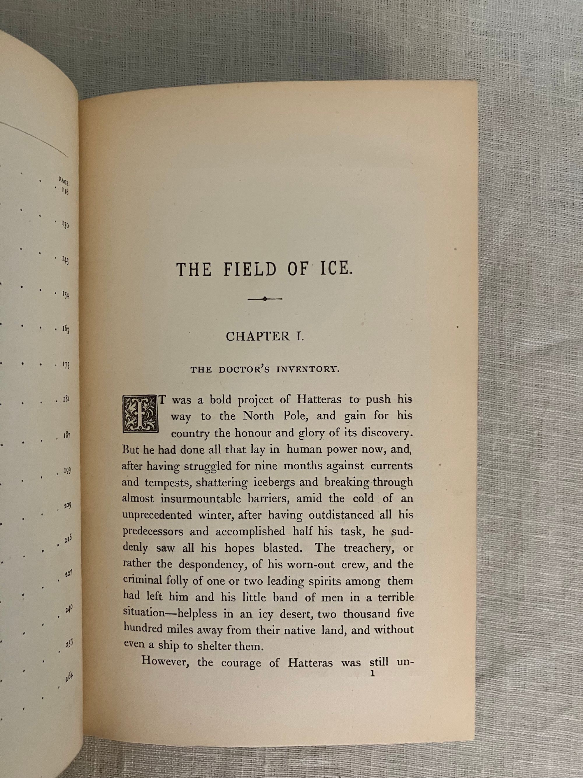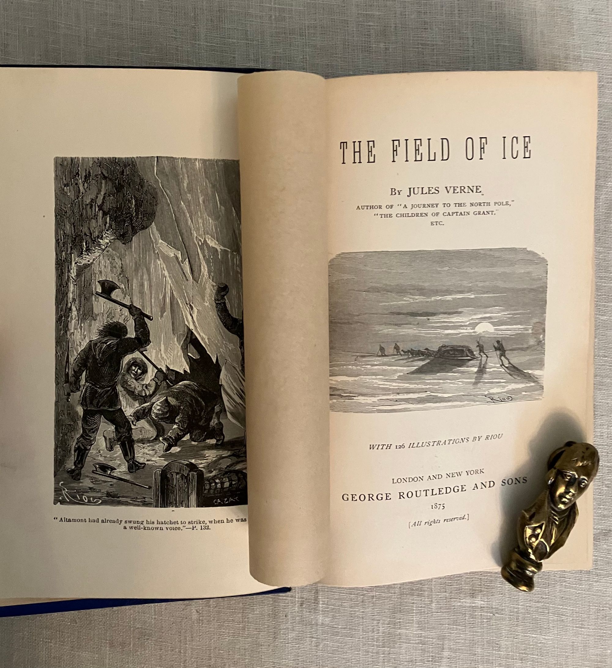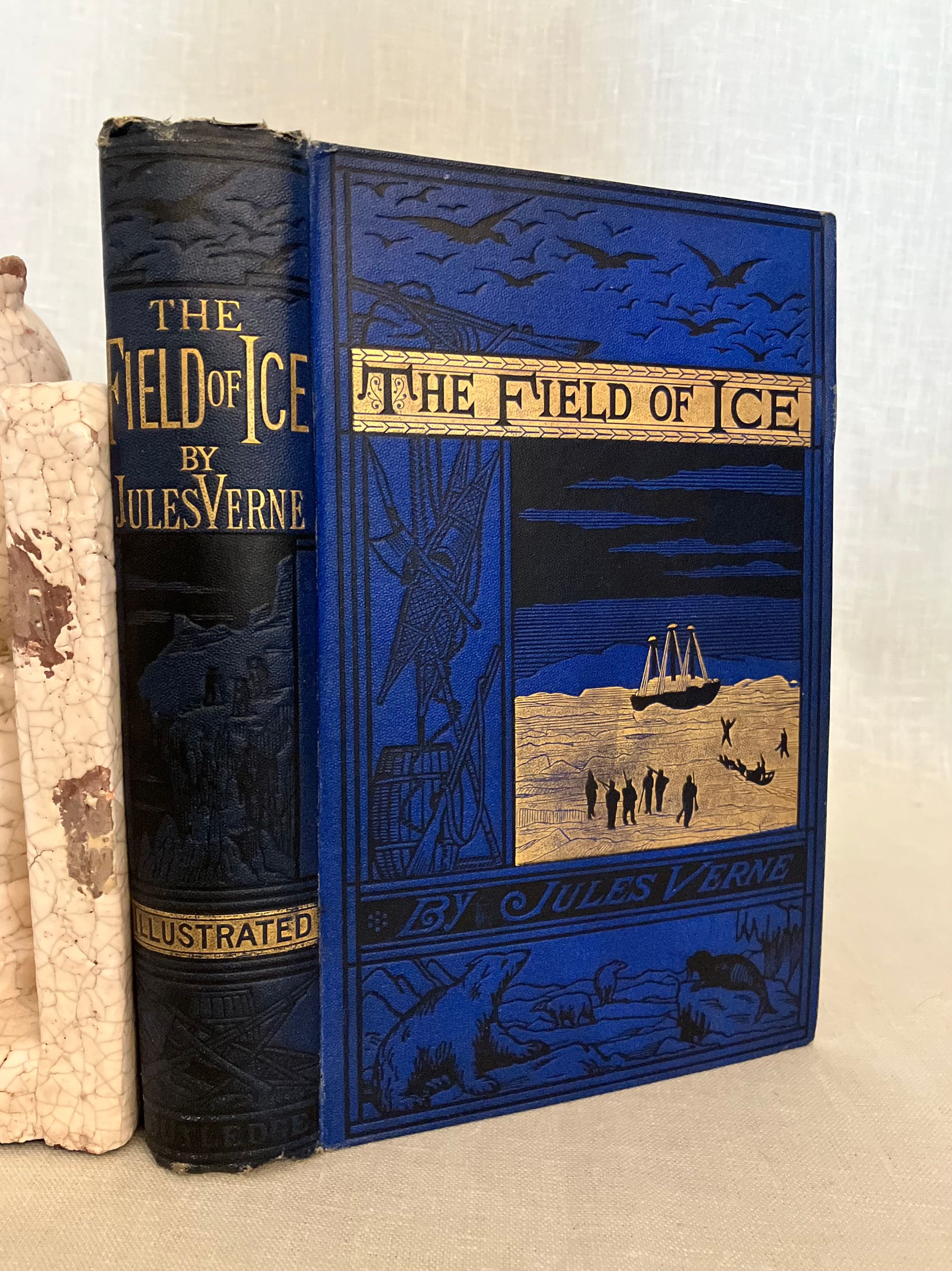First British Edition. Hard Cover, 8vo., in the original publisher's blue cloth pictorial binding, with title and image of sailing ship at the edge of an ice pack, with men and a dog-sled in foreground, blocked in gold and black. Additional sections of the front depict sea birds in flight, Arctic equipment, polar bears and seal, all in black. The rear board is plain. The spine has titles and the word ILLUSTRATED blocked in gold within rules, the other sections depicting birds in flight, climbers surmounting an icy couloir, and ships stores. Top edge stained olive green. Cream glazed endpapers. Ex library, with old bookplate to endpaper. A tissue-guarded frontispiece illustration of four men in fighting in an ice cave is opposite the title page. A total of 126 illustrations are within the text, including 24 full page (unpaginated) plates. Printed by Simmons & Botten, Shoe Lane, E.C.Bookbinders label affixed to rear endpaper: "Bound by Burn & Company."**CONDITION: Generally Very Good Minus. Slight lean. Some light rubbing to covers is seen at joints and tips. The top of the spine is a bit frayed, while the foot is crumpled with several small 1/8 inch splits. Gold somewhat dulled. Library bookplate to endpaper and stamp to foot of copyright page (no card holder.) The remains of two pieces of old tape are across the front hinge which is only intermittently cracked and still holding firm. The rear hinge has one two-inch split, but holding. A few spots of fox to binder's front fly only. Pages remain bright. Small hole to frontispiece tissue. Now in mylar.**COLLATION: iv, 269, [1], plus publisher's advertising section titled "George Routledge & Sons'/ Juvenile Books" [3],4-16 pp. **"THE FIELD OF ICE" is the second volume completing the story of "The Adventures of Captain Hatteras." First released in French in 1864, and in its revised form in 1866, when the ending was amended. Captain John Hatteras is a fictional British explorer who leads an expedition to conquer the North Pole. The start of this book finds the brave adventurers, having survived a mutiny and an explosion onboard the ship, the "Forward," clinging to life "in an icy desert". They are largely saved due to the scientific prowess of Doctor Clawbonny, whose inventions to protect the men from polar bears included a bullet from frozen mercury taken from a thermometer, and rigging a barrel of gunpowder to be remotely detonated using a battery and wires--high tech indeed for the 1860s. As is usual with Verne, he builds a story on a foundation of Victorian scientific knowledge, and occasionally adds elements which seem fantastical; in this case, the North Pole is occupied by an active volcano, which gets named "Mount Hatteras". **French ARTIST Édouard Riou (1833-1900) illustrated six of Jules Verne's novels, as well as others by Sir Walter Scott, Victor Hugo, and Alexandre Dumas.** REFS: Gallagher, Mistichelli & Van Eerde A16, Myers 58, Bleiler: The Checklist of Science-Fiction and Fantasy p199.
