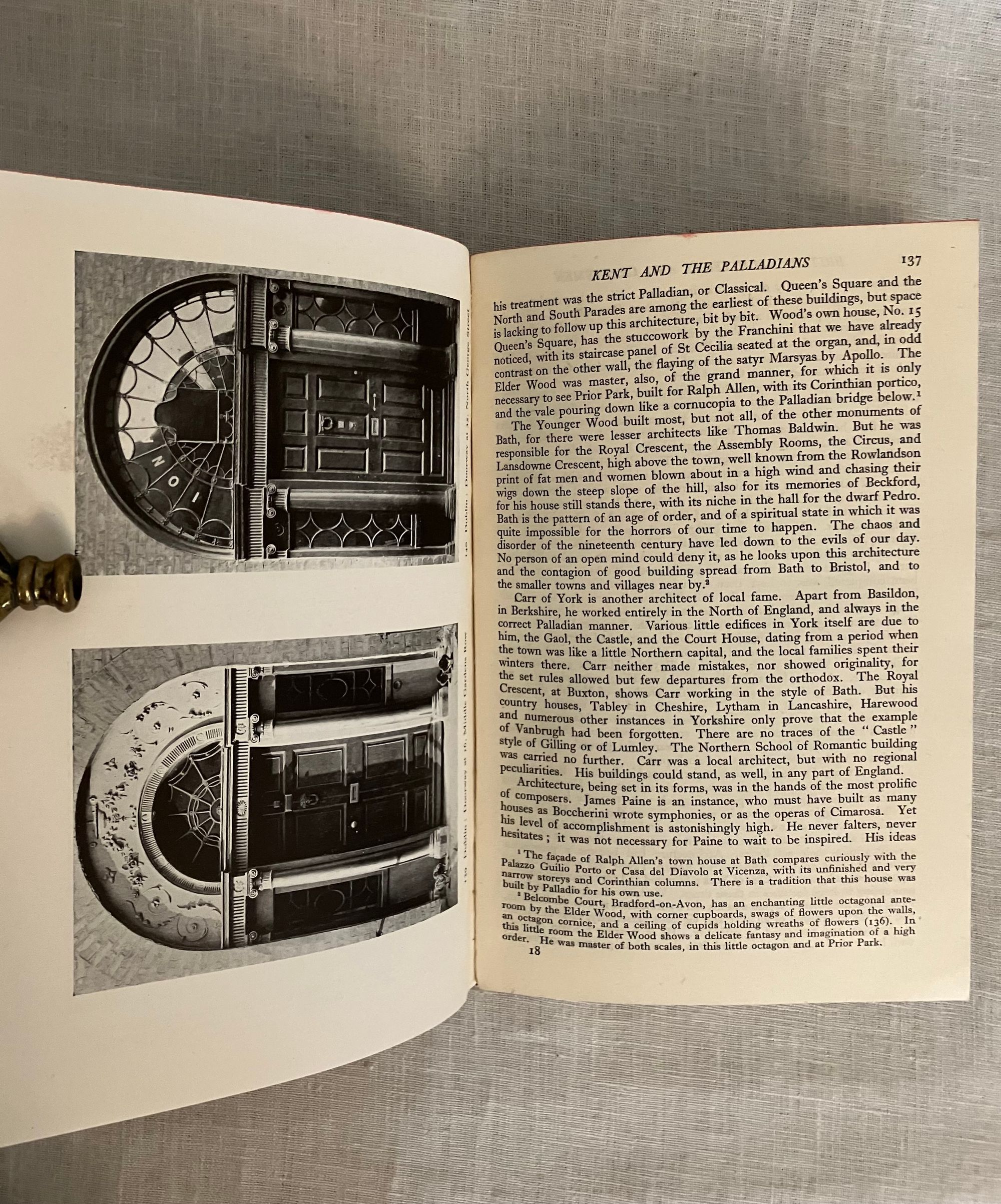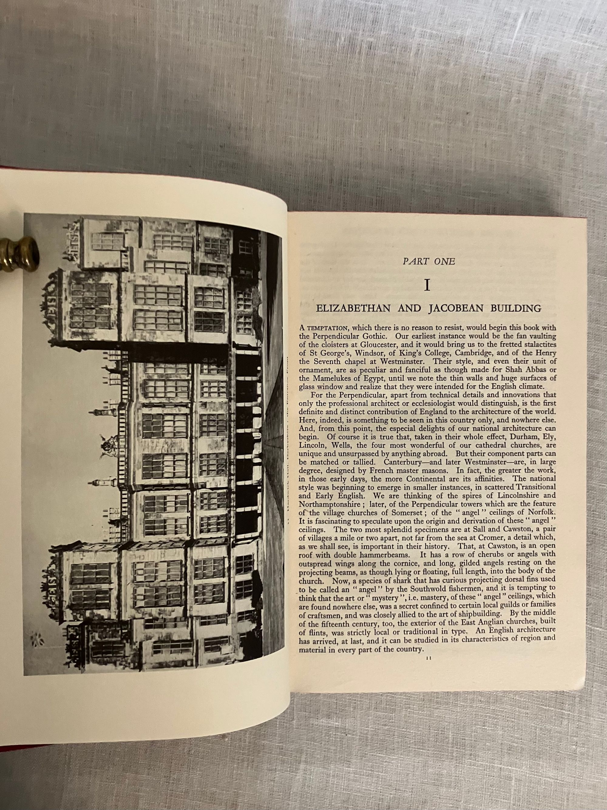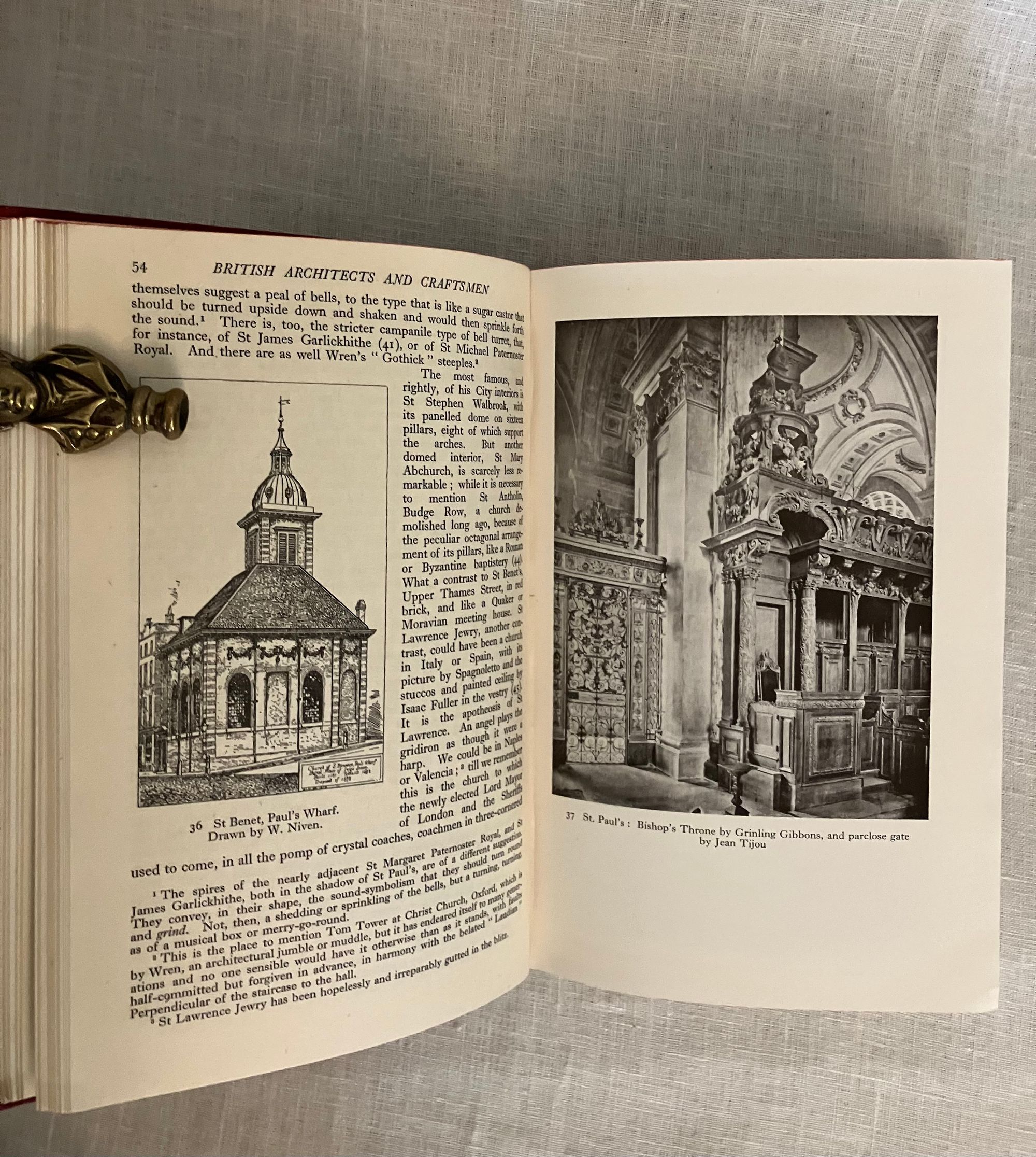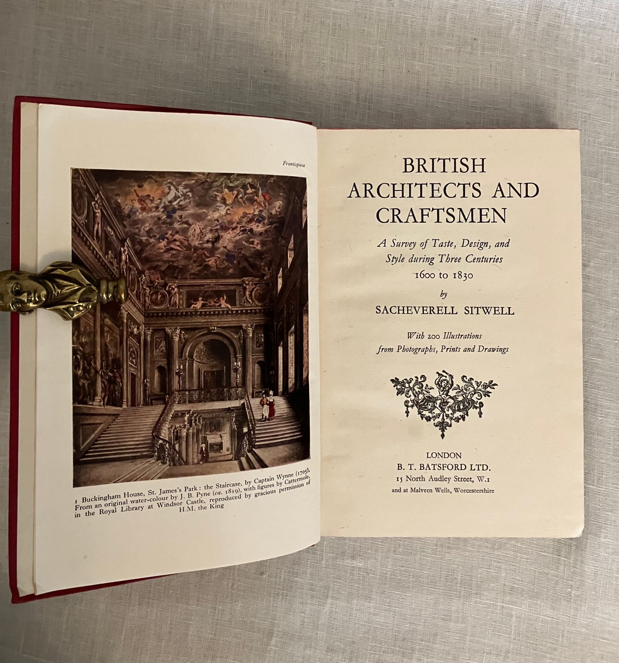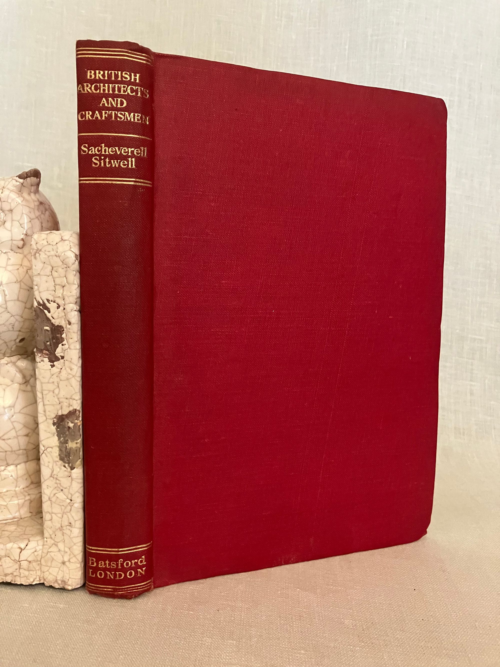 Hard cover, 8vo in red cloth with titles to the spine in gold. Brown end papers color frontispiece and illustrated with 200 reproductions from photographs, drawings and paintings. viii, 196 pp., First Edition.**CONDITION: Very Good. Lacking dust jacket. Spine lightly sunned, with a bit of a lean and very minor fraying at rear joint, two bumped corners. Hinges in order. Former owner's name in fountain pen to end paper. **An interesting illustrated survey to a succession of British architectural styles--from the 16th century Elizabethan and Jacobean, specifically noting the works and influences on architects Inigo Jones and Sir Christopher Wren. The Rococo influence on various crafts, from ceramics, to Chippendale's furniture, to bookbinding are discussed, showing how changing tastes in design are reflected (The work of bookbinder Samuel Mearns is mentioned in this regard.) Wren's patronage of the master of Rococo style wood carving, Grinling Gibbons (d. 1723) is made evident; his work on Windsor Castle, Hampton Court Palace and various London churches and great houses, made the the walls and panelling come alive in three dimensional splendor in imitation of fruits, fabrics and other very realistic forms. Finally, the more restrained Georgian style of architect Robert Adam and his successors is discussed . **AUTHOR Sacheverell Sitwell, 6th baronet, was one of an influential triumvirat of writers and artists in 1920's and 30's London, who along with his elder sister and brother Edith and Osbert Sitwell, promoted the work of some of the Modern English poets of their generation in the "Wheels" anthologies of the 1920's.