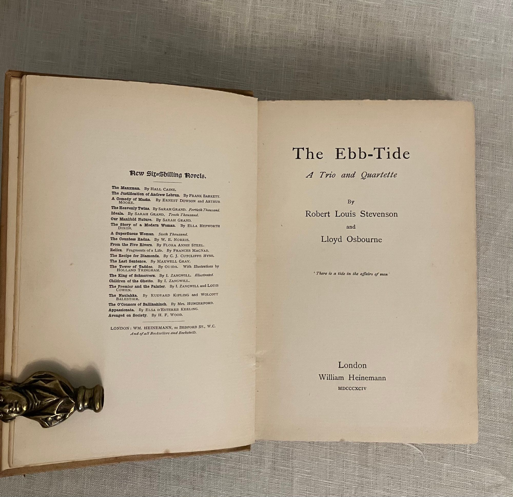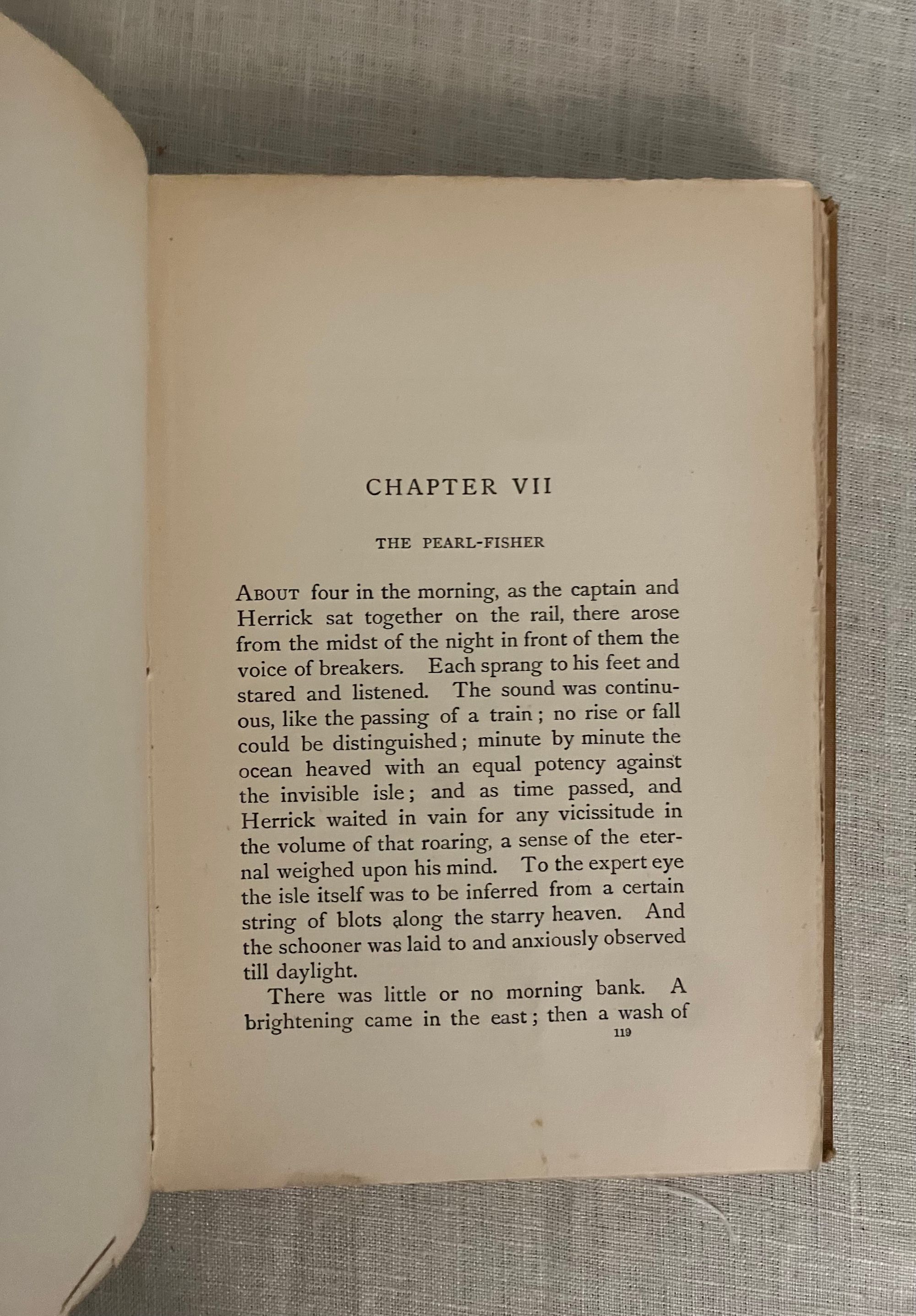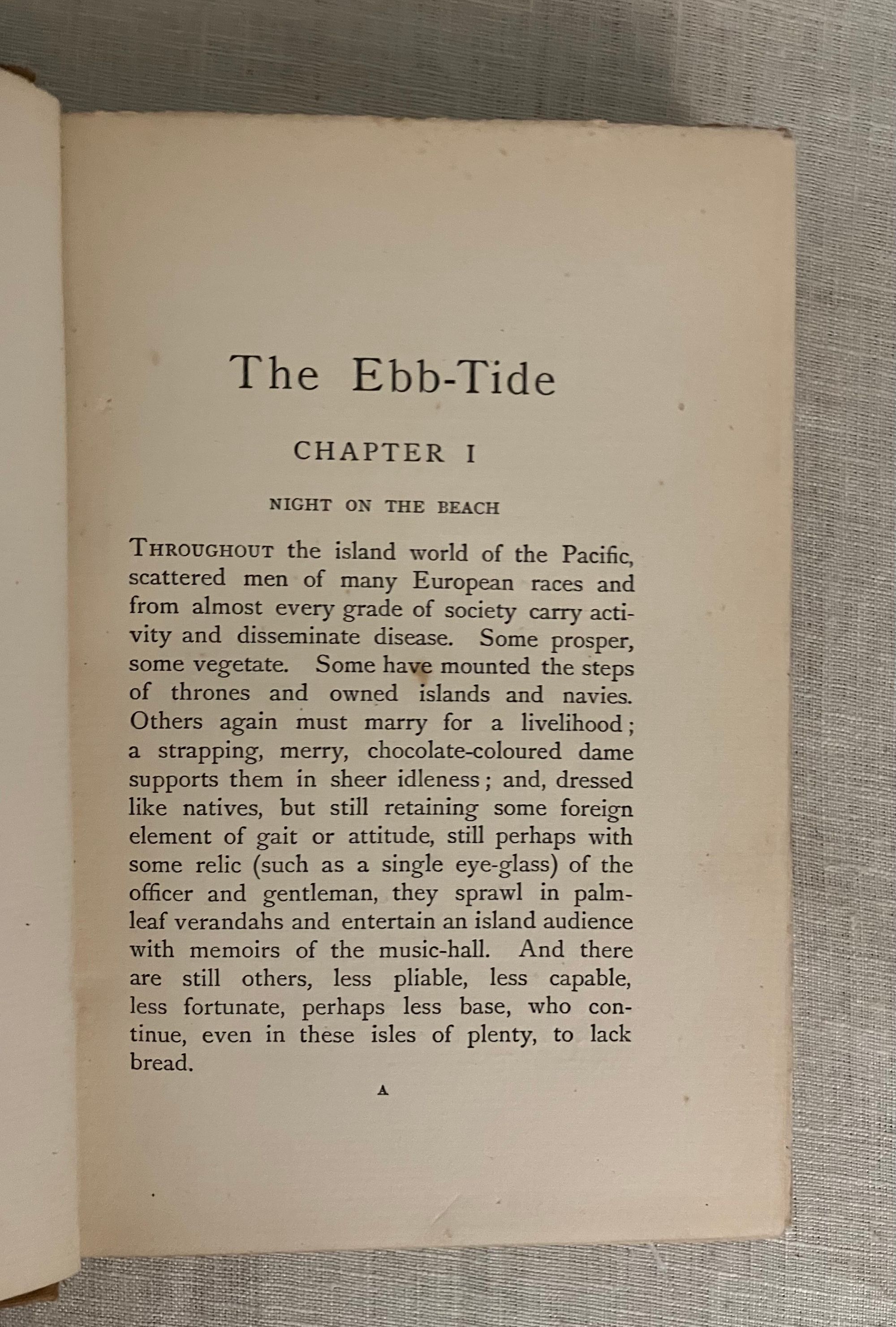 First British Edition, published September, 1894 and dated by the publisher's catalogue of August, 1894-- no copyright noted. Hard cover, 8vo., in gold silk-like cloth covered boards, the front blocked in black with pictorial image of a sailing ship consumed by towering, Hokusai-like waves, with a sunrise and island in the background, the titles in black to the spine, and with the William Heinemann logo within a circle to the bottom right of rear board. Top and fore-edges untrimmed with bottom edge of text block trimmed. A list of "New Six Shilling Novels opposite title page. With running headers to chapters, half titles to the two sections (the second part of the story starts with "The Pearl-Fisher.)**COLLATION: [8], 1-237, plus 20pp. Publisher's Catalogue: "A List of Mr. William Heinemann's Publications," dated August, 1894.**CONDITION: Very Good. Some exterior soiling and minor fraying at foot and head of spine as seen in photos. Front hinge only with a very minor one inch split. Rear hinge in order. Pages moderately age toned, with a few spots of soiling in places, but generally clean. One midway crack in binding. Pages have been "opened" in the past, with a couple of rough edges, as expected. Now in mylar. ** An allegorical, modern South Seas novel written by famed Edinburgh-born adventure novelist Robert Louis Stevenson (1850-1894) in collaboration with his step-son [Samuel] Lloyd Osbourne and published in the last year of the primary author's life. The story concerns the travels of a disreputable trio of morally bankrupt British seamen, stranded on Tahiti by various ignominious folly. Herrick, a vastly educated Londoner, Captain Davis, of coastal Maine, and their companion Huish, a common thief and not really a sailor at all, find themselves starving, ill from influenza and sleeping rough on the beach. They must shelter in an abandoned colonial prison, hiding from real imprisonment by the French authorities. Capt. Brown hatches a plan to better their position when a British schooner, the Farallone, is abandoned in the bay-- three British crew members having succumbed to smallpox, leaving a native crew and a cargo of California champagne yet to be delivered to Sydney, Australia. Brown's short-sighted plan to steal the cargo and the ship, however, comes a cropper when they discover the original crew had already swindled the shipping company. The second part of the story unwinds the results of a new and dangerous plan of theft, murder and treachery. An interesting comparison to Conrad's Nostromo. REF: Col. W.F. Prideaux, A Bibliography of the Complete Works of Robert Louis Stevenson (1918), 40.