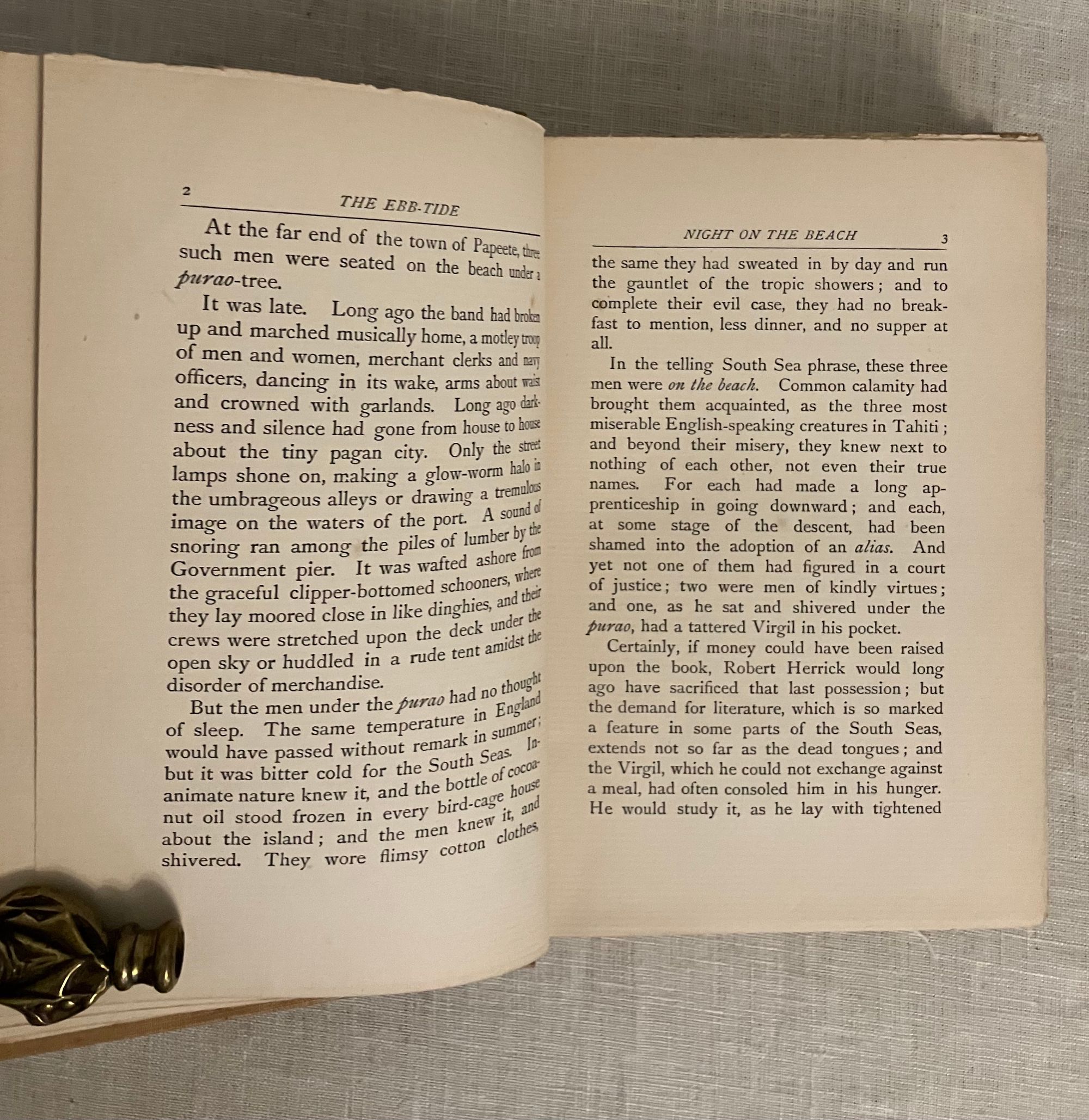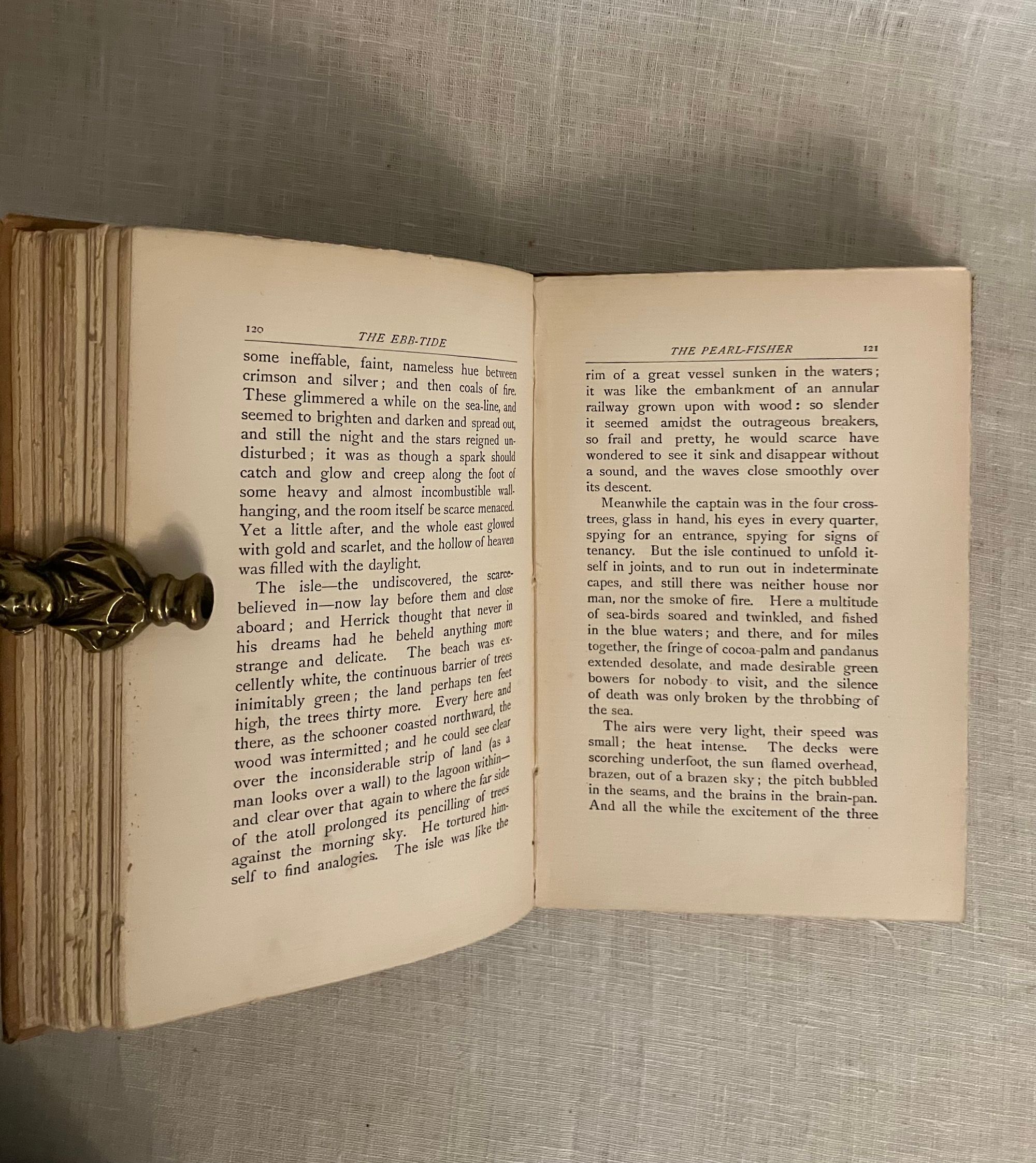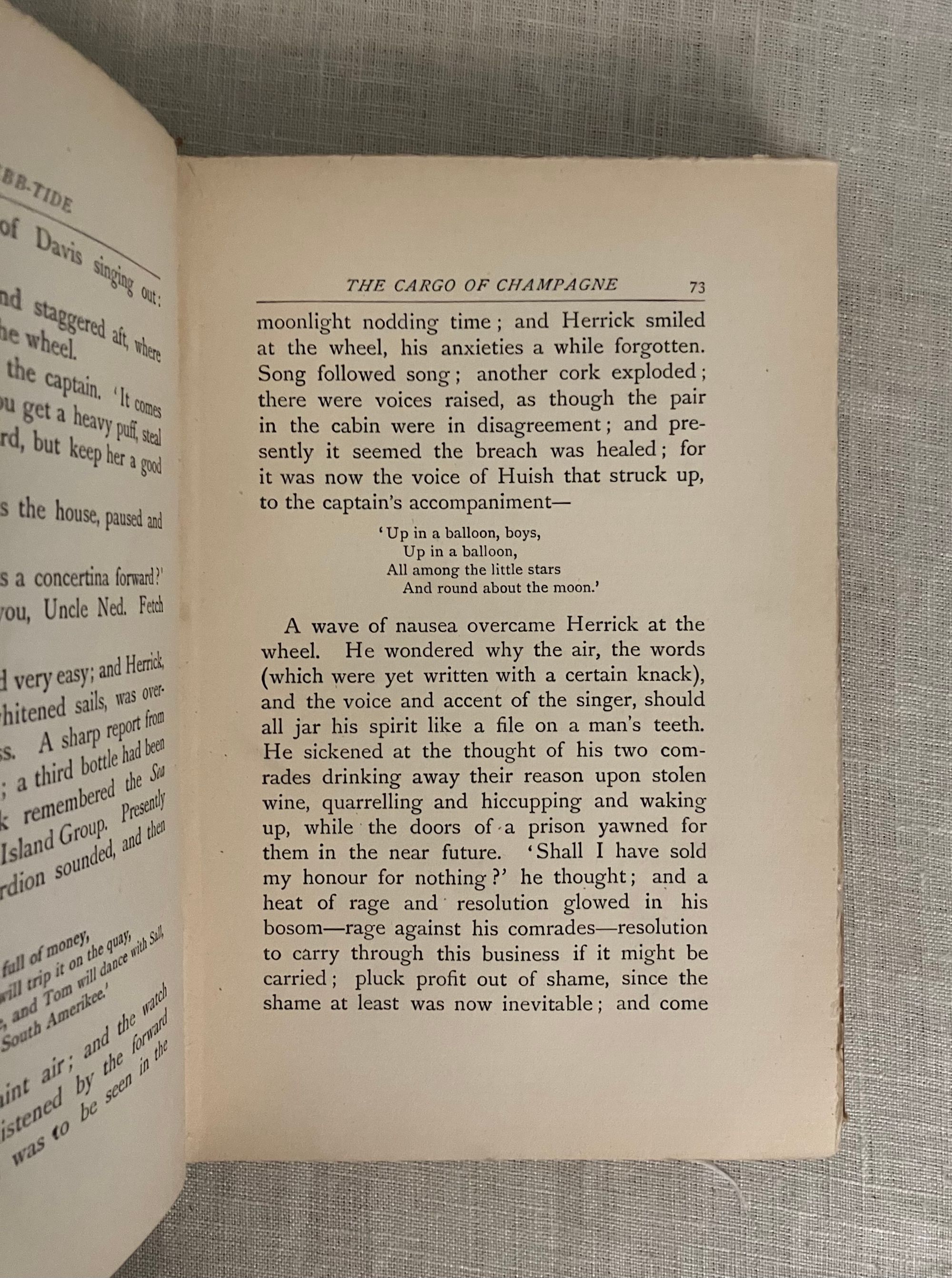 First British Edition, published September, 1894 and dated by the publisher's catalogue of August, 1894-- no copyright noted. Hard cover, 8vo., in gold silk-like cloth covered boards, the front blocked in black with pictorial image of a sailing ship consumed by towering, Hokusai-like waves, with a sunrise and island in the background, the titles in black to the spine, and with the William Heinemann logo within a circle to the bottom right of rear board. Top and fore-edges untrimmed with bottom edge of text block trimmed. A list of "New Six Shilling Novels opposite title page. With running headers to chapters, half titles to the two sections (the second part of the story starts with "The Pearl-Fisher.)**COLLATION: [8], 1-237, plus 20pp. Publisher's Catalogue: "A List of Mr. William Heinemann's Publications," dated August, 1894.**CONDITION: Very Good. Some exterior soiling and minor fraying at foot and head of spine as seen in photos. Front hinge only with a very minor one inch split. Rear hinge in order. Pages moderately age toned, with a few spots of soiling in places, but generally clean. One midway crack in binding. Pages have been "opened" in the past, with a couple of rough edges, as expected. Now in mylar. ** An allegorical, modern South Seas novel written by famed Edinburgh-born adventure novelist Robert Louis Stevenson (1850-1894) in collaboration with his step-son [Samuel] Lloyd Osbourne and published in the last year of the primary author's life. The story concerns the travels of a disreputable trio of morally bankrupt British seamen, stranded on Tahiti by various ignominious folly. Herrick, a vastly educated Londoner, Captain Davis, of coastal Maine, and their companion Huish, a common thief and not really a sailor at all, find themselves starving, ill from influenza and sleeping rough on the beach. They must shelter in an abandoned colonial prison, hiding from real imprisonment by the French authorities. Capt. Brown hatches a plan to better their position when a British schooner, the Farallone, is abandoned in the bay-- three British crew members having succumbed to smallpox, leaving a native crew and a cargo of California champagne yet to be delivered to Sydney, Australia. Brown's short-sighted plan to steal the cargo and the ship, however, comes a cropper when they discover the original crew had already swindled the shipping company. The second part of the story unwinds the results of a new and dangerous plan of theft, murder and treachery. An interesting comparison to Conrad's Nostromo. REF: Col. W.F. Prideaux, A Bibliography of the Complete Works of Robert Louis Stevenson (1918), 40.