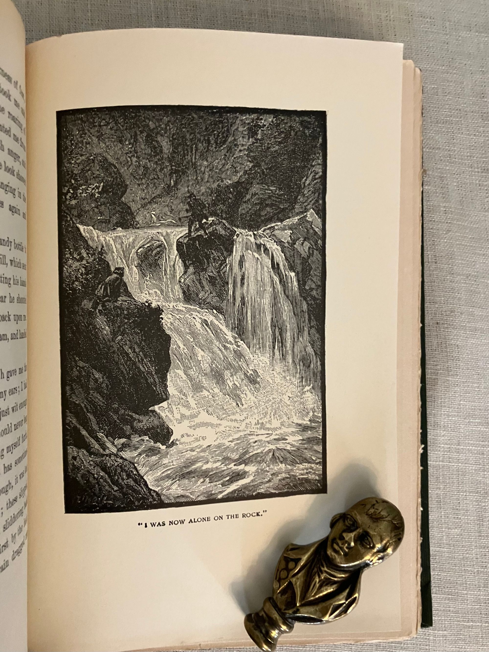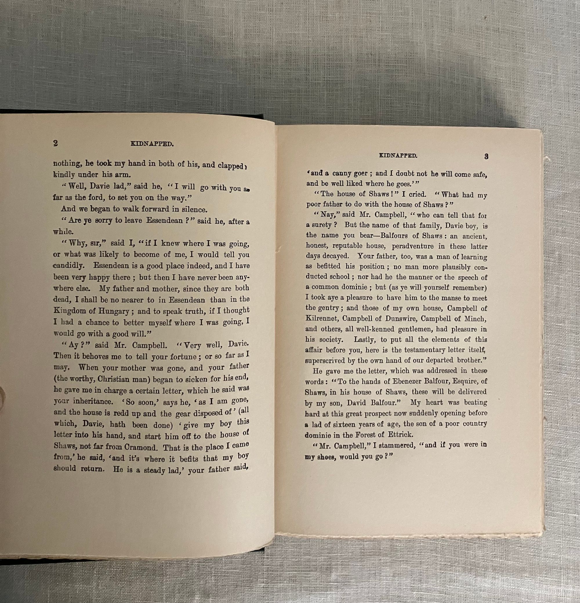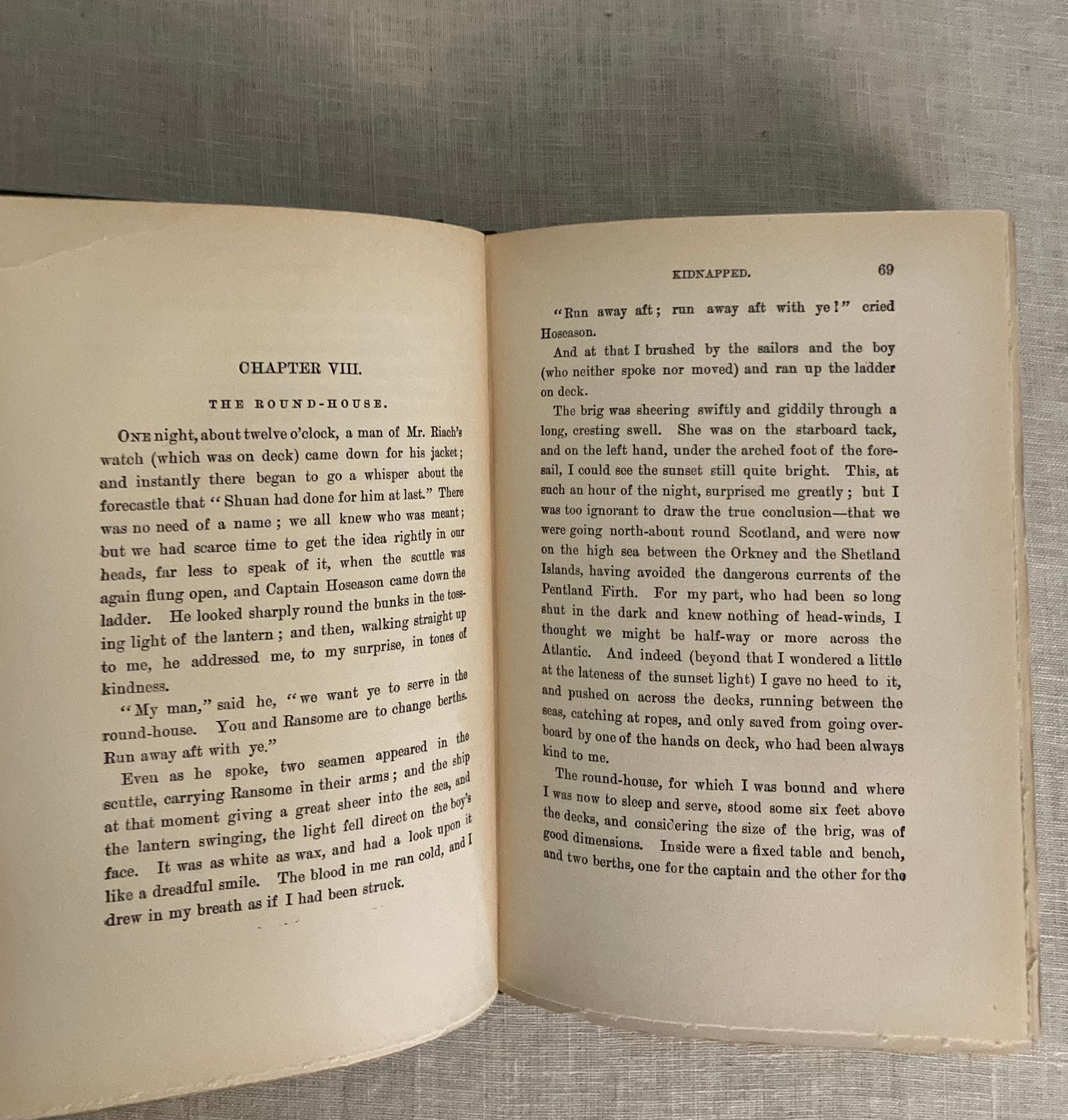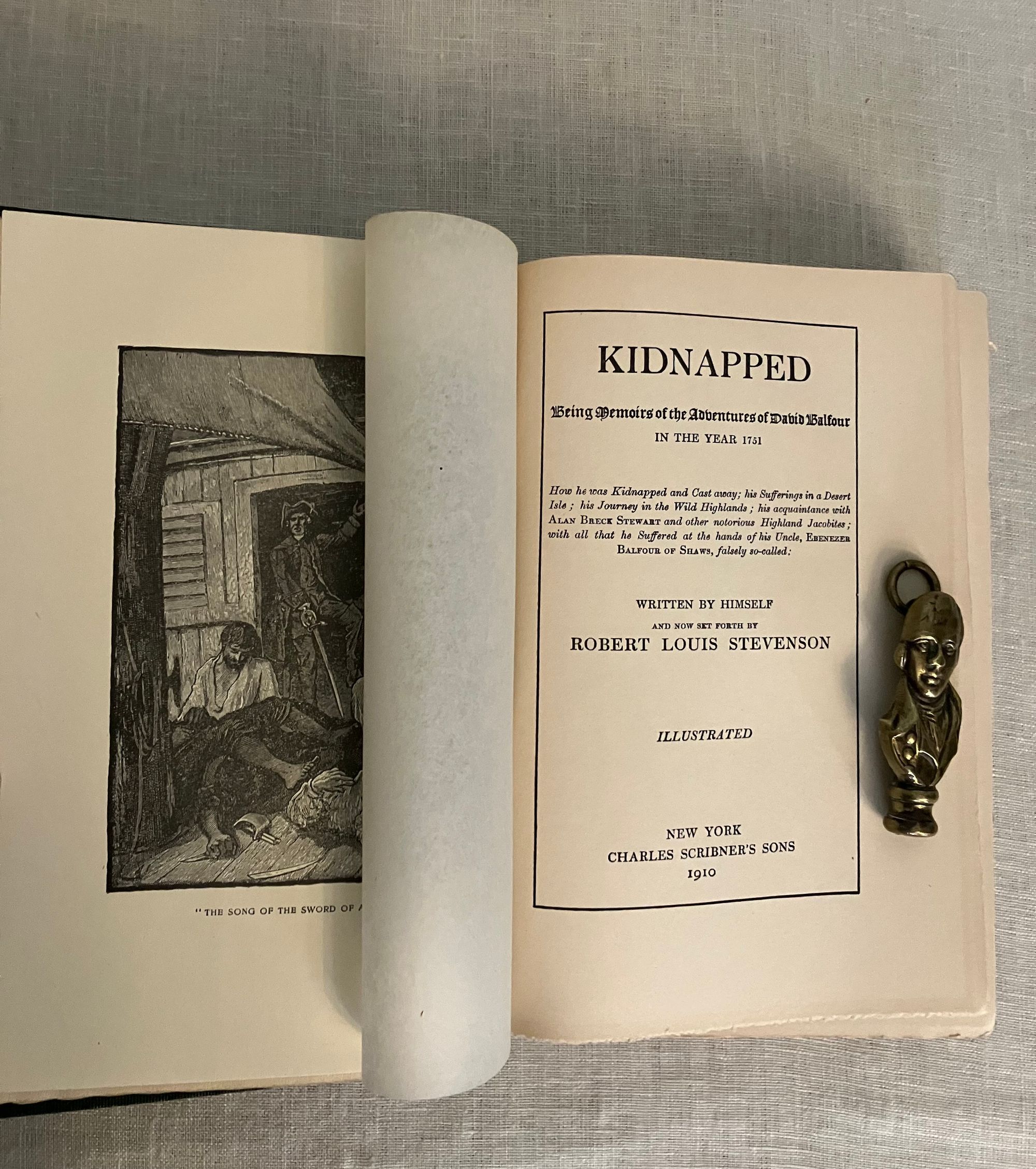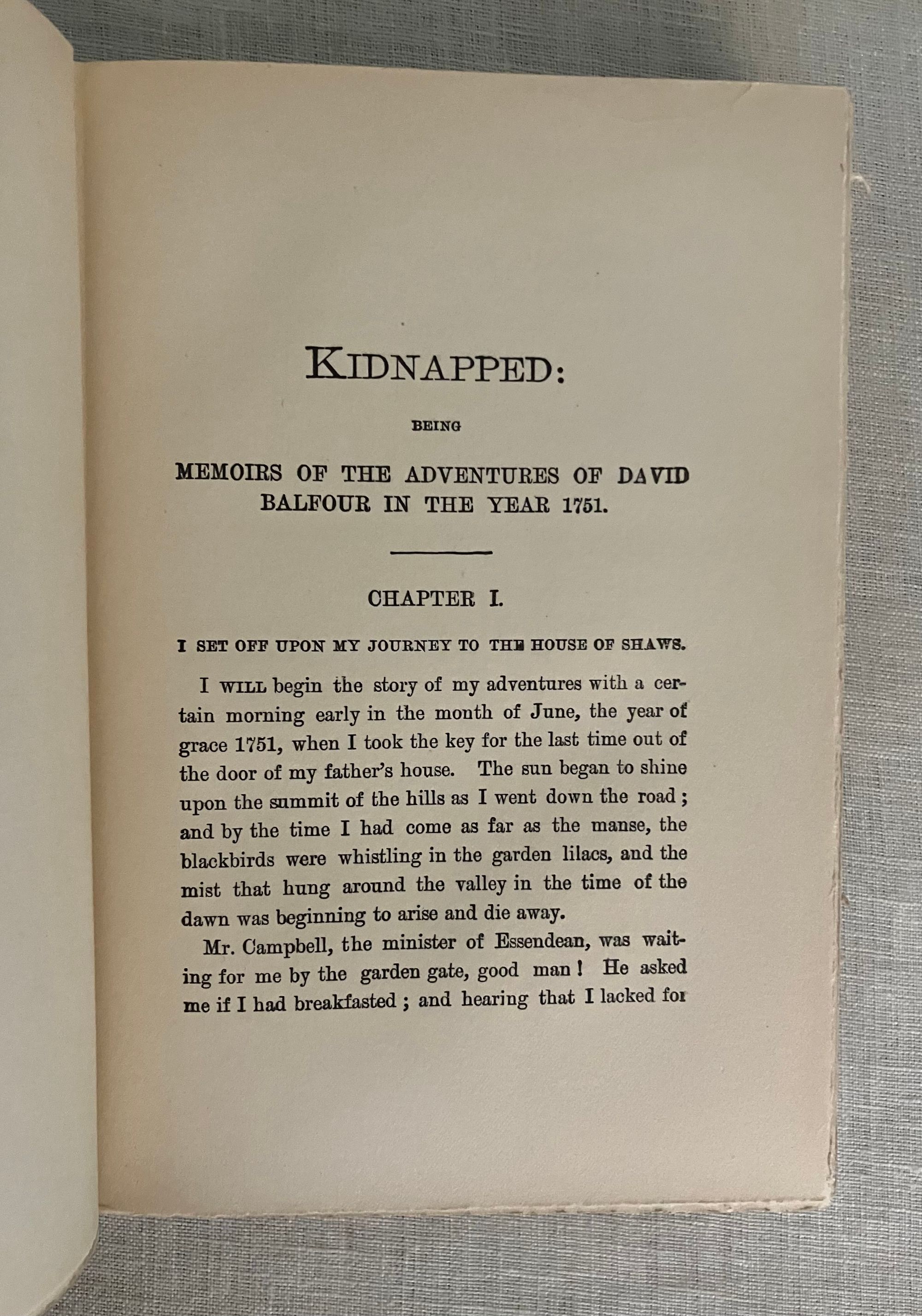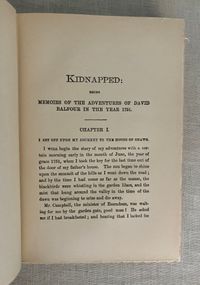 Reprint. (First serialized in 1886) Hard cover, 8vo in vertically striped green cloth with an art deco style publisher's device to the front board and the titles to the spine in gold, top edge gilt, other edges untrimmed, with nine full page black and white illustrations by William Hole, including the tissue guarded frontispiece, x, 324pp. CONDITION: Fine.**This historical-fiction-adventure novel introduces the character of David Balfour, a young man, whose life as a country lad in the lowland borders of Scotland near Ettrick, (also the area from which the famous poet James Hogg came from,) is forever changed upon the death of his father, an unusually skilled school master. David Balfour is given a letter--his inheritance-- and told to approach his only living relative, an uncle who resides at Shaws House near the Firth of Forth, in a location which has been described as based on a particular house in Cramond. Unfortunately, Uncle Ebenezer Balfour, a lonely, psychotic character living in the ruins of this great house, has apparently usurped the inheritance and title owed David. An "accident" in the house has David fearing for his life. He is later tricked into boarding a ship whose captain has been bribed to make the lad disappear. Once at sea, it is made clear David is meant to be sold into slavery in the Carolinas. Bad weather and fate, however, brings the ship back toward the rocks of the Scottish coast where they take aboard the only survivor of another shipwreck, Alan Breck Stewart, an escaped Jacobite, an Appin Stewart, and with a loathing for anyone of the clan Campbell. The rest of this adventure story is loosely based on the so-called Appin Murder of 1752 (1751 in the book), a more detailed description of which can be found in this book's sequel, "David Balfour," [See our listing 9270]. The Jacobites were Scotland's Catholic rebels who wanted restoration of the Catholic Stuarts to the British throne. The Jacobites were defeated finally at the Battle of Culloden in 1746. RLS takes the 1751 murder of the British factor Colin Campbell as a plot device in the future fictional fortunes of David Balfour (a Whig) and Alan Breck Stewart (a Jacobite.) Edinburgh Author Robert Louis [Balfour] Stevenson (1849-1894) wrote this book while living in Bournemouth, England, and perhaps being somewhat homesick, had occasion to describe many settings around his homeland in this work.