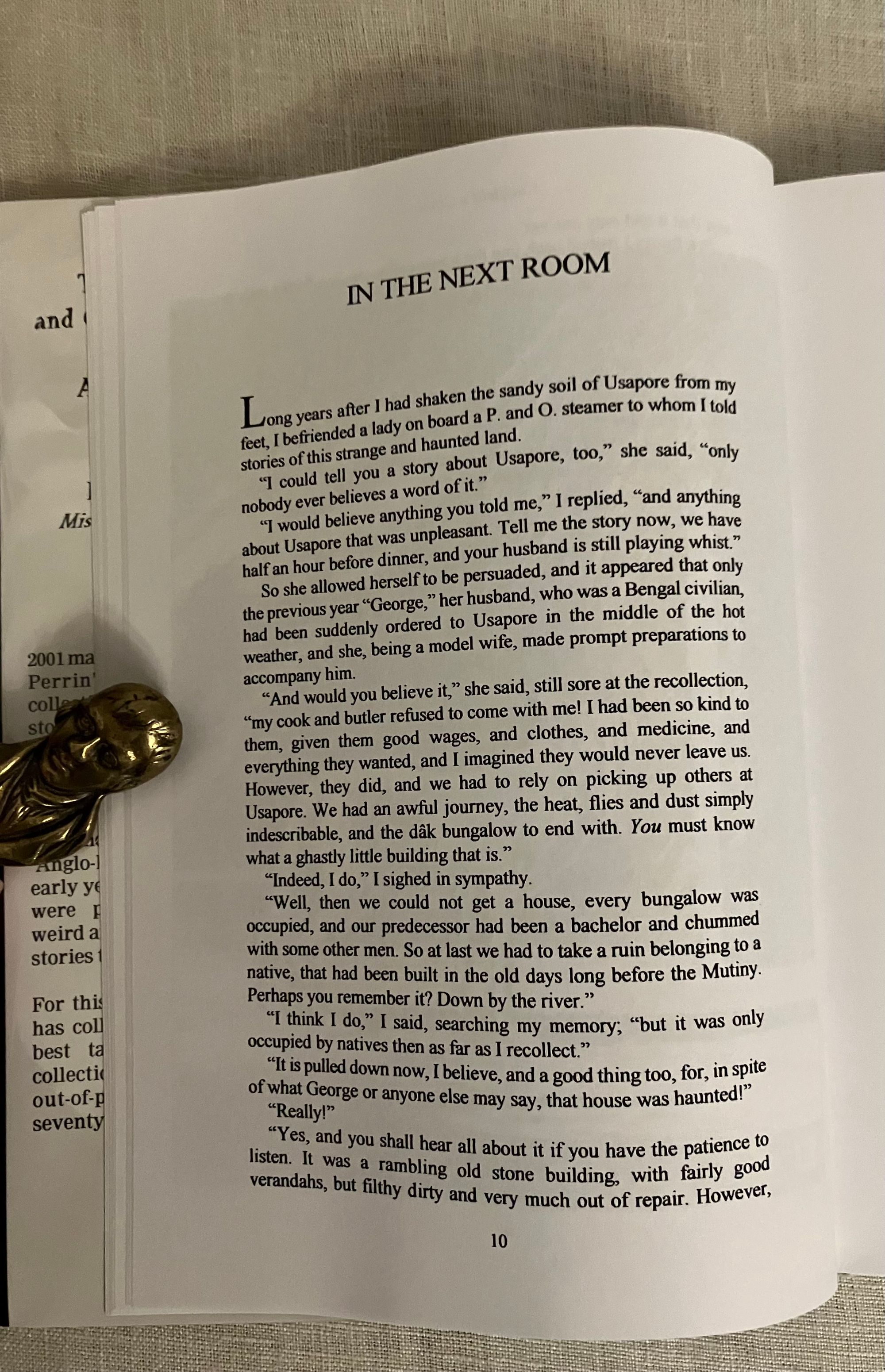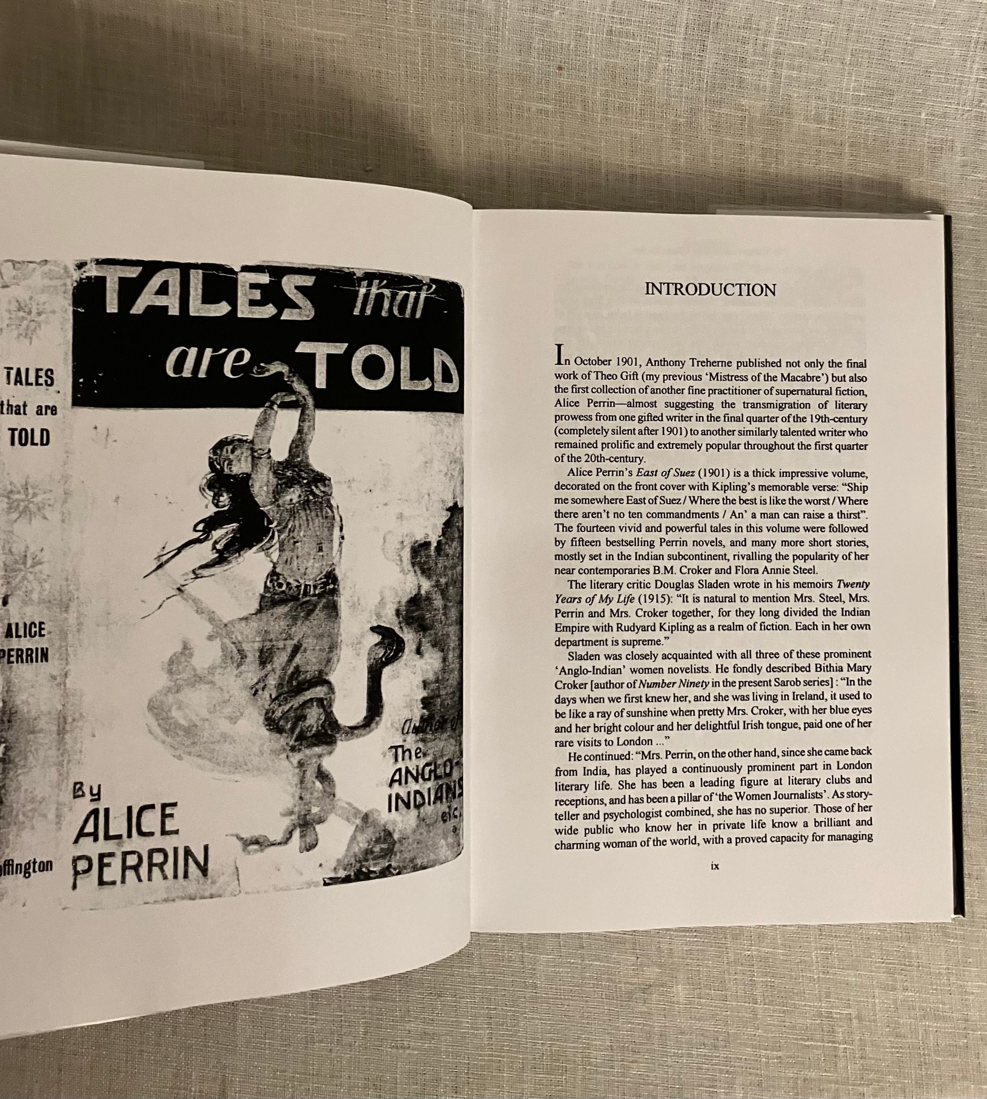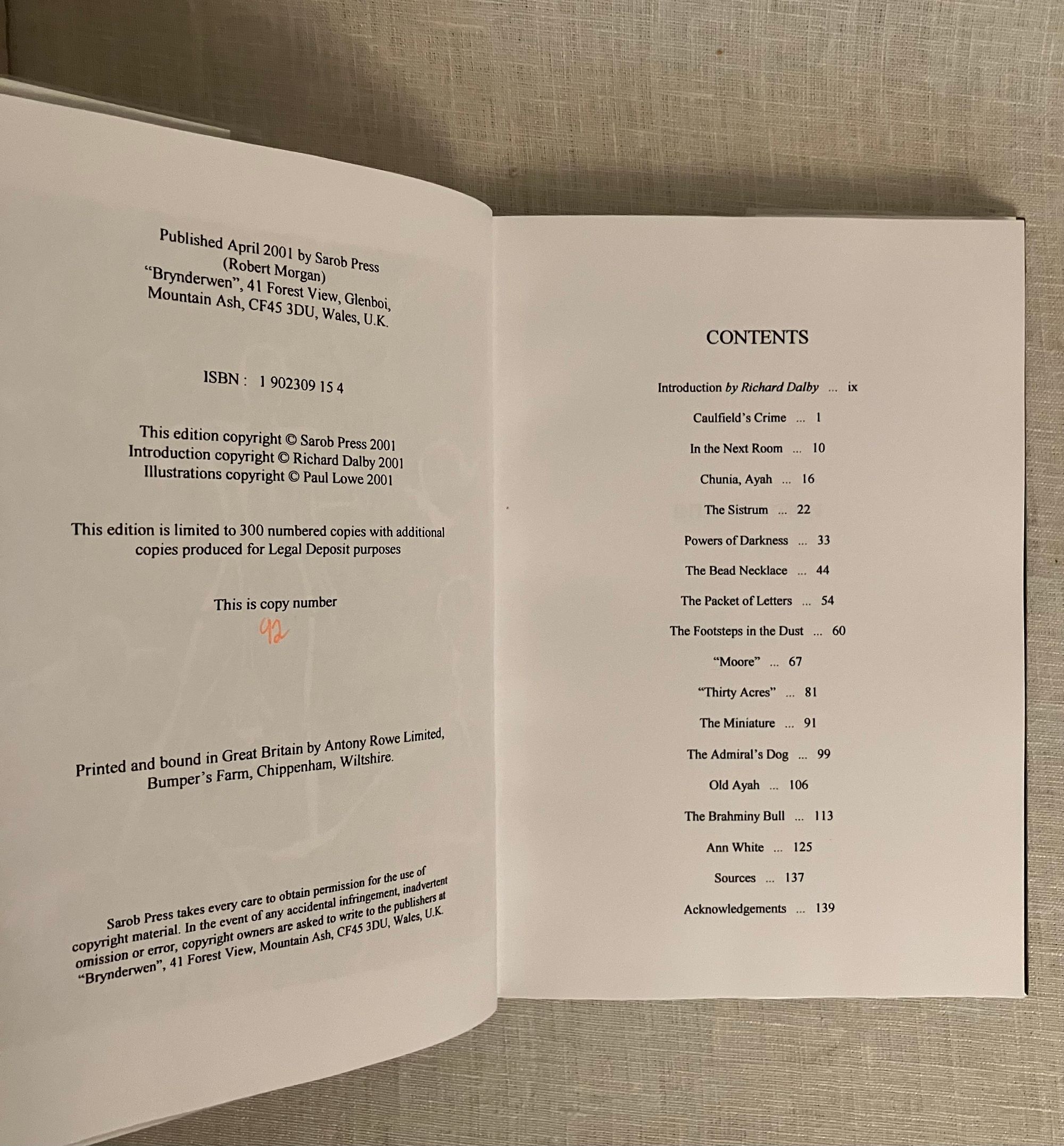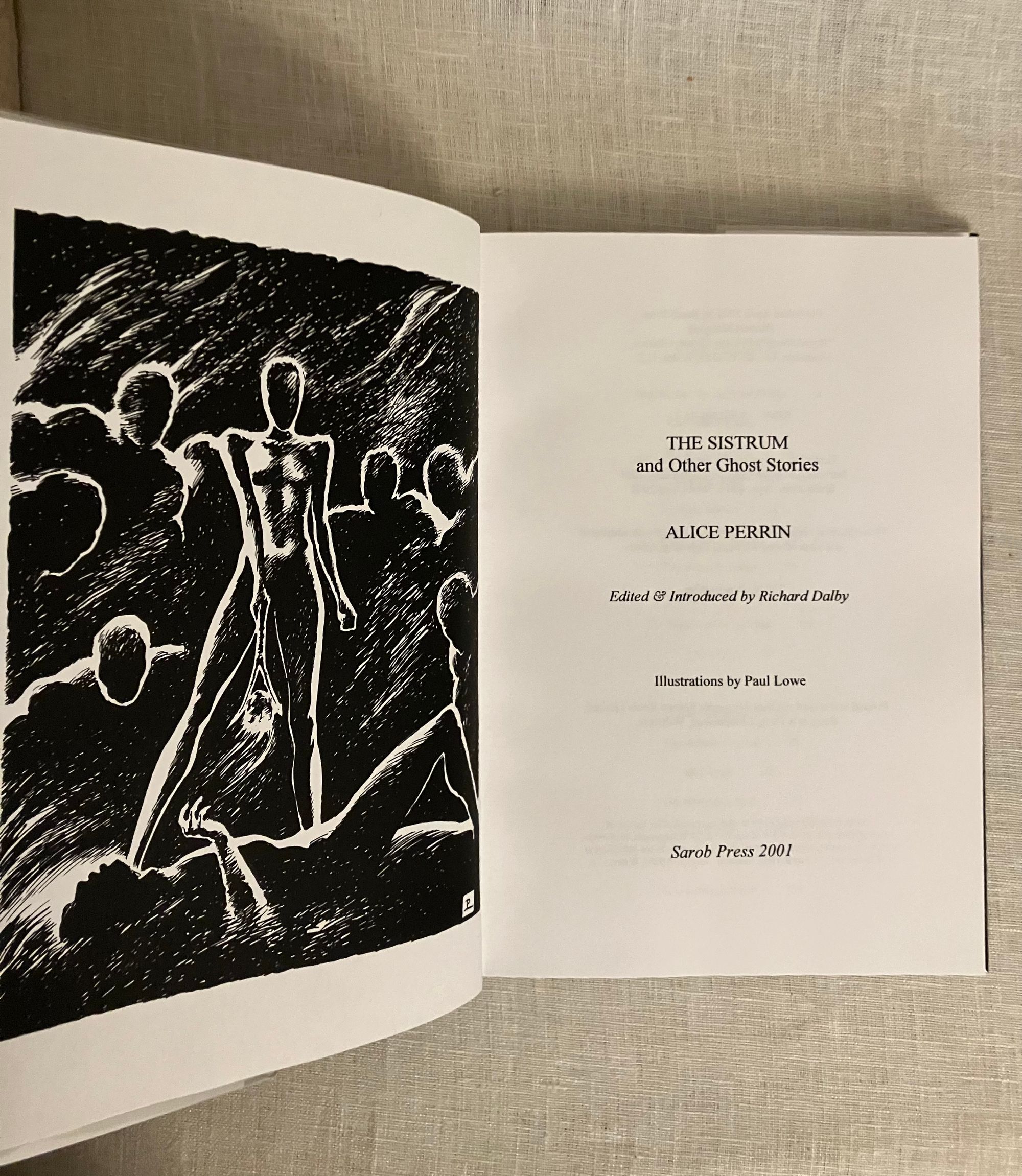Limited Edition No. 92 of 300 copies. Hard cover, 8vo in publisher's grey/green cloth boards with an illustrated dust jacket. With full-page illustrations by Artist Paul Lowe, and Introduction by Editor Richard Dalby. COLLATION: xii, [2], 134, [8] pp. CONDITION: Fine in Fine dust jacket. ** Modern limited edition of an anthology of ghost stories by Alice Perrin (1867-1934), an Indian-born, English author of novels and short stories. She was sent by her parents to be educated in England, but returned to India where she married an engineer, Charles Perrin, who worked for the India Public Works Department. Charles was put in charge of building an aqueduct in the jungle, and so Alice Perrin took to writing as a way to alleviate boredom. Her collection of ghost stories, "East of Suez" (1901), was compiled and published after her return to England, and she continued to write novels and stories about her time in India. ** The title story, "The Sistrum", has a junk-shop collector finding an African musical instrument which, having been used in sacrificial ceremonies, carries its own memories... Other stories include: "Caulfield's Crime", "Chunia, Ayah", "Powers of Darkness", "The Admiral's Dog", "Old Ayah", "The Brahminy Bull" and "The Footsteps in the Dust". Like others of these stories, "The Footsteps in the Dust" is set in colonial India, and paints an unflattering picture of one Captain Bogle, who took advantage at cards of Gunga Pershad, a merchant, and so inherited a small fortune.... but only for a short while! ** Sarob Press is a small press which has published reprints of classic ghost and horror stories, as well as contemporary authors. This book is part of a series reprinting works by neglected, but worthy, woman ghost-story writers, the so-called "Mistresses Of The Macabre".