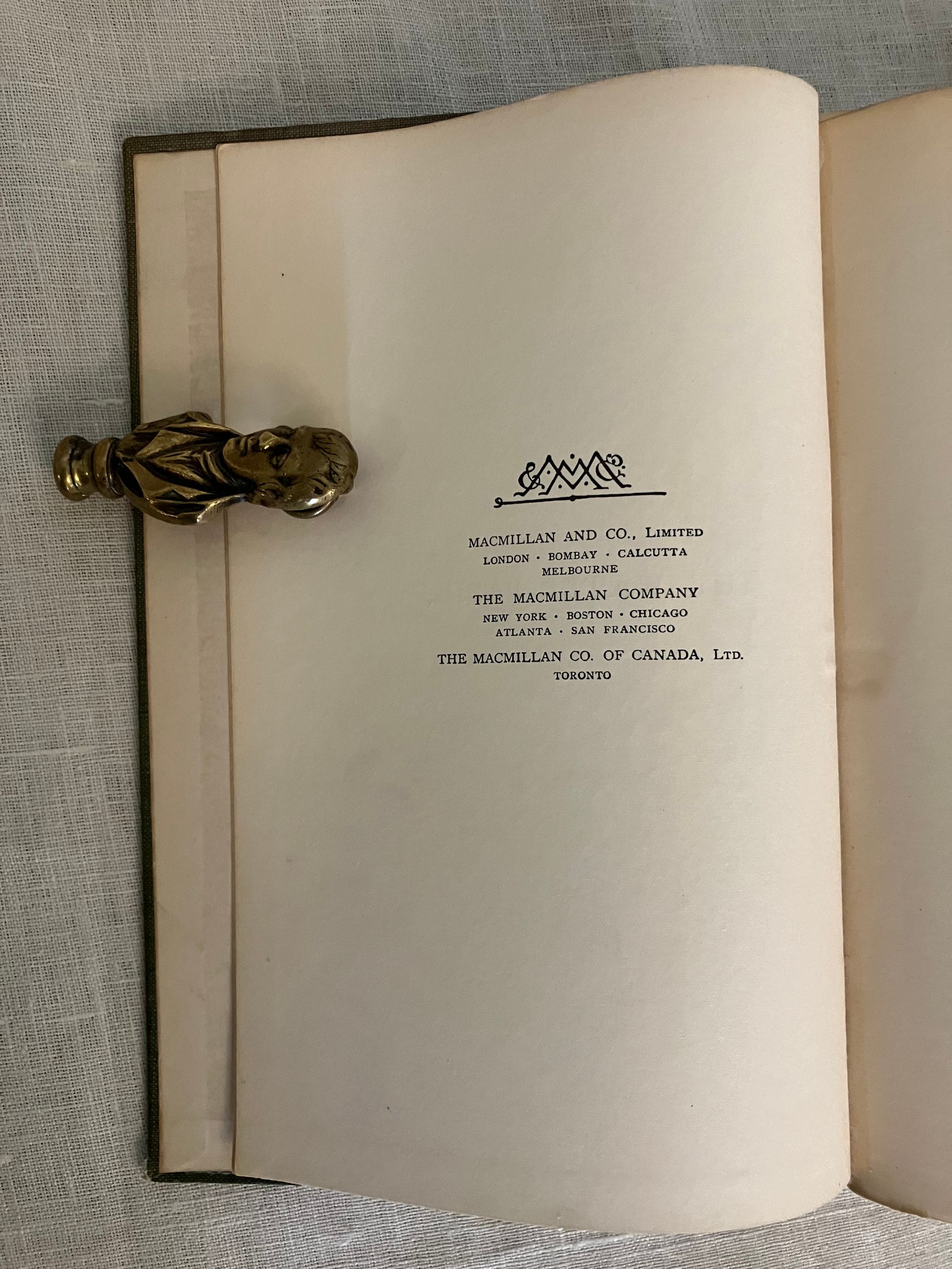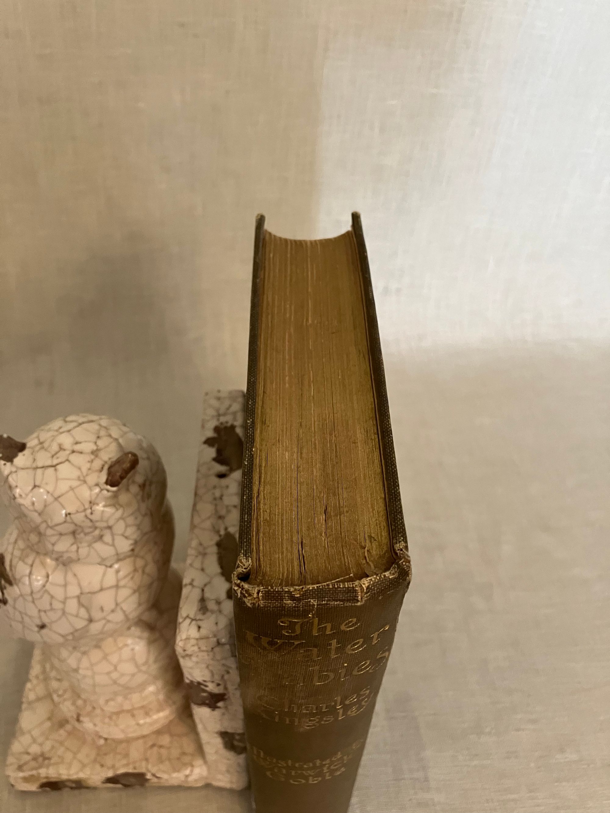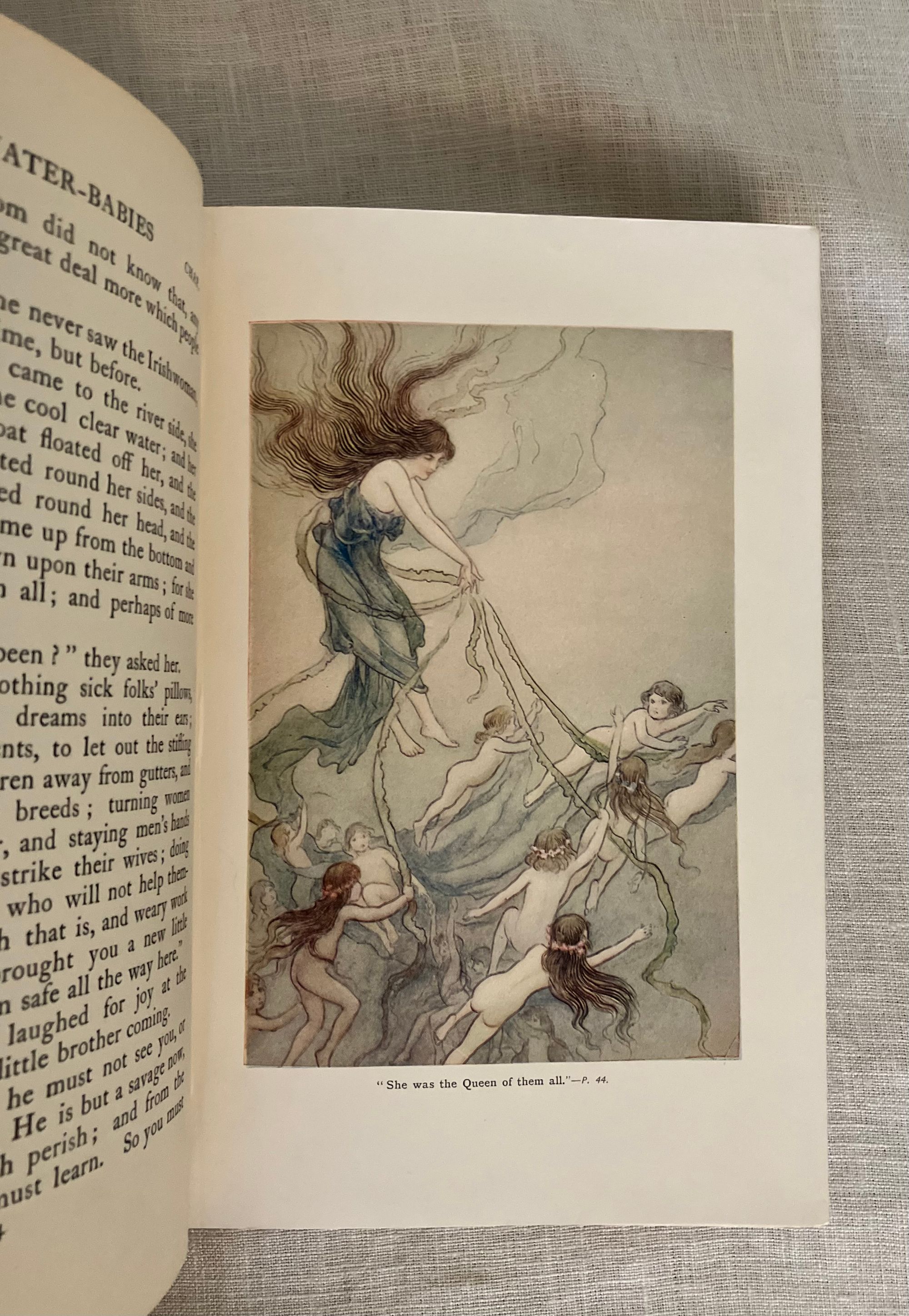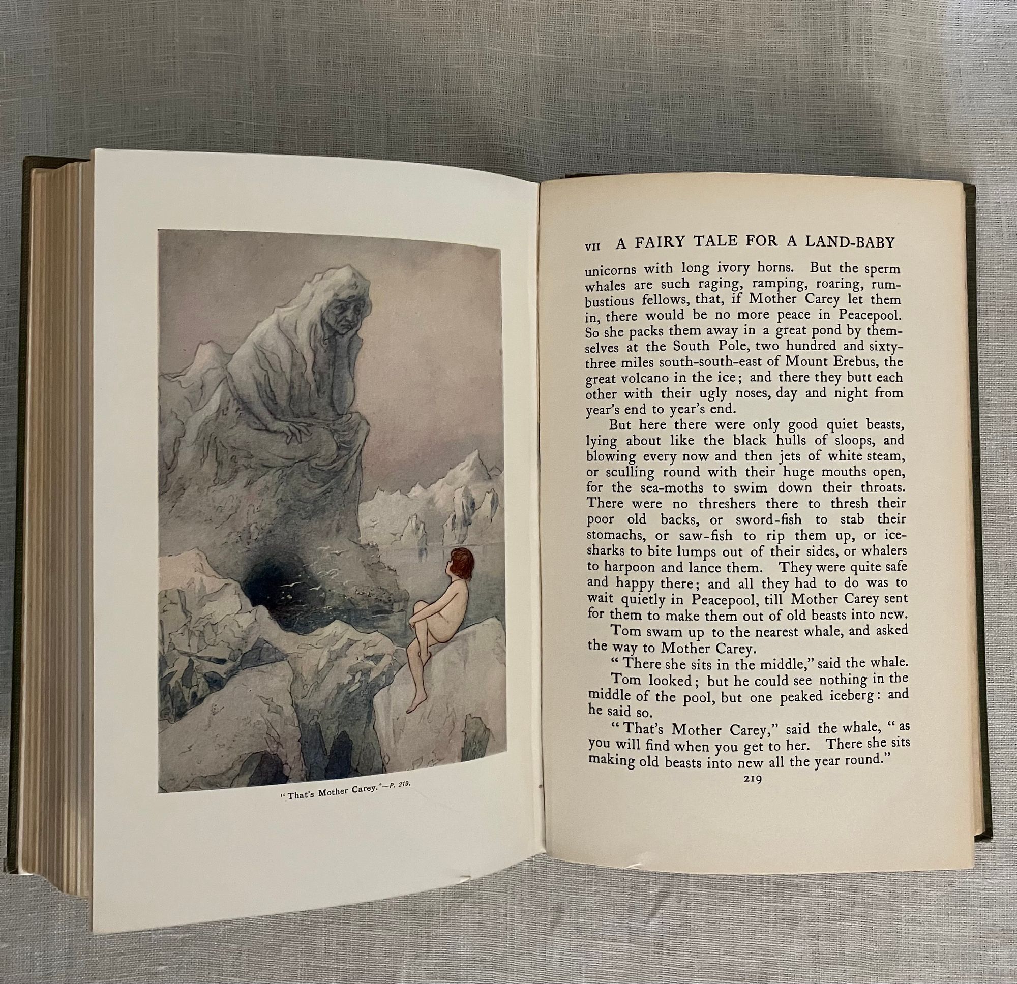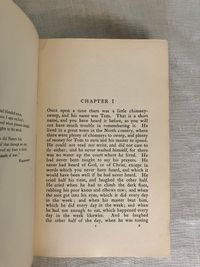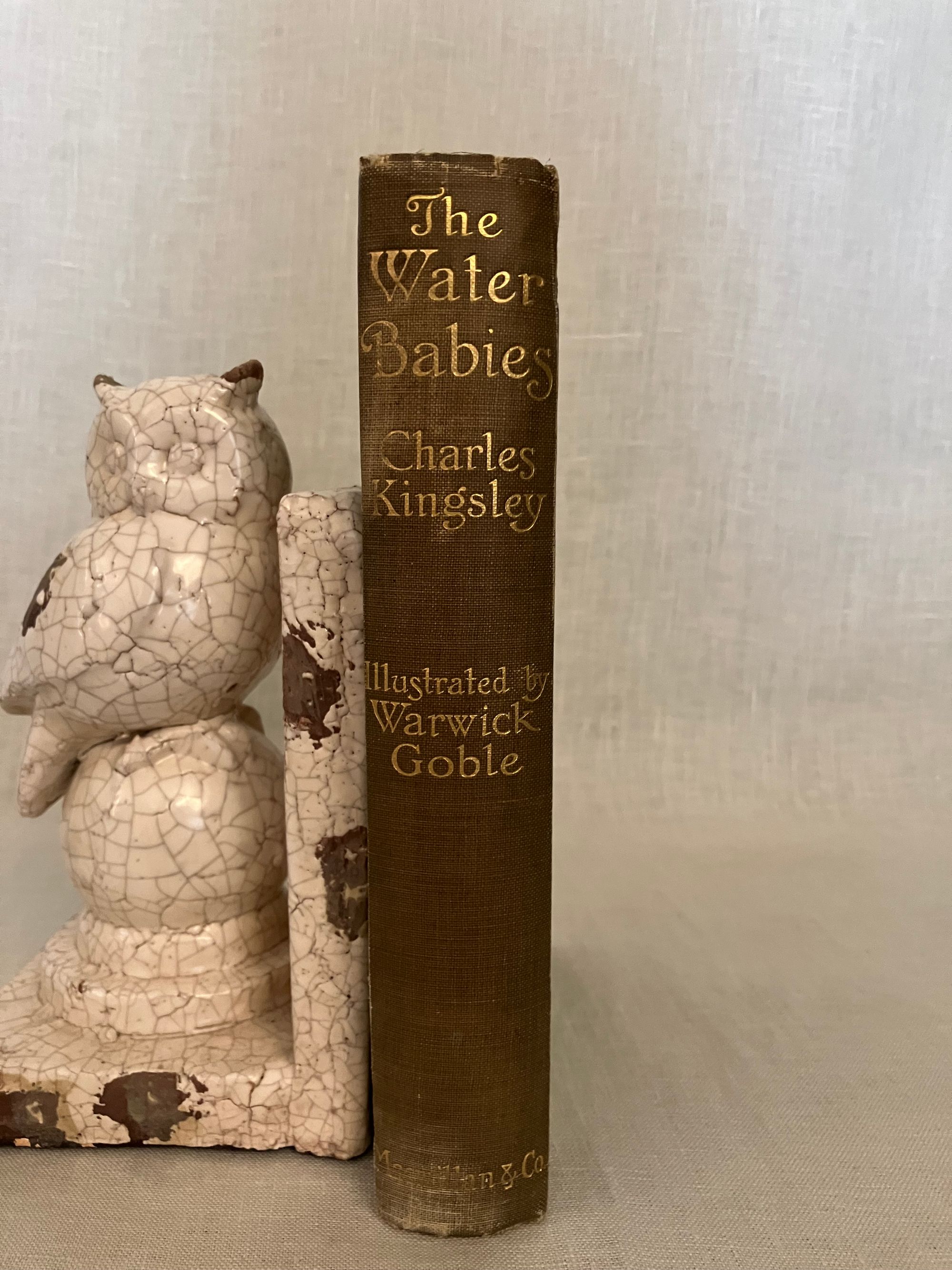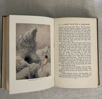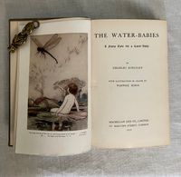 Uniform Edition; First Thus; [a prior edition with the W. Goble artwork was released in 1909 by MacMillan with 32 plates tipped in, however, this is the 1910 version, with 16 full page plates chromolithographed directly onto glazed paper, and copyrighted for international distribution. Does not contain the "L'Envoi" quotation.]Identified by publisher's catalogue: "3 sh. 6 d. each." Hard cover, Demy 8vo, in green cloth with an art deco motif of a baby riding a fish blocked in two shades of gold within an art deco type frame to the top board, the titles to the spine in gold. Top edge gilt, others trimmed. 273 pp. plus [6pp.] undated publisher's catalogue, with headline "By Rudyard Kipling." **CONDITION: Very Good. The cloth at the front joint has been reglued at head (one inch). Some sunning has caused oxidation seen to the top of both boards and to the spine. Fraying at head of spine, where rubbing has also dulled some of the lettering. Shelf wear to tips and bottom edge. Light, consistent browning to cream endpapers. A few areas of staining within, mostly at catalogue page margins. ** The ink and watercolor illustrations by London BOOK ILLUSTRATOR Warwick Goble (1862-1943) are the highlight of this wonderful edition. His artwork is in a similar vein to that of his better-known contemporary Arthur Rackham, even in a similar palette, however Goble's figures are more rounded and naturalistic. Goble had a successful career as an illustrator of the then-new market for twentieth century illustrated gift books. MacMillan cleverly marketed the work by bringing out a number of editions with different illustrators to appeal to collectors.**British AUTHOR Charles Kingsley (1819-1875), multi-talented novelist, social reformer and broad church Anglican priest, mined his boyhood interests in geology and Darwinian scientific thought in the natural history details of this work. He also was influential in the Christian Socialist Movement, taught modern history at Cambridge, and became chaplain to Queen Victoria, among other accomplishments.** THE STORY, interlaced with quotations from Wordsworth and Coleridge, and first serialized in MacMillan's Magazine in the early 1860's,i s much more than a pleasant children's book. It is an engaging fable told in a humorous yet lyrical, style about an eight-year old chimney-sweep, Tom. In brief, the lad is chased out of Squire Harthover's grand house having landed in the wrong room during his carboniferous excavations of the chimney pots. He runs away, across the poetically described Northern English landscape, followed by a mysterious red-petticoated "Irishwoman" who, it turns out, is the Fairy Queen who leads him to a protected dell. There, Tom is literally cleansed, in a baptism-like fashion, of his past troubles, and reborn into a new enchanted existence in which, as described by Sutherland, he goes on to become "a great scientist," (and wins the girl whom he scares coming out of the chimney in the first episode). As a fable, Tom's old life reflects a litany of the social and spiritual ills of the day; he is overworked and beaten by his boss, Mr. Grimes, who is himself often imprisoned for thievery and poaching. The inequality of the justice system is alluded to; there is brief reference to the Luddite's Frame-Breaking riots of the late 18th, early 19th century, for instance,in which the destruction of mechanized looms around Yorkshire led to several laws adopted to hang or transport the protestors. Implicit are calls for better labor laws, the protection of child laborers of all kinds, including their use in collieries, the unfair exclusion of the poor from education or means of advancement in society, and other themes of social justice which the author felt were in need of address. A balancing counterpoint to this are themes of the healing and regenerative powers of nature and the landscape; it is, like the best of books, layered with ideas which invite re-reading as an adult and, frankly, are still very germane today. It has also been said the fable was written in support of Charles Darwinn's Theory of Evolution. REFS; L. Stephen, DNB, "Charles Kingsley" (1885-1900, Vol. 31). J. Sutherland (1989) "The Water-Babies" p. 661.