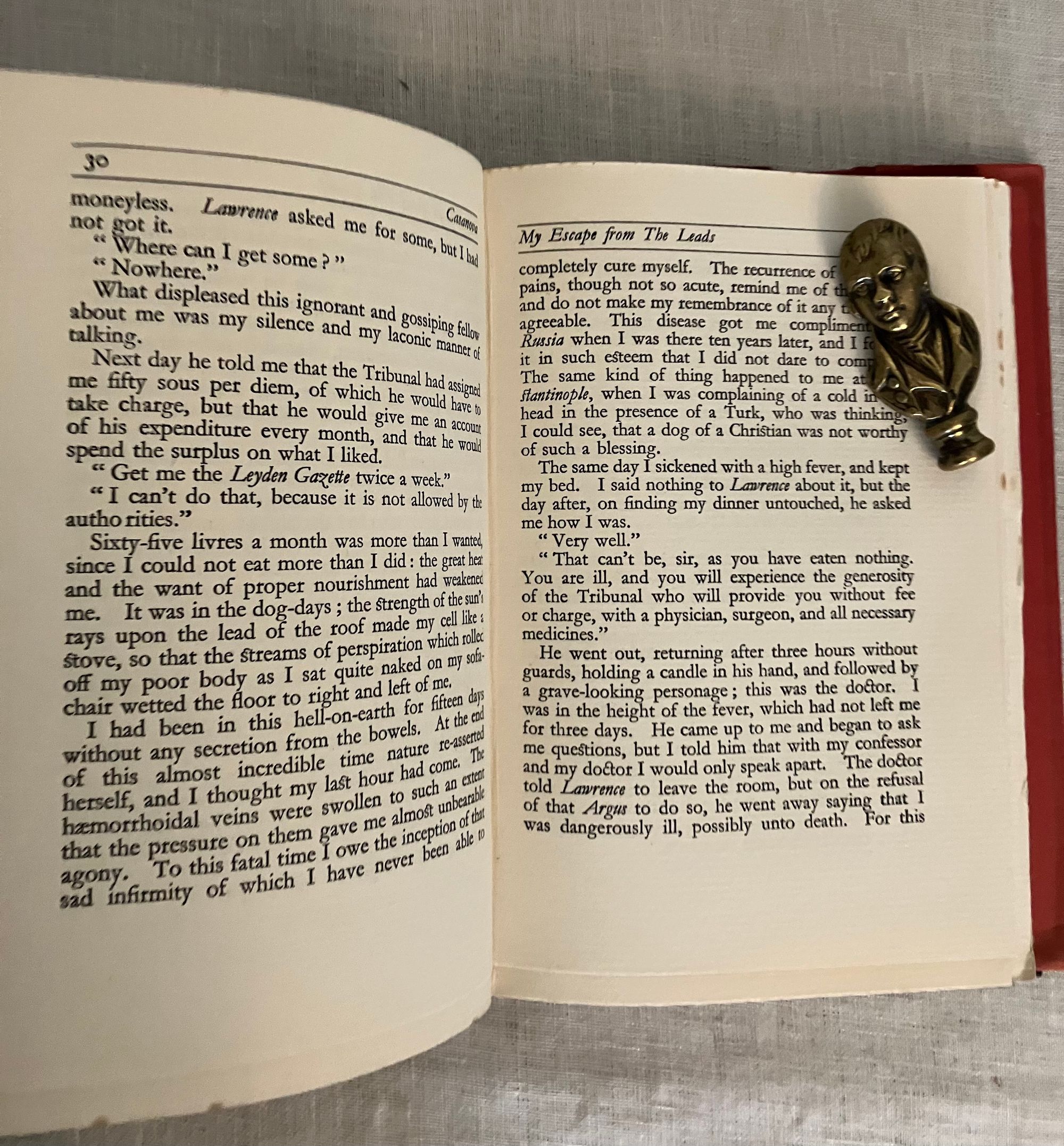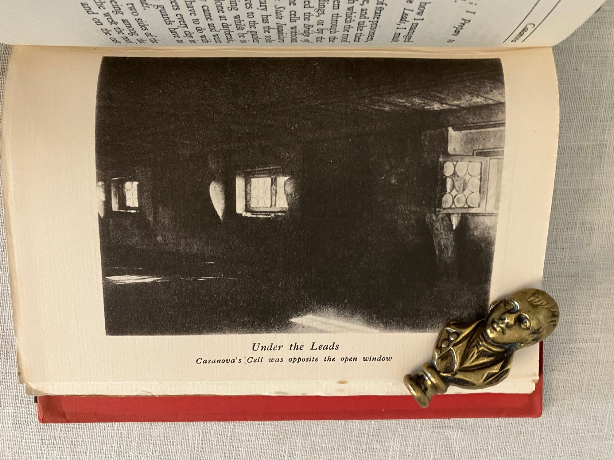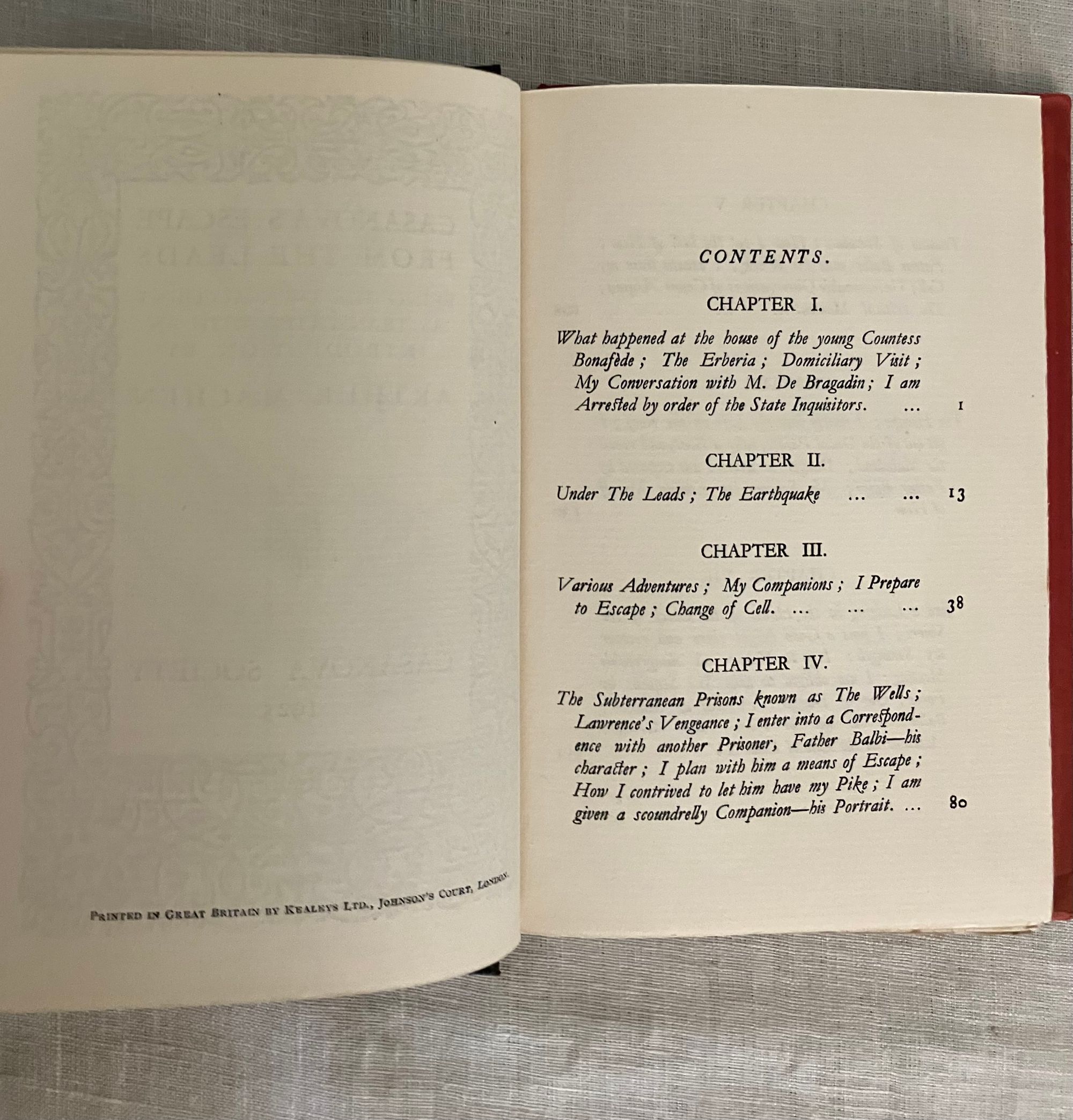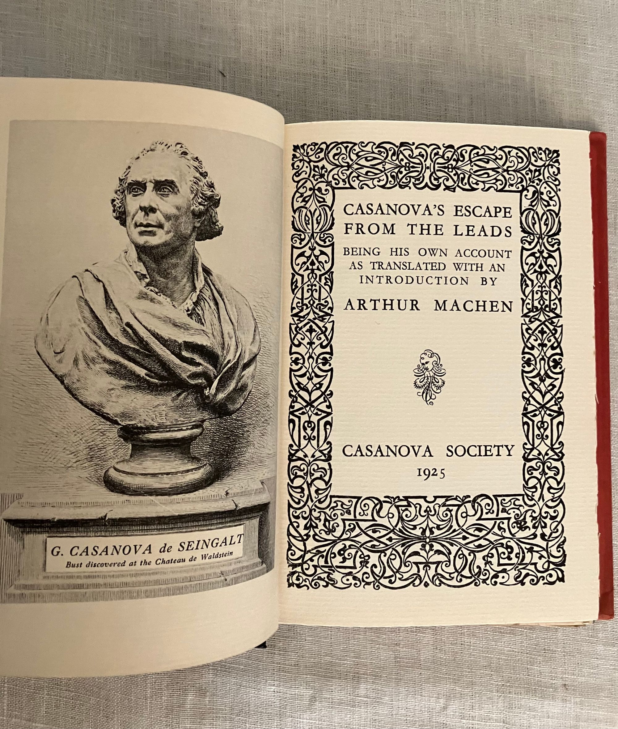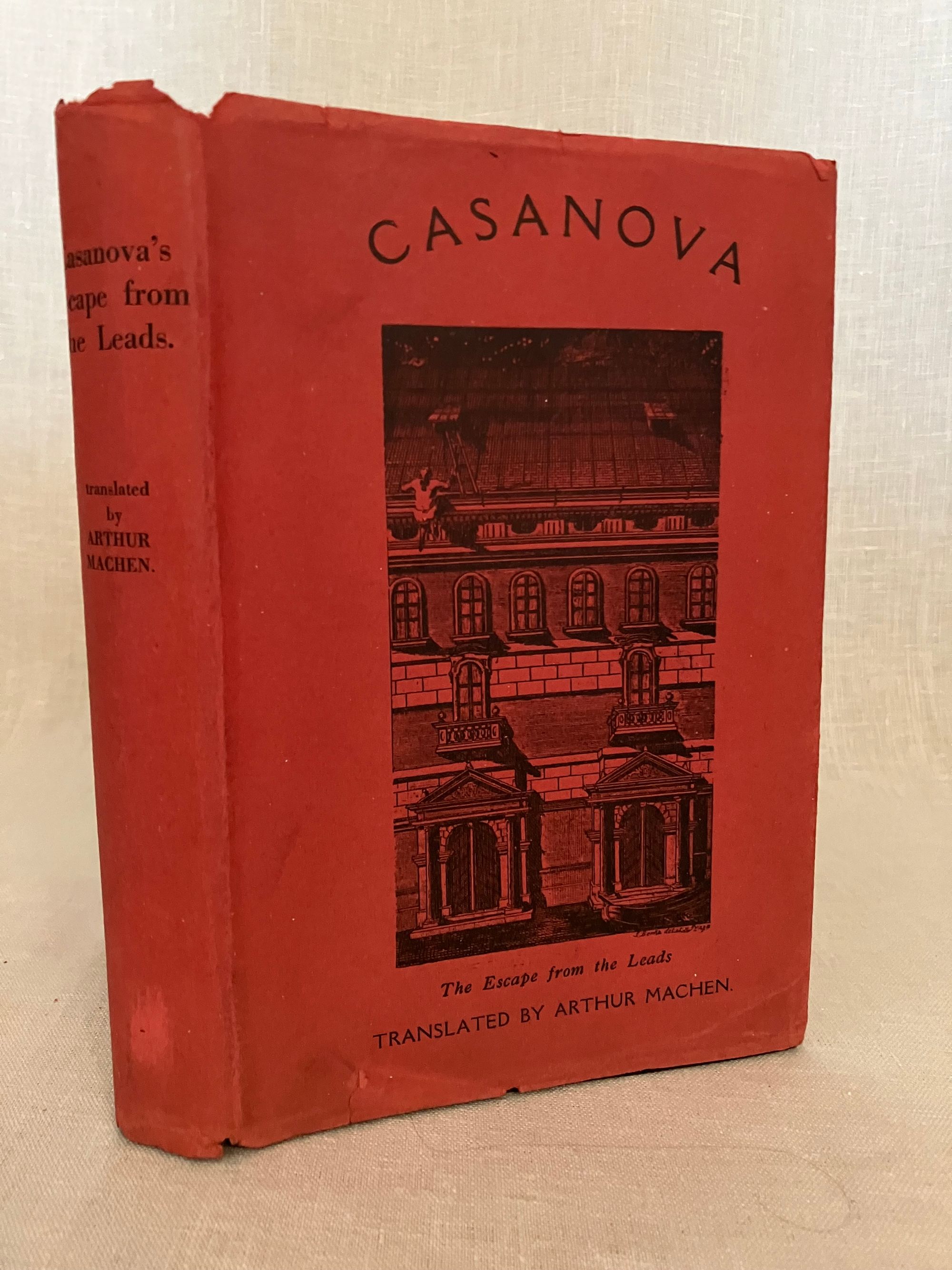 First edition. Hard cover, 8vo, in publisher's black cloth boards with paper label to spine. Dust jacket in red with illustration in black of Casanova's daring rooftop escape from the Doge's Palace in Venice. In English. COLLATION: [20], 175, [3] pp. CONDITION: Very Good Plus. Overall very clean, with little to no wear to covers. Foxing to fore-edge of text-block. Some pages unopened. Dust jacket has some small chips from the edges, and is now protected in mylar. ** Welsh AUTHOR and TRANSLATOR, Arthur Machen [born Arthur Llewellen Jones] (1863-1947), perhaps now better remembered for his fantasy works, "The Great God Pan" (1894) and "The Hill of Dreams" (1907), started his career as a translator. Relocating to London from rural Caerleon, Wales around 1882, he took as one of his first assignments the translation from the French of the great lover's lengthy autobiography, "Mémoires de J. Casanova de Seingalt," published in 12 vol. between 1826 and 1838. ** Giacomo Casanova (1725-1798) trained for the priesthood, but who has a hard time staying out of trouble, and ended up traveling all over Italy (Padua, Rome, and finally, Venice) looking for work as an assistant to various clergy. It was only when he was traveling in a gondola with Senator Matteo Bragadin that he found a sponsor; the story was that Bragadin had a stroke on the journey home, and Casanova helped him into his house and called for the doctor. The doctor prescribed a poultice containing mercury, which unsurprisingly made the Senator much worse. In his ignorance of medical practices of the day, Casanova ordered the dressing removed, and the Senator washed of its ointments. After some rest, the Senator recovered, and promptly installed Casanova as a member of his household. ** Casanova seemed to find trouble constantly; there was an ill-advised prank with a dead hand purloined from a grave-robbing, for instance. The civic tribunal of Venice marshaled the evidence against him and, on the 26th July 1755, he was arrested and sentenced, without trial, to five years imprisonment. He was kept in Doge's Palace in the cells known as "The Leads", as it was on the top floor just under the lead-tiled roof. He found an iron bar and a stone during his exercise in the prison yard, and over time created an iron spike with which he planned to chisel his way through the floor under his bed and make his escape. His plan was foiled, however, when his cell was switched for another room. Still, escape he finally did; first through a ceiling and then off the roof on a sheet rope, using his famous powers of persuasion to make the final vault past the guards to freedom. ** Casanova published the story of his escape from "The Leads" in 1788, as "Histoire de ma fuite des prisons de la République de Venise qu'on appelle les Plombs". ** REF: Goldstone & Sweetser (1973) 59a, p. 72.
