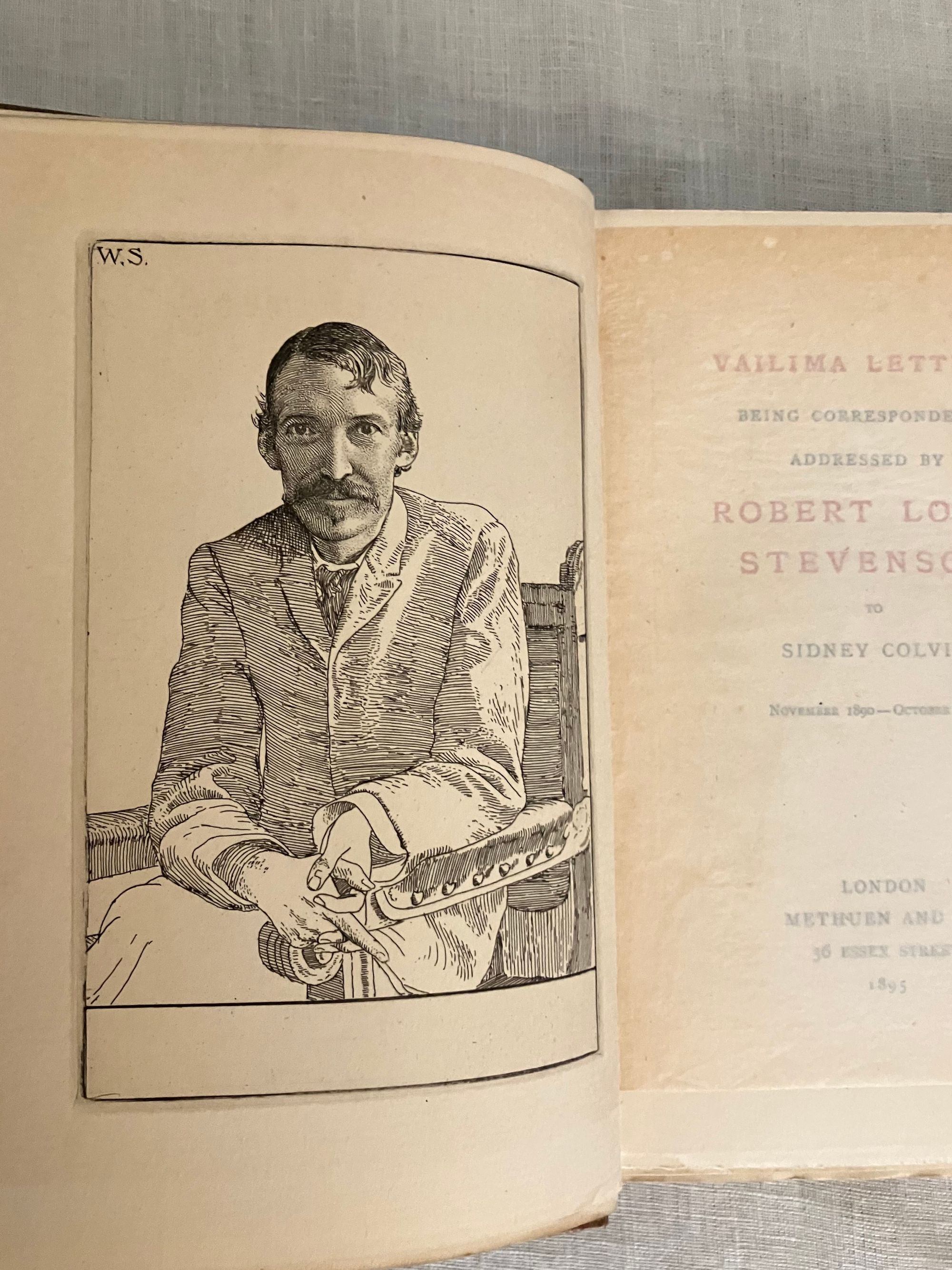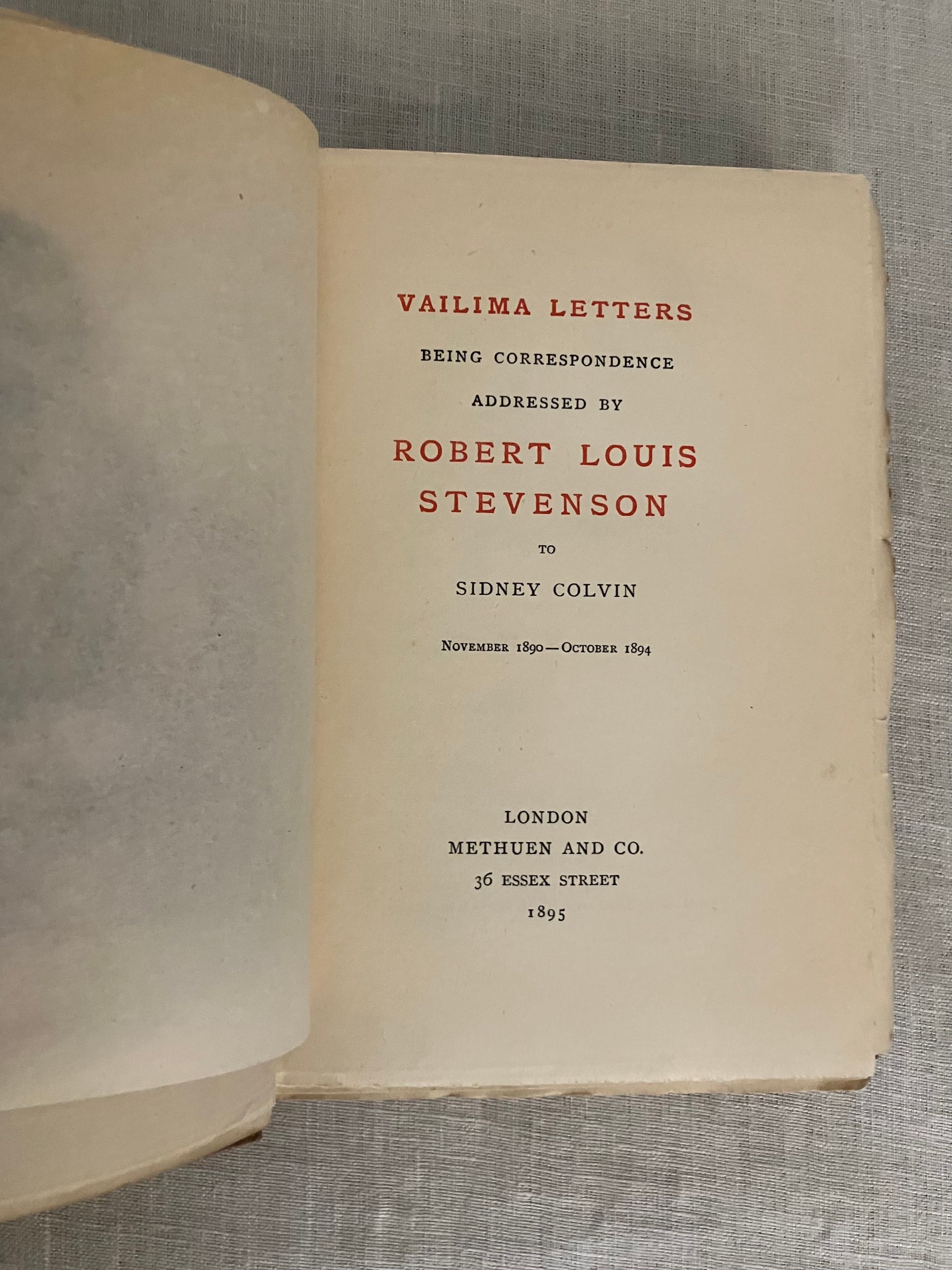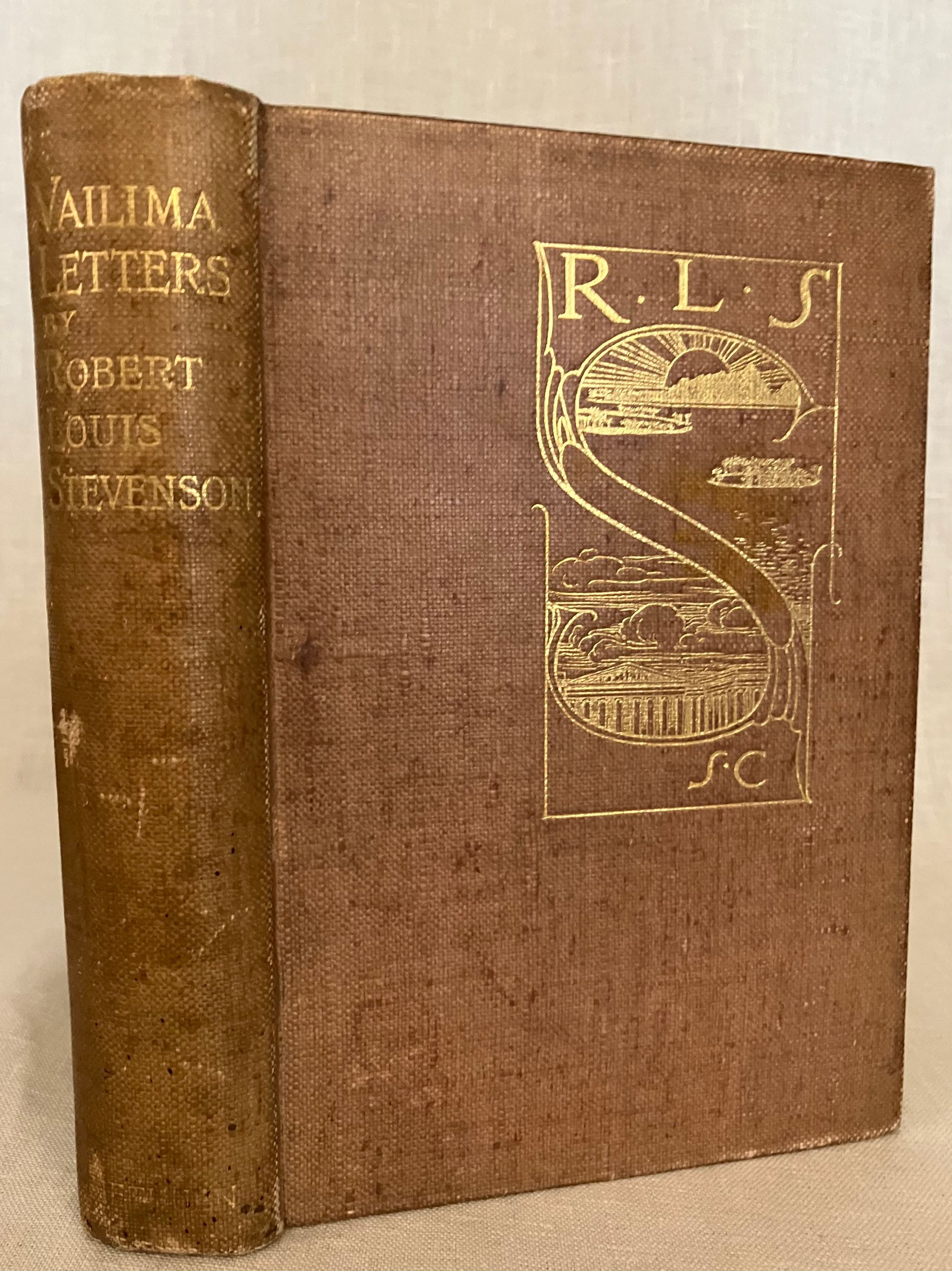 Hard cover, 8vo in tan buckram, the top board with an art deco design of the two correspondent's initials, a tropical island and image of a neoclassical building which appears to be the Royal Scottish Academy, (Princes St.,near Waverly Sta.) Titles to the spine in gold. Top edge gilt. Engraved Strang portrait of RLS tissue-guarded frontis, title page in red and black, 1895 to title page, no copyright statement. Printers Edinburgh, T. & A. Constable, Printers to Her Majesty. COLLATION:["Works by the Late Robert Louis Stevenson"at [i]-[vii],viii- xx, [1]-366, [1]. This printing has no advertising catalogue.**CONDITION: Very Good Plus. Minor rubbing at joints, and head and foot of spine. A few scuffs, as seen in photos. Some stain to rear board. Front hinge with 3/4 inch crack; rear hinge in order. Some foxing to endpapers.Otherwise the interior text is clean and lightly age-toned. **The text, with side note dating the correspondence, consists of letters from the Scottish Author Robert Louis Stevenson to his good friend and literary agent at the time, Sir Sidney Colvin, and was published a year after the death of Stevenson. RLS had moved to the estate of Vailima in Samoa in 1887 as a last-ditch attempt to manage his tubercular symptoms, and he relied on Colvin to arrange publication of his works in back in Britain. Both the editor's Editorial Note and Epilogue detail the scope of their literary friendship. The letters are a delightful mix of informal detail about living in Samoa, and part writer's diary. Sir Sidney Colvin had a distinguished career as art historian and critic, and was a contemporary of Johns Ruskin; they both held the Slade Chair of Art simultaneously at Cambridge and Oxford Universities. In addition, Colvin was a respected Keats scholar and published another two-volume book of his own correspondence. For the scholar of Robert Louis Stevenson, this work provides the novelist's thoughts in his own words on works produced during this period, among them, "The Wrecker" and "David Balfour (Catriona)". It also recounts his opinions on a variety of matters relating to living in the Pacific, such as his alliance with local Samoan chiefs against colonial interests.