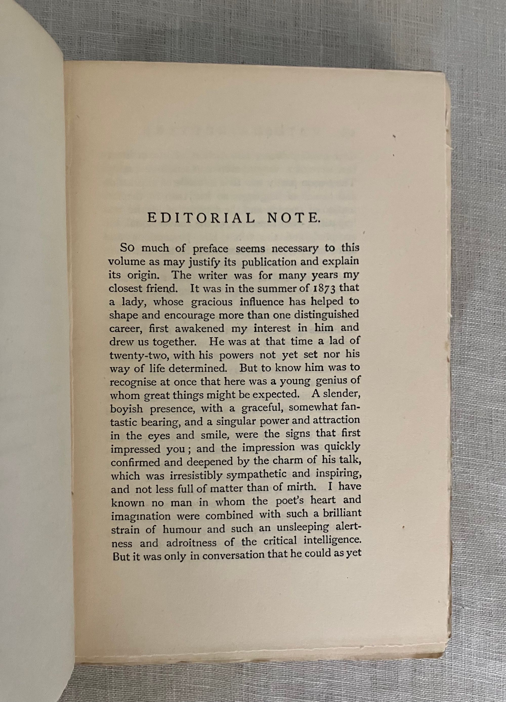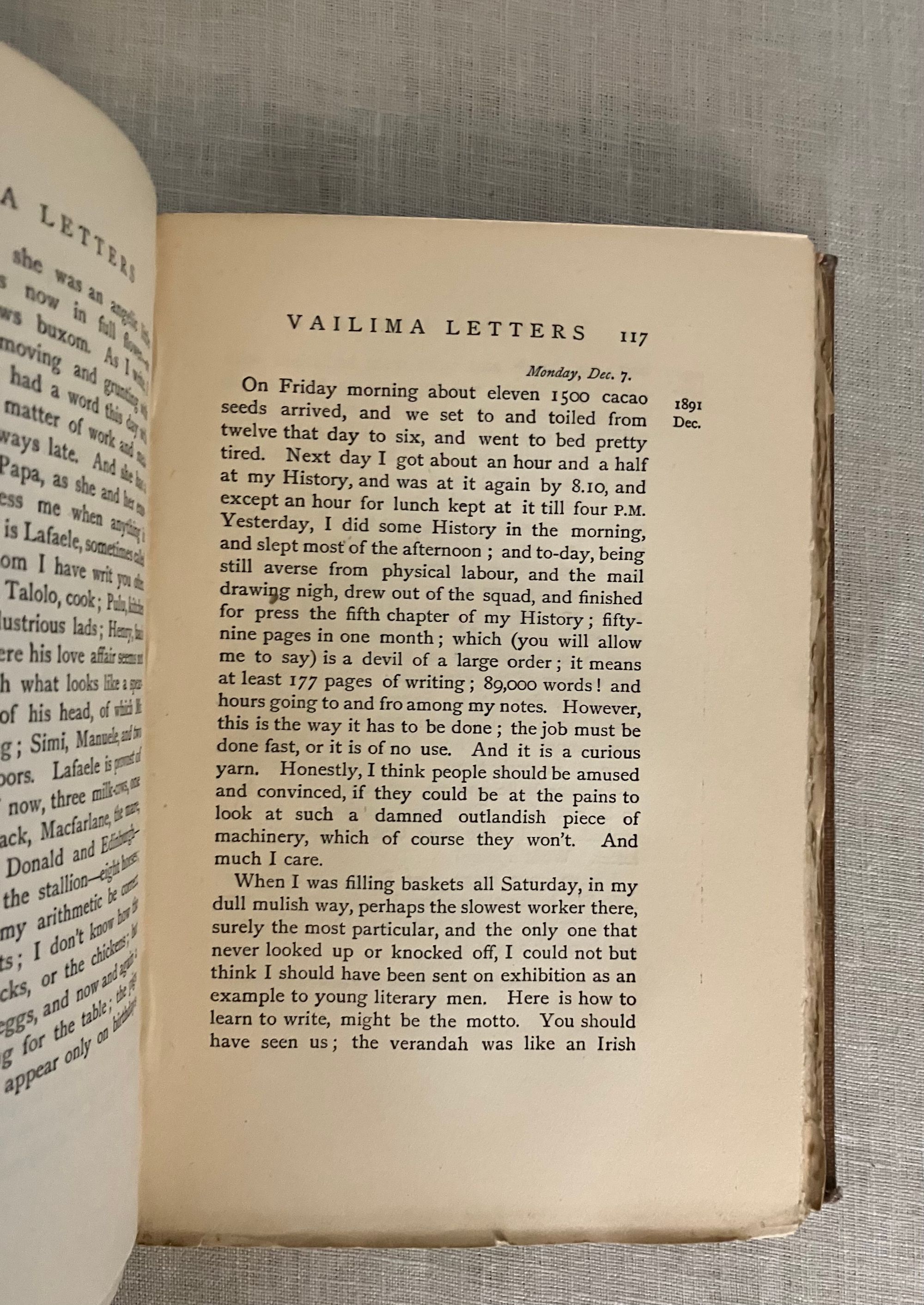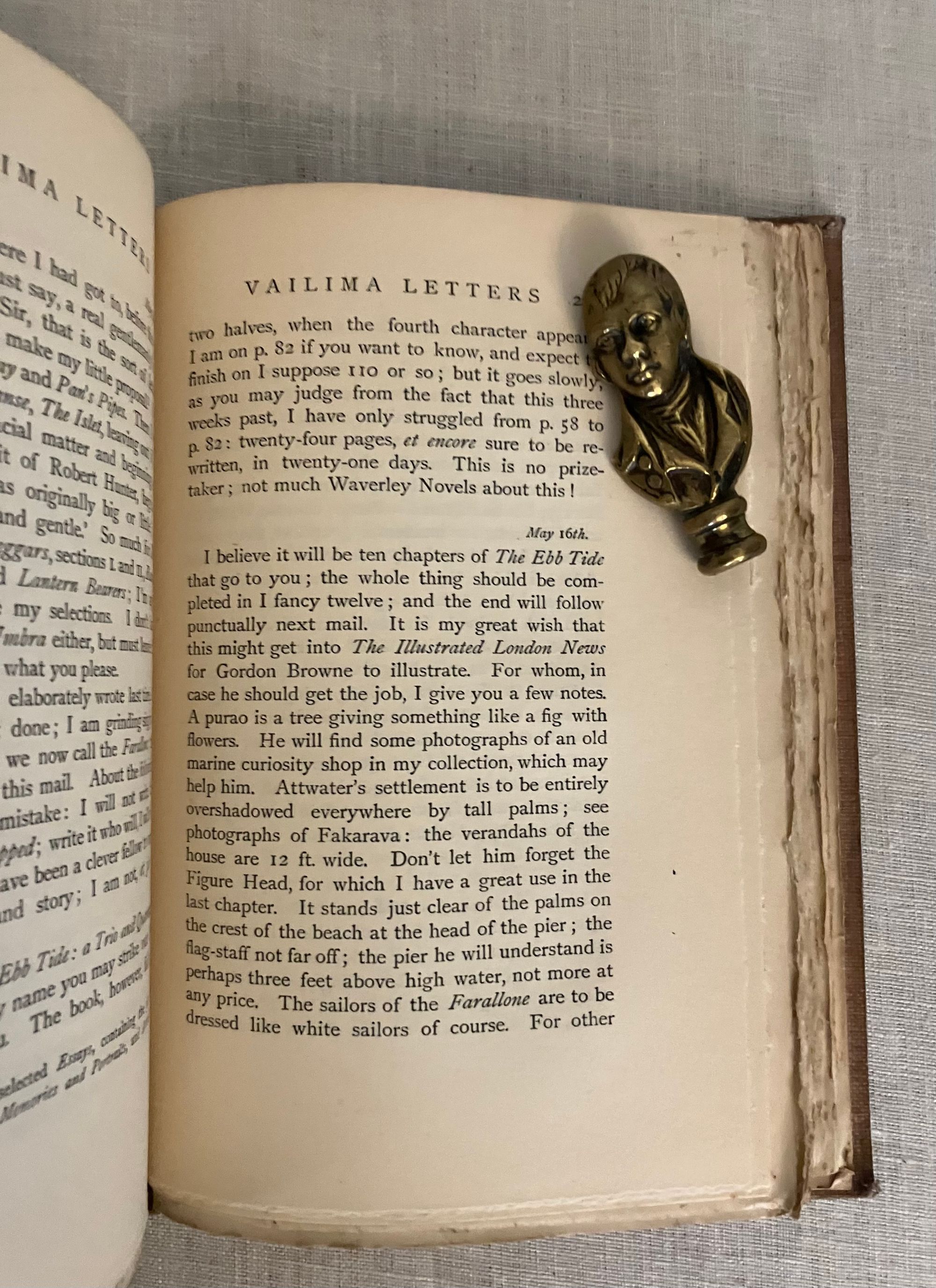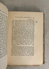 Hard cover, 8vo in tan buckram, the top board with an art deco design of the two correspondent's initials, a tropical island and image of a neoclassical building which appears to be the Royal Scottish Academy, (Princes St.,near Waverly Sta.) Titles to the spine in gold. Top edge gilt. Engraved Strang portrait of RLS tissue-guarded frontis, title page in red and black, 1895 to title page, no copyright statement. Printers Edinburgh, T. & A. Constable, Printers to Her Majesty. COLLATION:["Works by the Late Robert Louis Stevenson"at [i]-[vii],viii- xx, [1]-366, [1]. This printing has no advertising catalogue.**CONDITION: Very Good Plus. Minor rubbing at joints, and head and foot of spine. A few scuffs, as seen in photos. Some stain to rear board. Front hinge with 3/4 inch crack; rear hinge in order. Some foxing to endpapers.Otherwise the interior text is clean and lightly age-toned. **The text, with side note dating the correspondence, consists of letters from the Scottish Author Robert Louis Stevenson to his good friend and literary agent at the time, Sir Sidney Colvin, and was published a year after the death of Stevenson. RLS had moved to the estate of Vailima in Samoa in 1887 as a last-ditch attempt to manage his tubercular symptoms, and he relied on Colvin to arrange publication of his works in back in Britain. Both the editor's Editorial Note and Epilogue detail the scope of their literary friendship. The letters are a delightful mix of informal detail about living in Samoa, and part writer's diary. Sir Sidney Colvin had a distinguished career as art historian and critic, and was a contemporary of Johns Ruskin; they both held the Slade Chair of Art simultaneously at Cambridge and Oxford Universities. In addition, Colvin was a respected Keats scholar and published another two-volume book of his own correspondence. For the scholar of Robert Louis Stevenson, this work provides the novelist's thoughts in his own words on works produced during this period, among them, "The Wrecker" and "David Balfour (Catriona)". It also recounts his opinions on a variety of matters relating to living in the Pacific, such as his alliance with local Samoan chiefs against colonial interests.